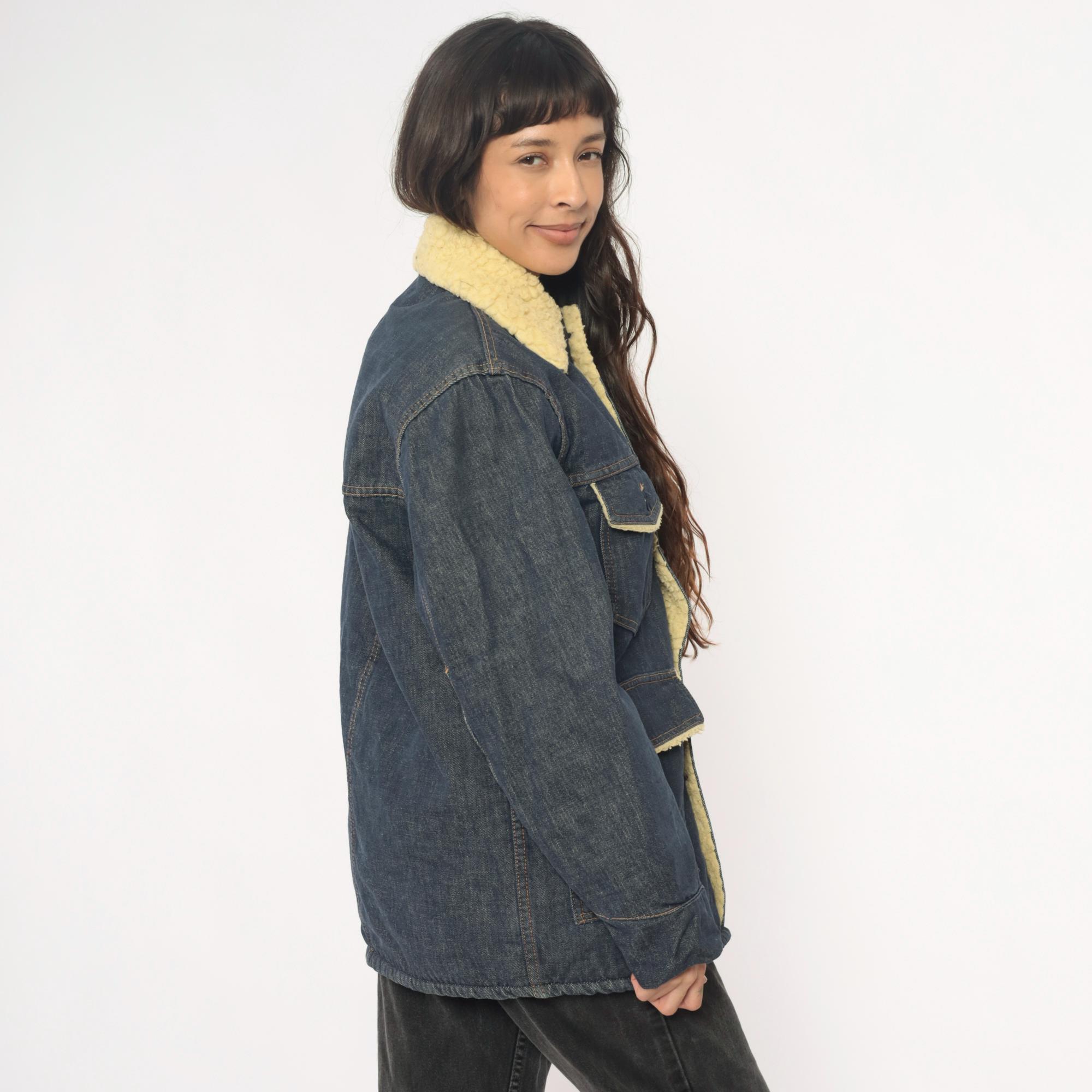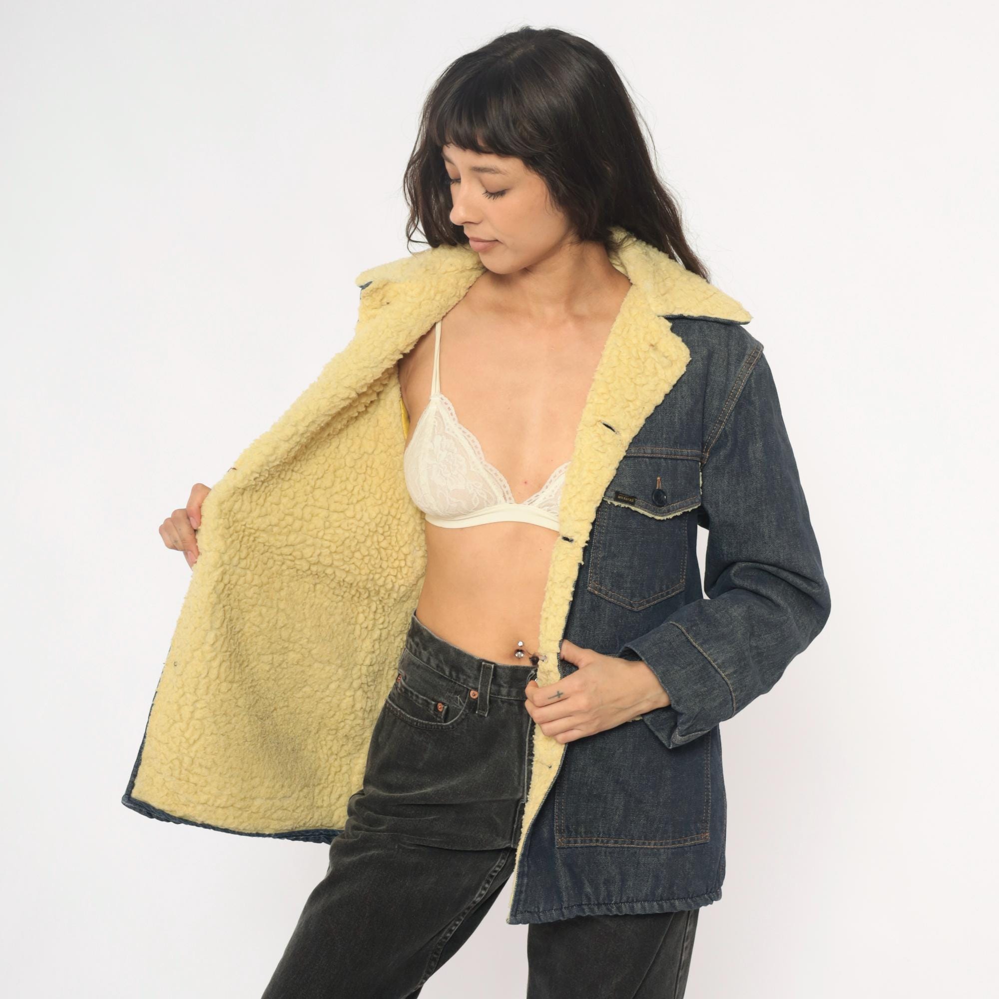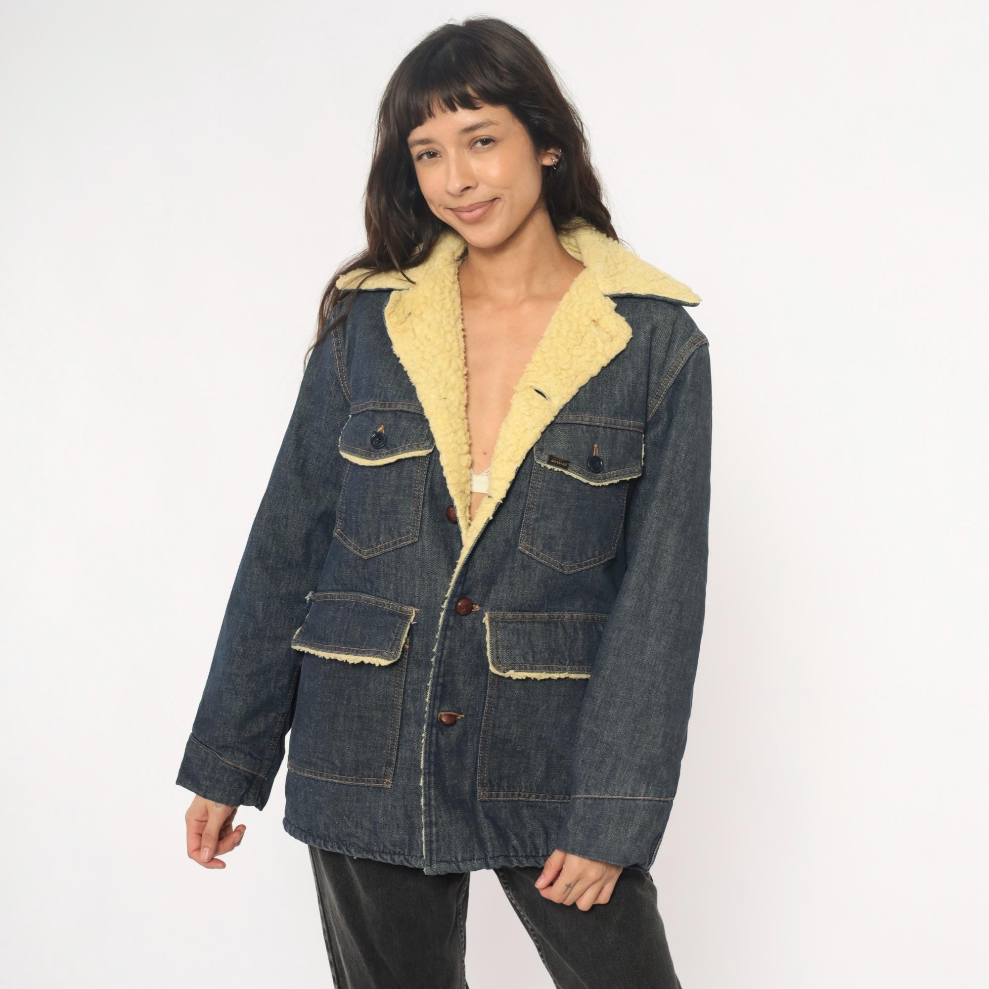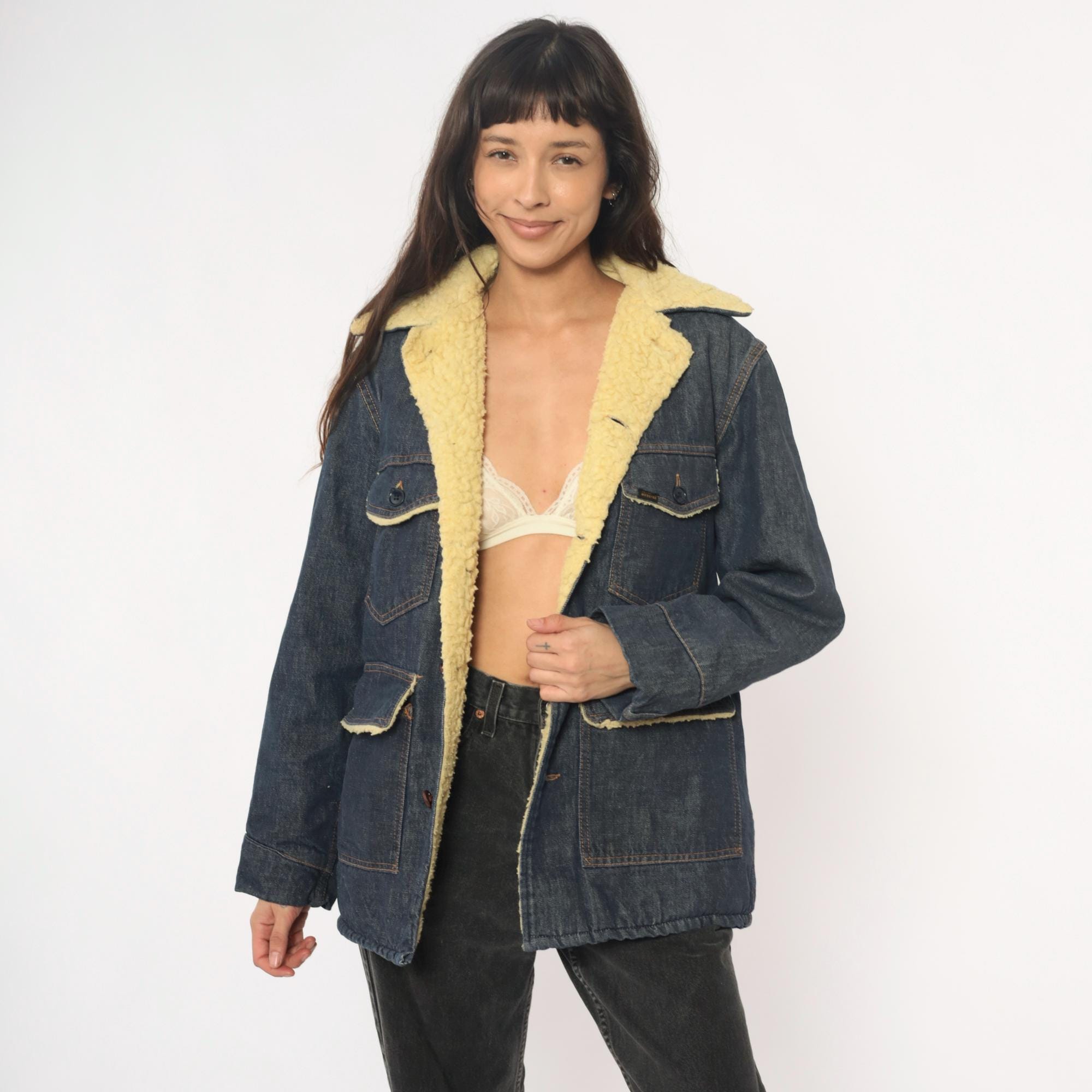 70s denim jacket from Roebucks with button front closure, two button-flap chest pockets, and two lower patch pockets. Dark indigo denim exterior with cream faux shearling lining throughout interior and collar. Denim with faux shearling lining.