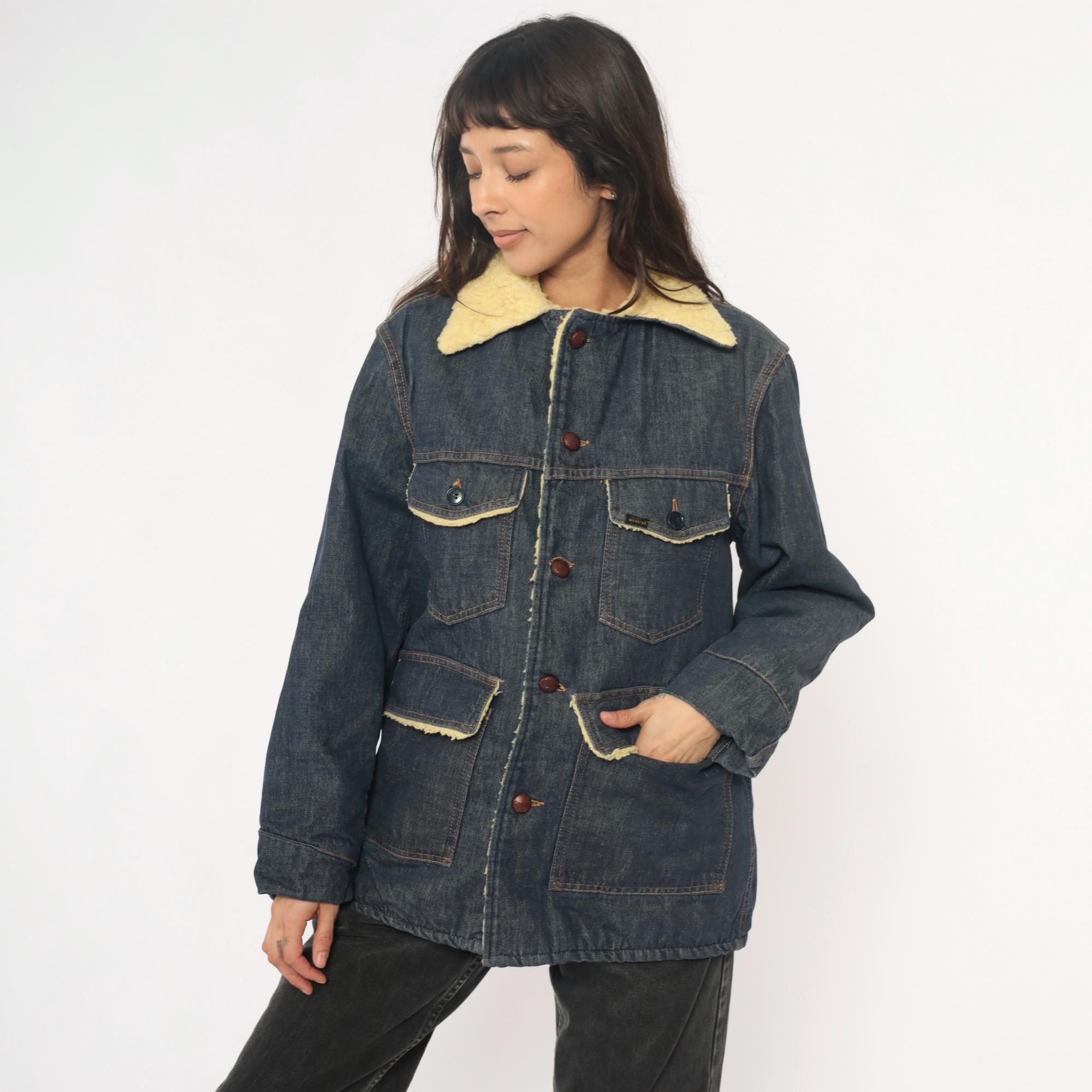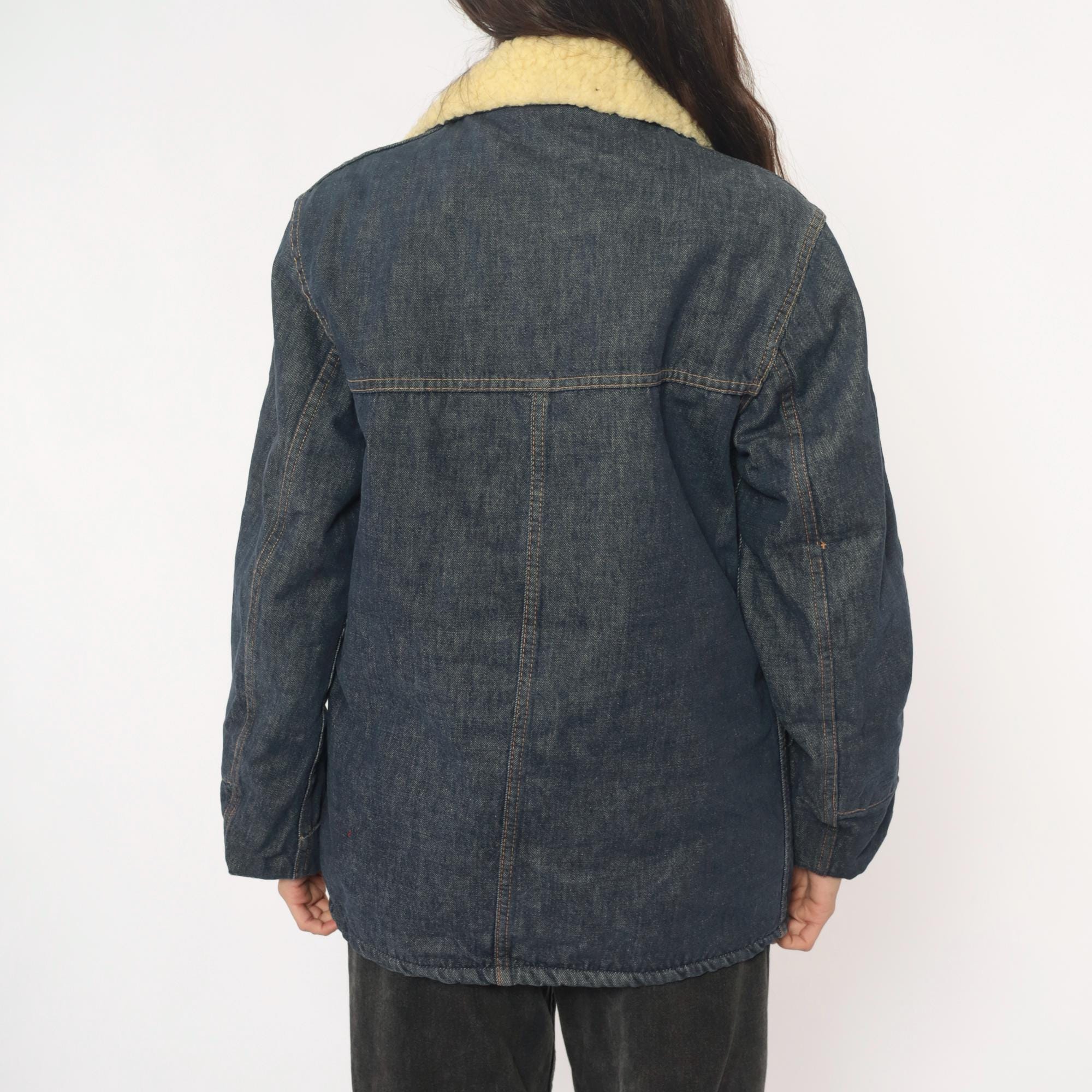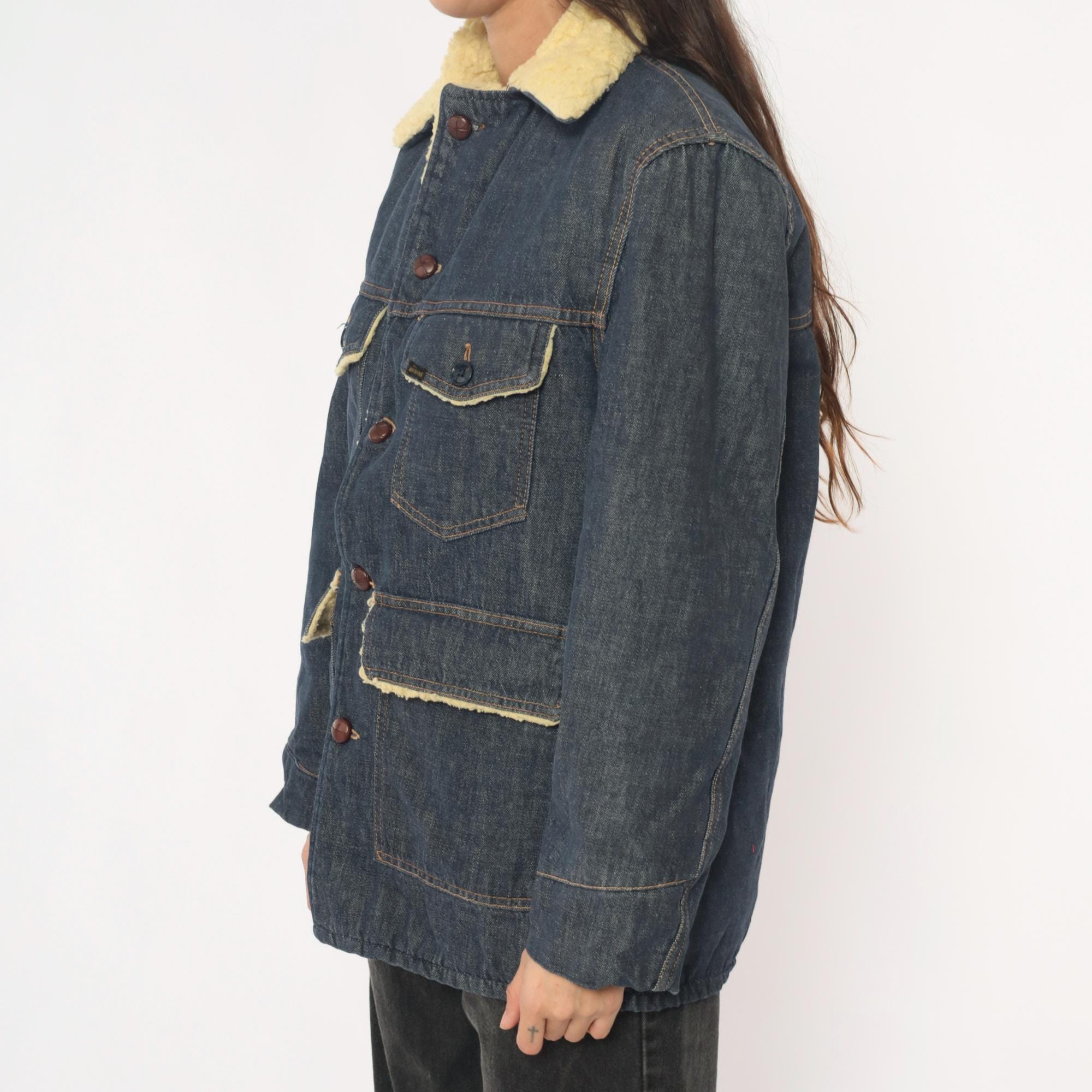 70s denim jacket from Roebucks with button front closure, two button-flap chest pockets, and two lower patch pockets. Dark indigo denim exterior with cream faux shearling lining throughout interior and collar. Denim with faux shearling lining.