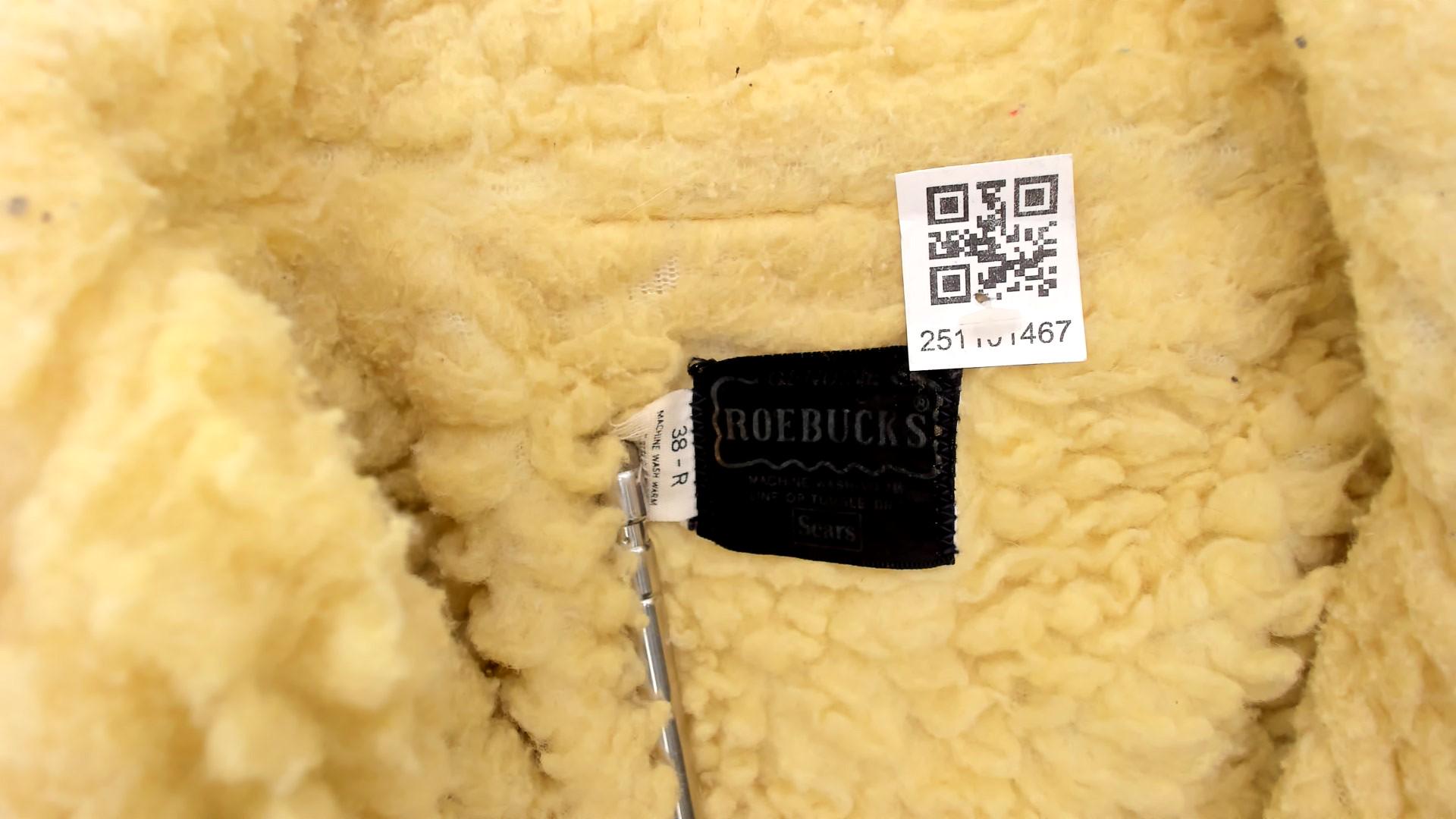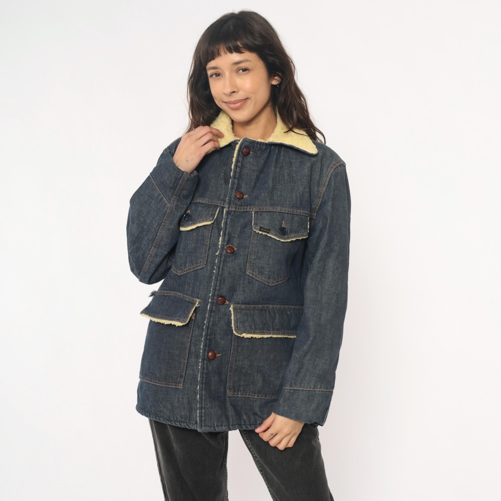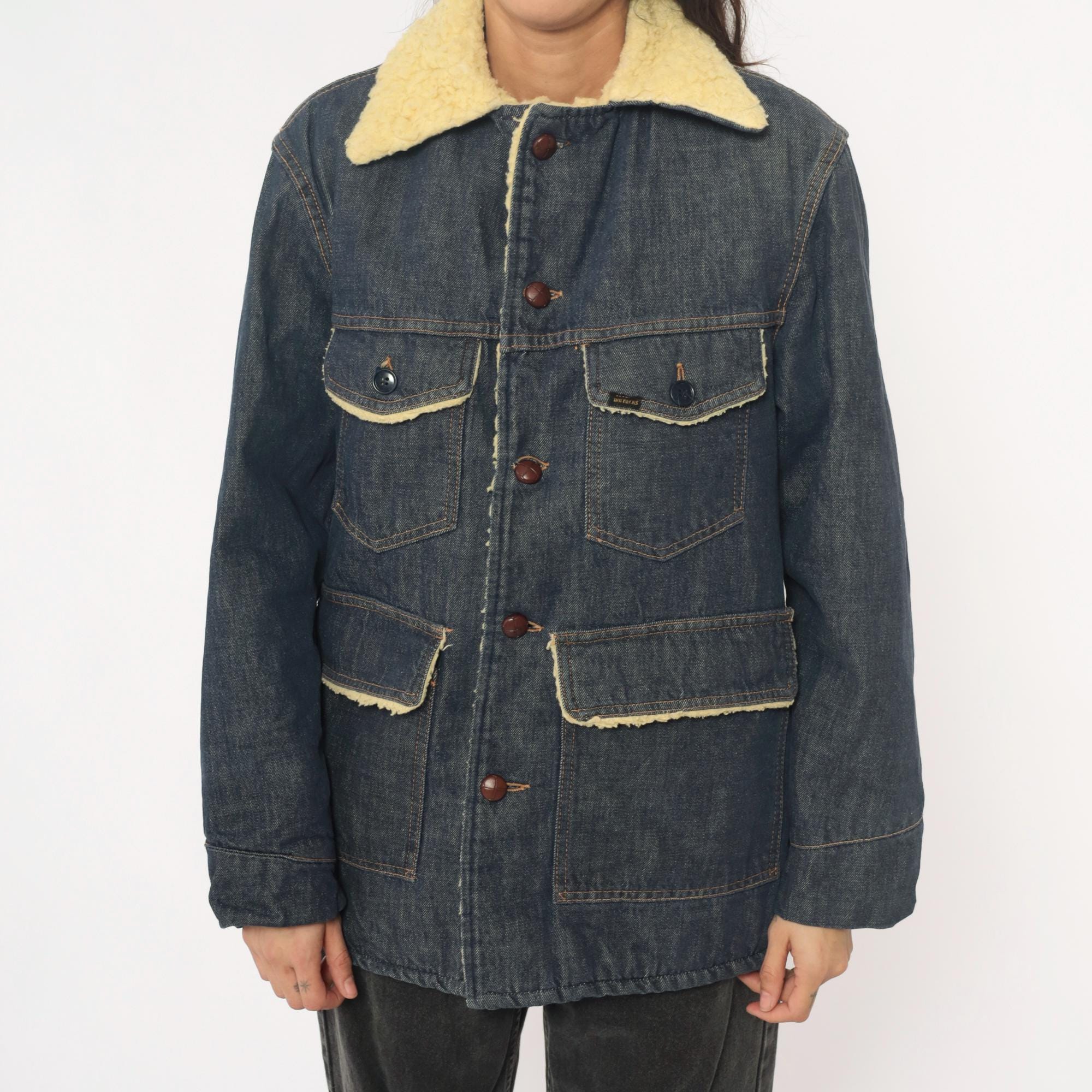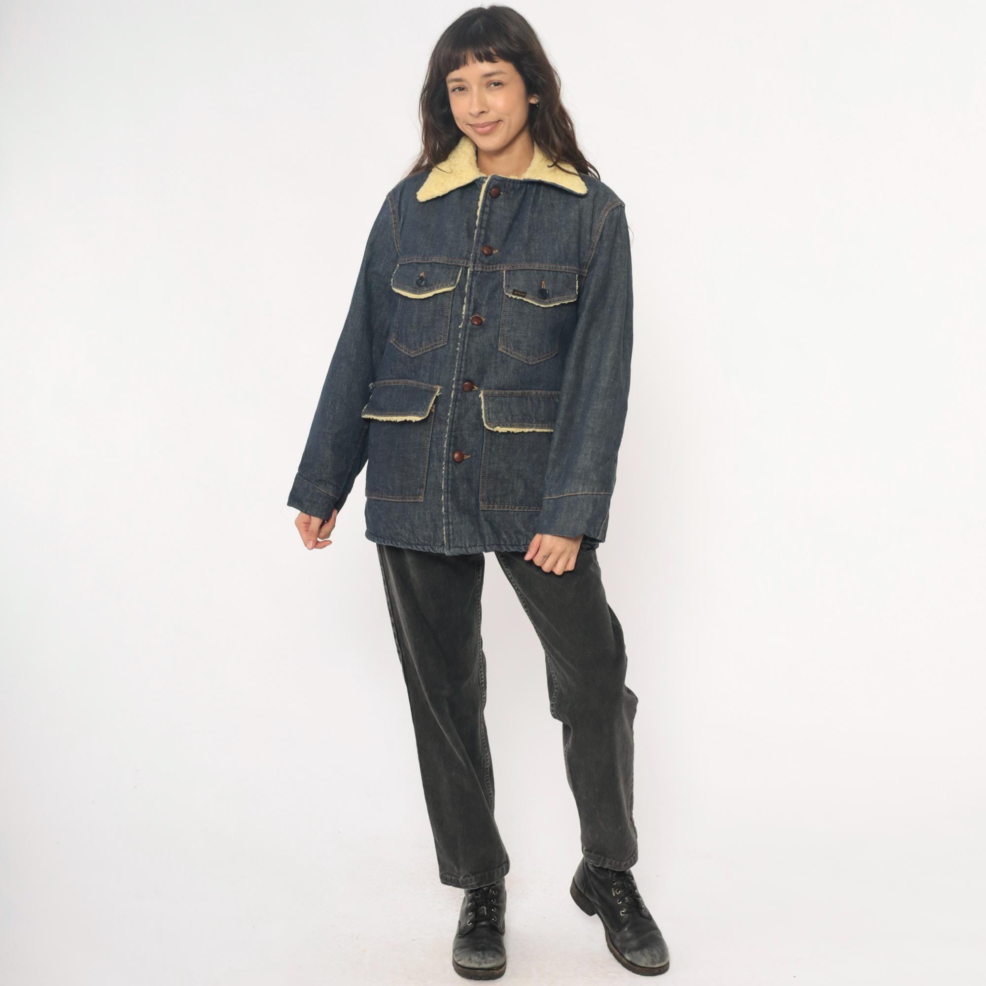 70s denim jacket from Roebucks with button front closure, two button-flap chest pockets, and two lower patch pockets. Dark indigo denim exterior with cream faux shearling lining throughout interior and collar. Denim with faux shearling lining.