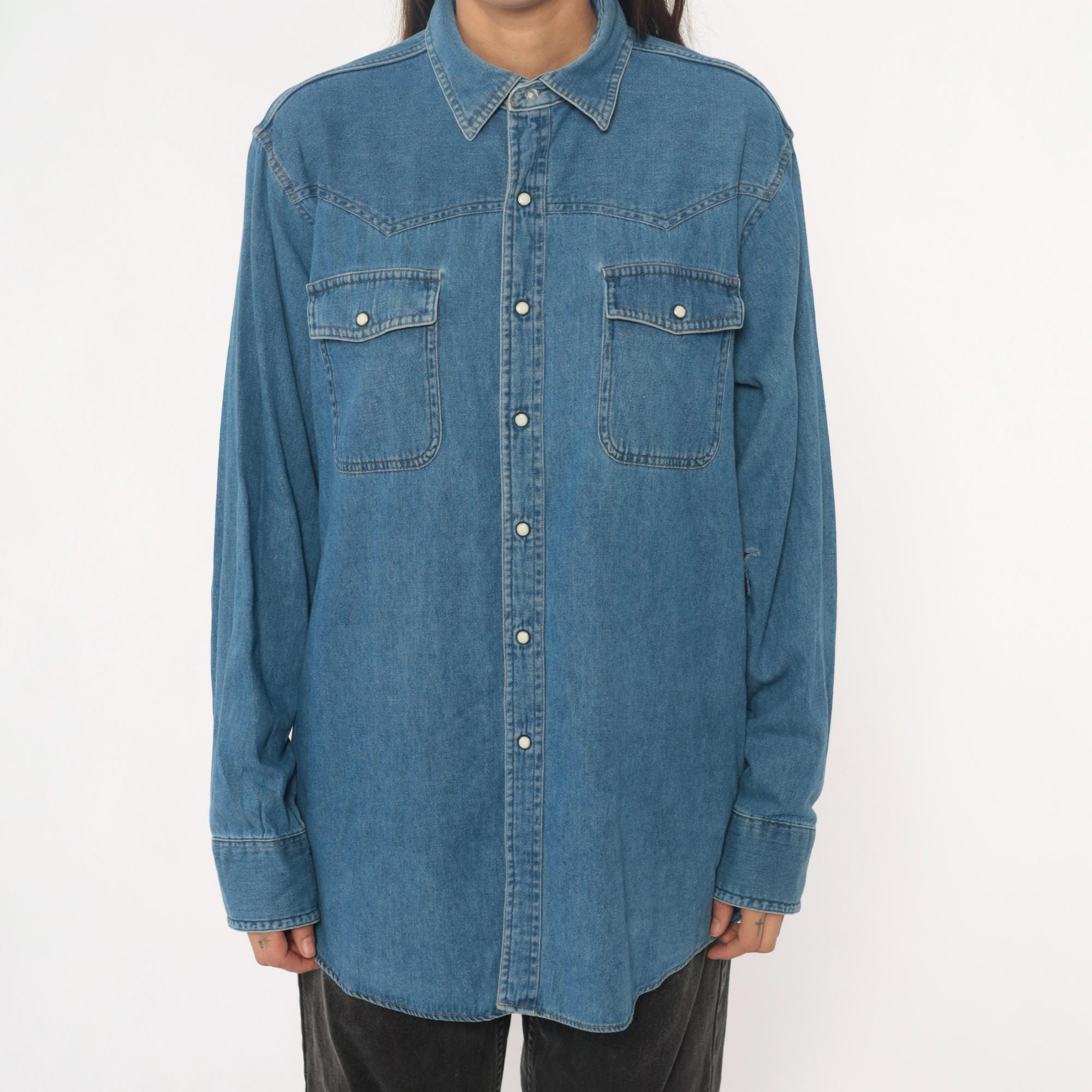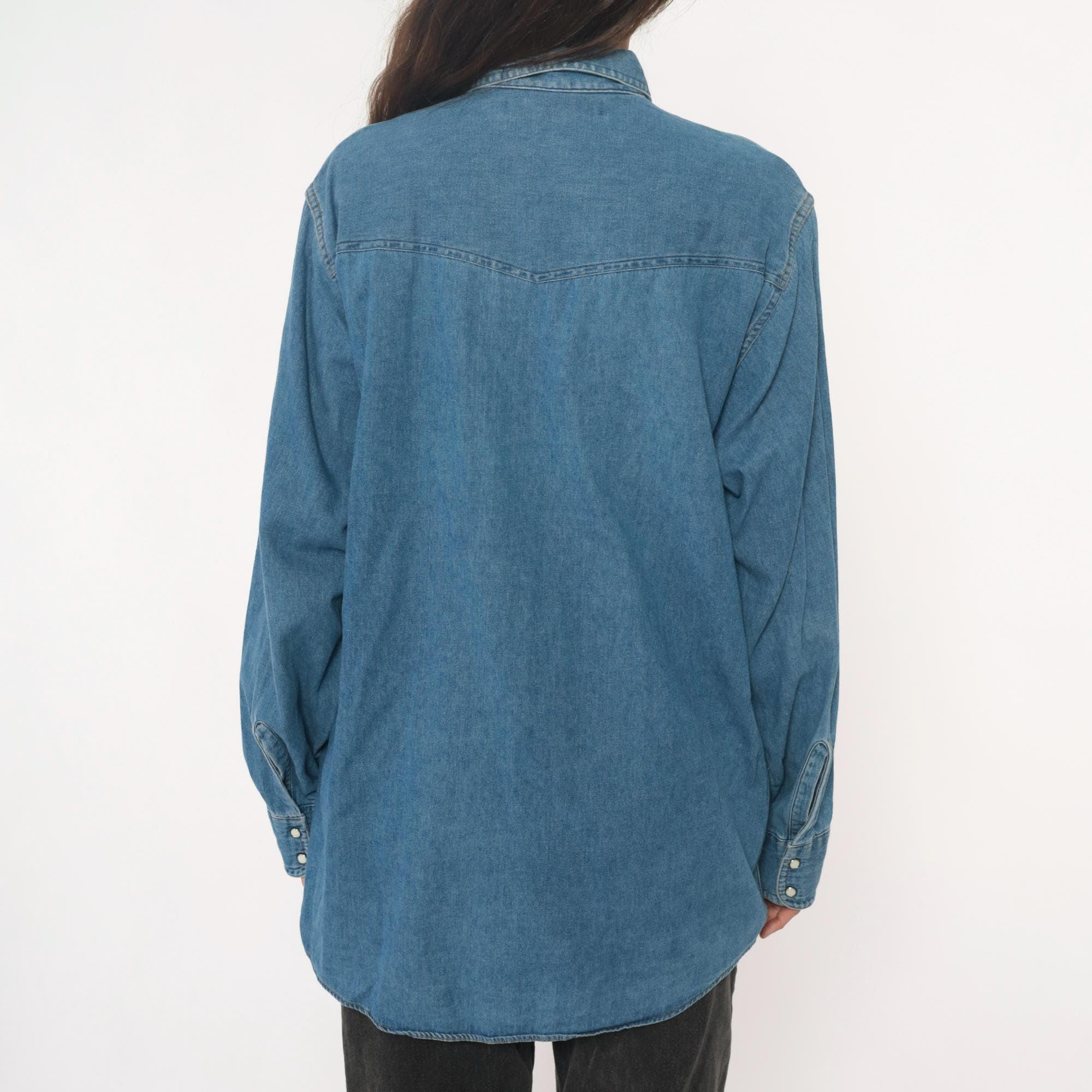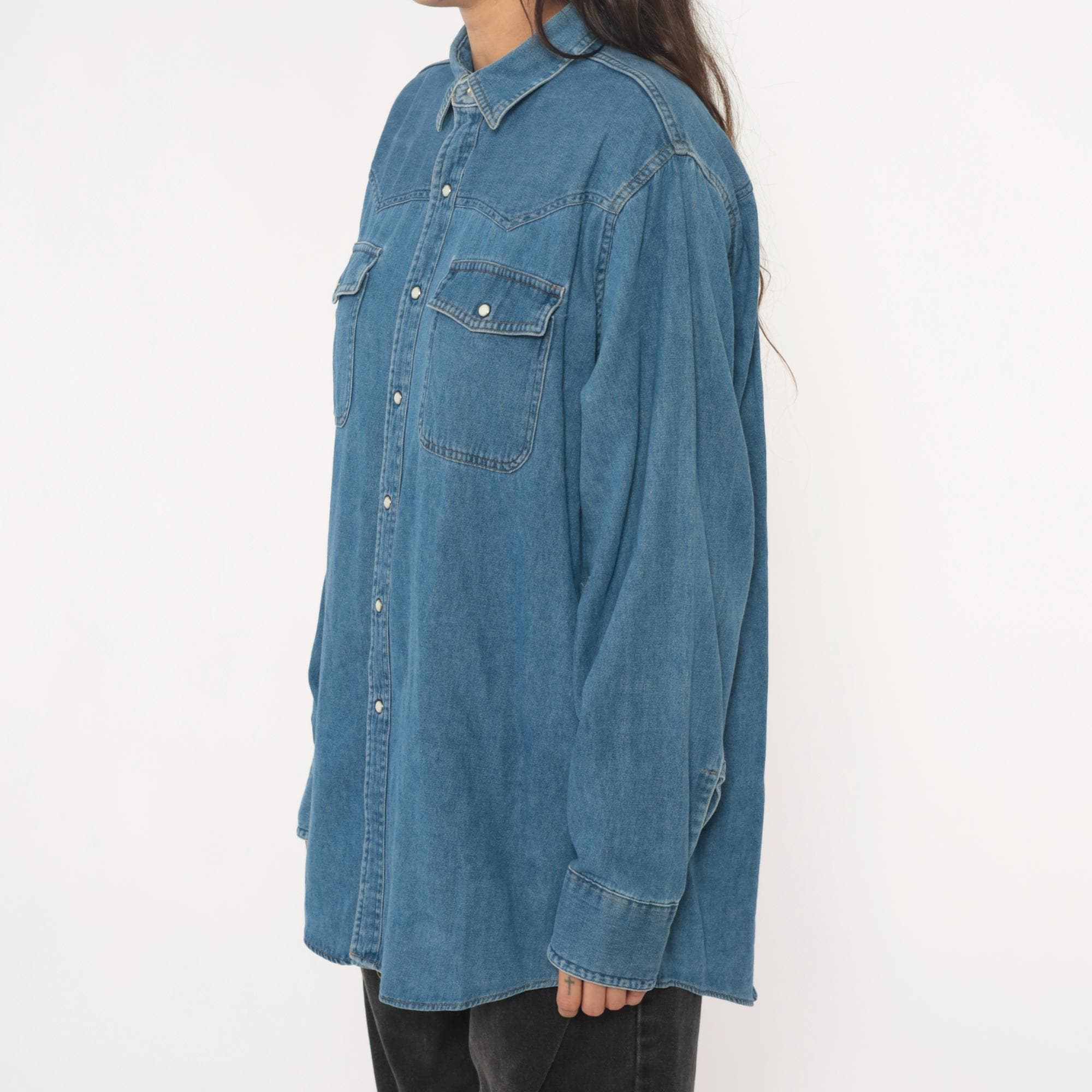 90s denim shirt from pitkin county dry goods in medium blue wash with western styling. Pointed yoke across chest and back, two chest pockets with pointed flaps and snap closures, snap button front. Long sleeves with button cuffs, pointed collar.