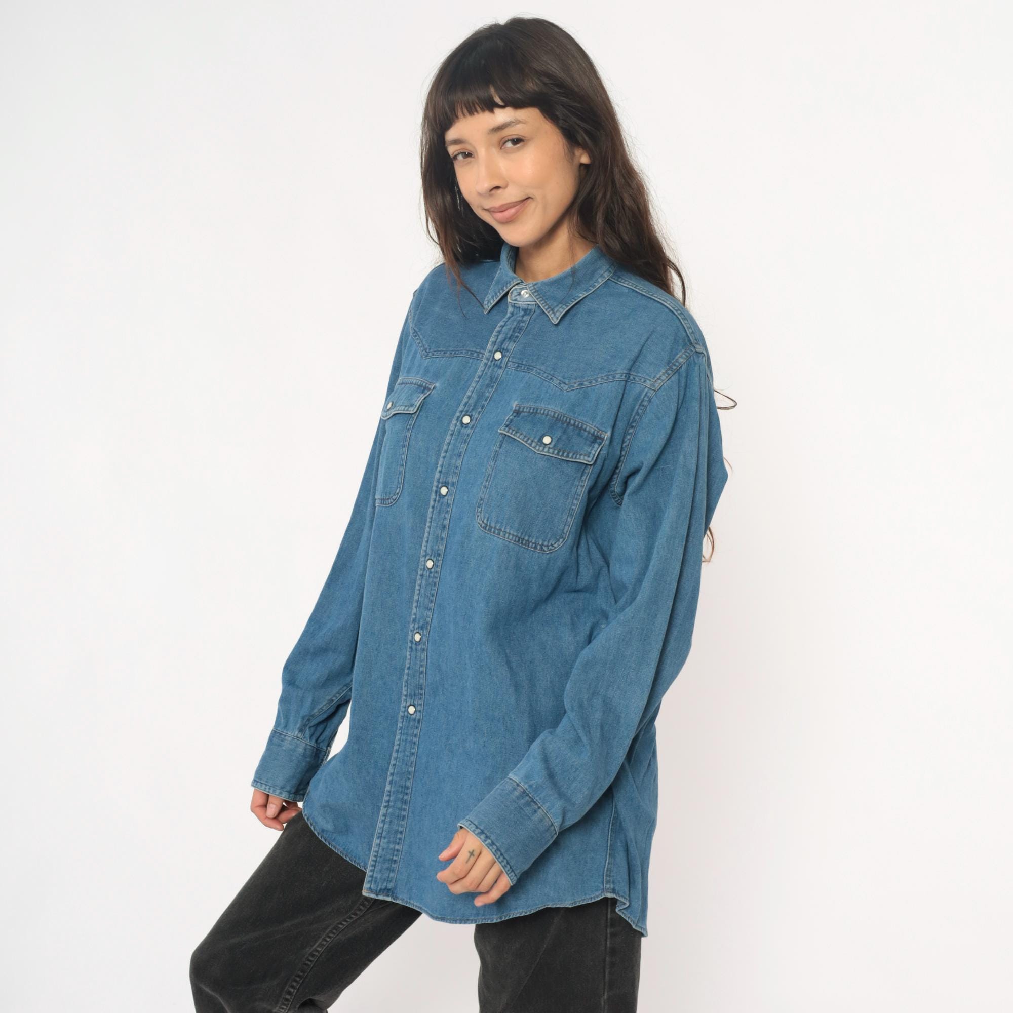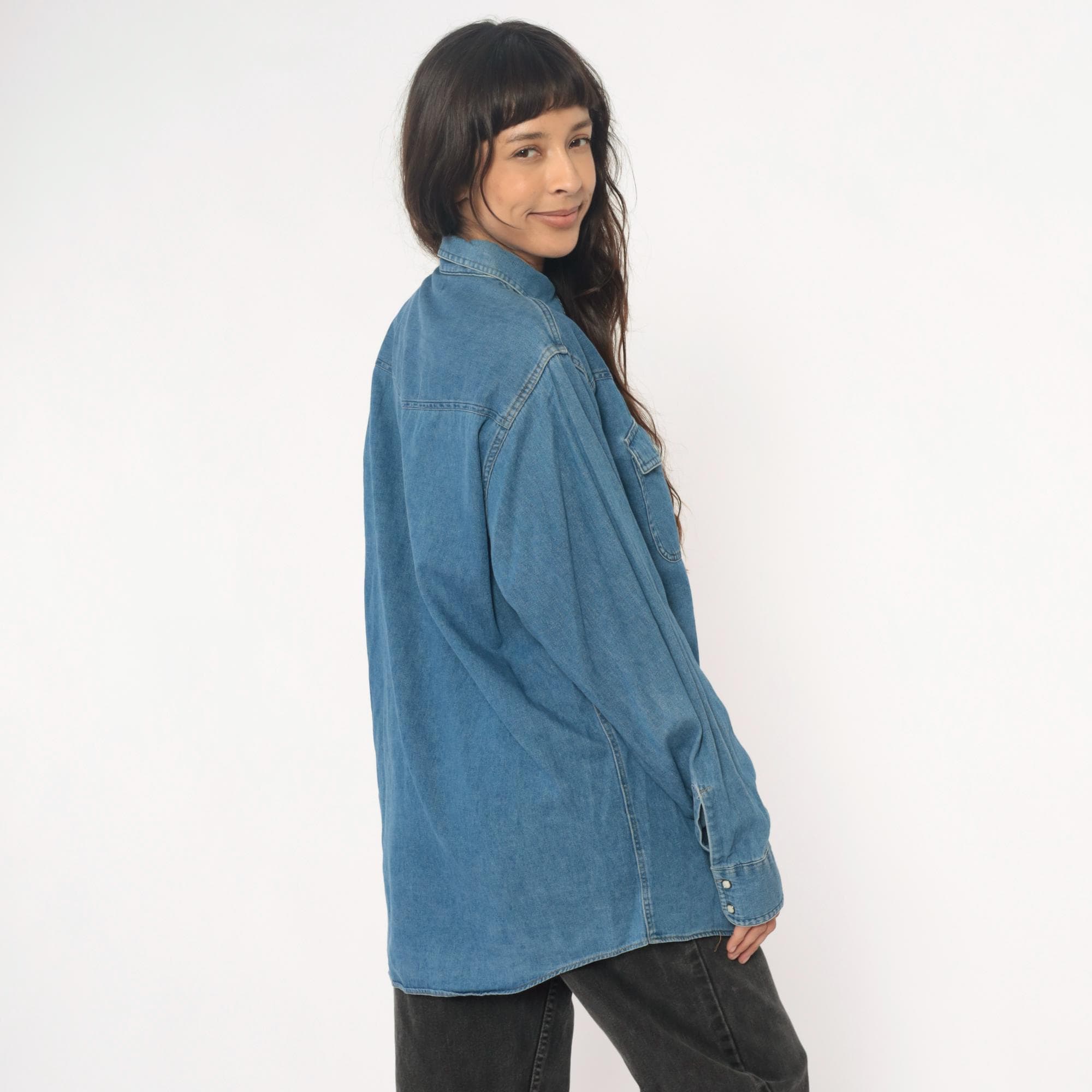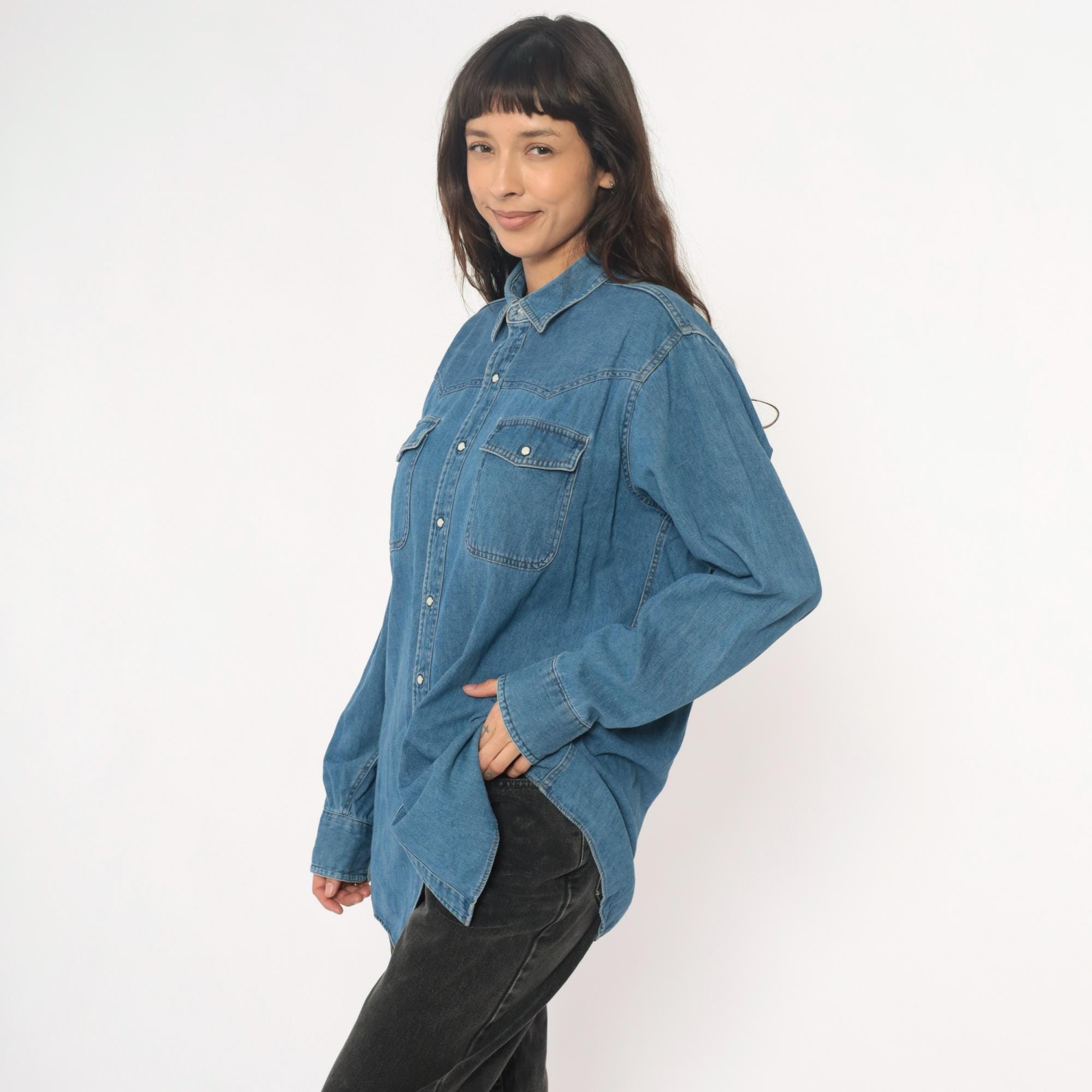 90s denim shirt from pitkin county dry goods in medium blue wash with western styling. Pointed yoke across chest and back, two chest pockets with pointed flaps and snap closures, snap button front. Long sleeves with button cuffs, pointed collar.