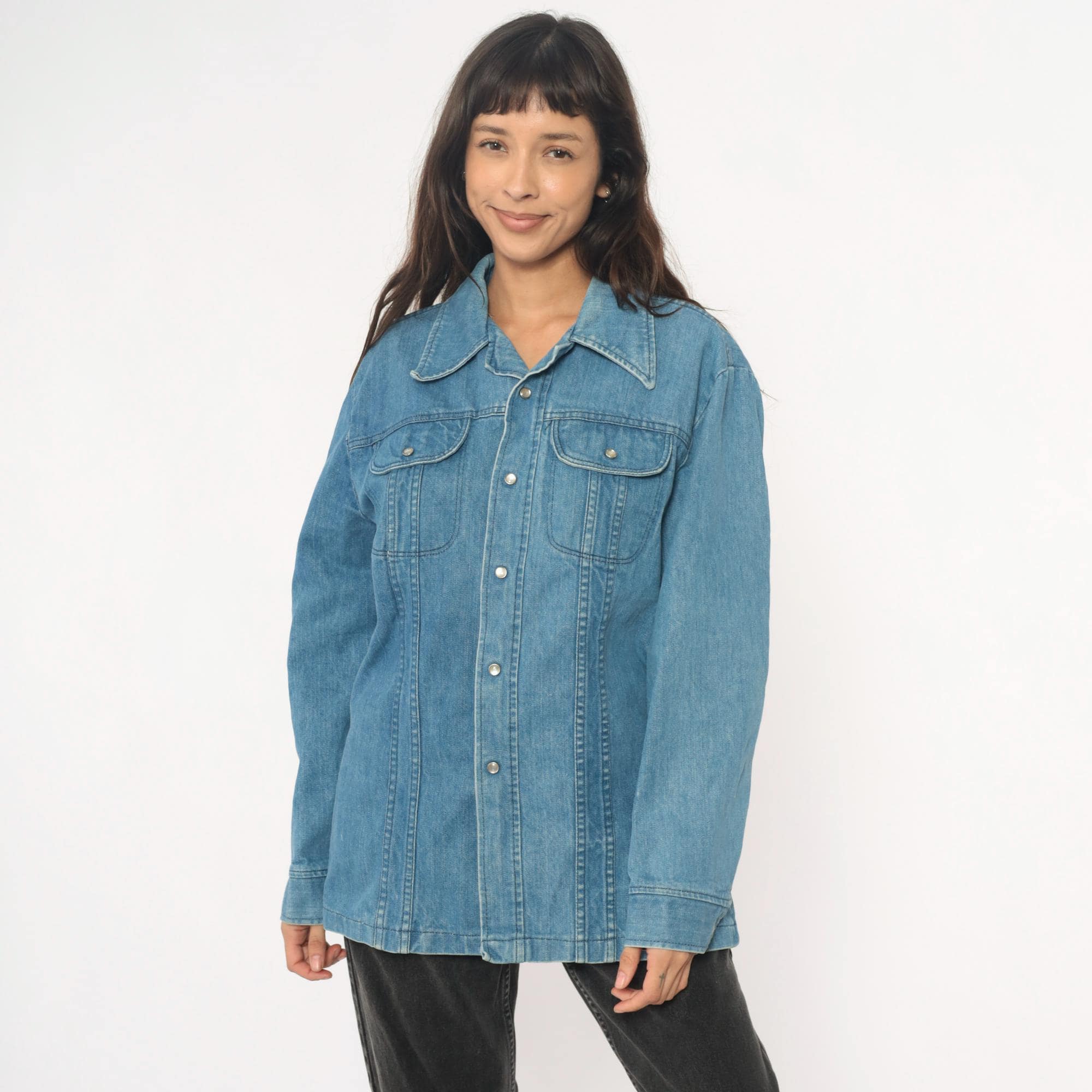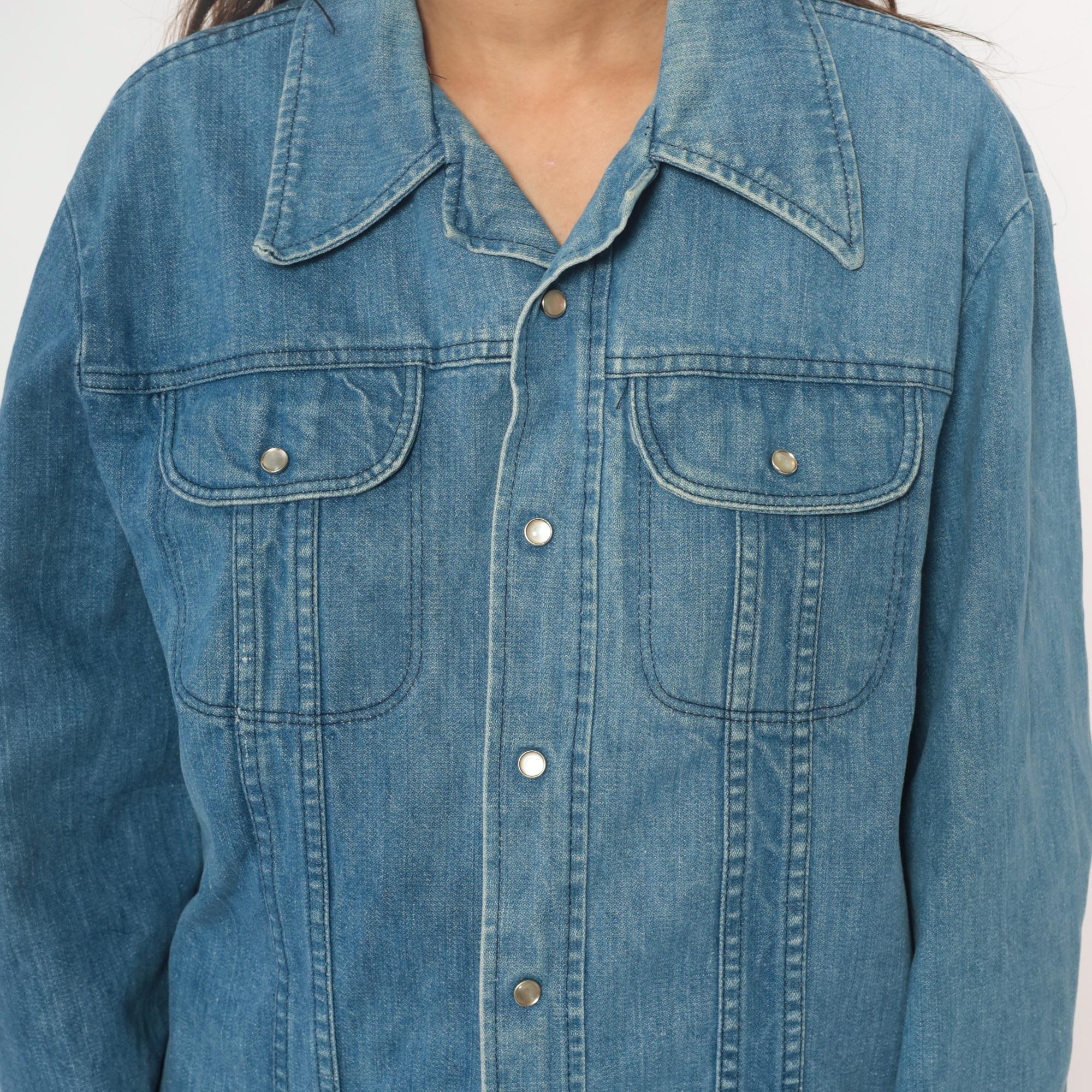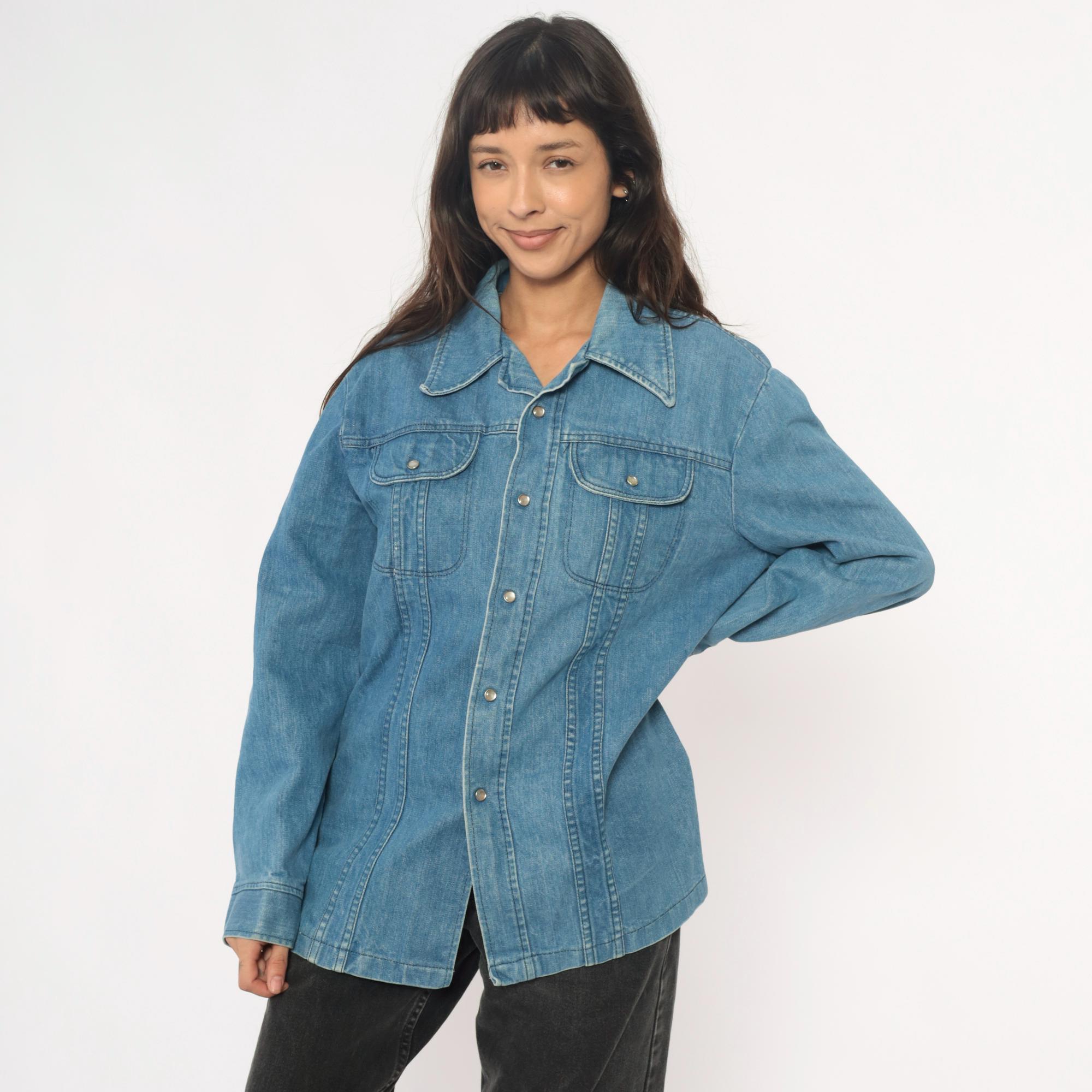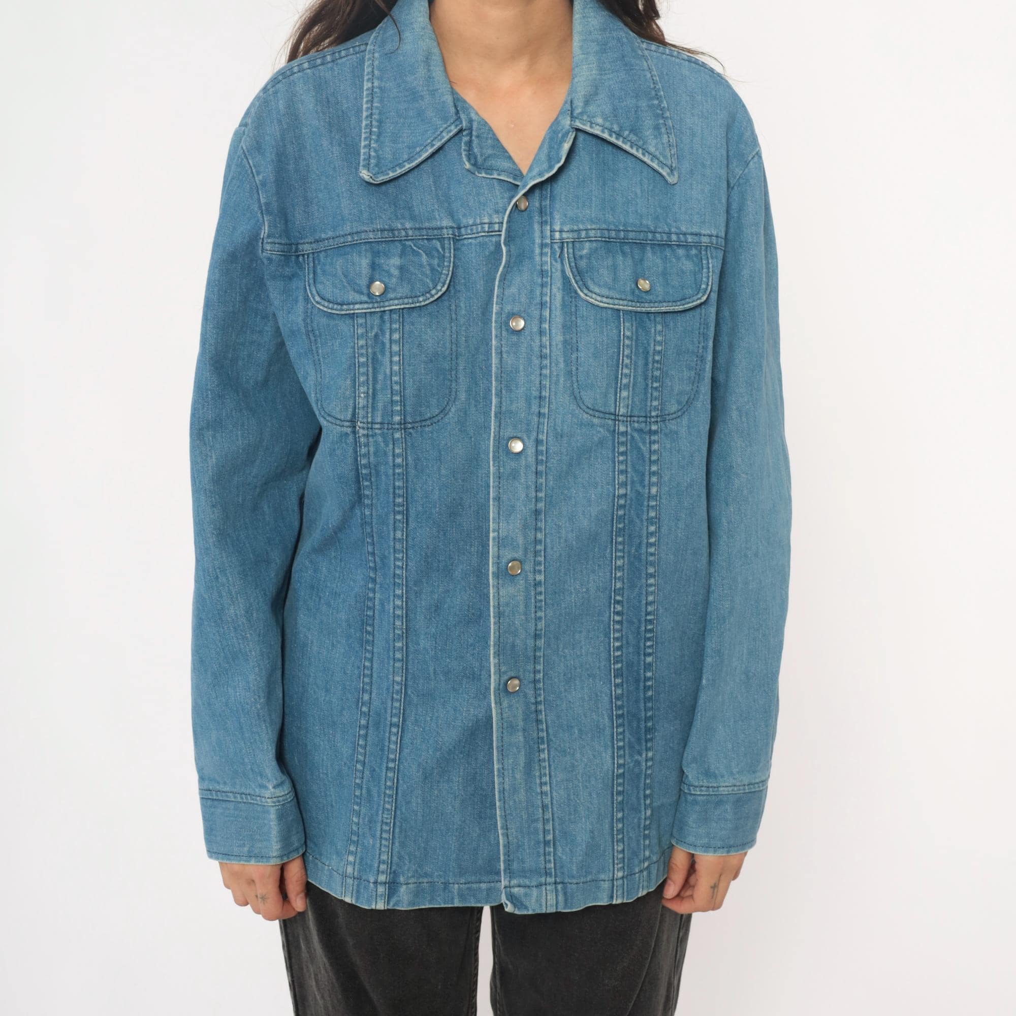 70s light blue denim shirt in a shirt-jacket silhouette with pointed collar and snap button front closure. Two chest pockets with flap closures and snap buttons, long sleeves with snap cuffs, contrast topstitching throughout.