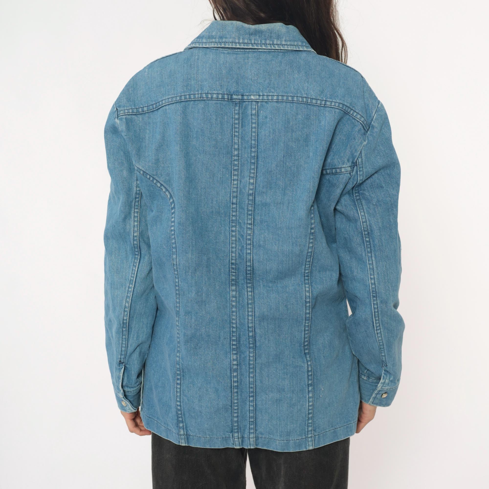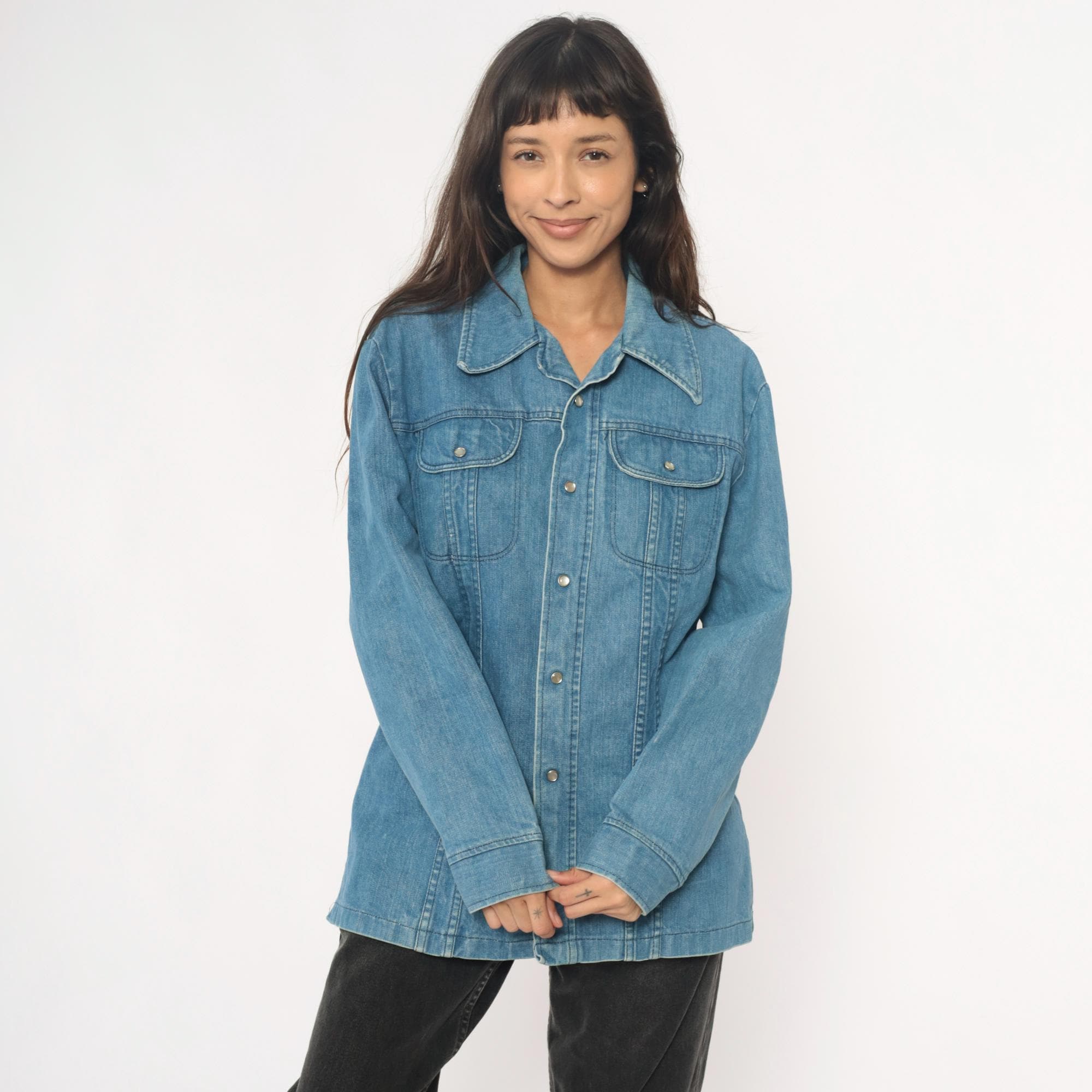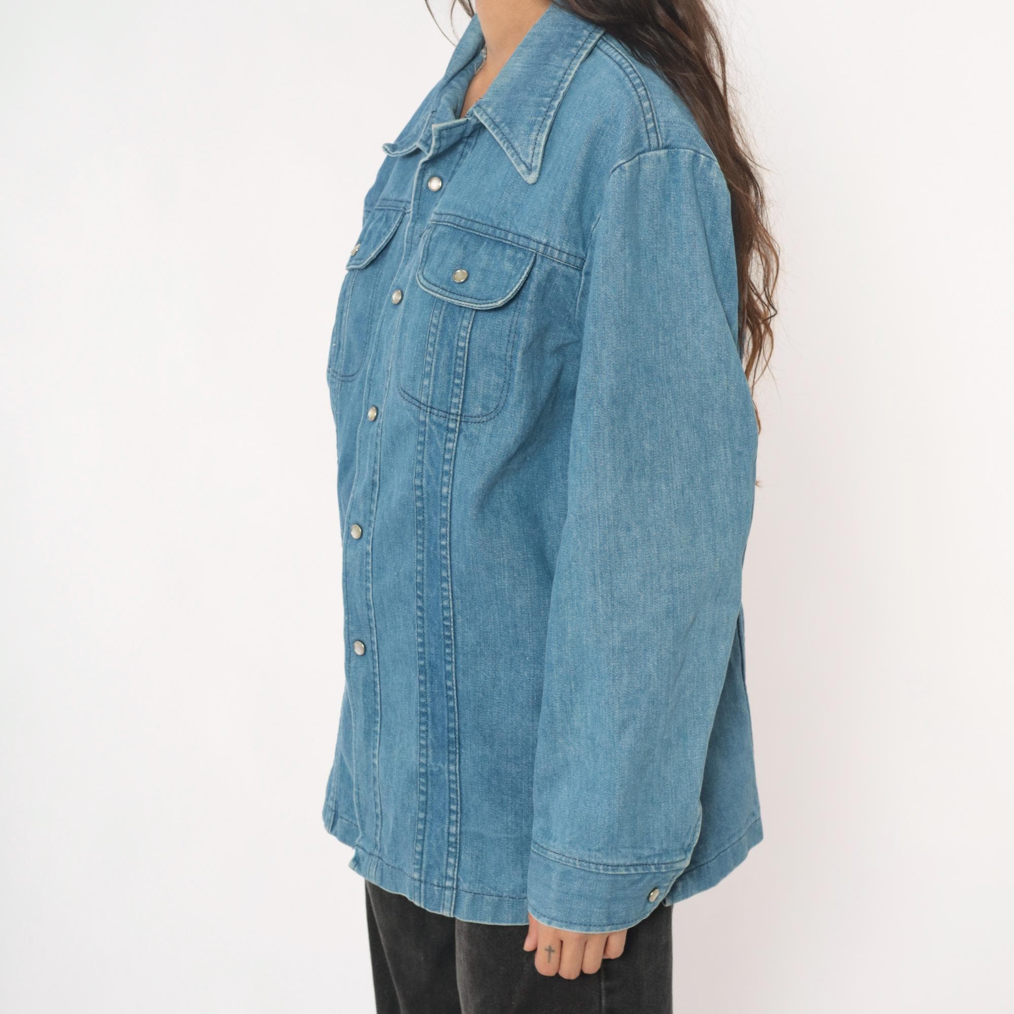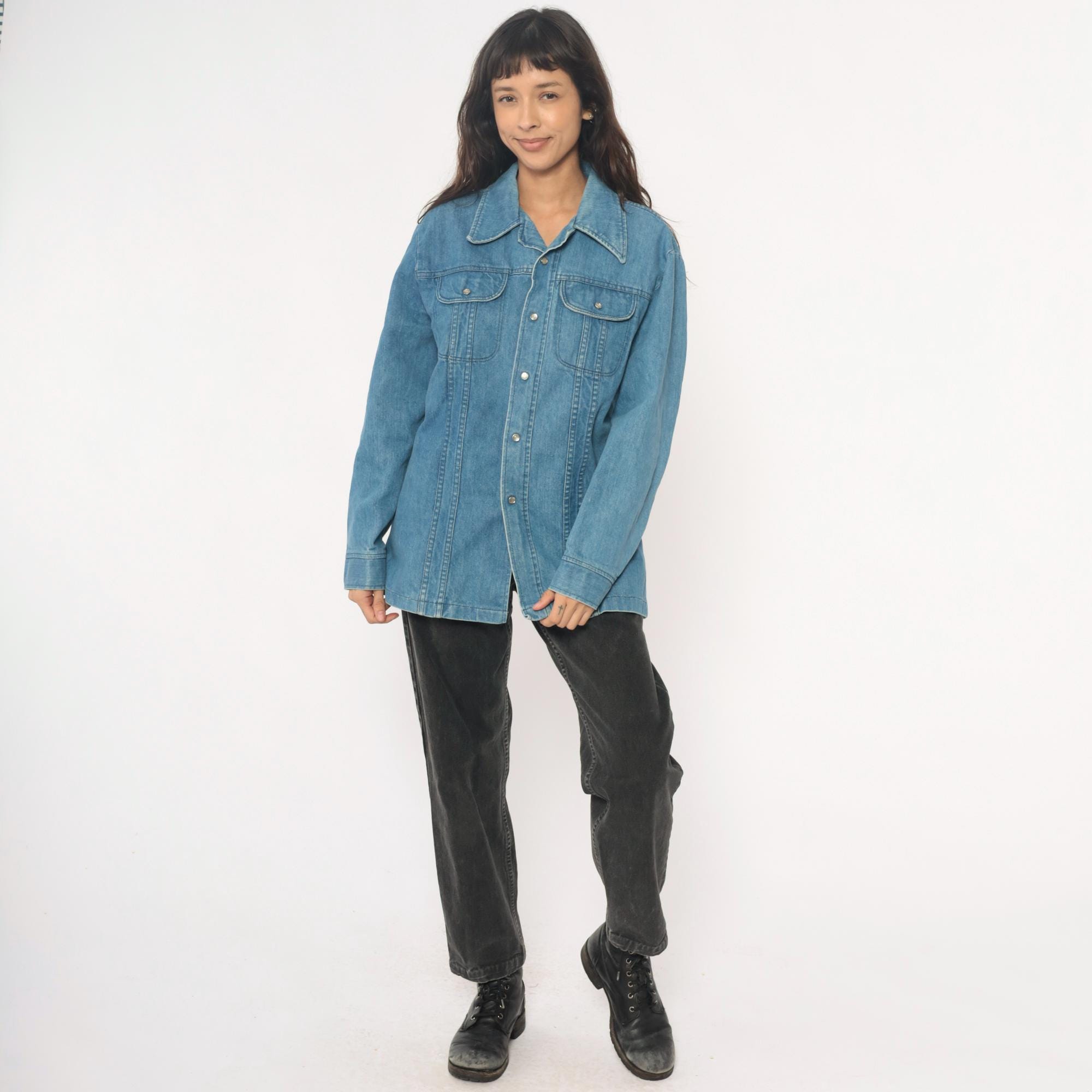 70s light blue denim shirt in a shirt-jacket silhouette with pointed collar and snap button front closure. Two chest pockets with flap closures and snap buttons, long sleeves with snap cuffs, contrast topstitching throughout.