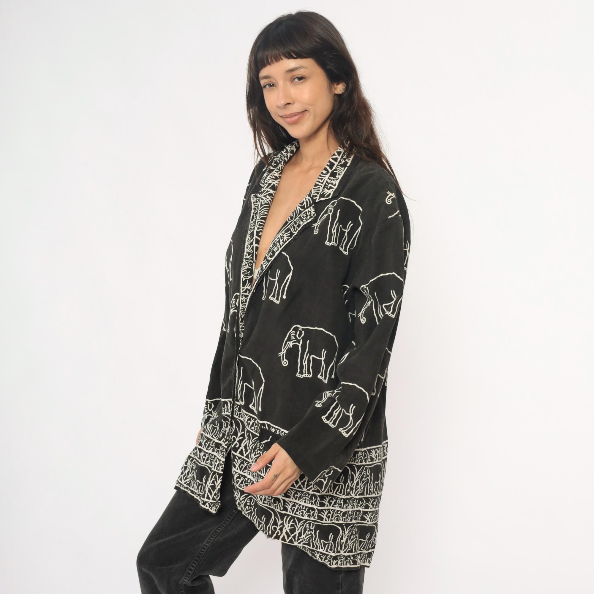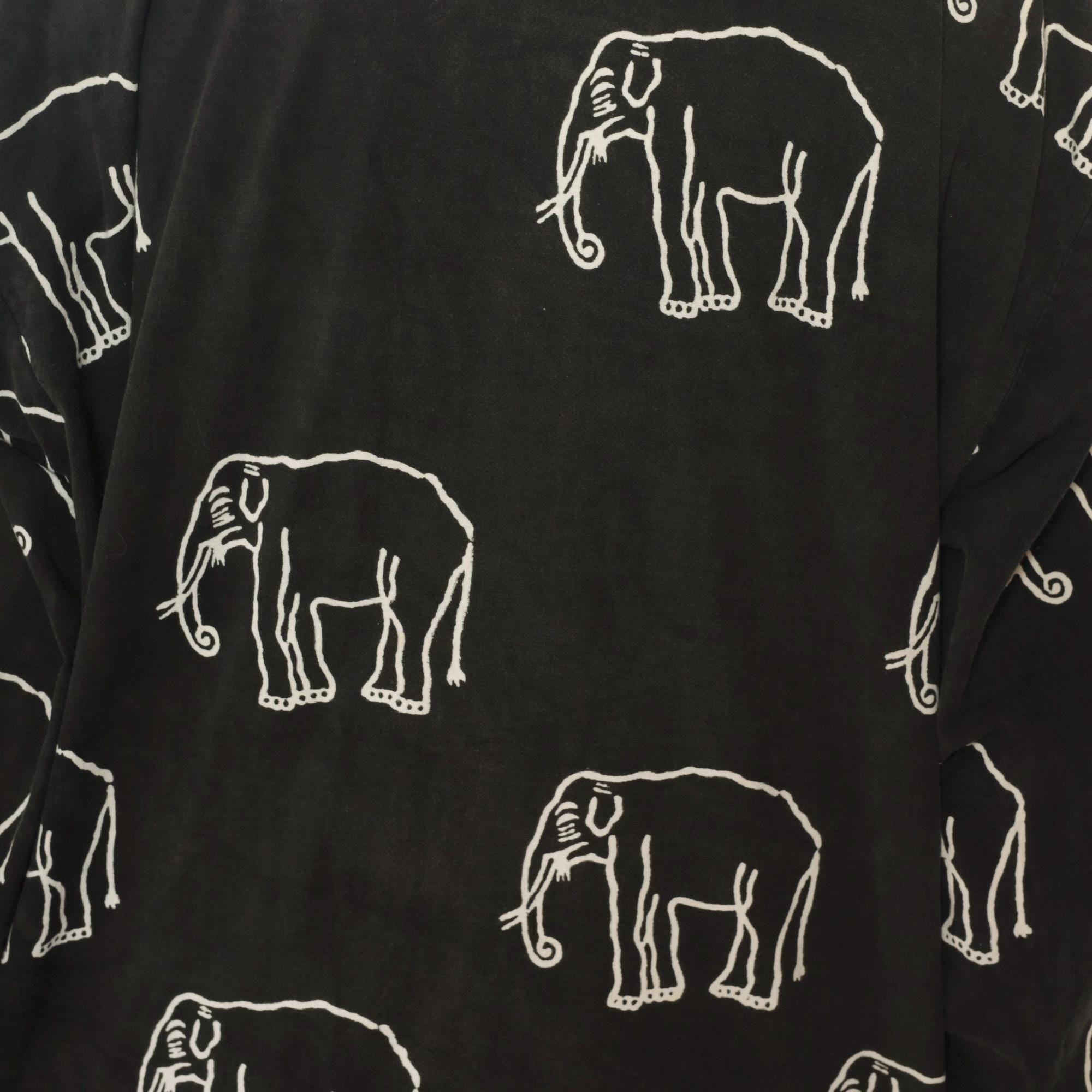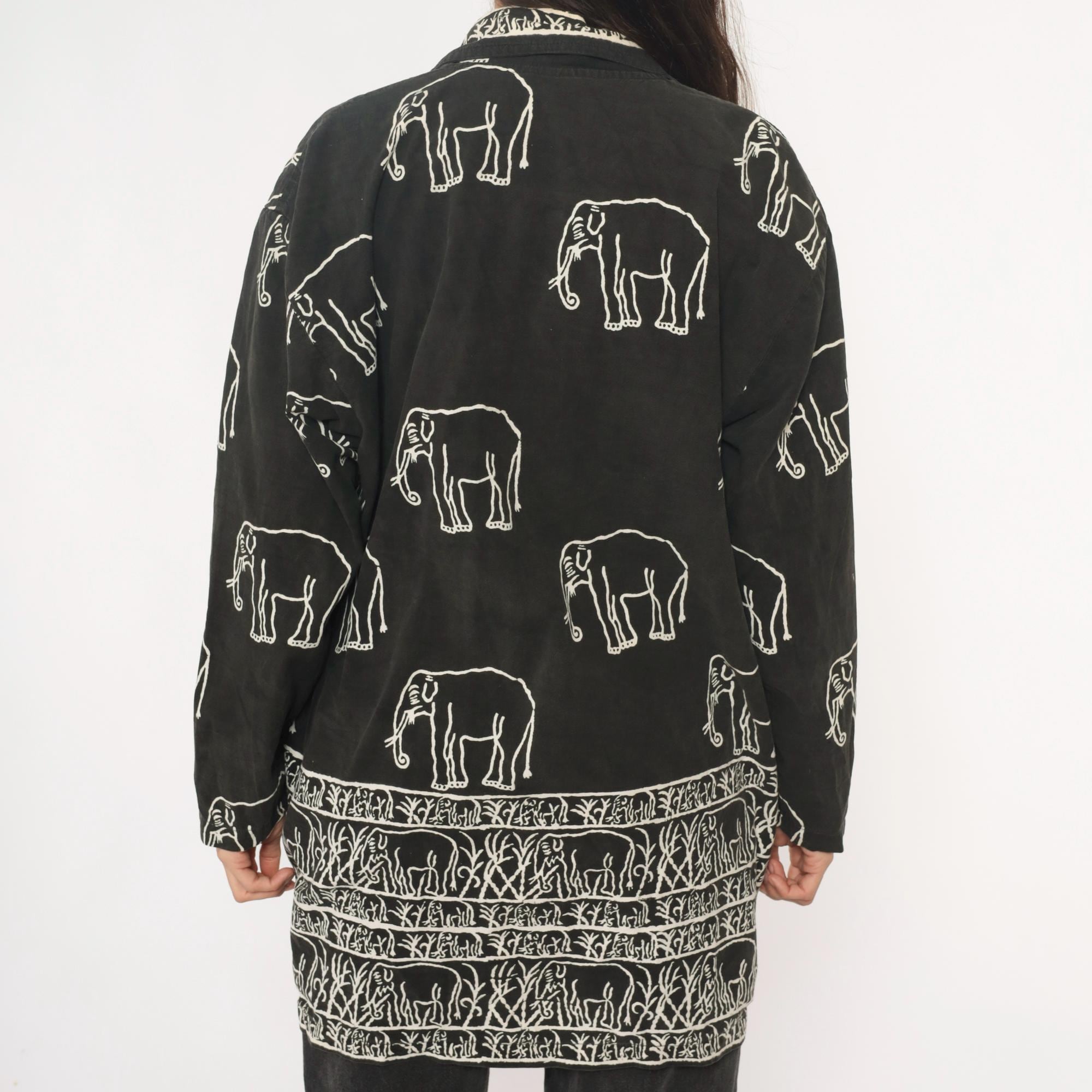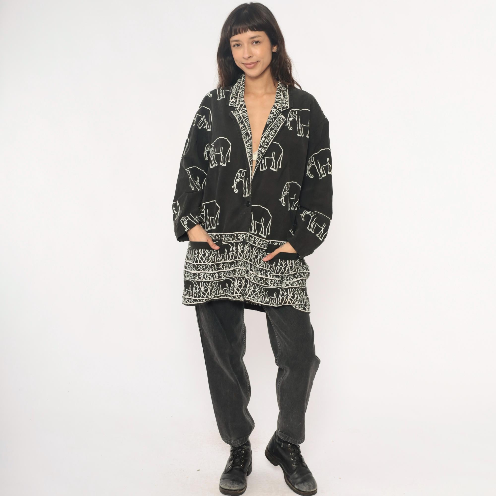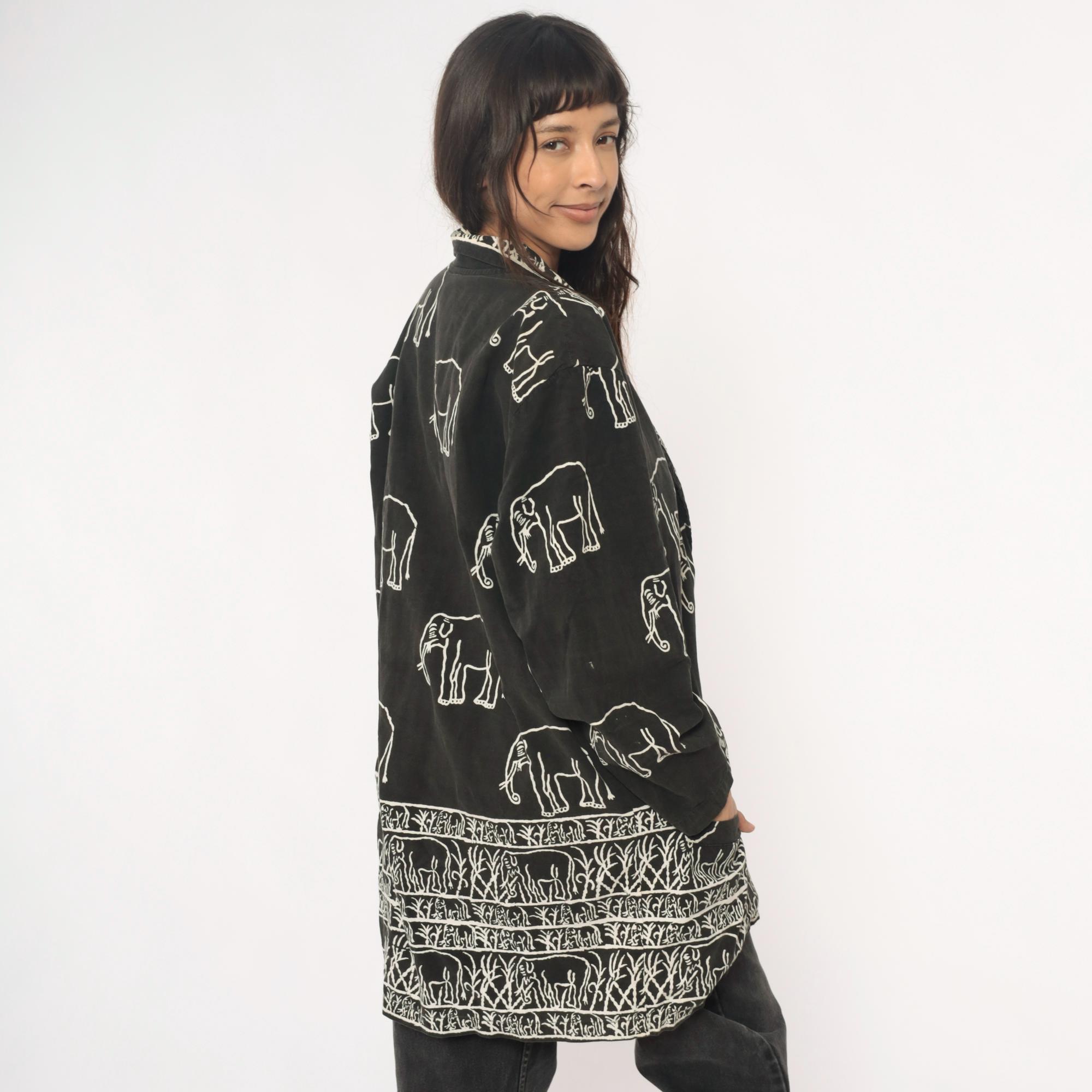 90s black cotton tunic with white elephant print scattered across the body and sleeves. Collared neckline with button front closure, geometric border trim at collar, cuffs, and hem. Long sleeves, relaxed fit.