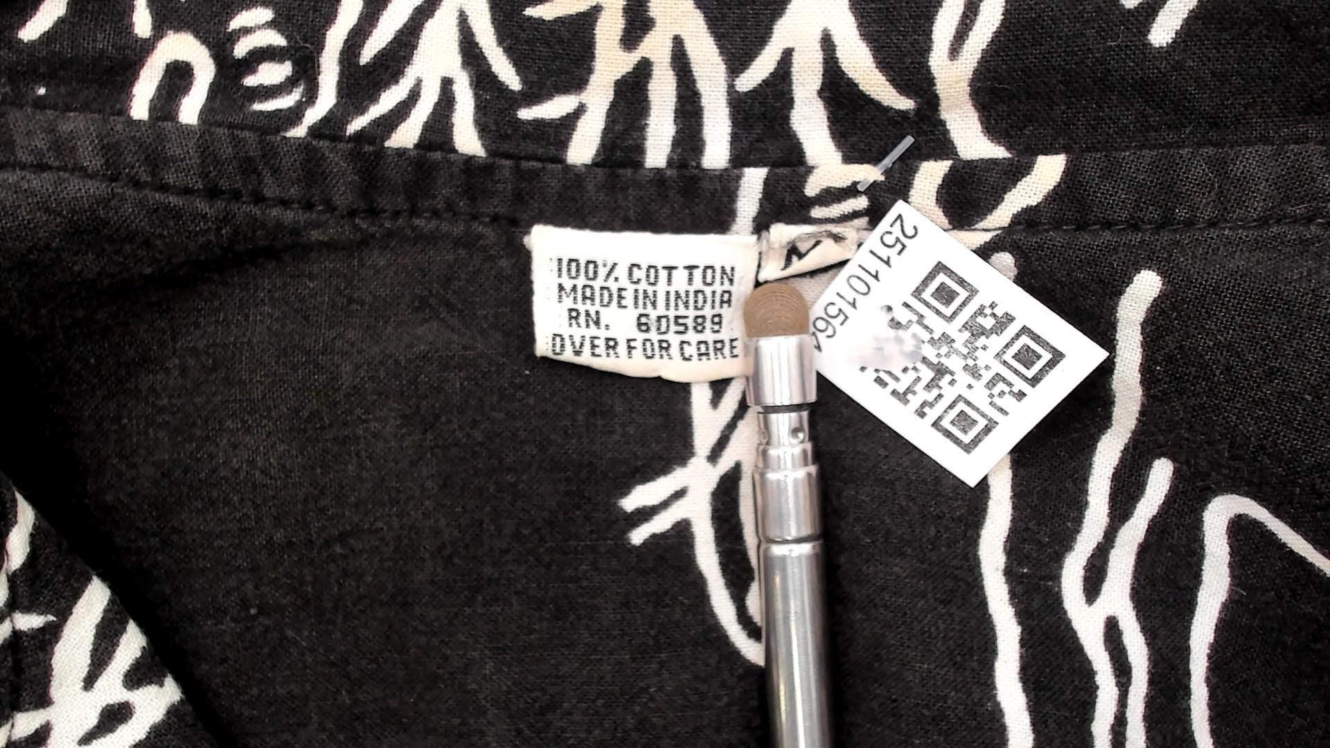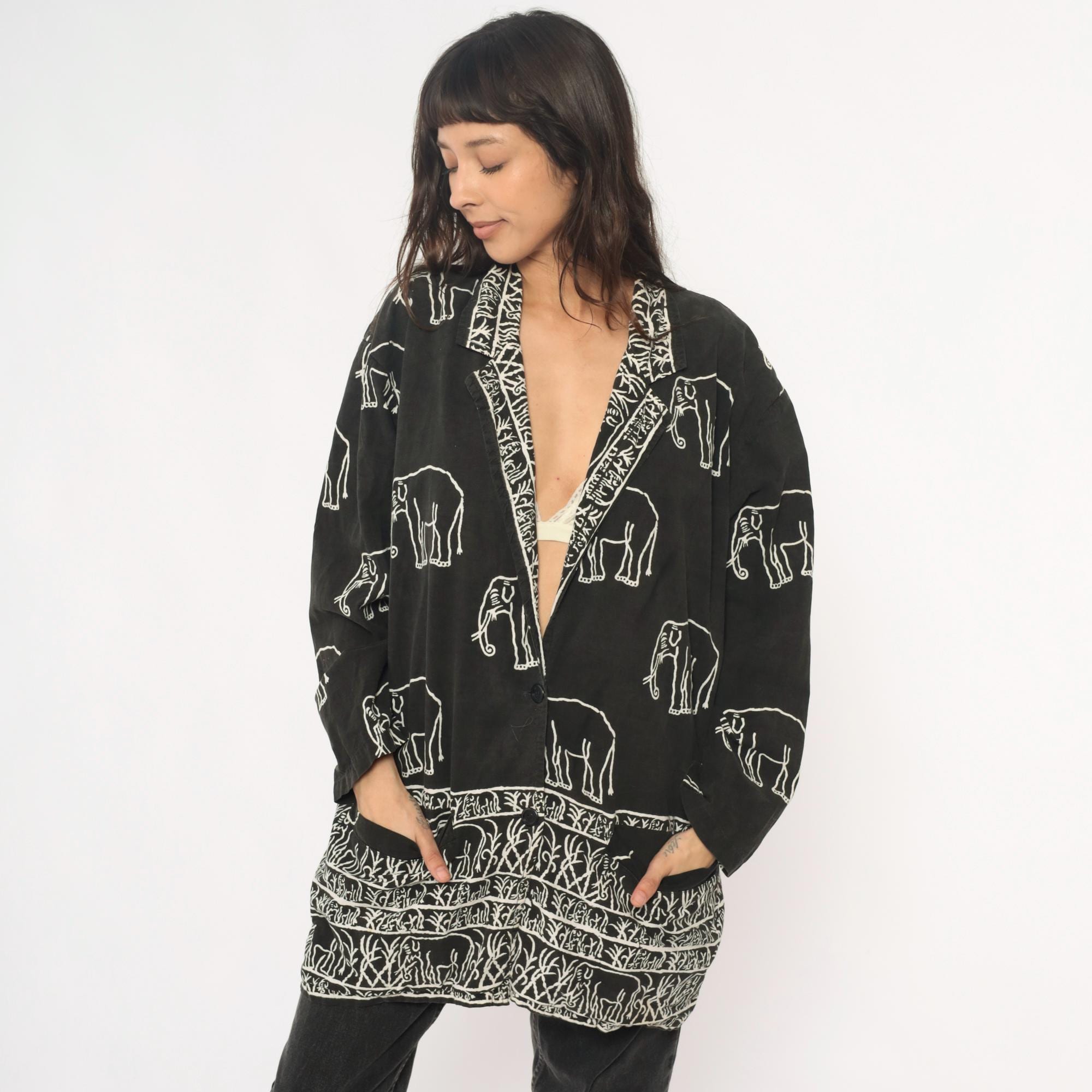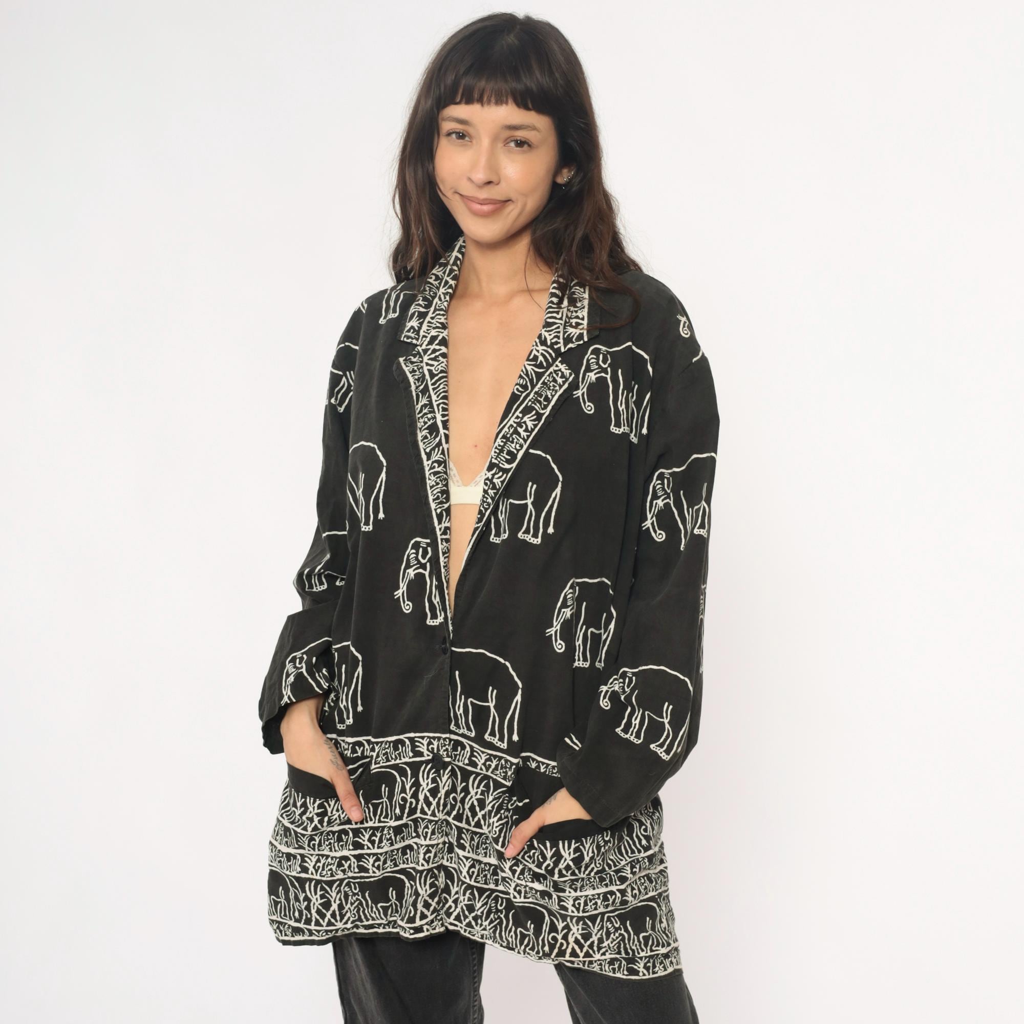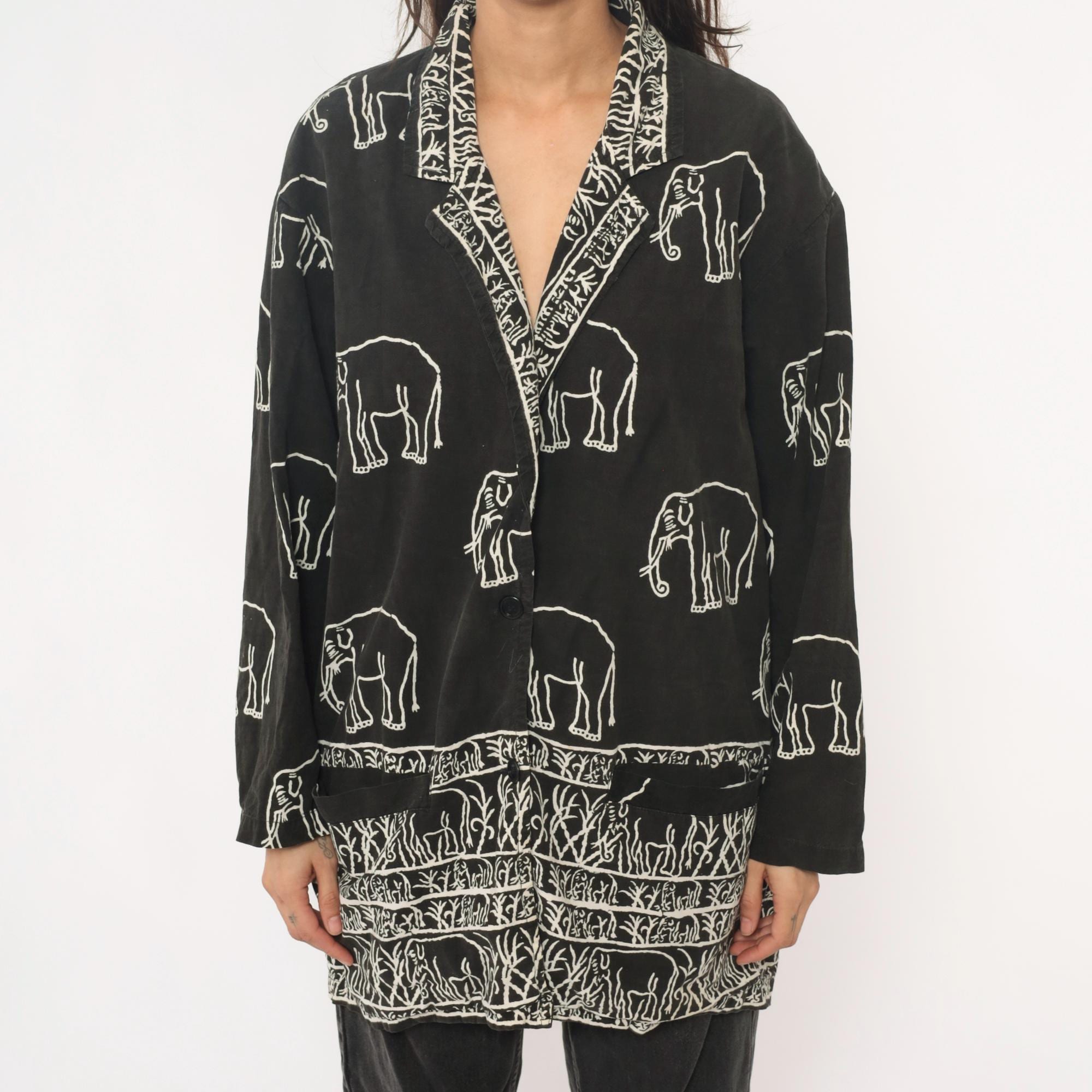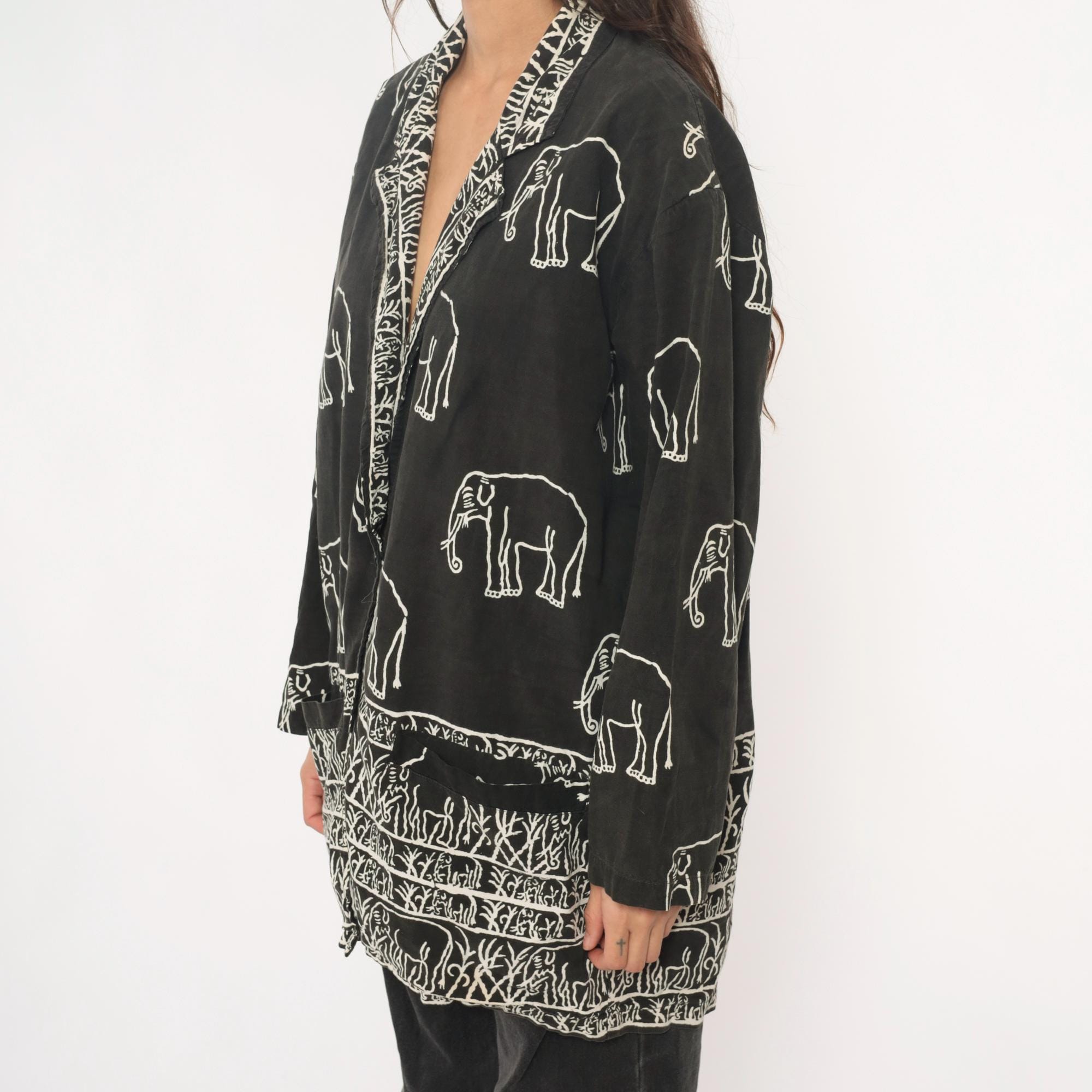 90s black cotton tunic with white elephant print scattered across the body and sleeves. Collared neckline with button front closure, geometric border trim at collar, cuffs, and hem. Long sleeves, relaxed fit.
