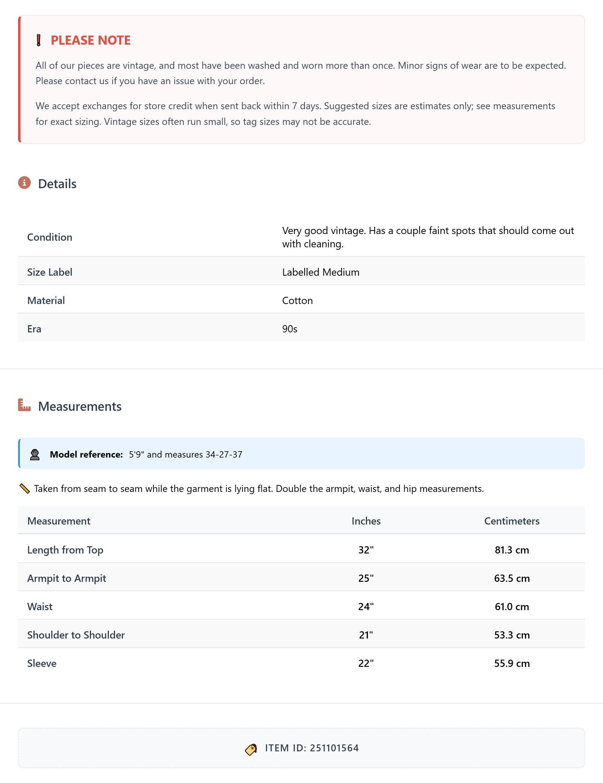 All of our pieces are vintage, and most have been washed and worn more than once. Minor signs of wear are to be expected. Please contact us if you have an issue with your order. We accept exchanges for store credit when sent back within 7 days.