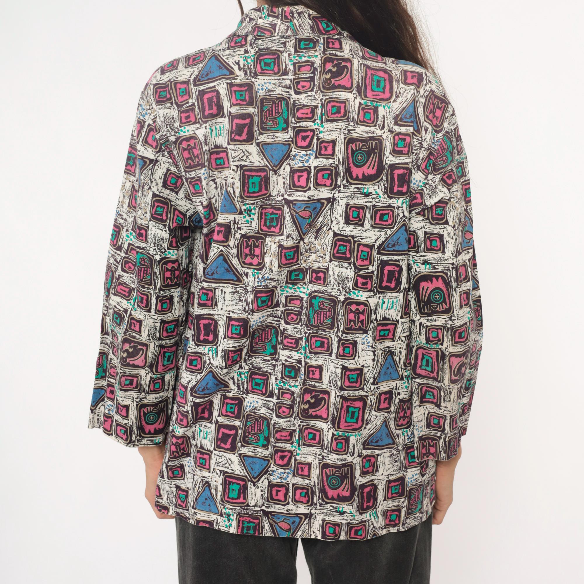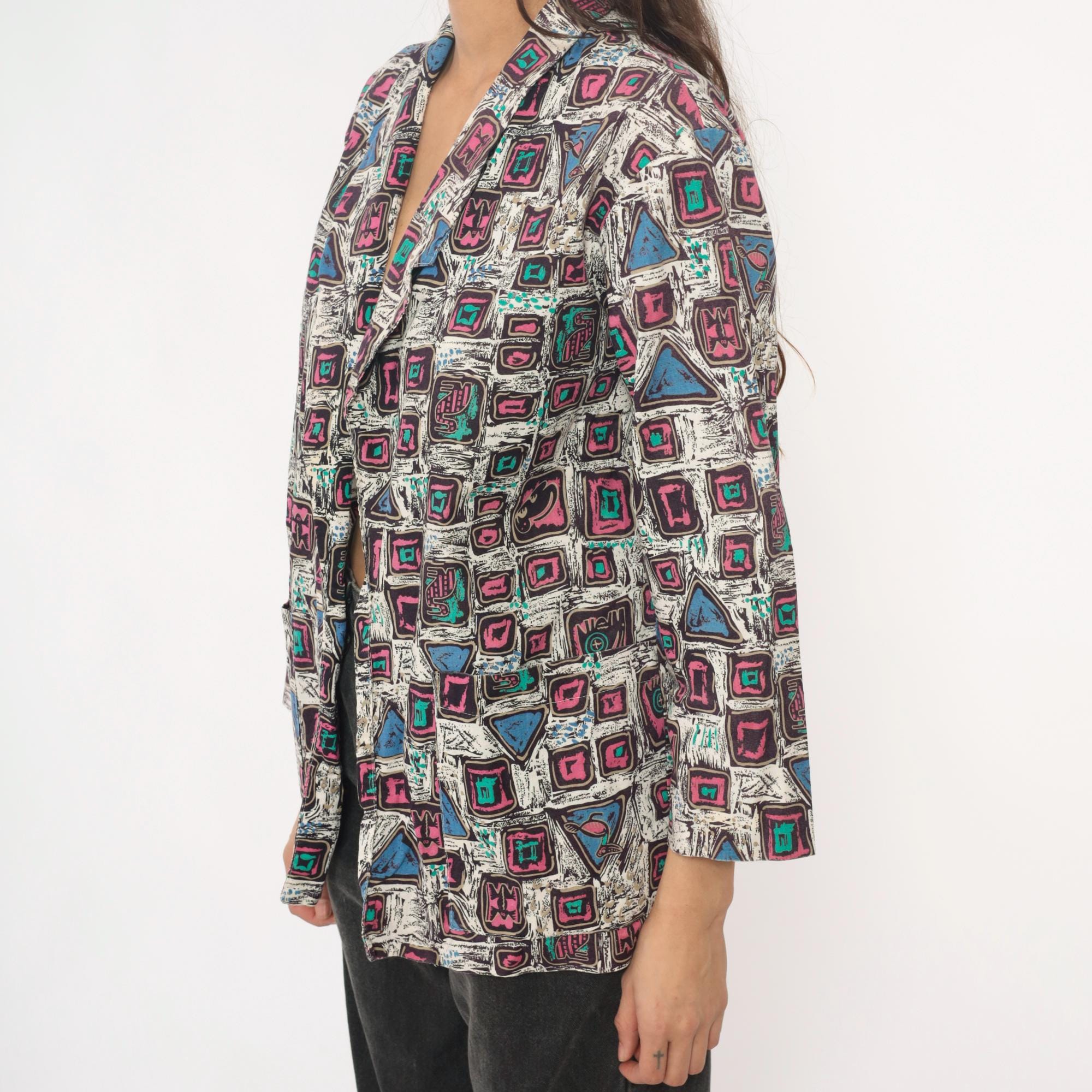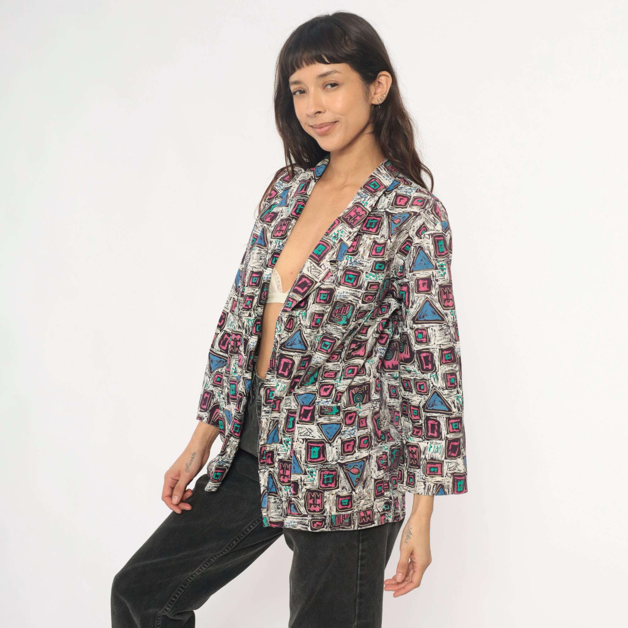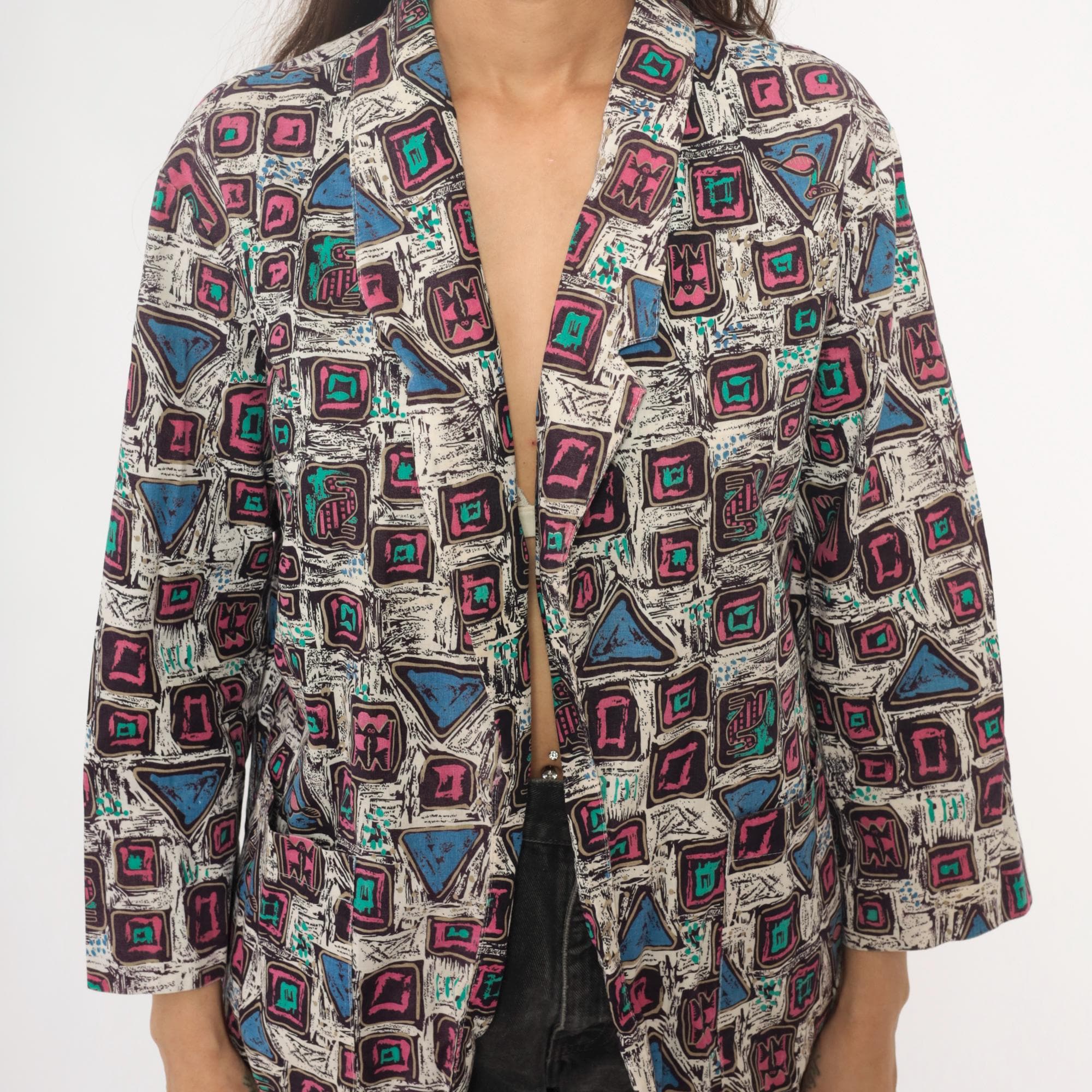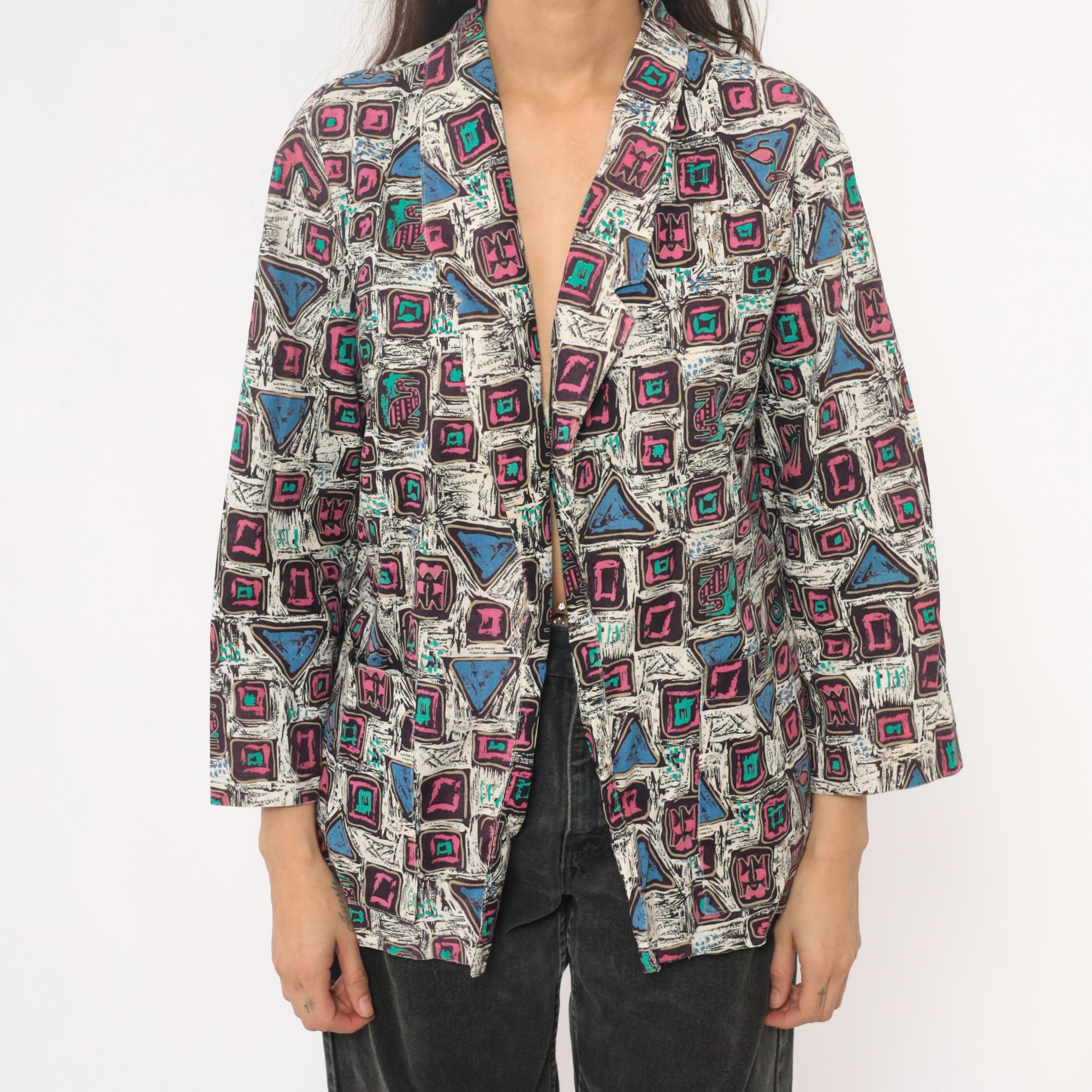 90s abstract geometric print blazer in cotton with pink and magenta squares, turquoise accents, and blue triangles across a white background with black sketch-like lines throughout. Open front with notched collar, long sleeves, boxy hip-length silhouette.