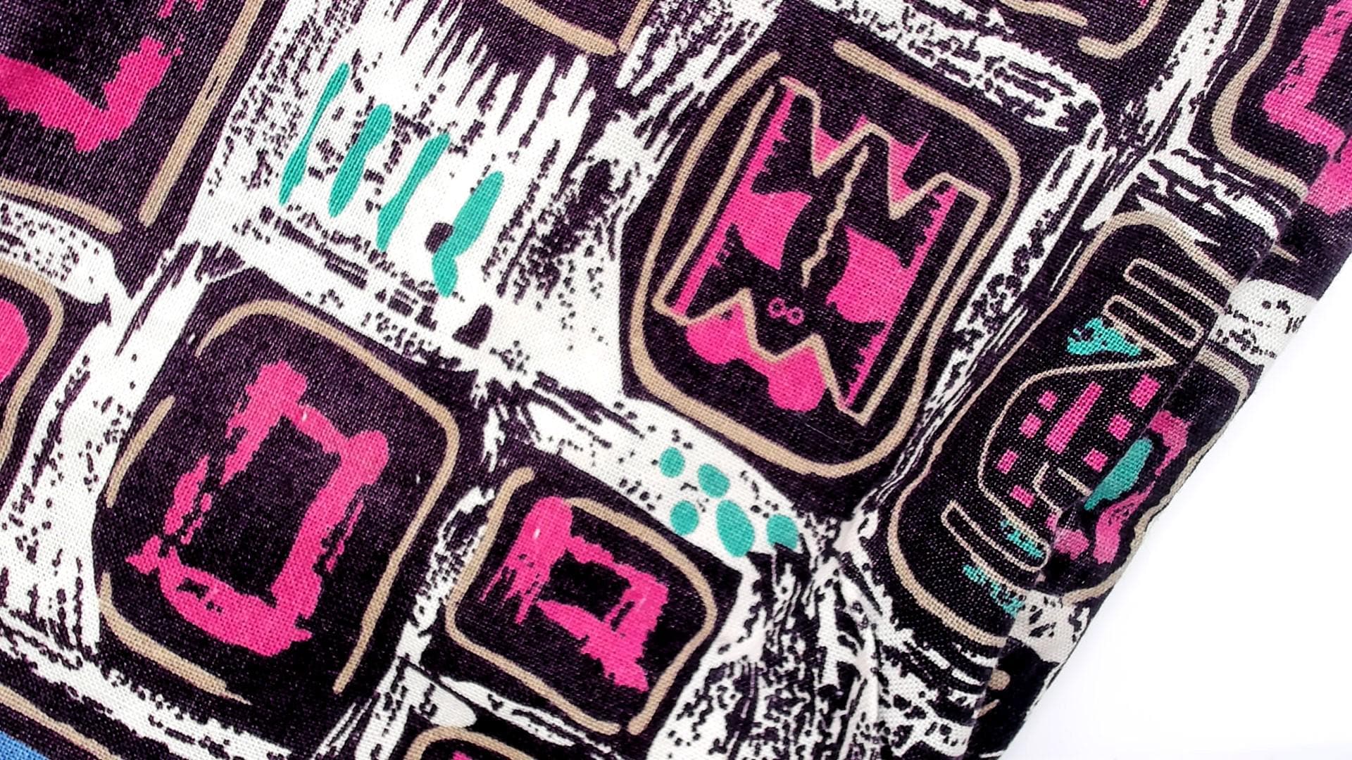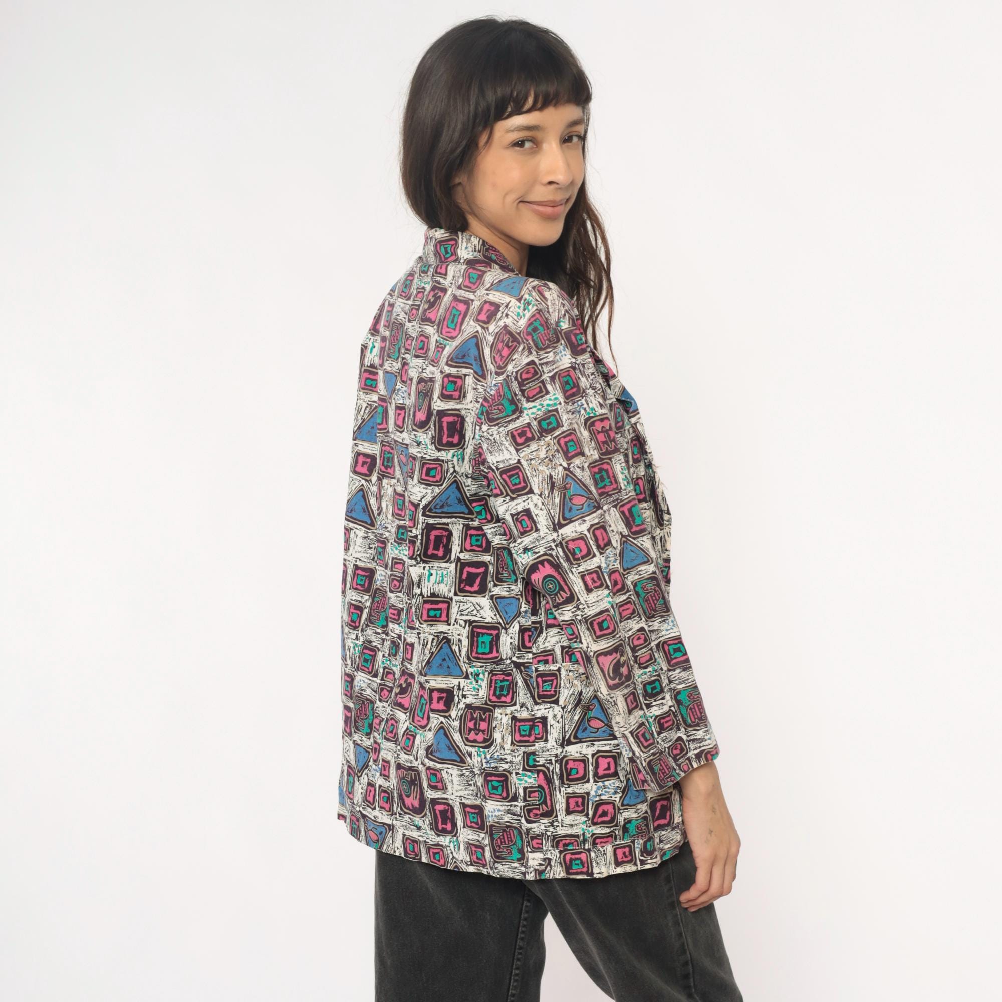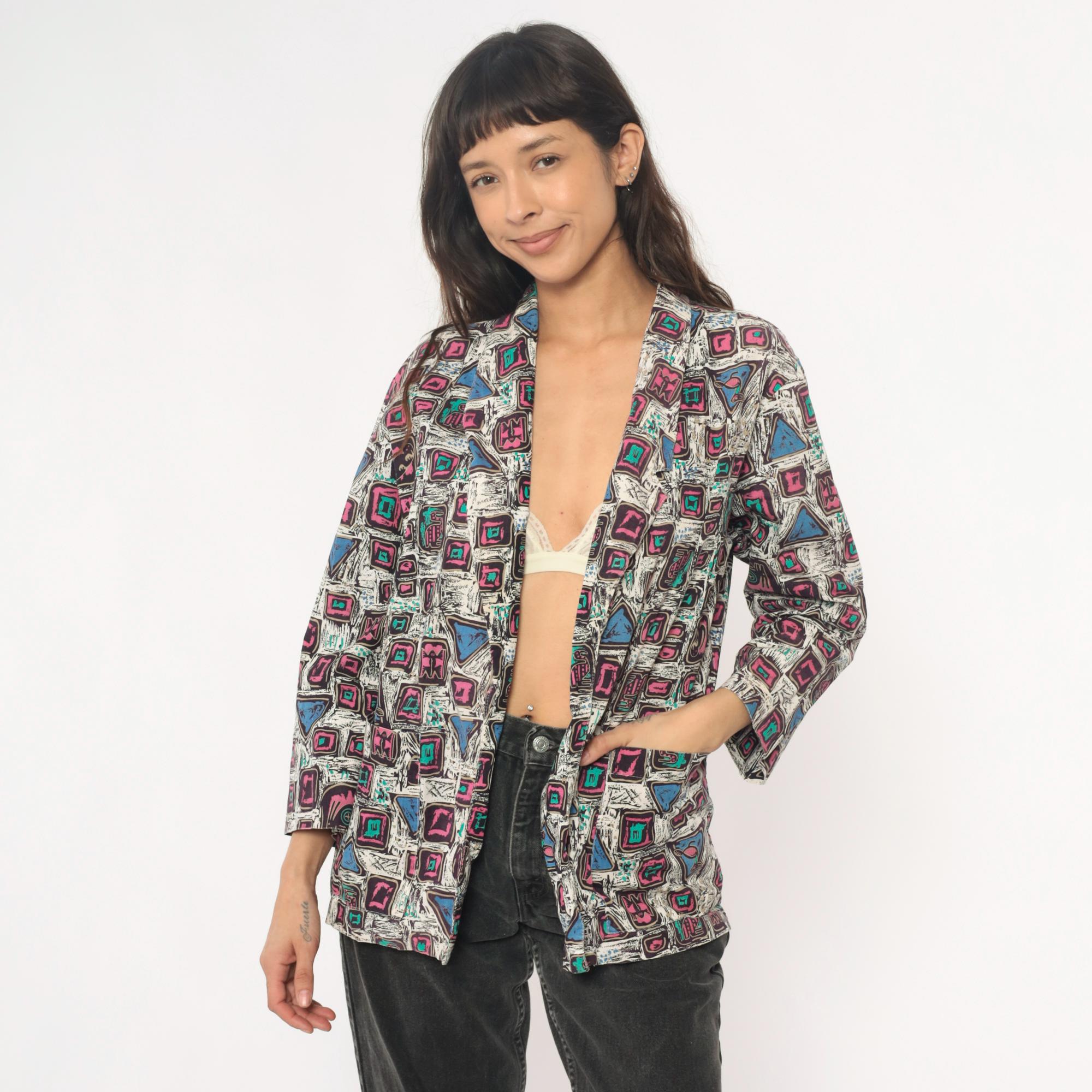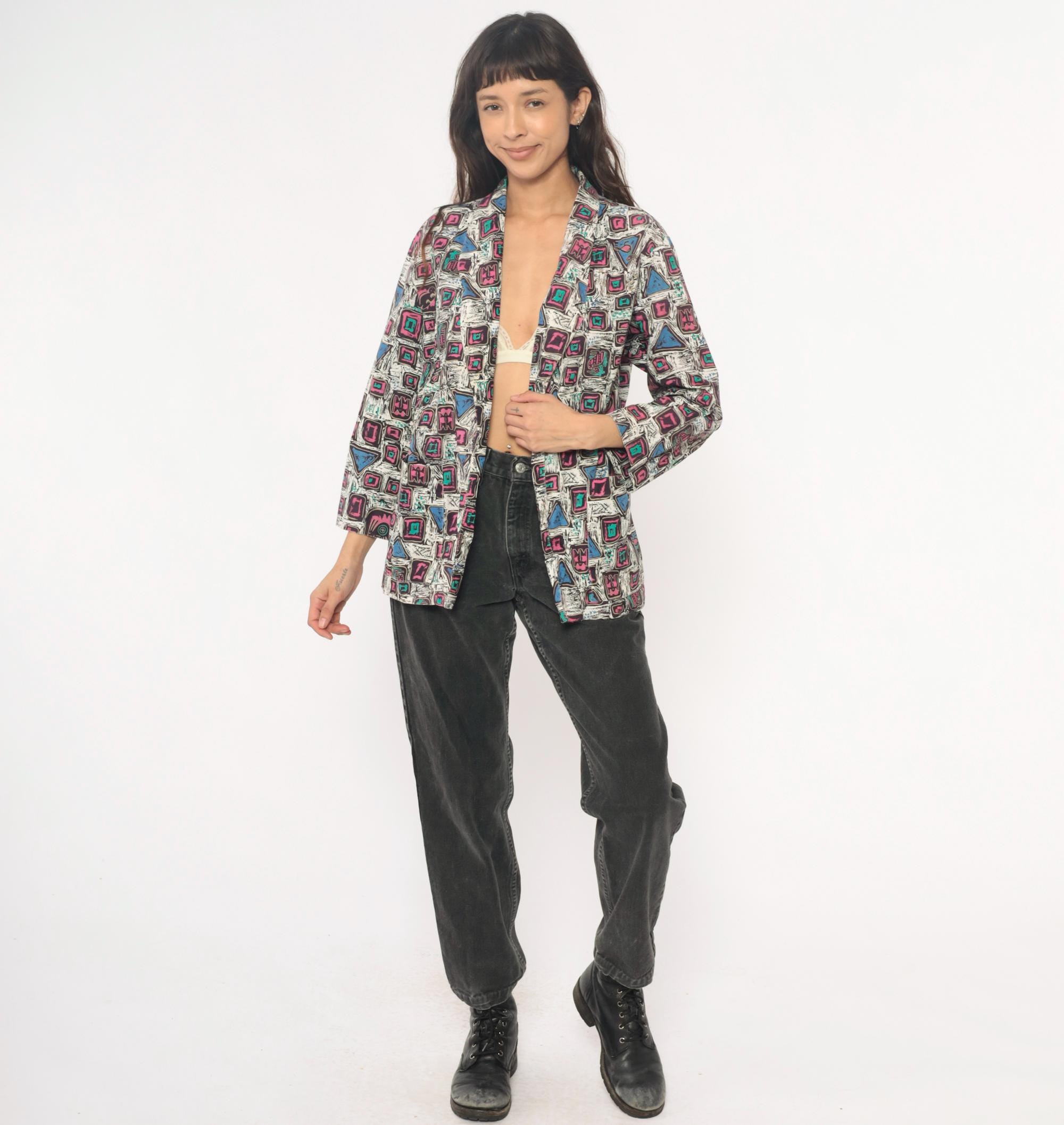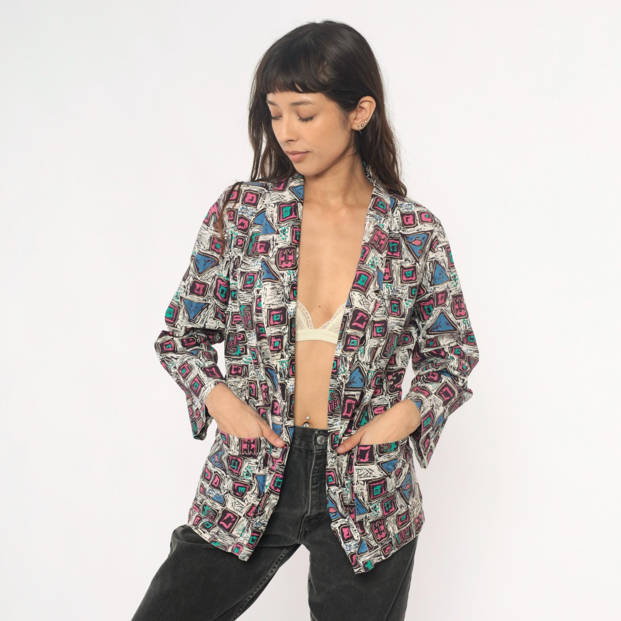 90s abstract geometric print blazer in cotton with pink and magenta squares, turquoise accents, and blue triangles across a white background with black sketch-like lines throughout. Open front with notched collar, long sleeves, boxy hip-length silhouette.