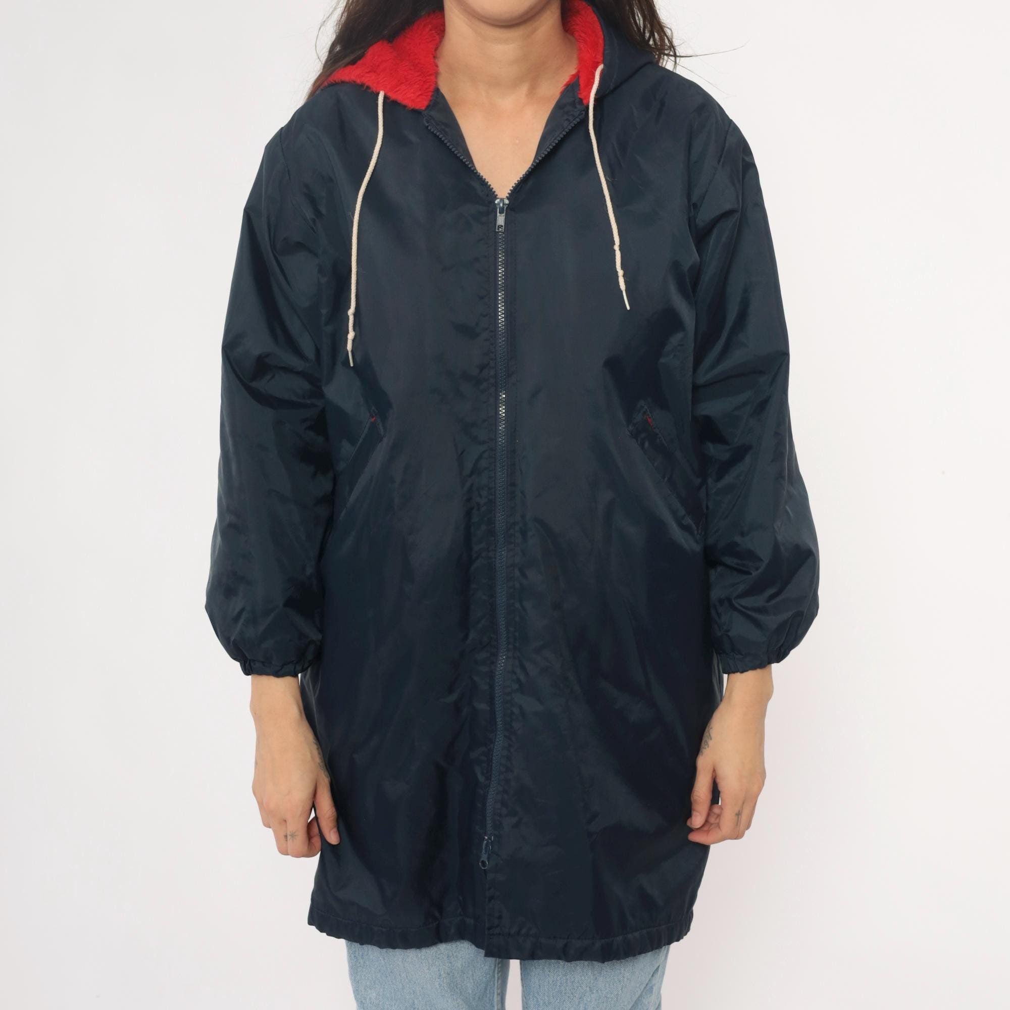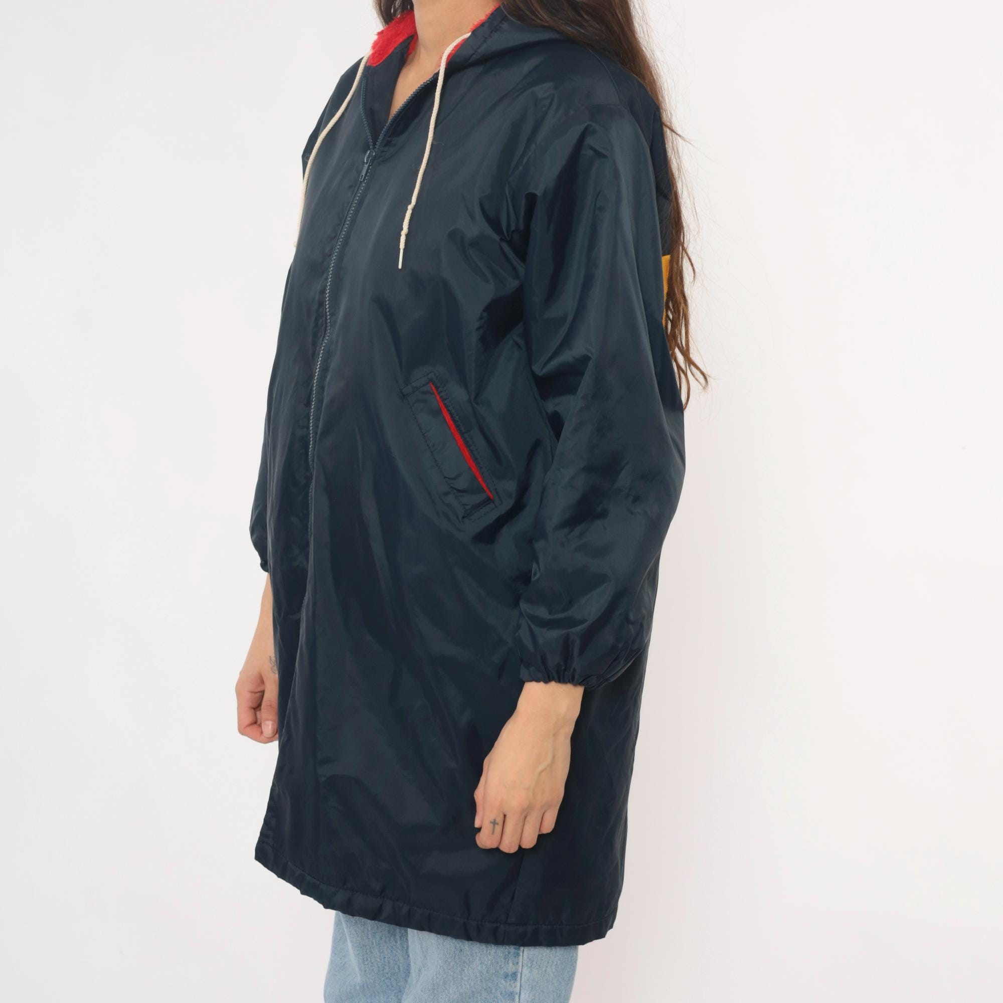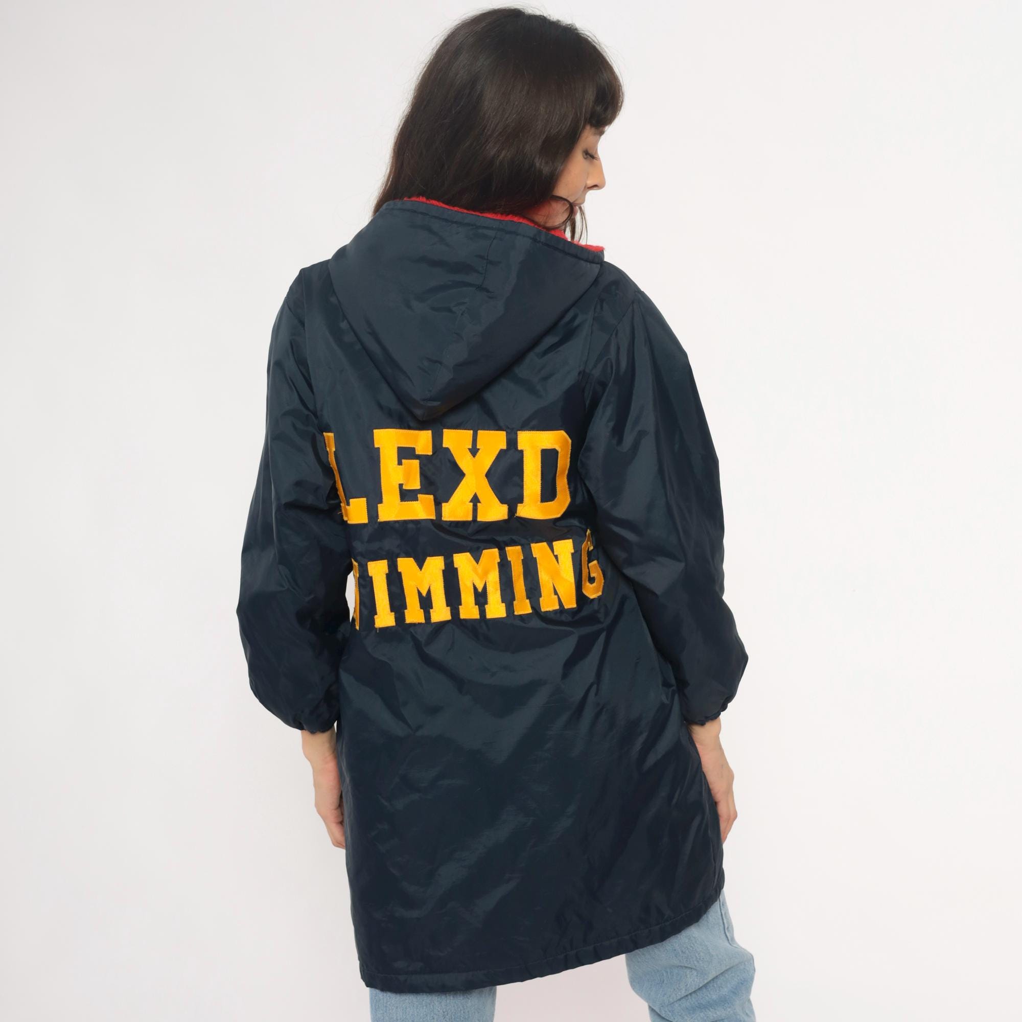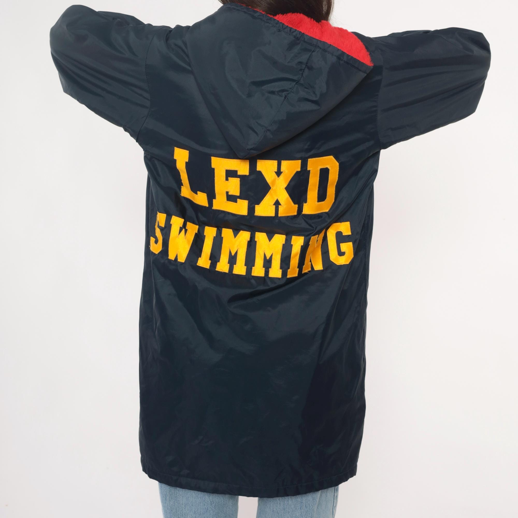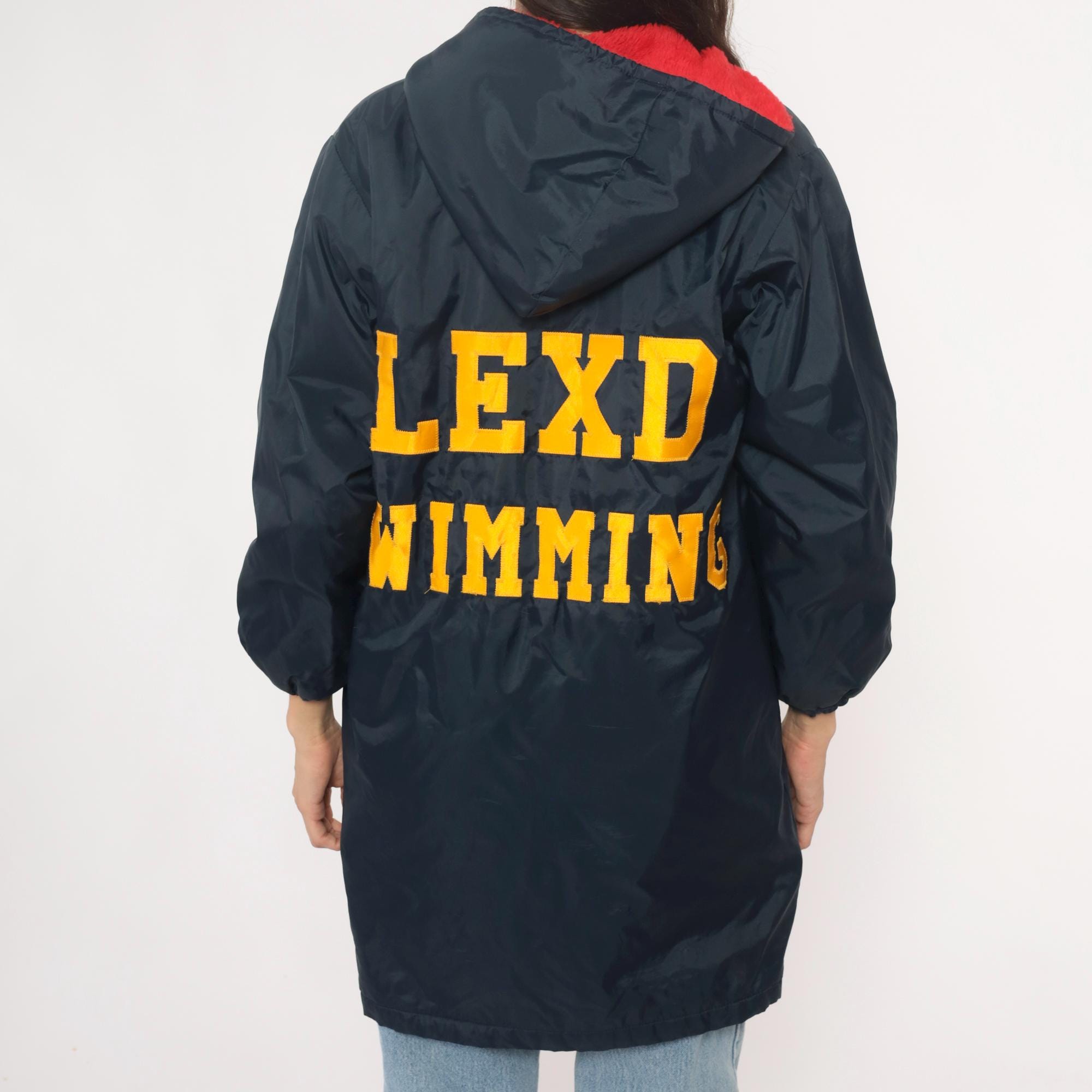 80s navy blue hooded jacket from purcells with large yellow "LEXD SWIMMING" letters across the back. Front zip closure, elastic cuffs at sleeves, adjustable drawstring hood. Red faux fur lining.