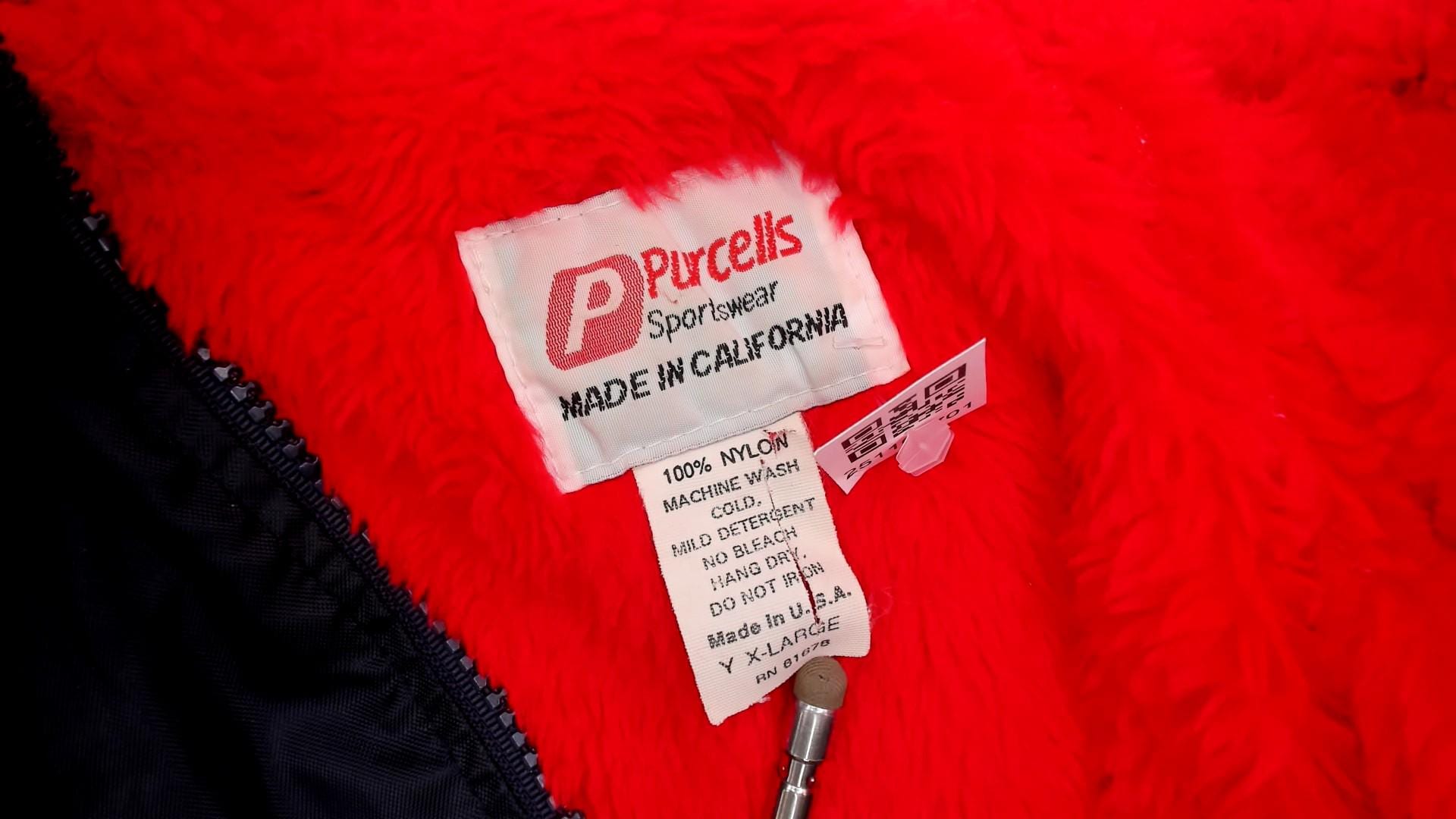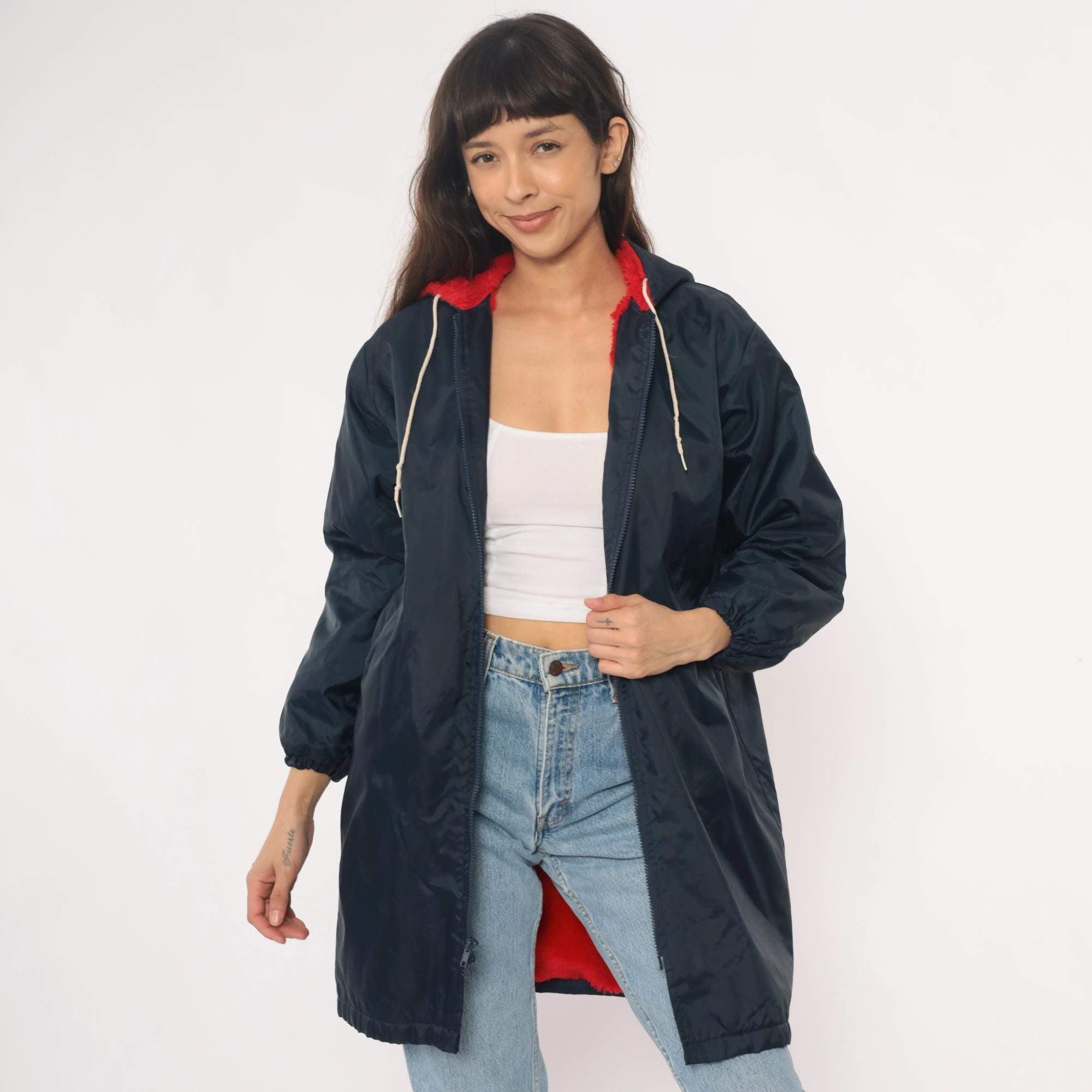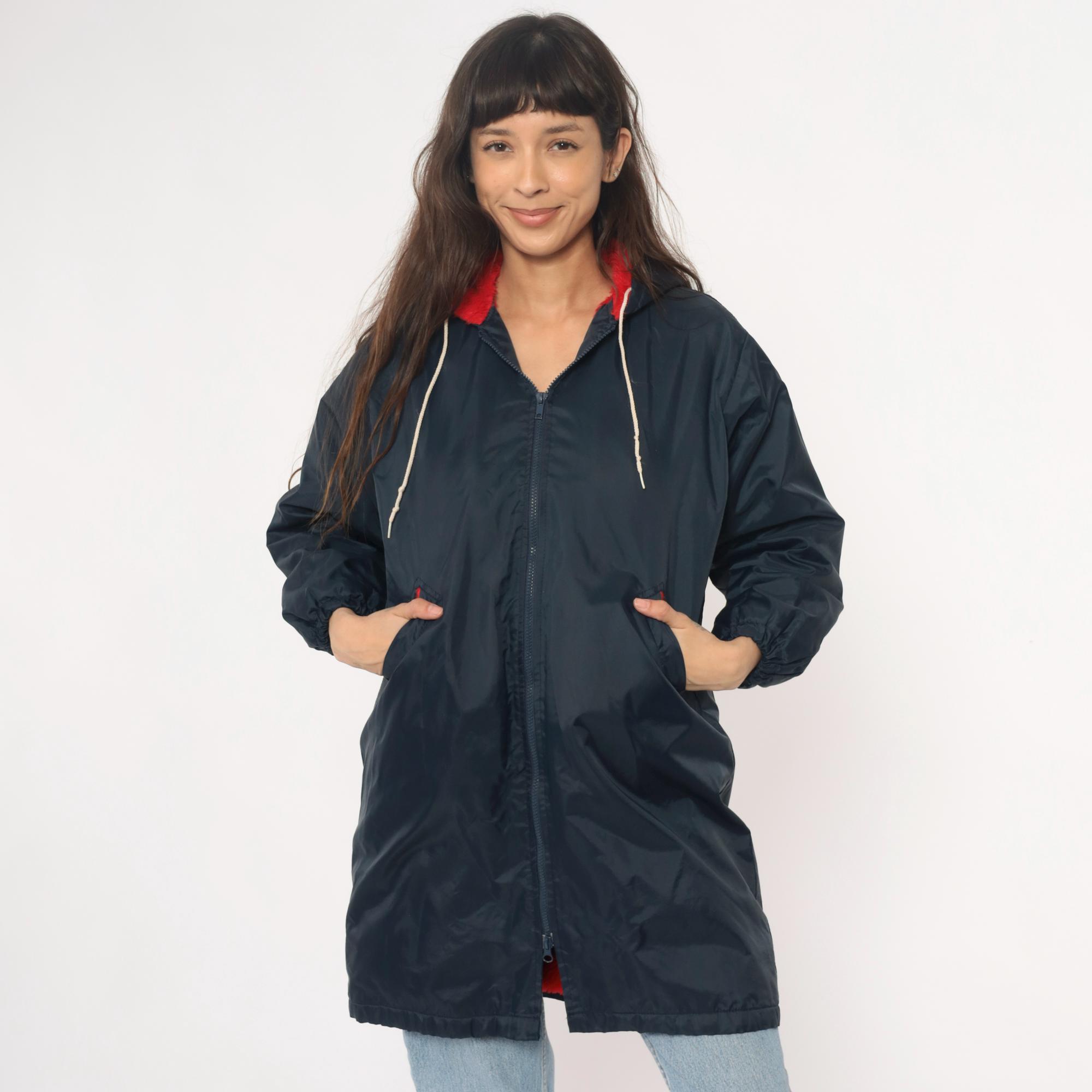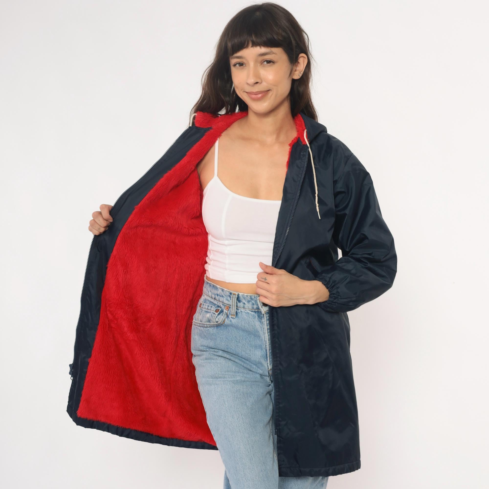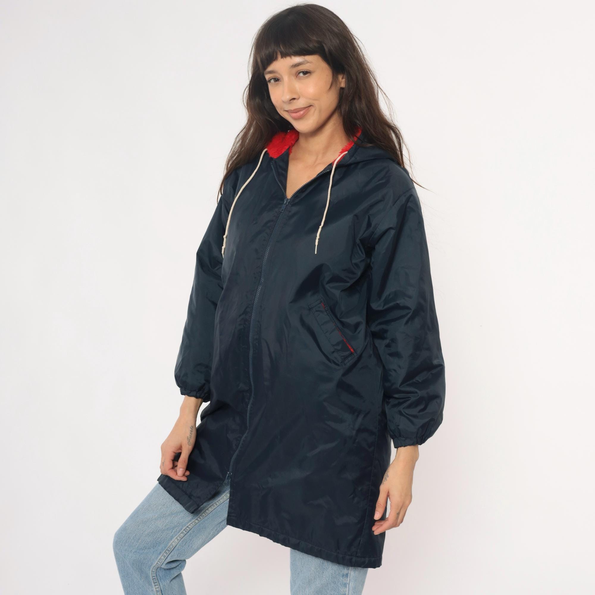 80s navy blue hooded jacket from purcells with large yellow "LEXD SWIMMING" letters across the back. Front zip closure, elastic cuffs at sleeves, adjustable drawstring hood. Red faux fur lining.