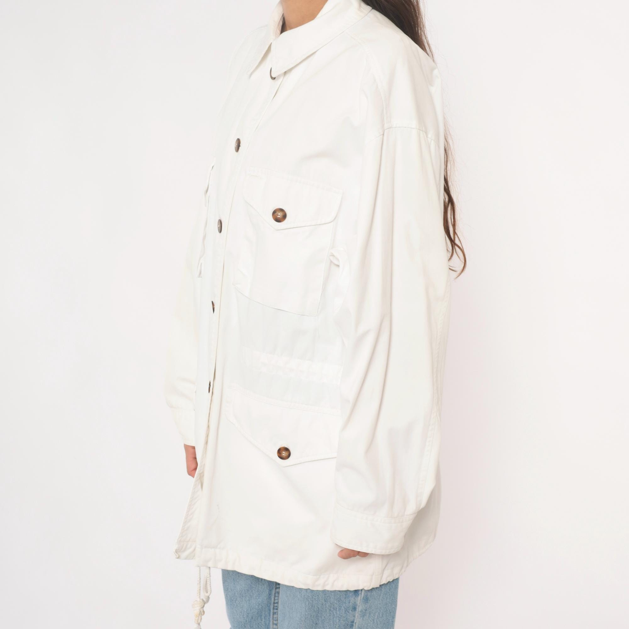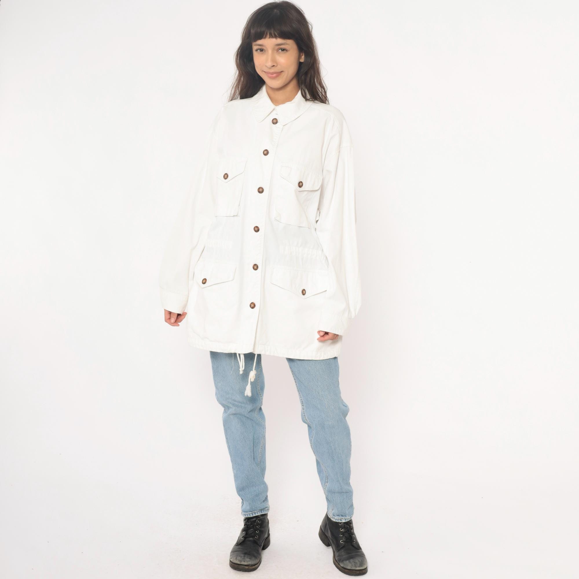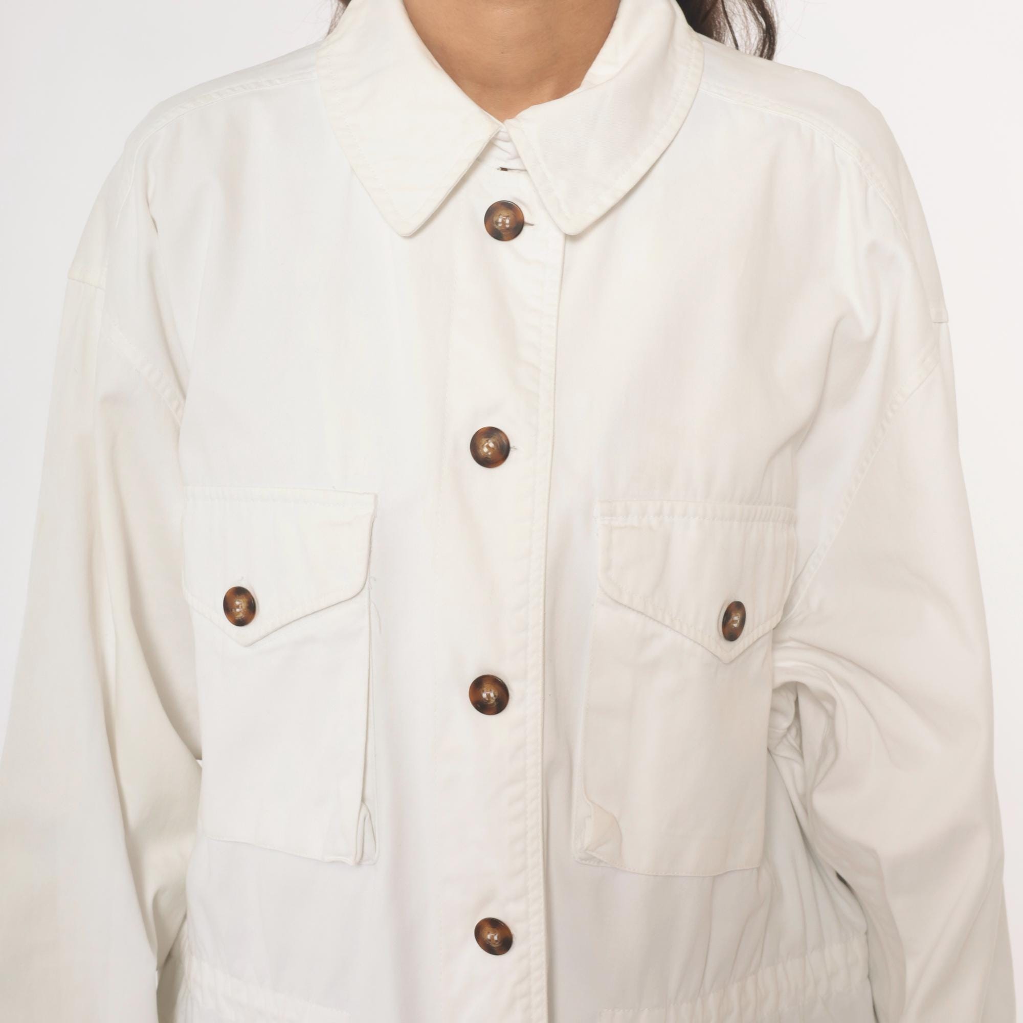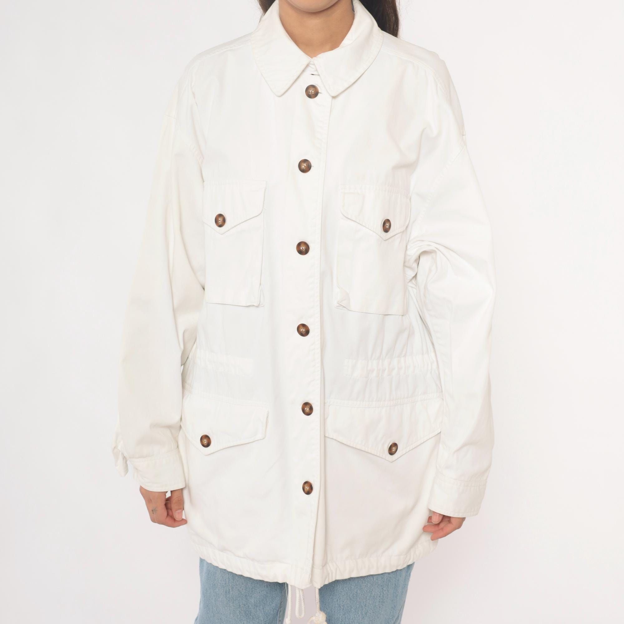 90s cream cotton jacket from adrienne vittadini with button front closure and pointed collar. Four chest pockets with button flaps, two lower patch pockets, long sleeves with button cuffs.
