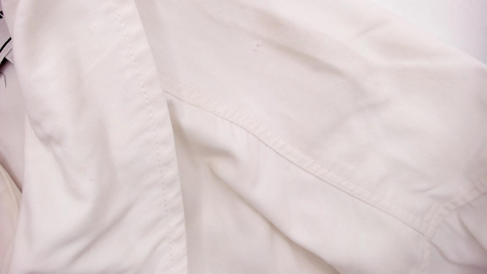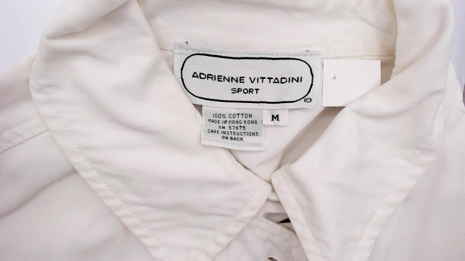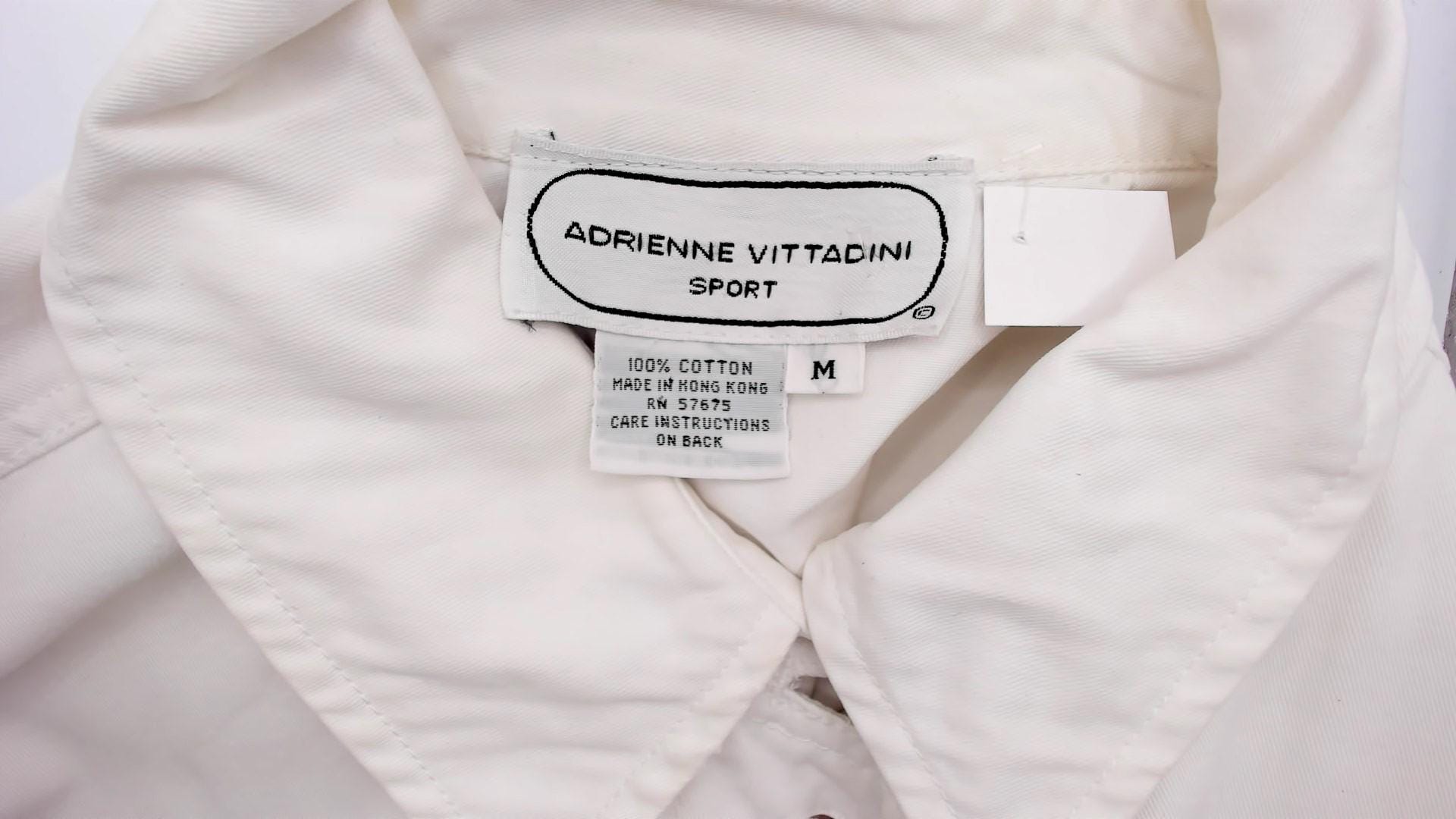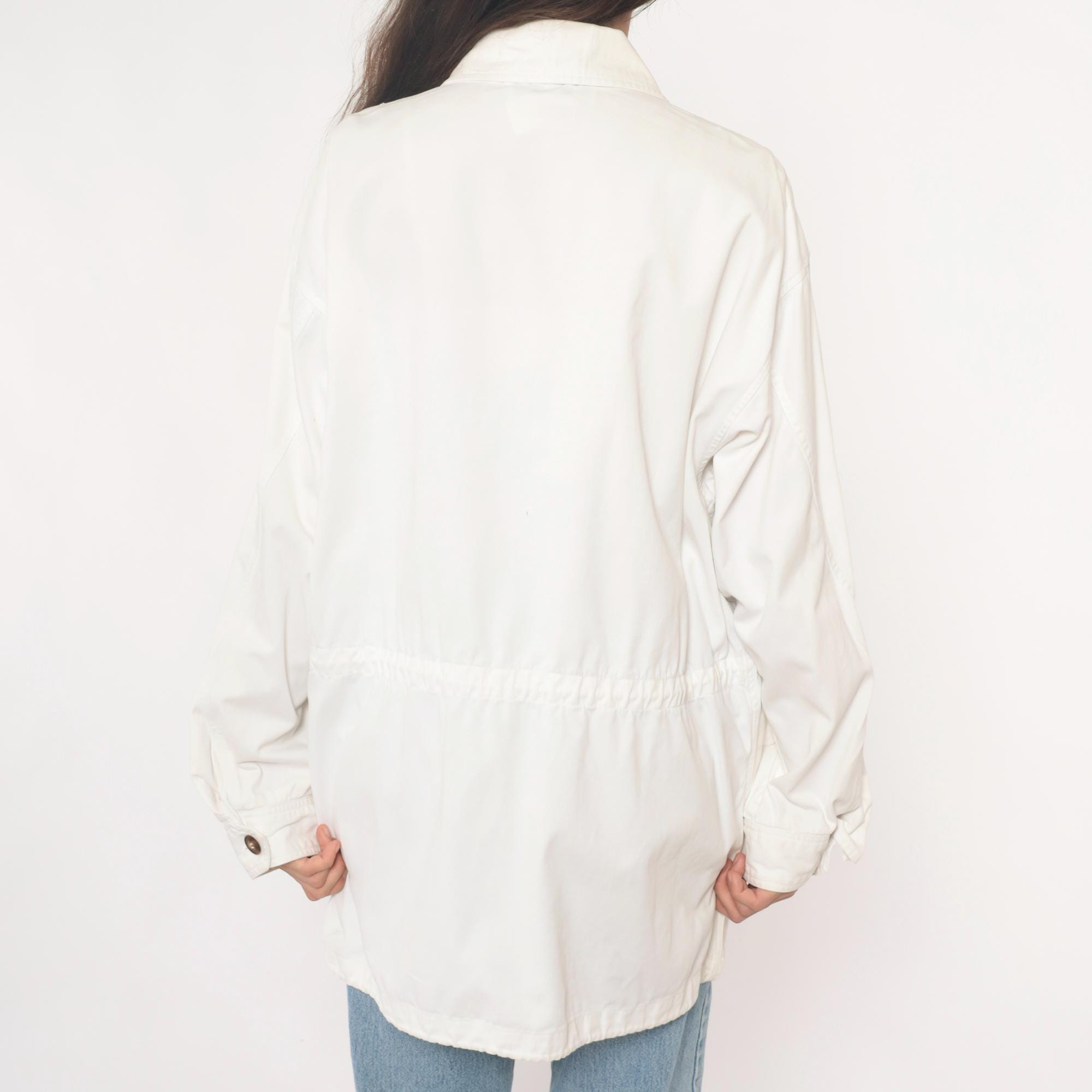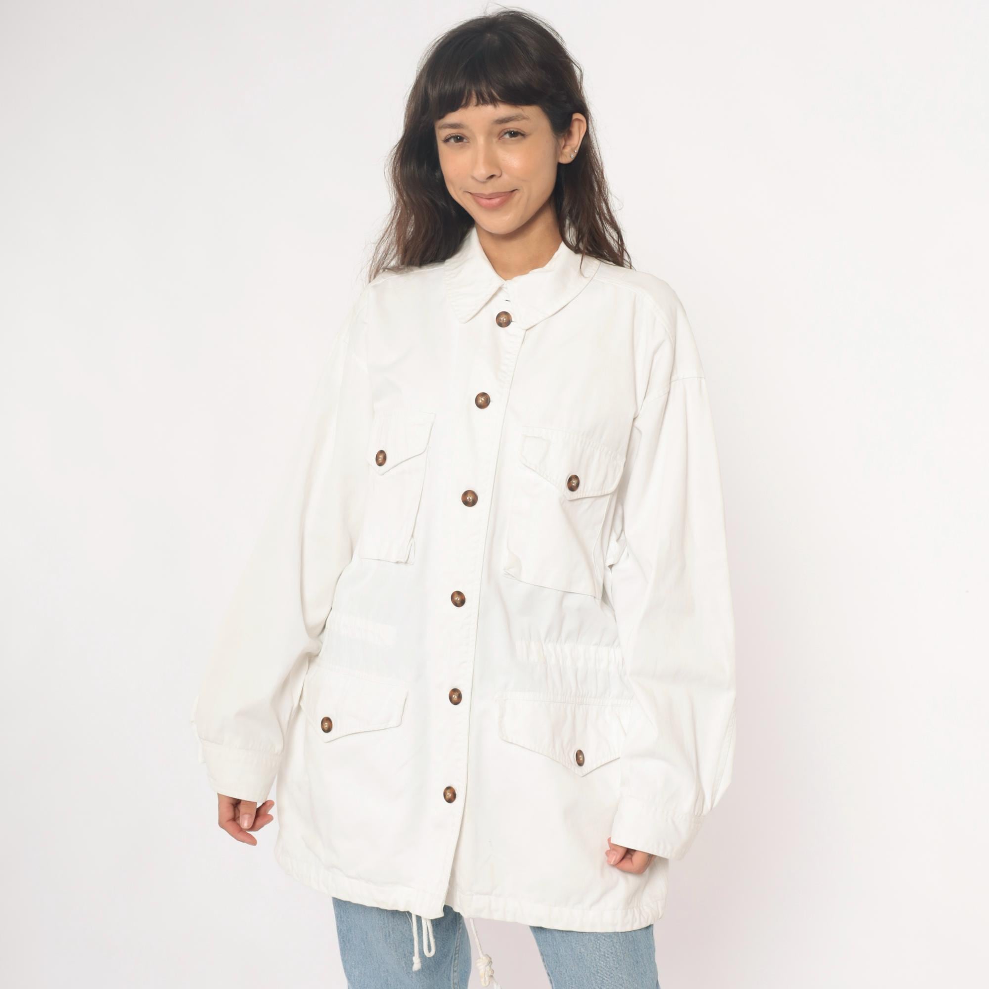90s cream cotton jacket from adrienne vittadini with button front closure and pointed collar. Four chest pockets with button flaps, two lower patch pockets, long sleeves with button cuffs.