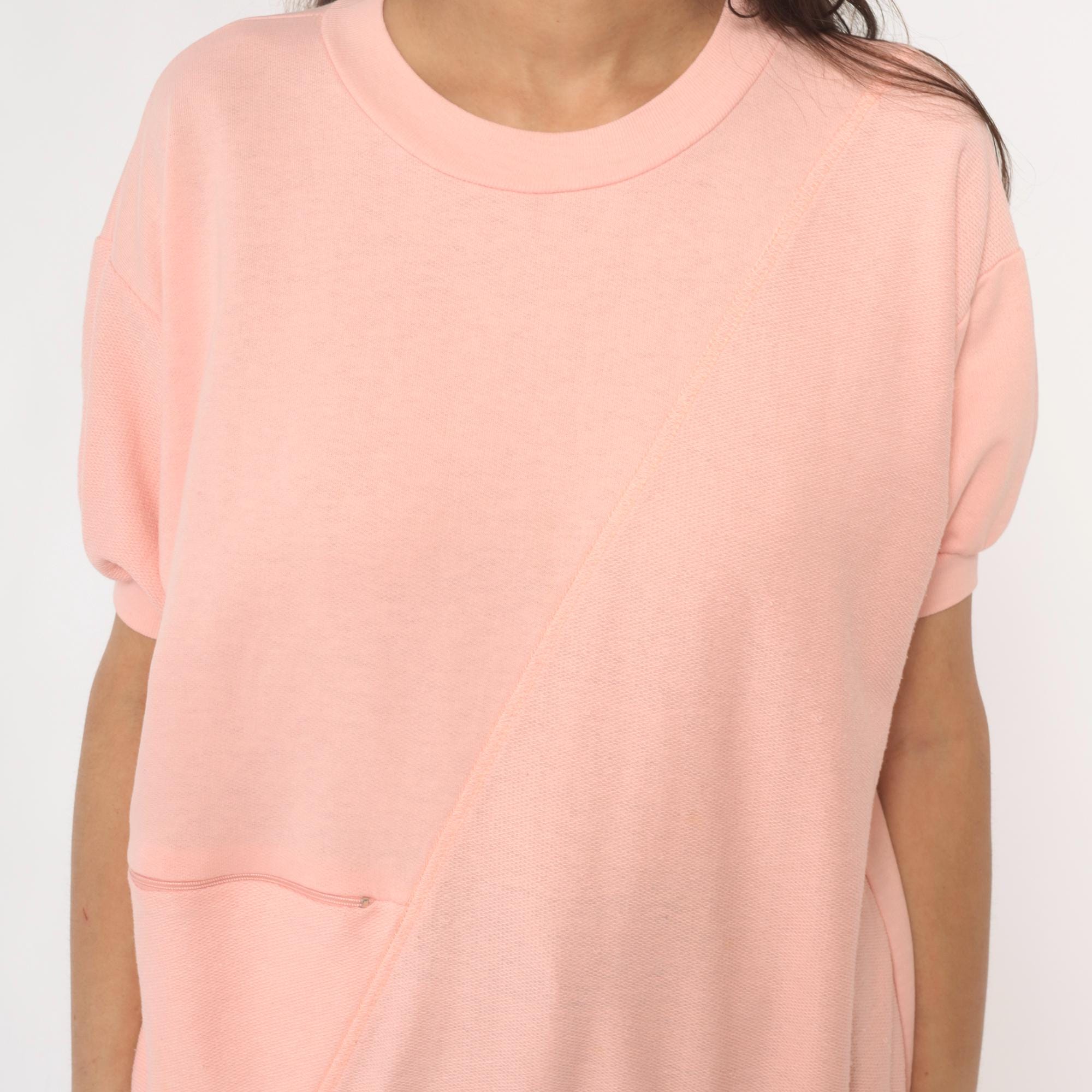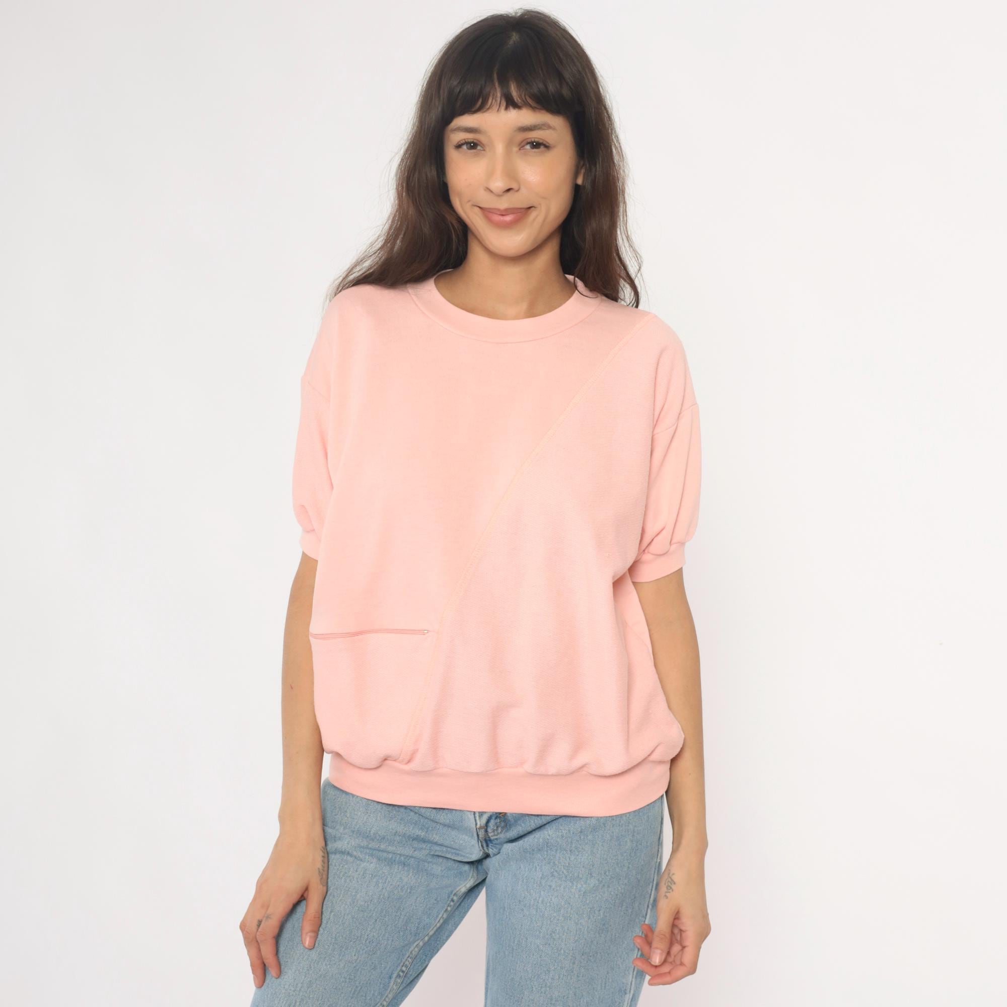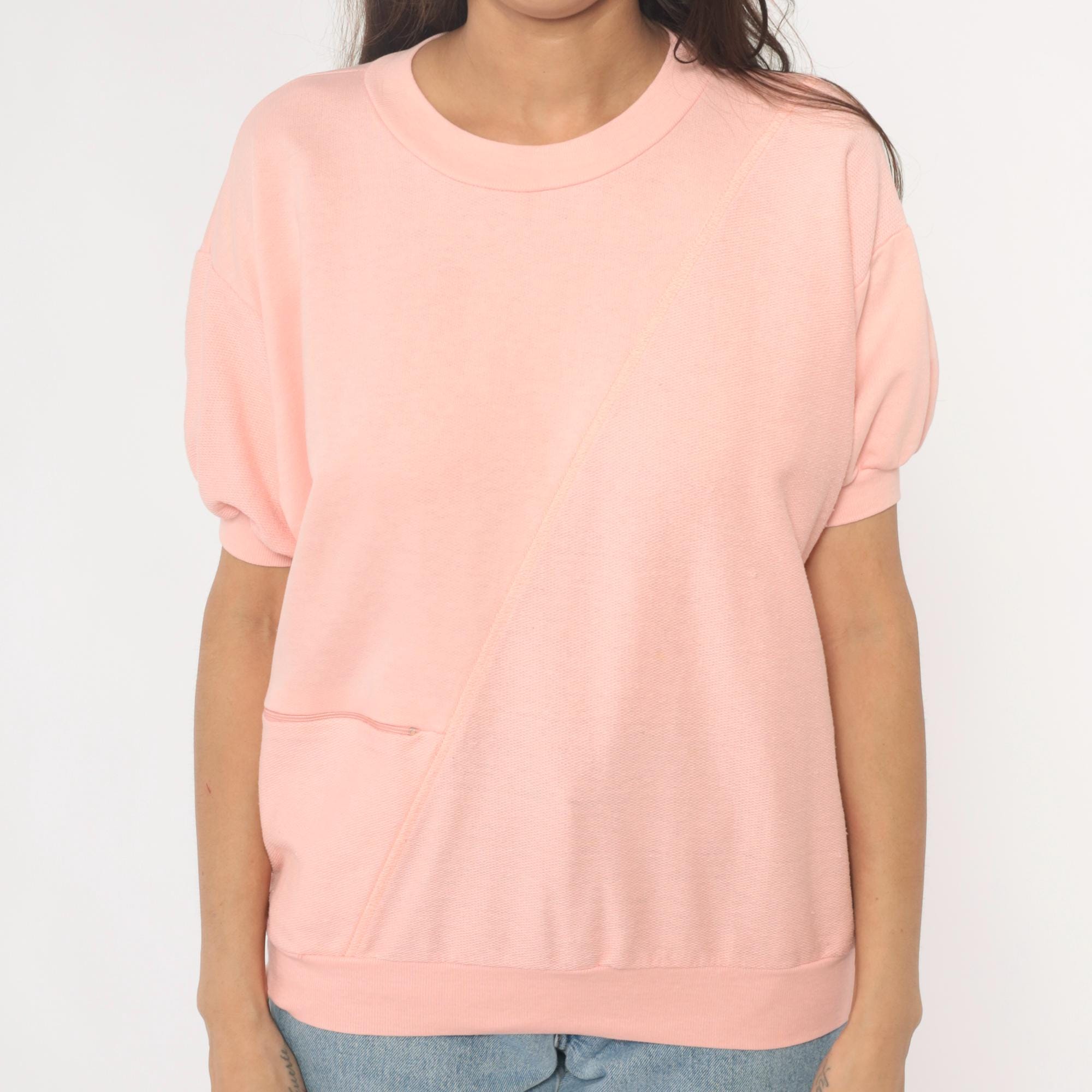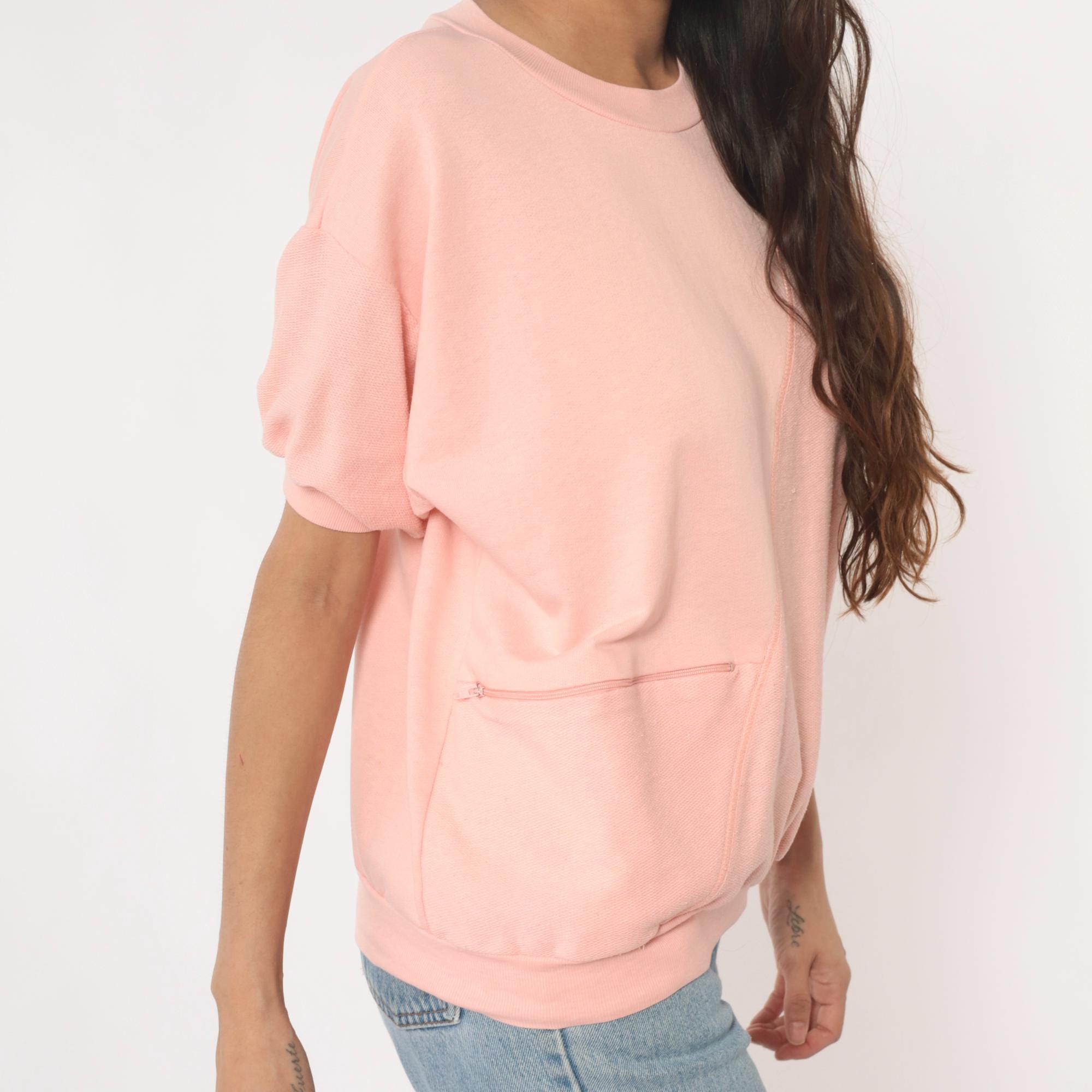 80s pale pink short sleeve sweatshirt with crew neckline and ribbed trim at collar, cuffs, and hem. Single front pocket, relaxed fit.
