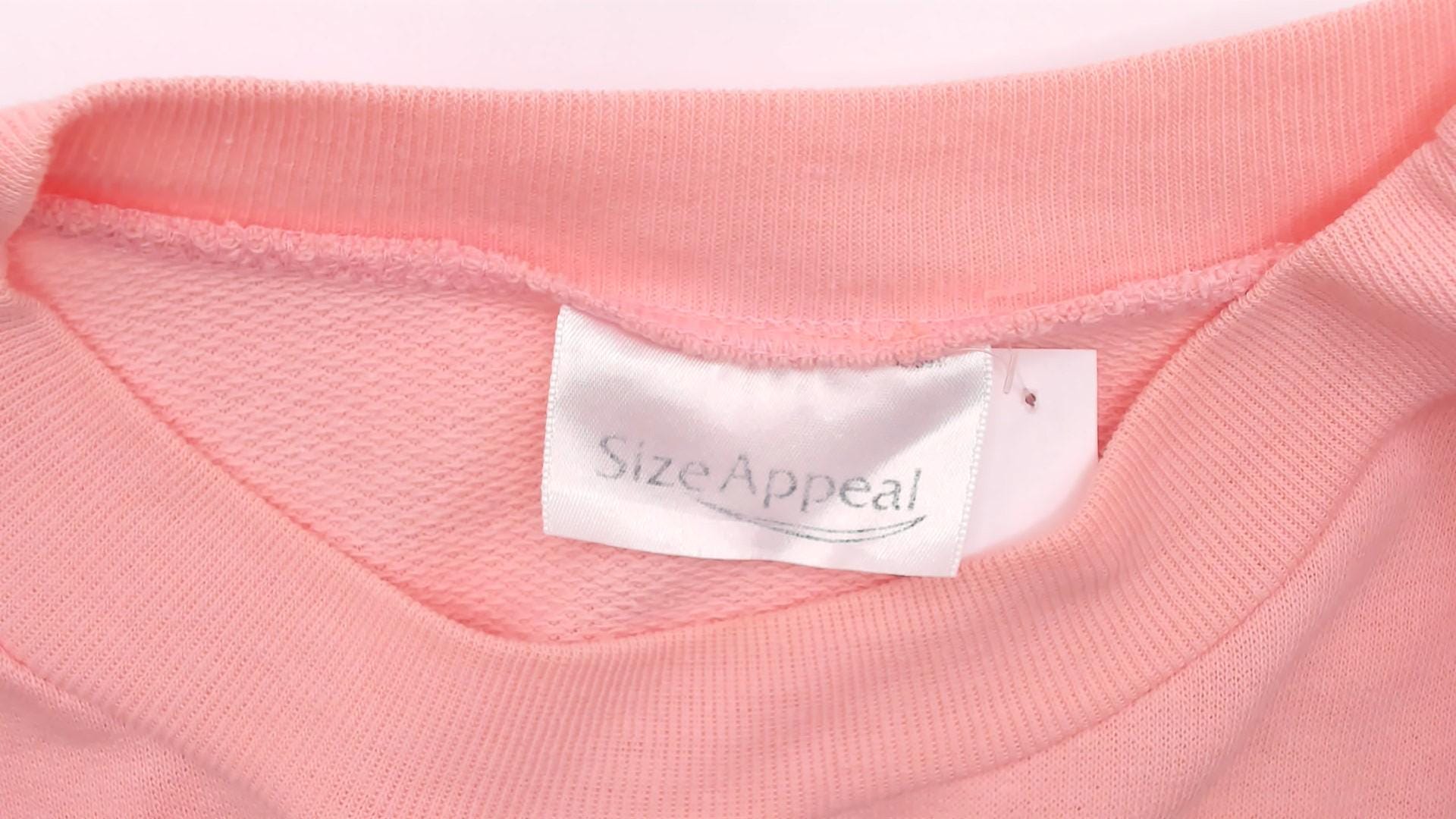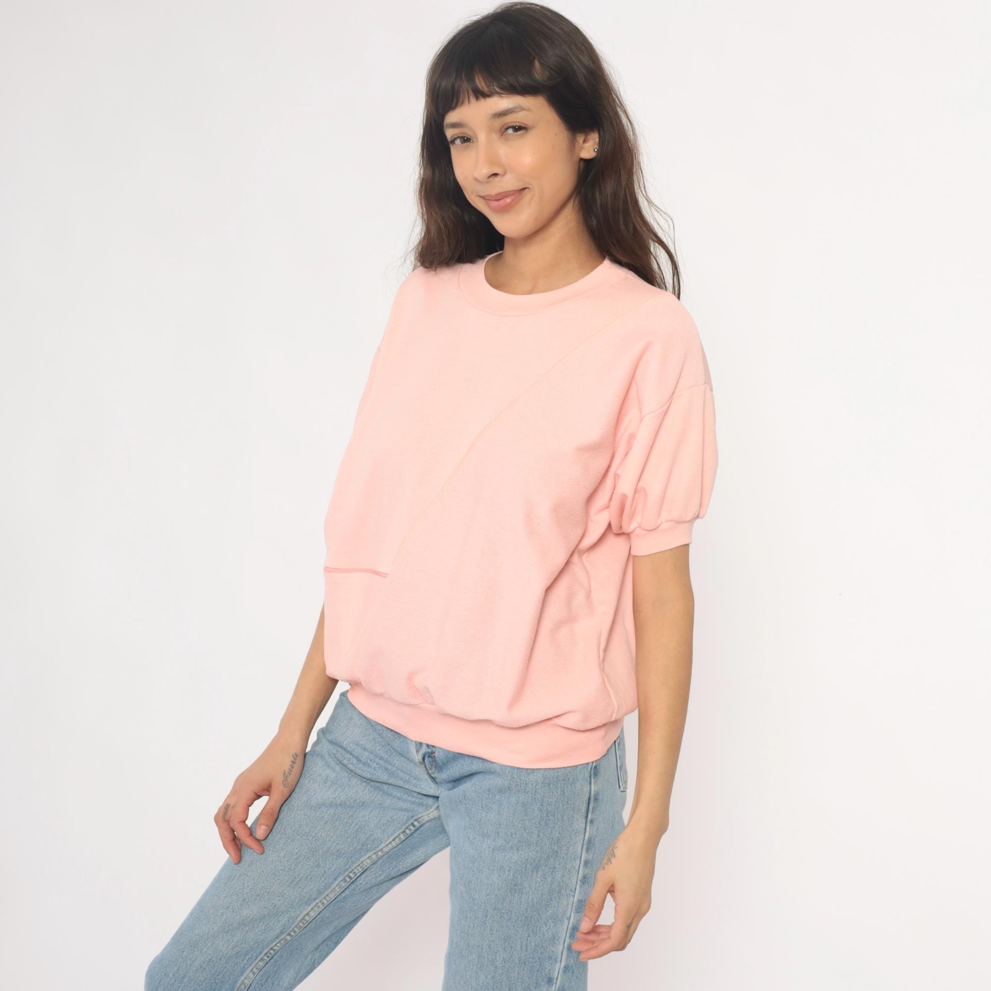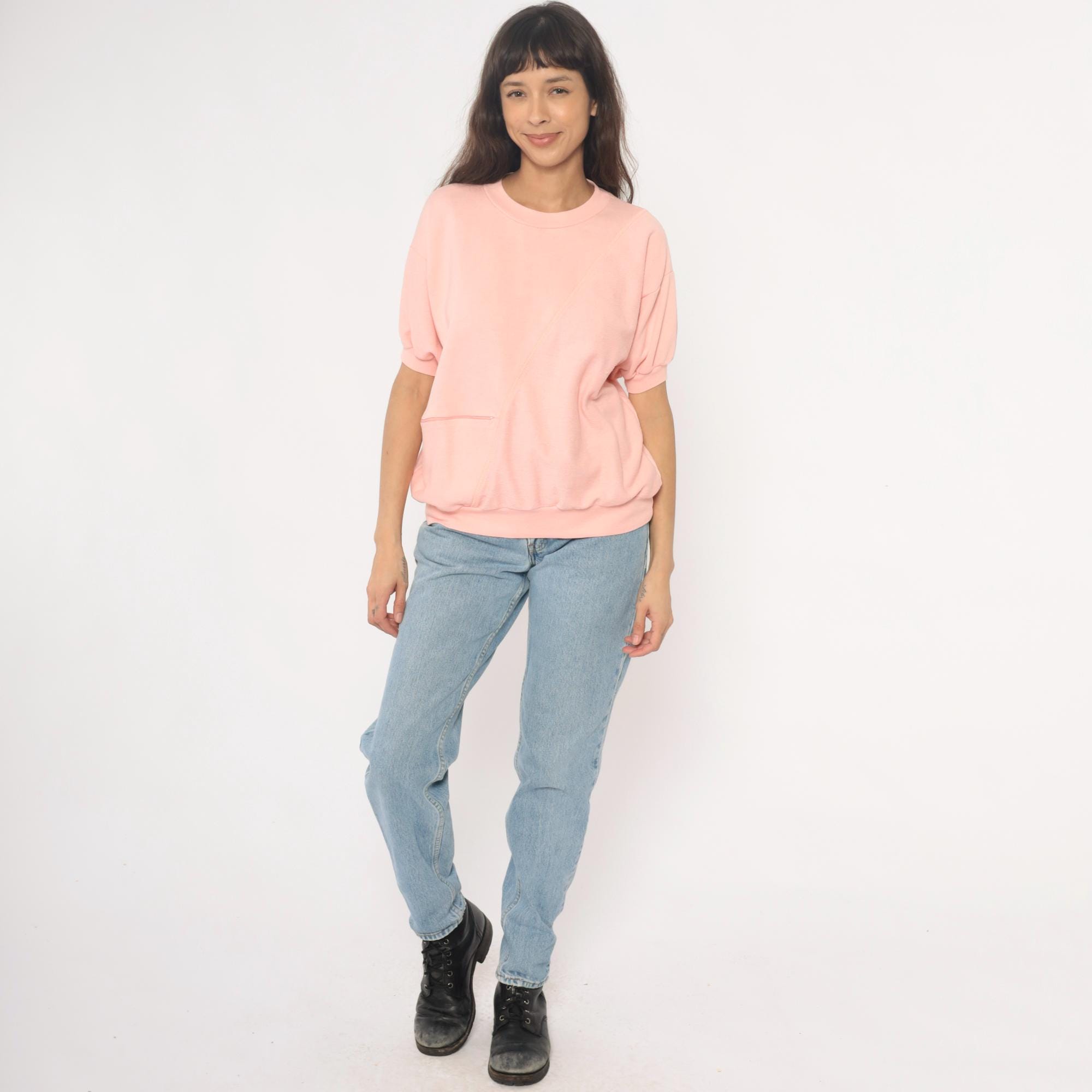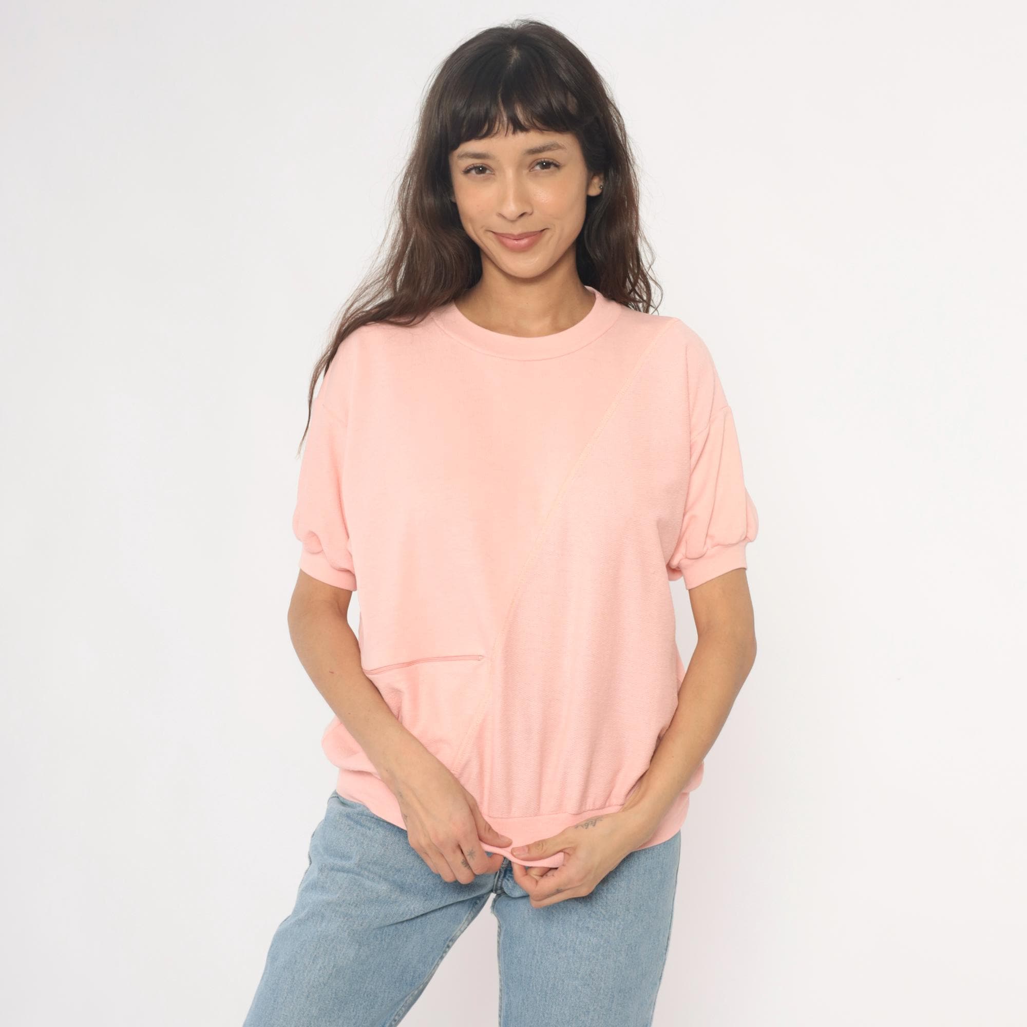 80s pale pink short sleeve sweatshirt with crew neckline and ribbed trim at collar, cuffs, and hem. Single front pocket, relaxed fit.