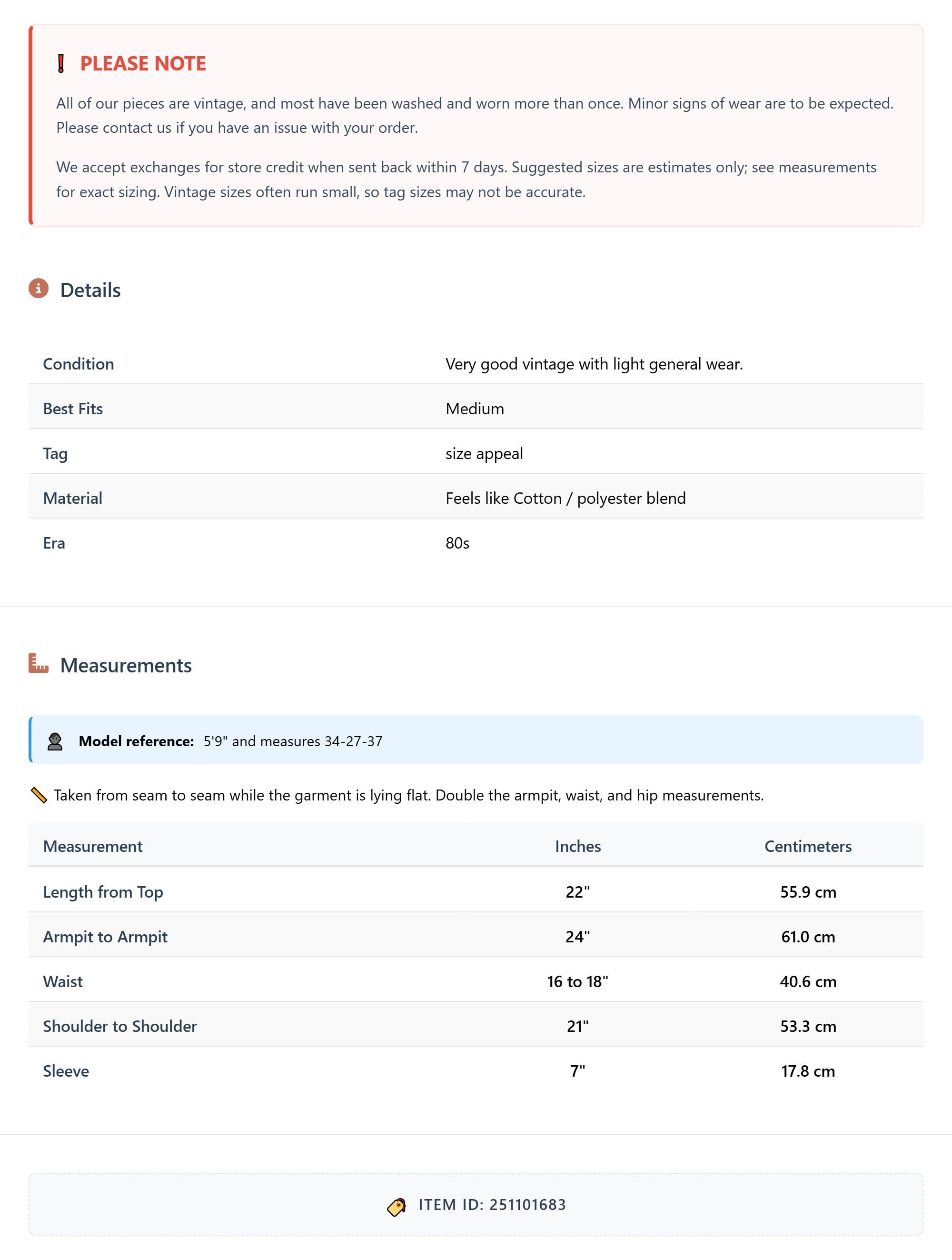 Measurements are taken laying flat and should be doubled where applicable. The "best fits" size is just an estimate, and vintage sizing can vary from modern sizing. Please use measurements to ensure proper fit. The best thing to do is measure a similar item of your own, and compare. When an item has stretch, we will list the unstretched dimensions with the stretched measurement afterwards.