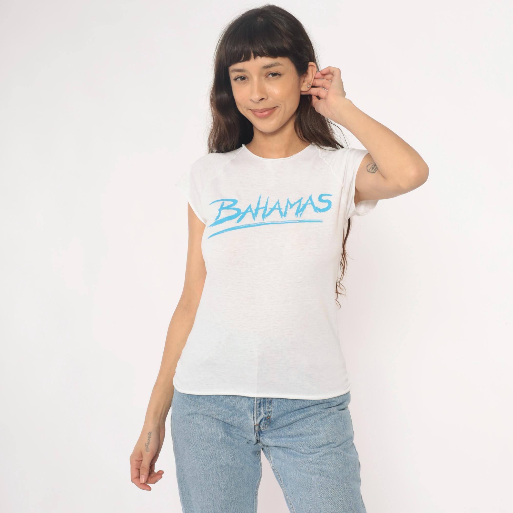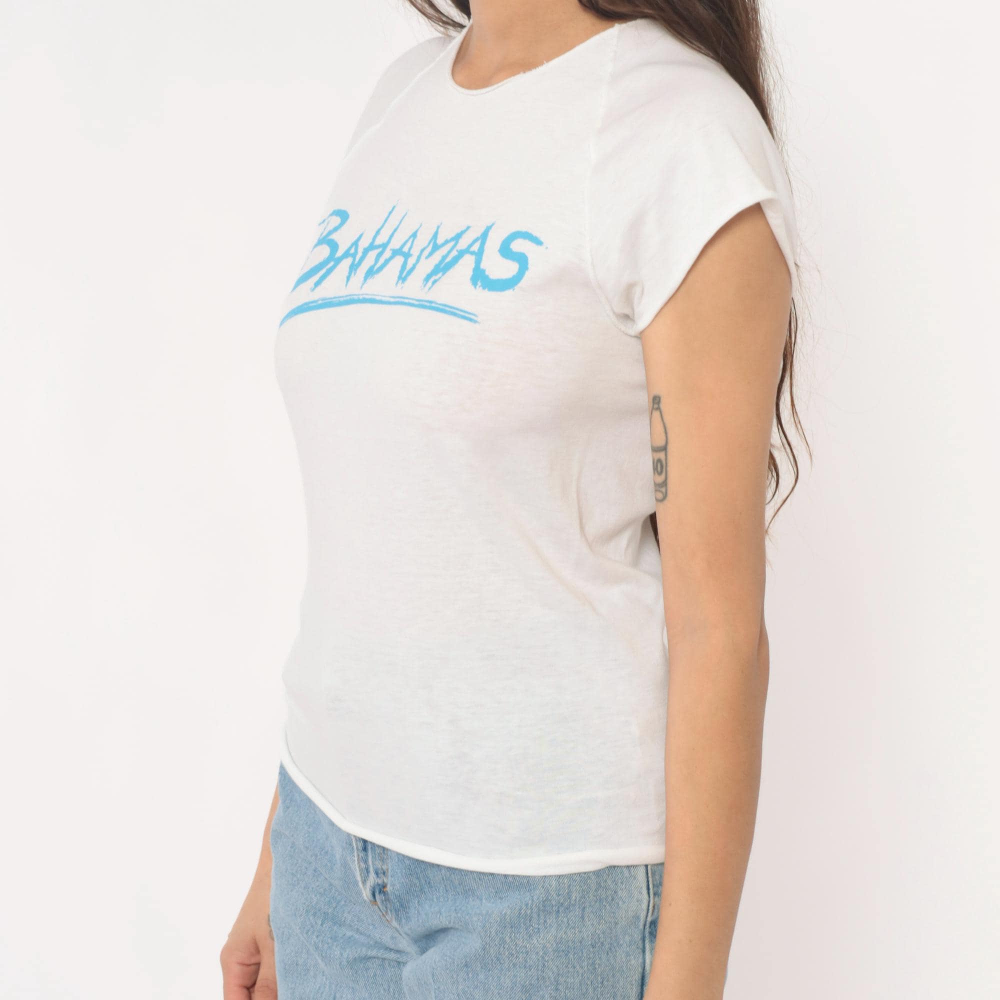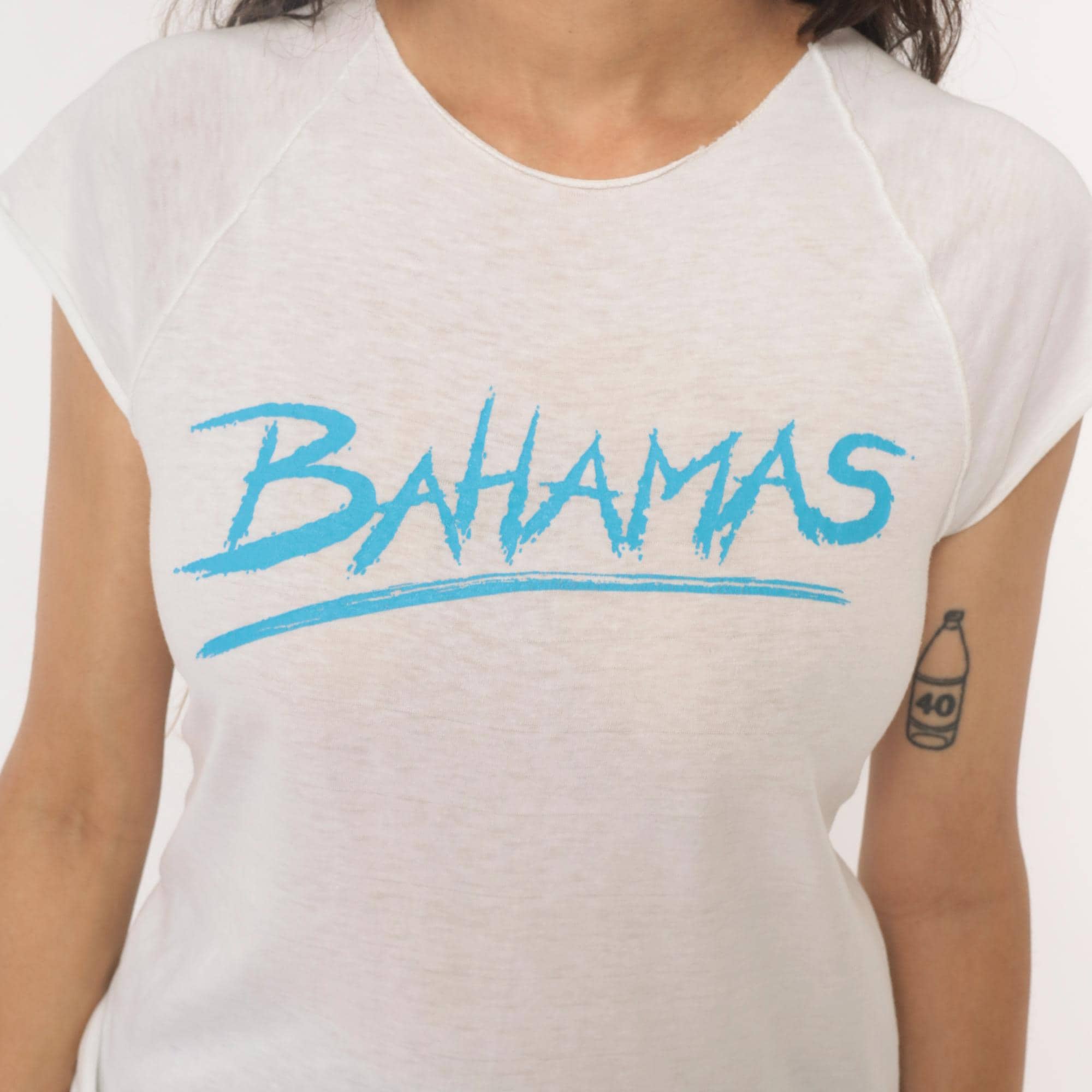 80s white t-shirt with light blue "BAHAMAS" graphic in brushstroke-style lettering with swoosh underline accent across the chest. Crew neckline and short cap sleeves.