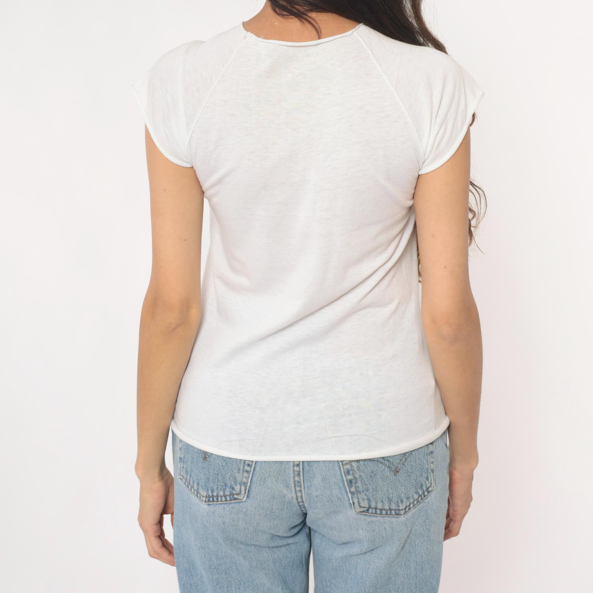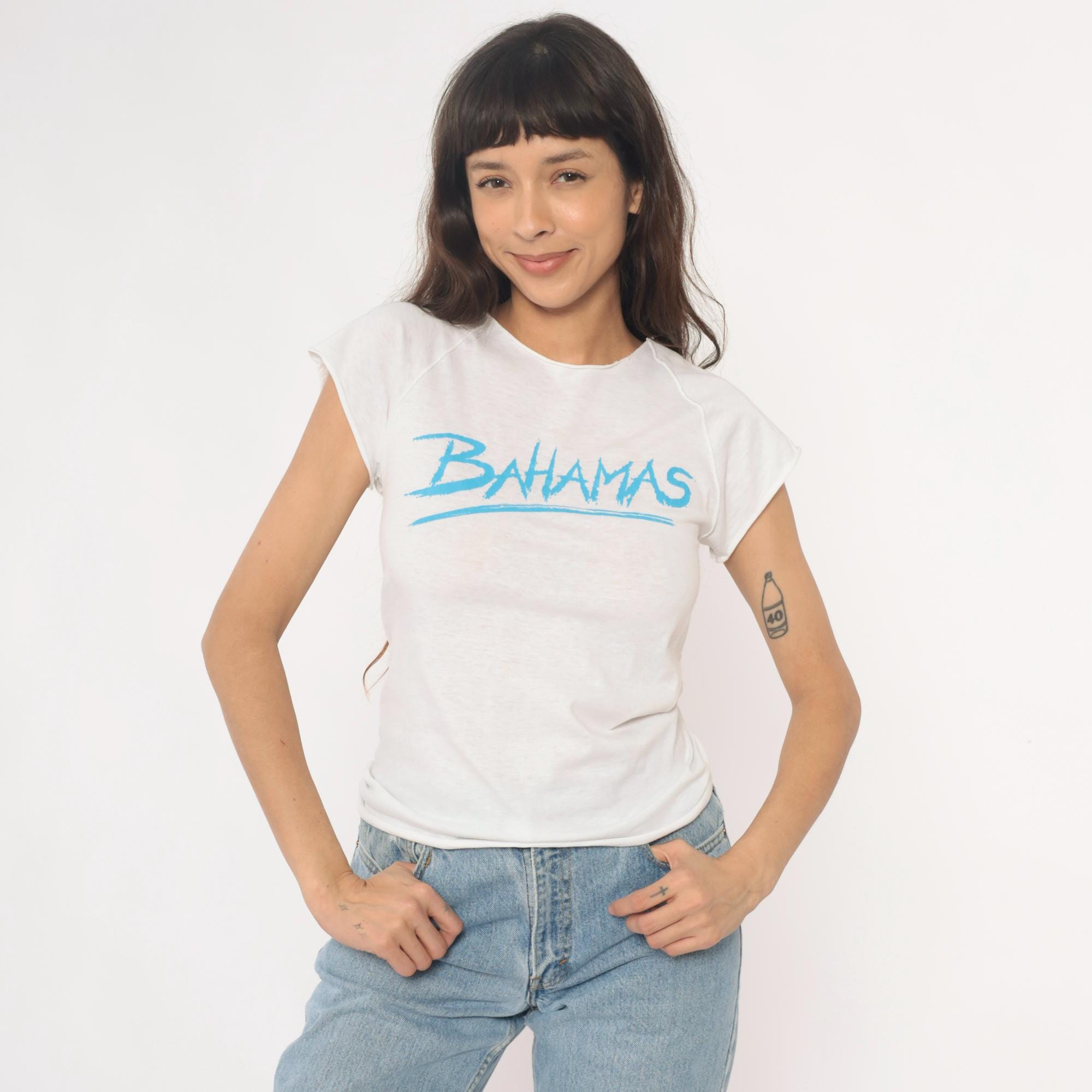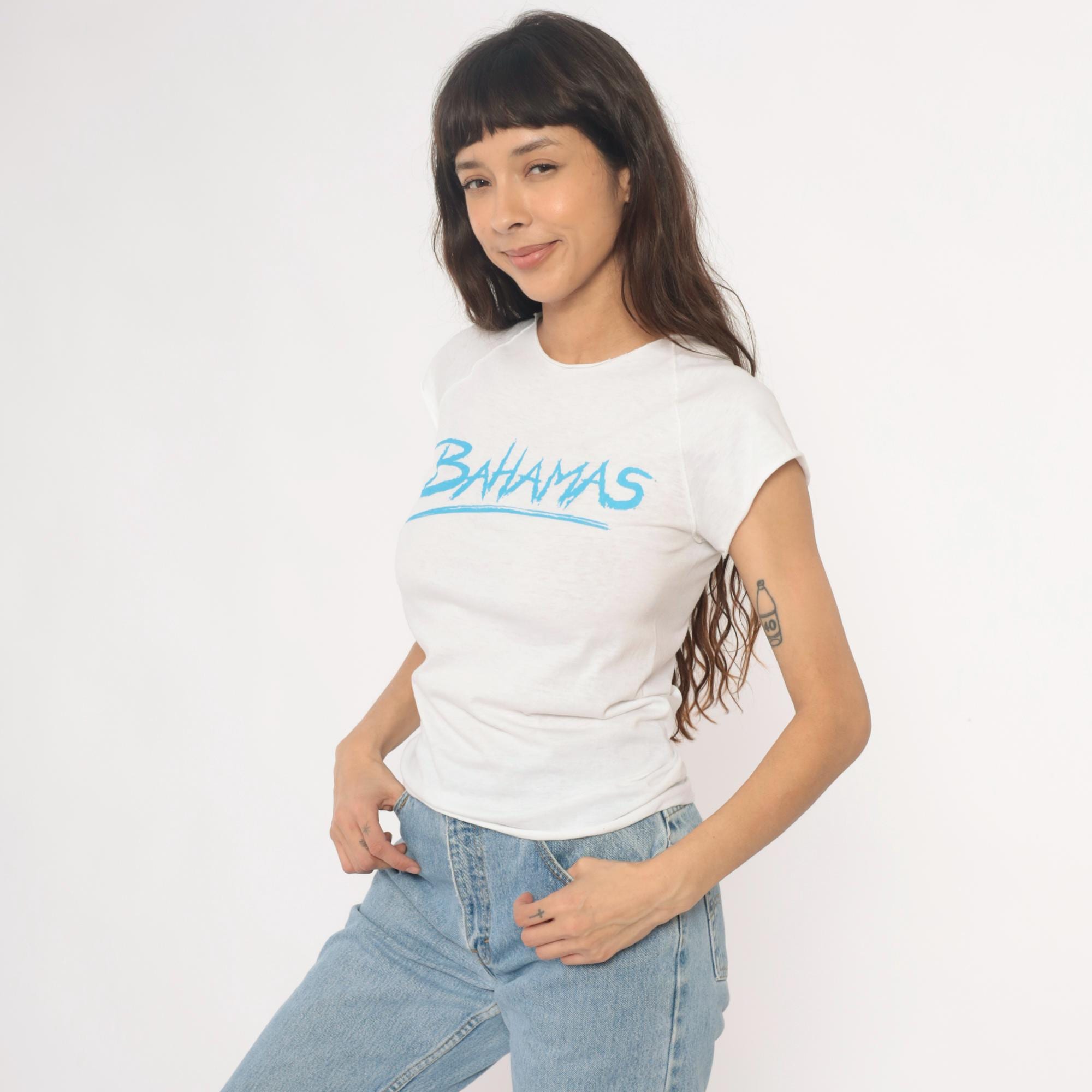 80s white t-shirt with light blue "BAHAMAS" graphic in brushstroke-style lettering with swoosh underline accent across the chest. Crew neckline and short cap sleeves.