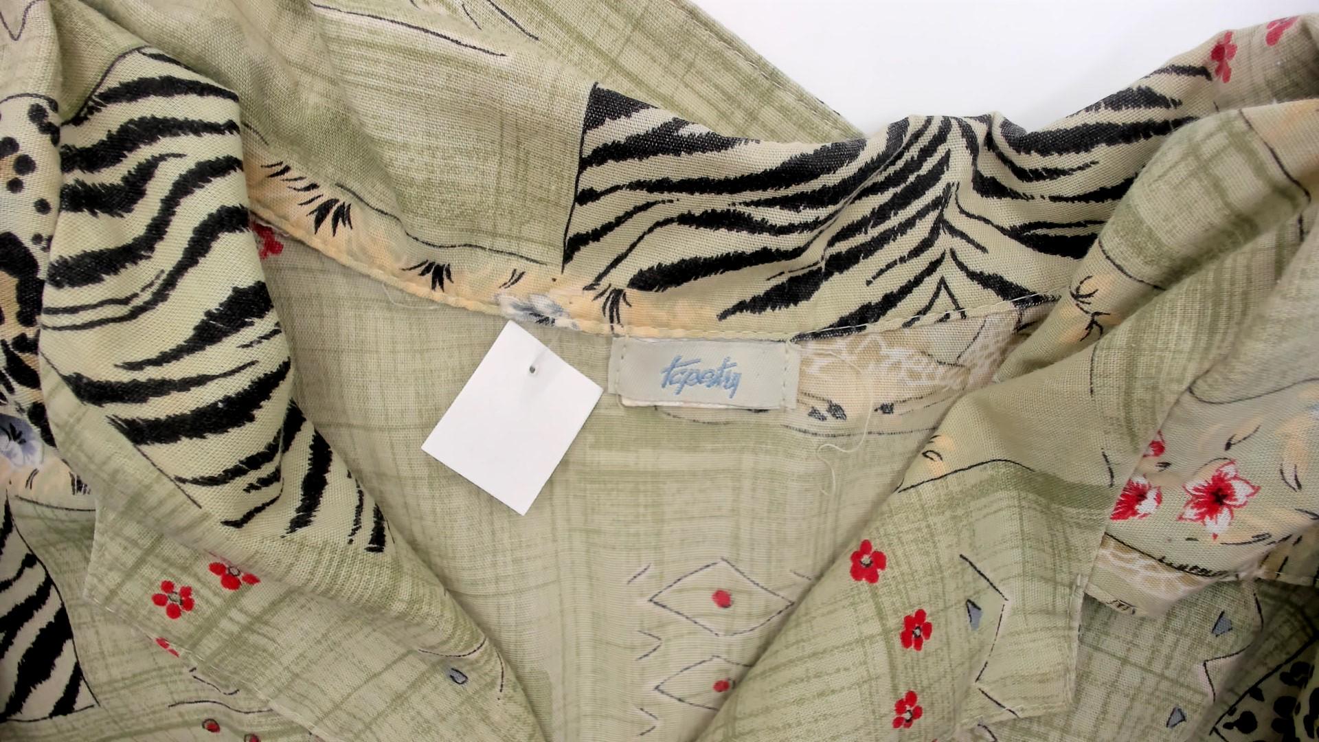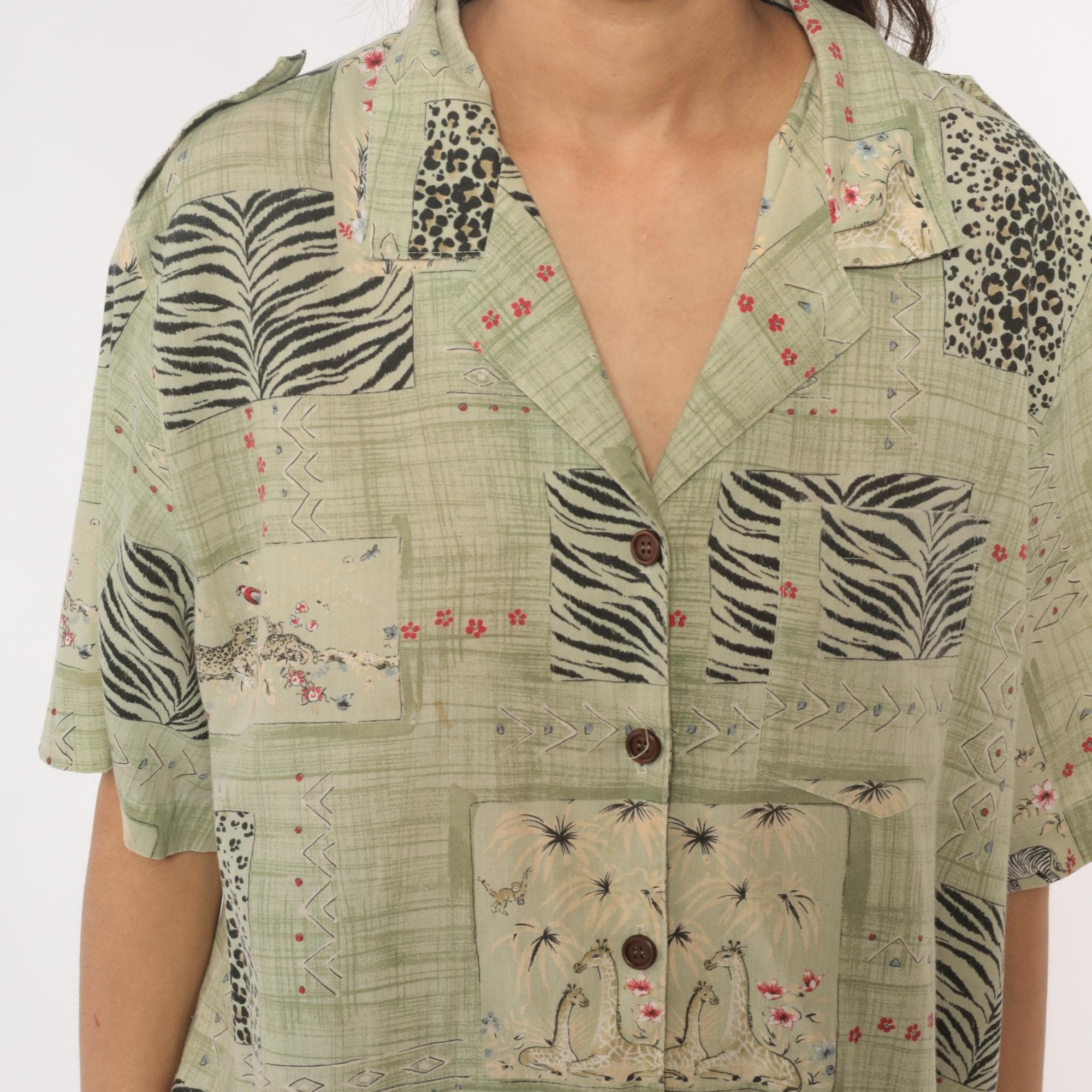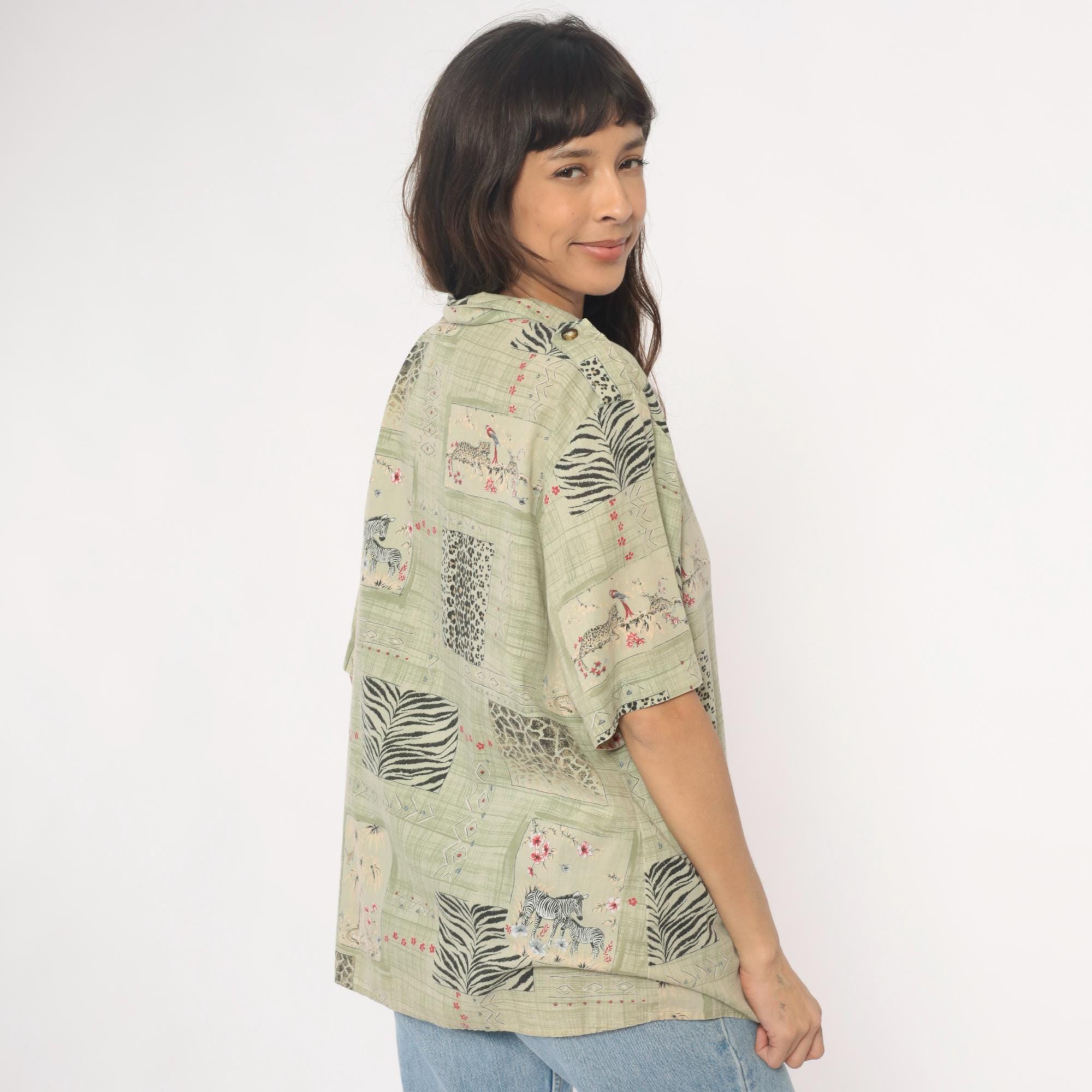 90s sage green short sleeve shirt with safari tapestry patchwork print featuring zebra stripes, leopard spots, peacocks, parrots, and cheetahs across squared patches. Button front closure with collar, boxy oversized silhouette with short sleeves. Floral accents and geometric tribal patterns throughout the design.