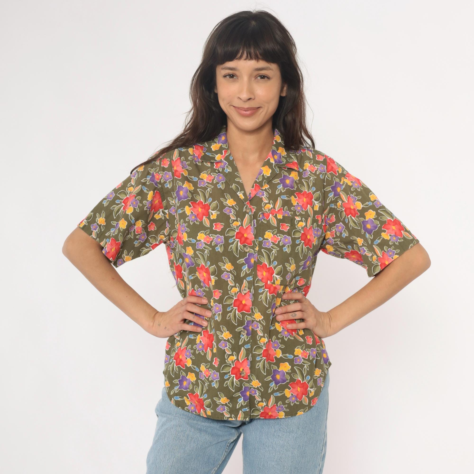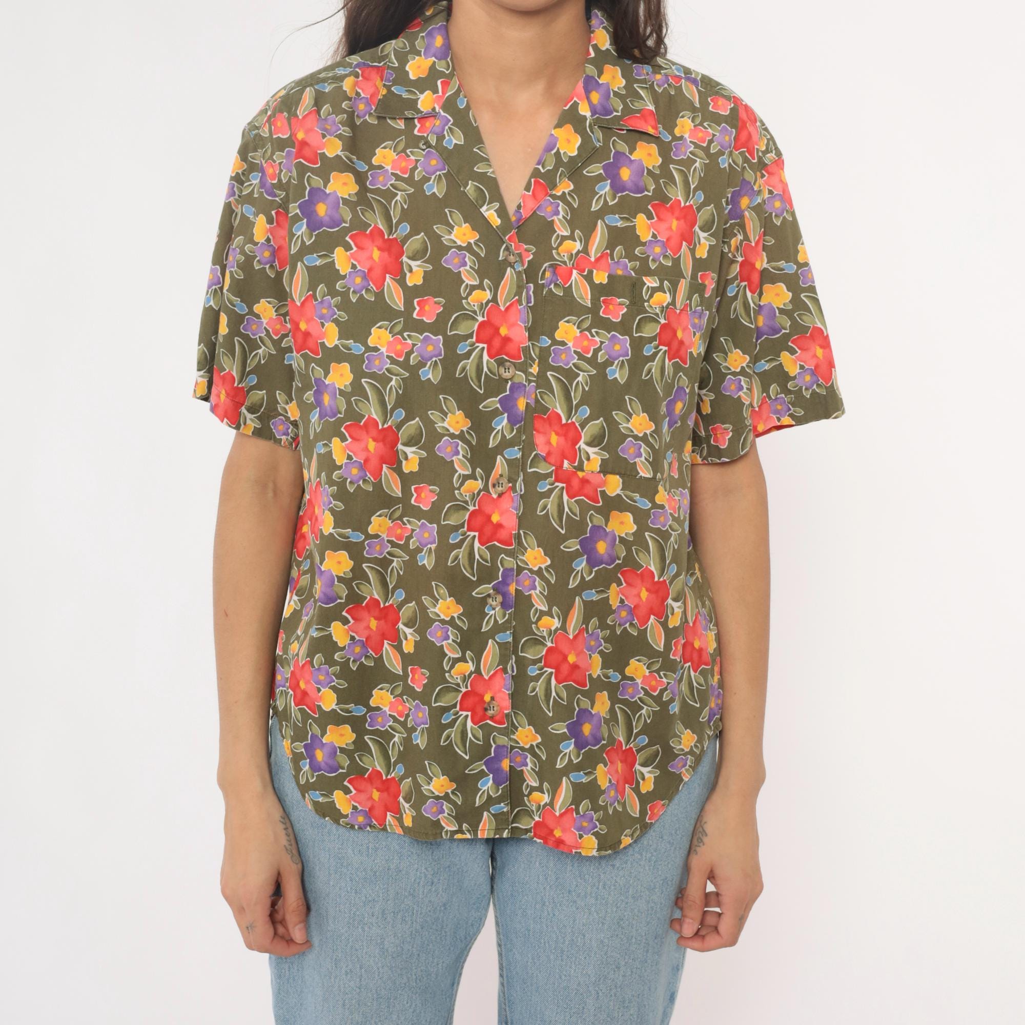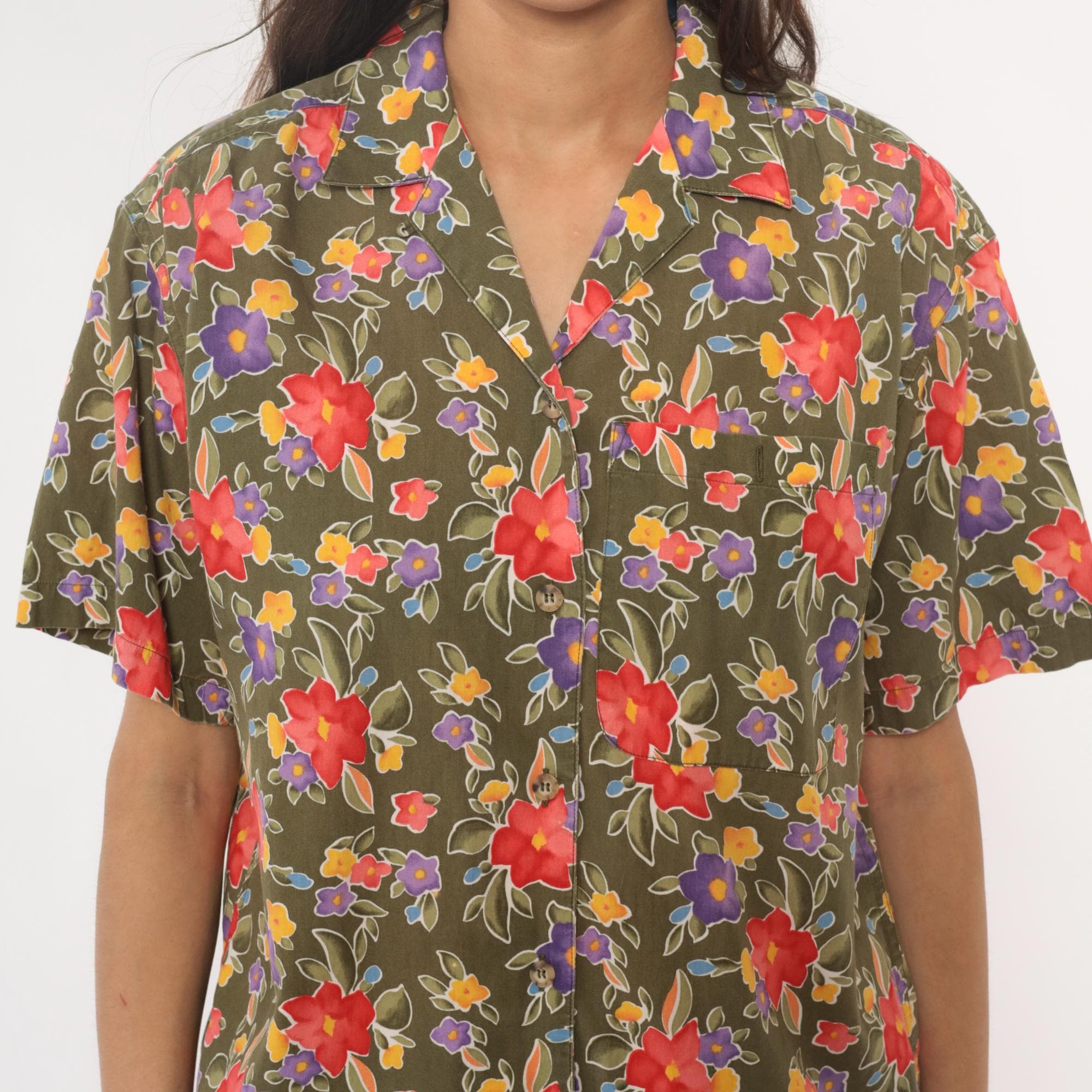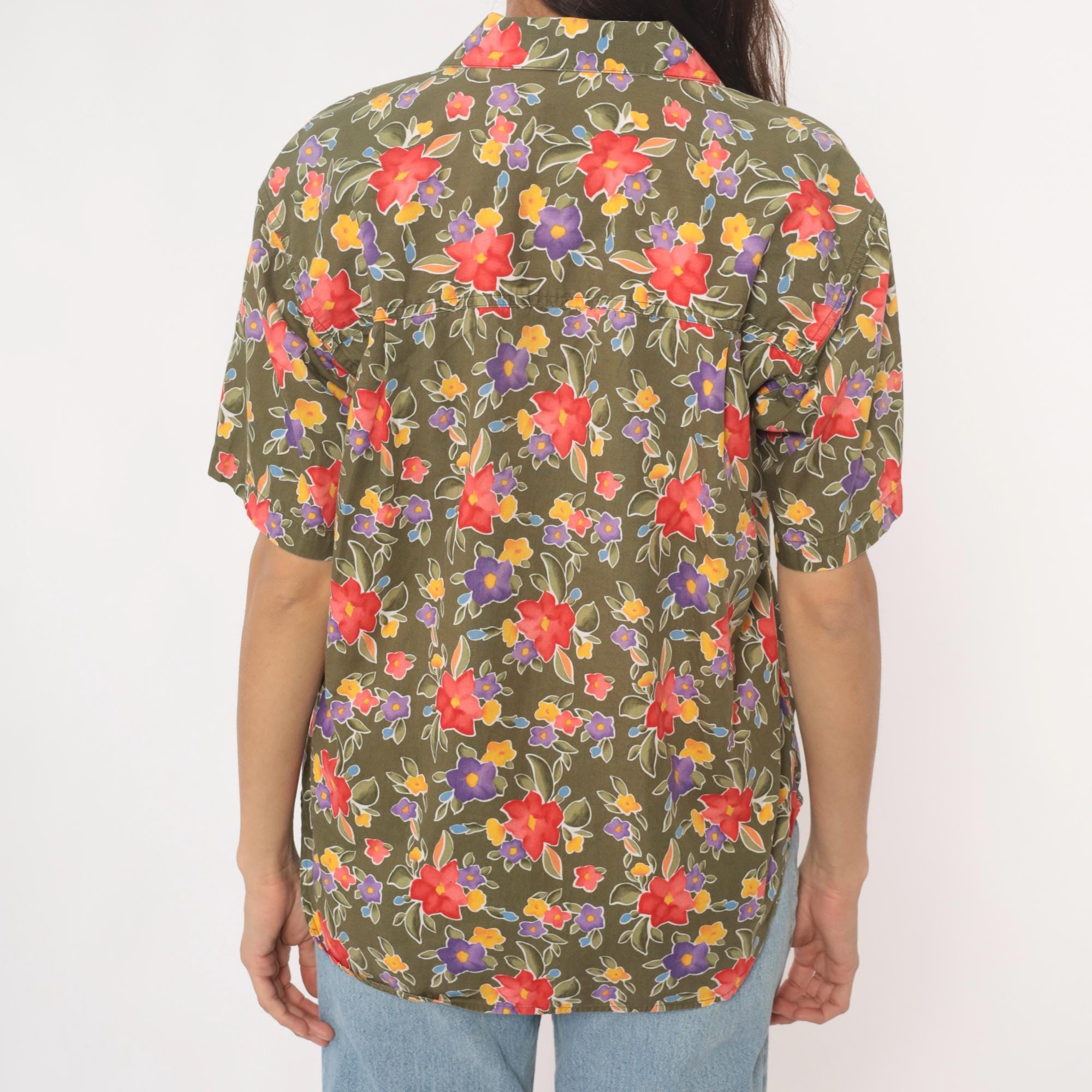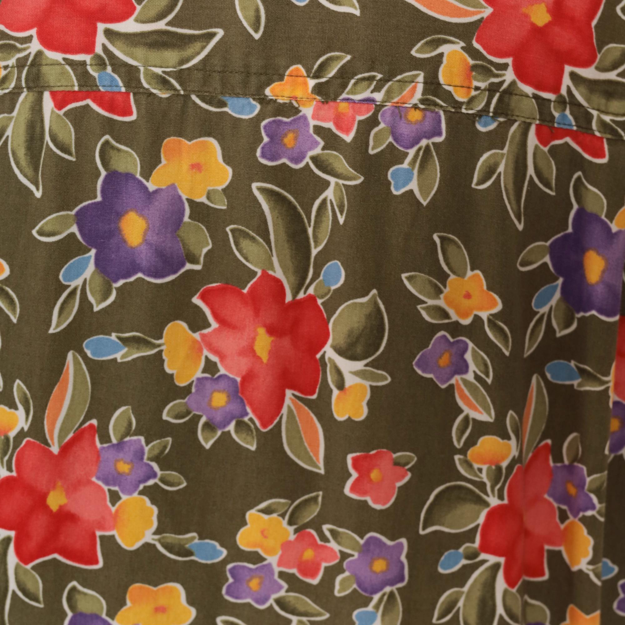 90s olive green floral shirt from liz sport with camp collar and button front closure. Red, purple, and yellow flowers with white outline detail across the fabric. Short sleeves, relaxed fit.