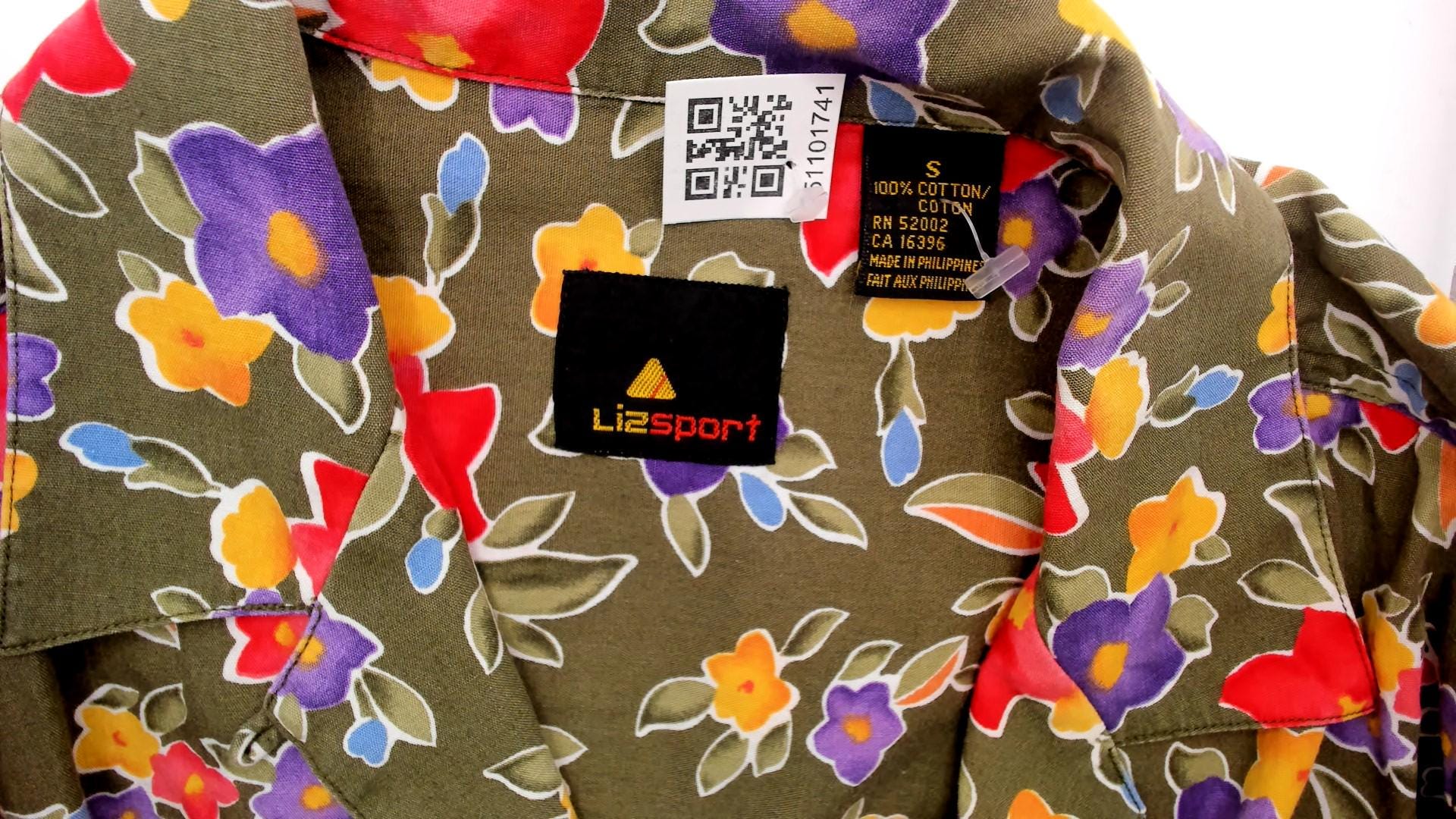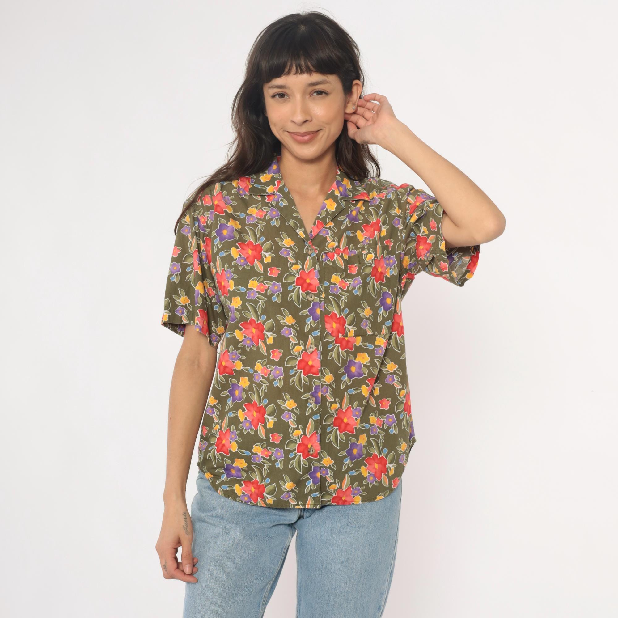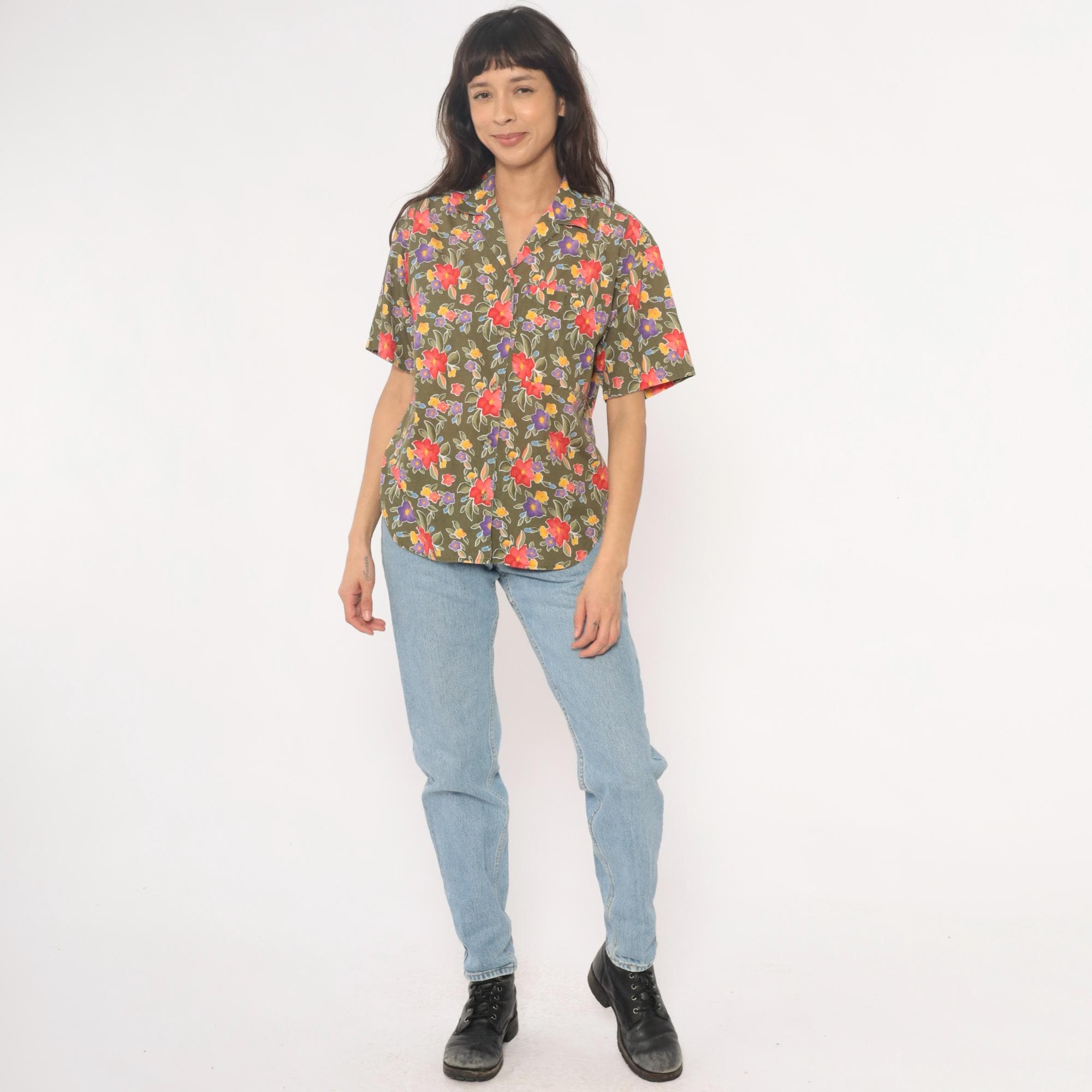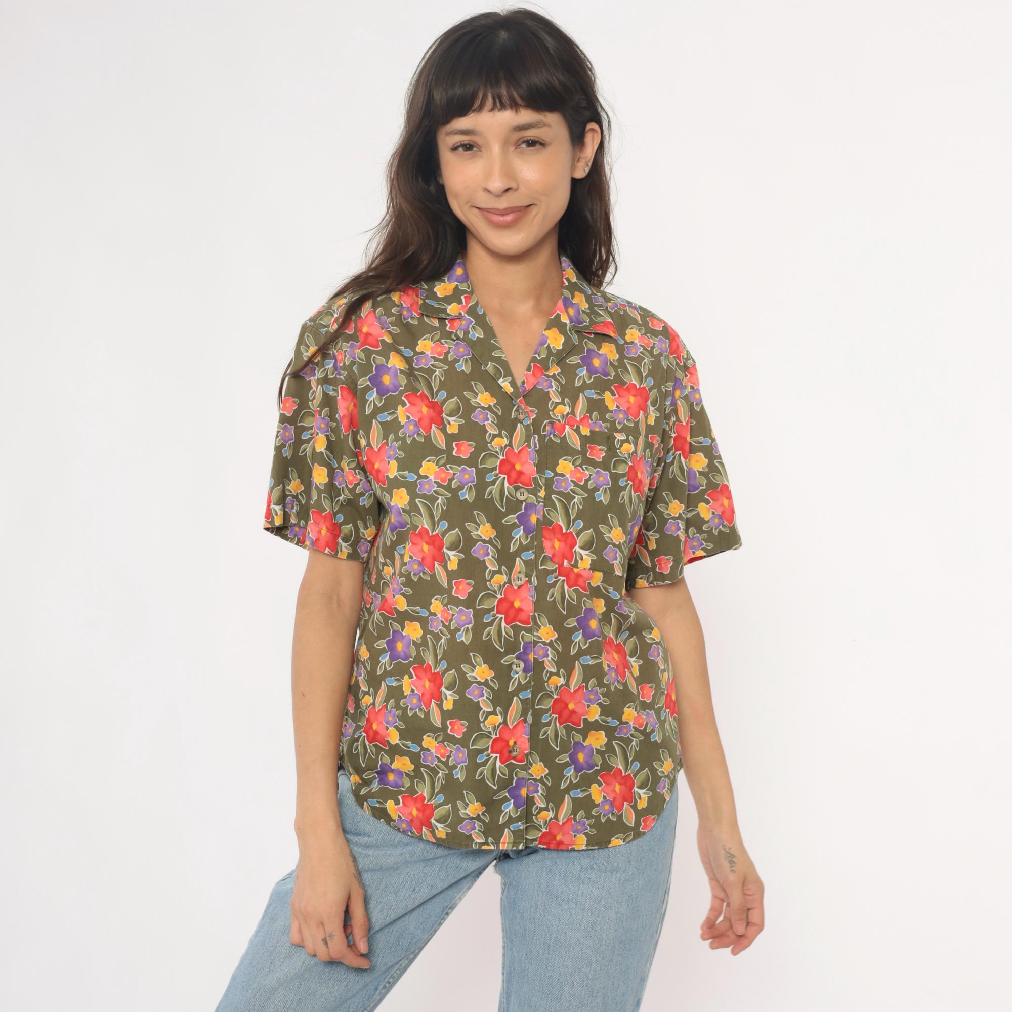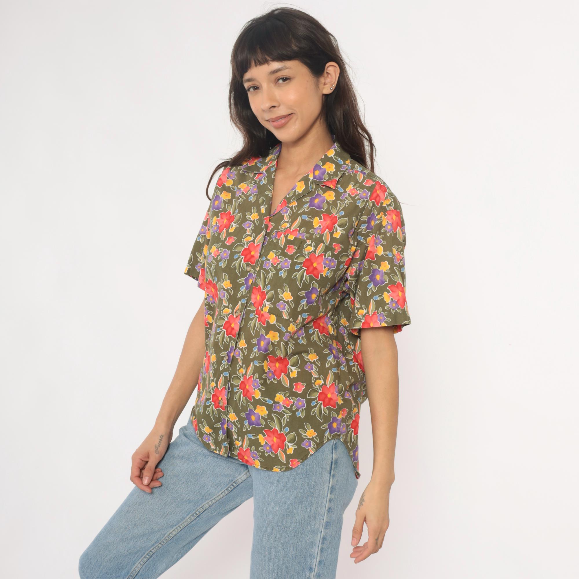 90s olive green floral shirt from liz sport with camp collar and button front closure. Red, purple, and yellow flowers with white outline detail across the fabric. Short sleeves, relaxed fit.