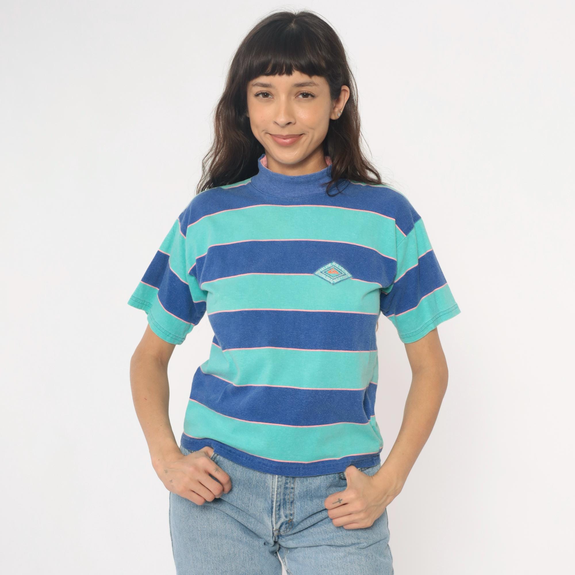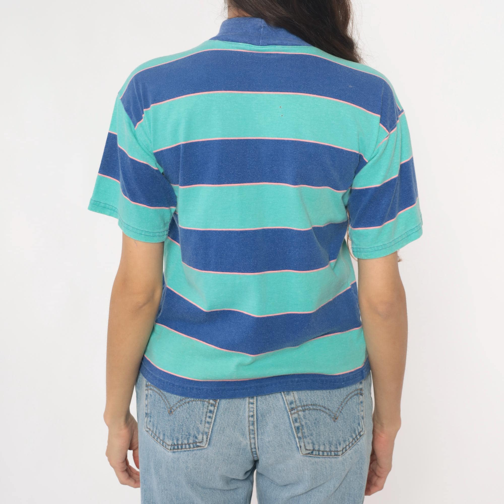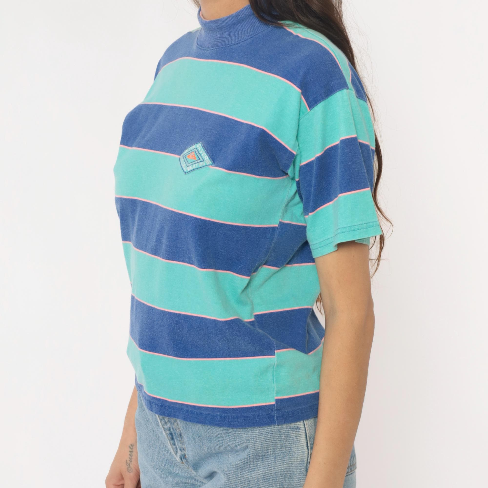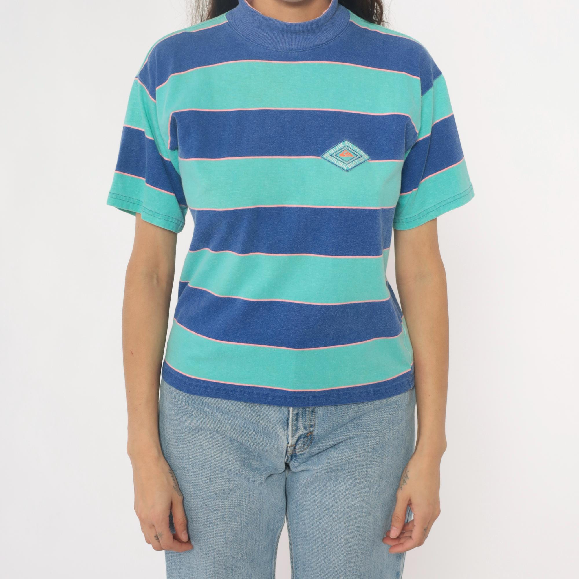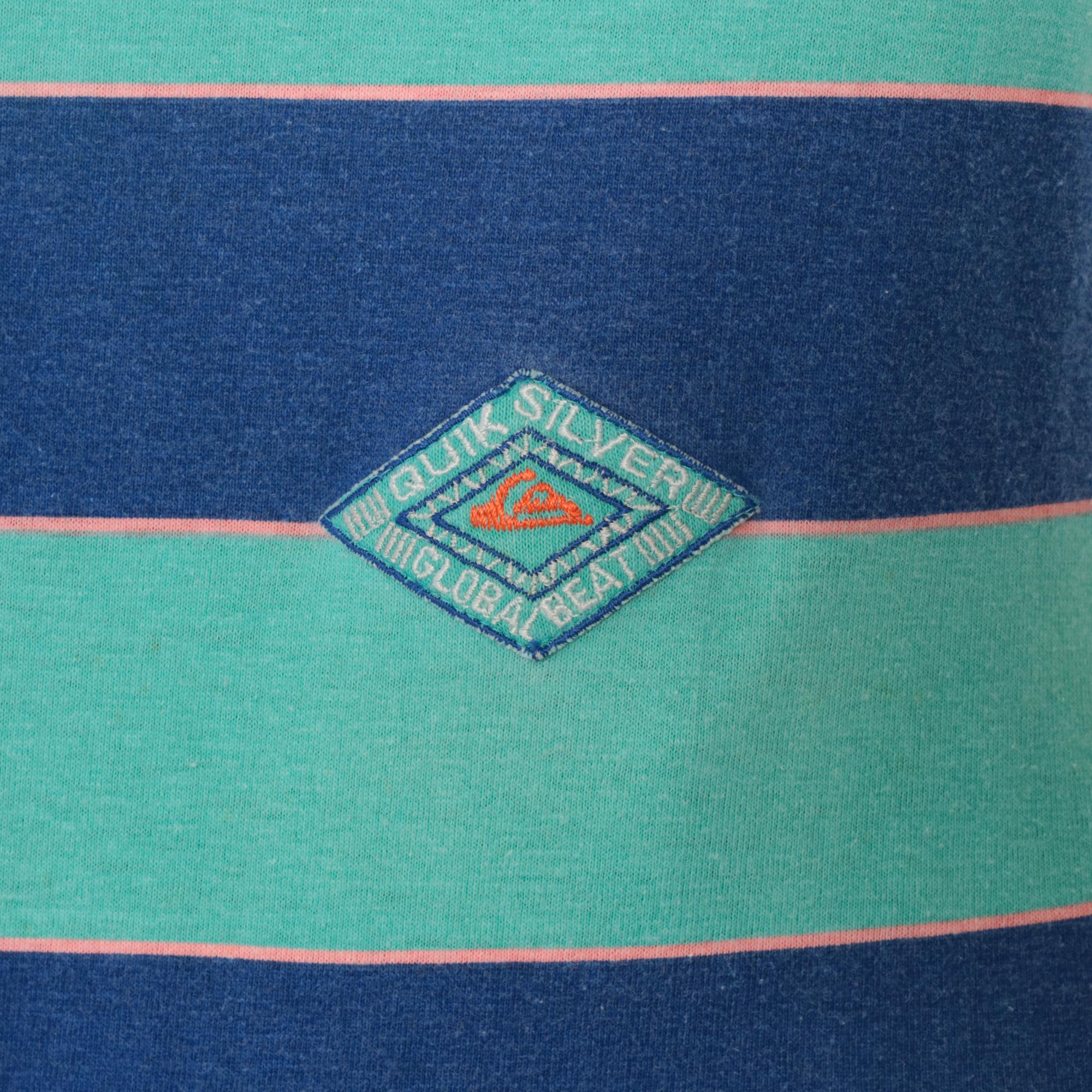 90s striped shirt from Quiksilver with mock neck collar and short sleeves. Blue and turquoise horizontal stripes with thin pink piping between each stripe. Diamond-shaped embroidered Quiksilver logo patch on left chest.