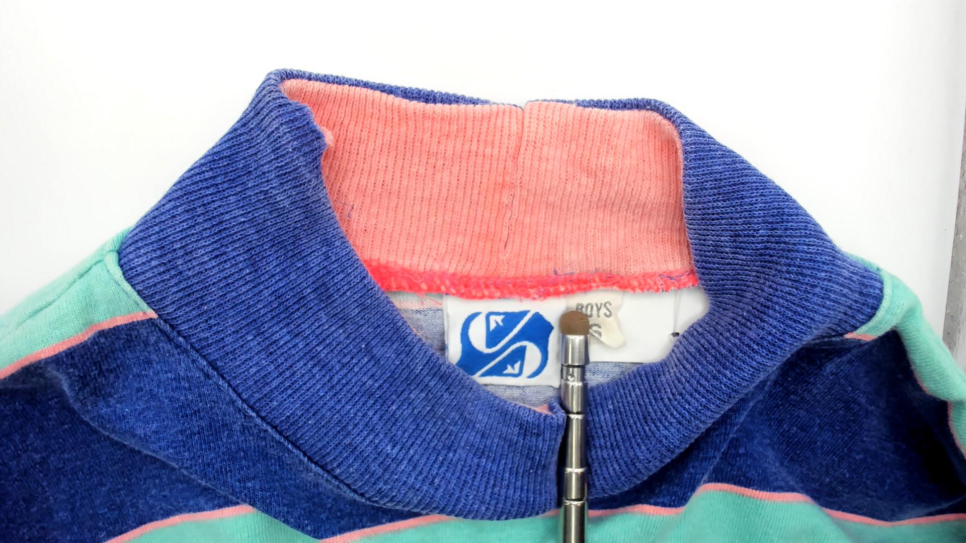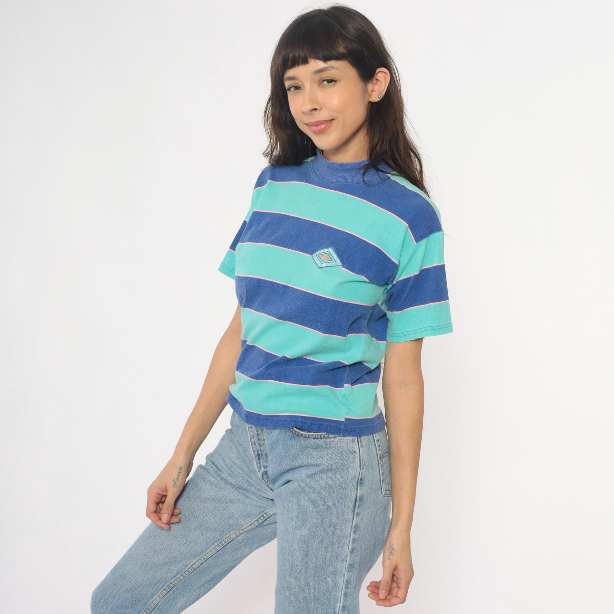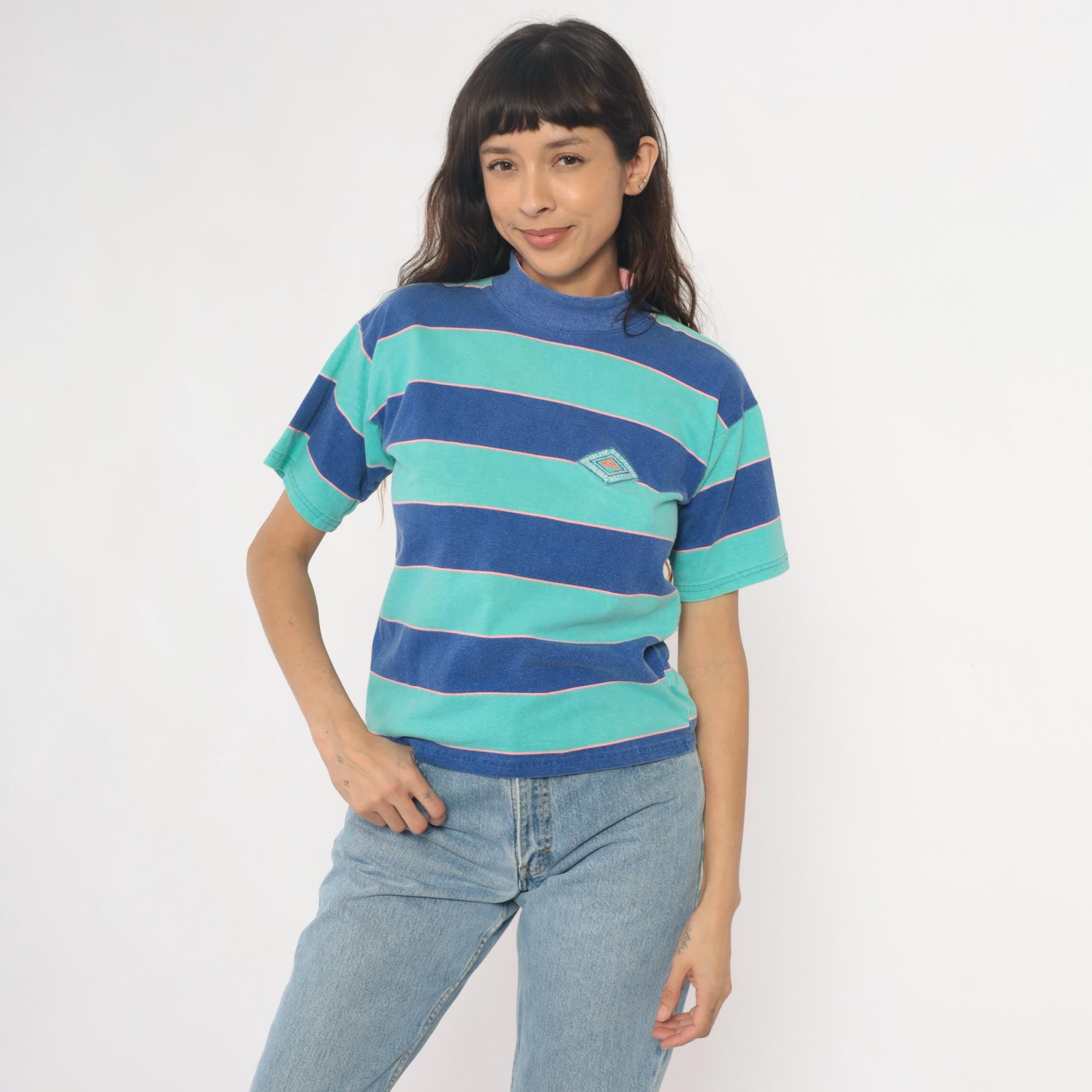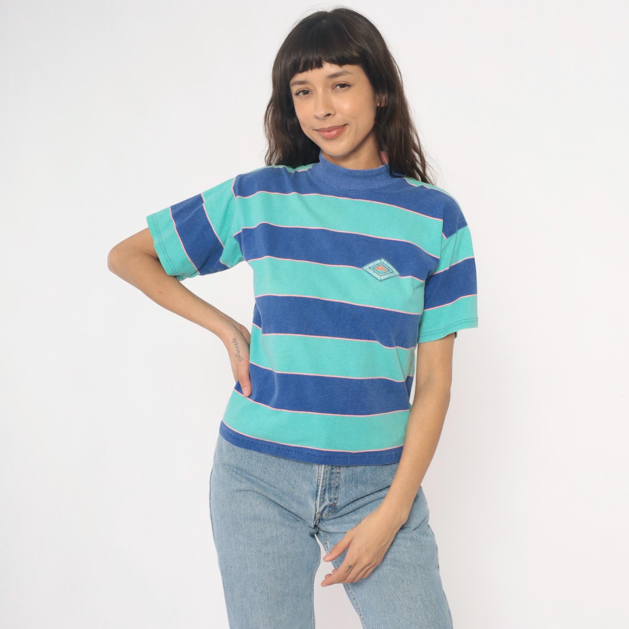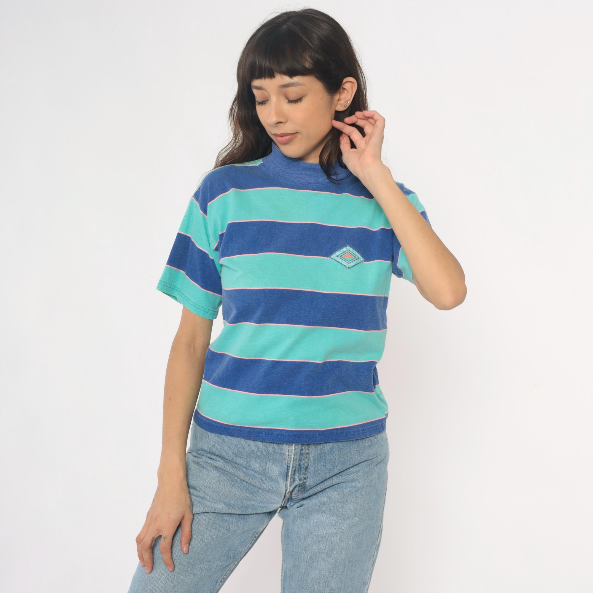 90s striped shirt from Quiksilver with mock neck collar and short sleeves. Blue and turquoise horizontal stripes with thin pink piping between each stripe. Diamond-shaped embroidered Quiksilver logo patch on left chest.