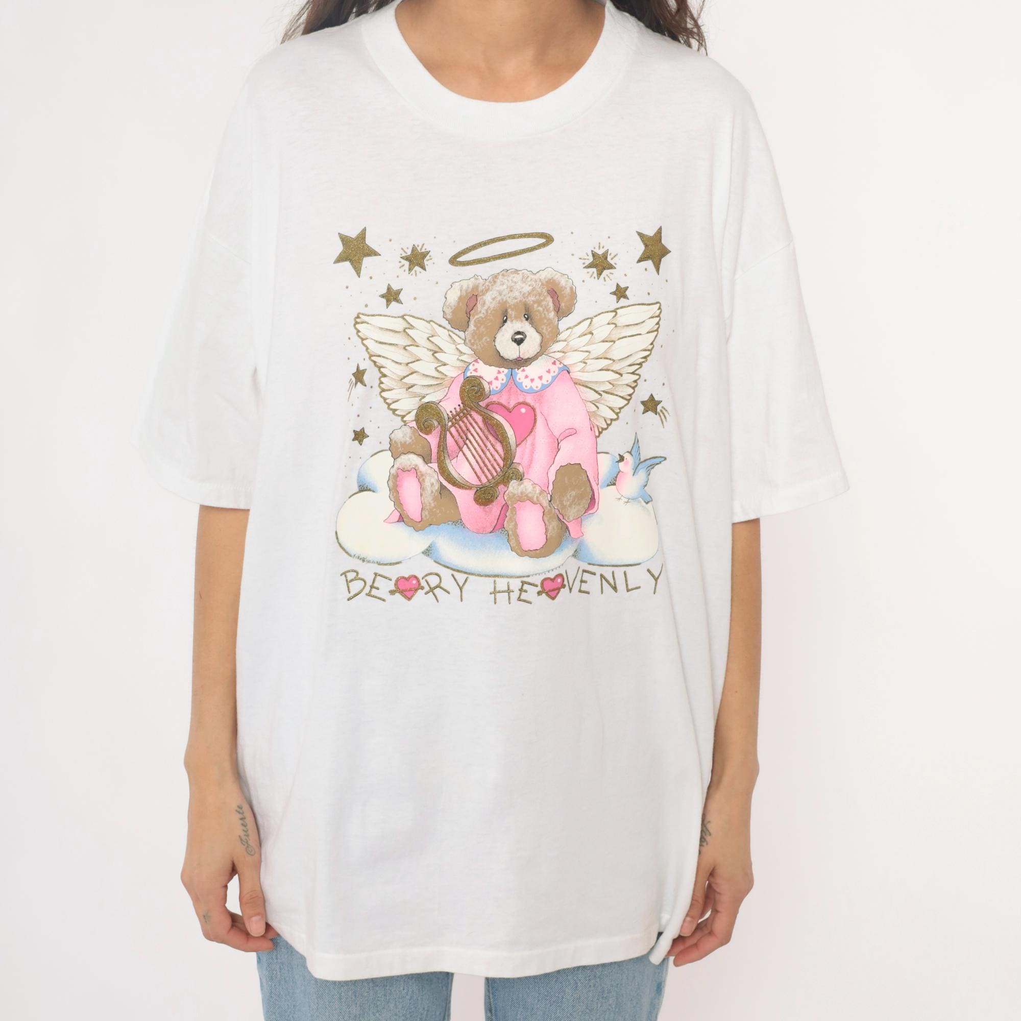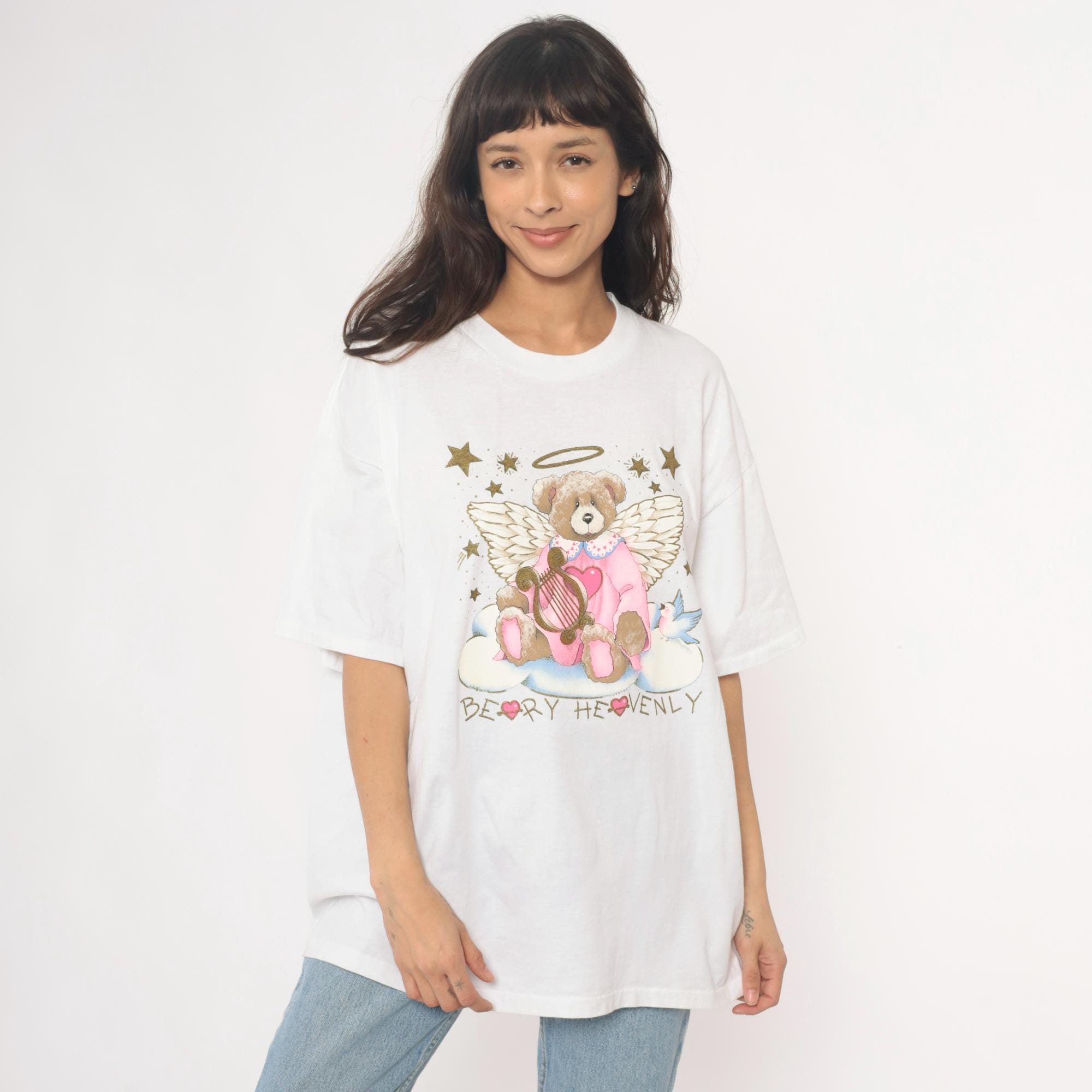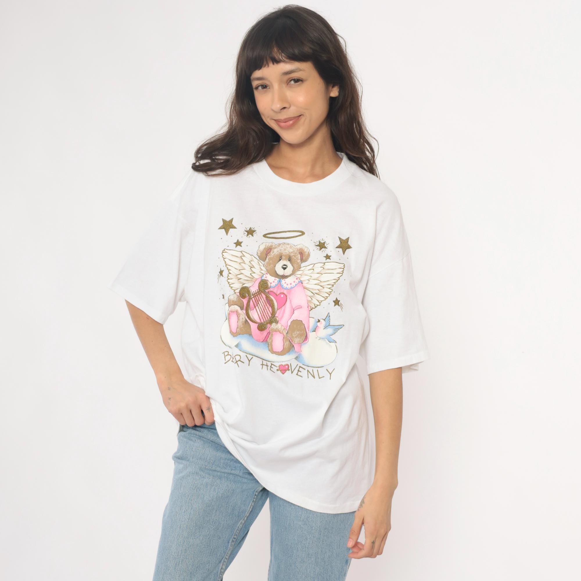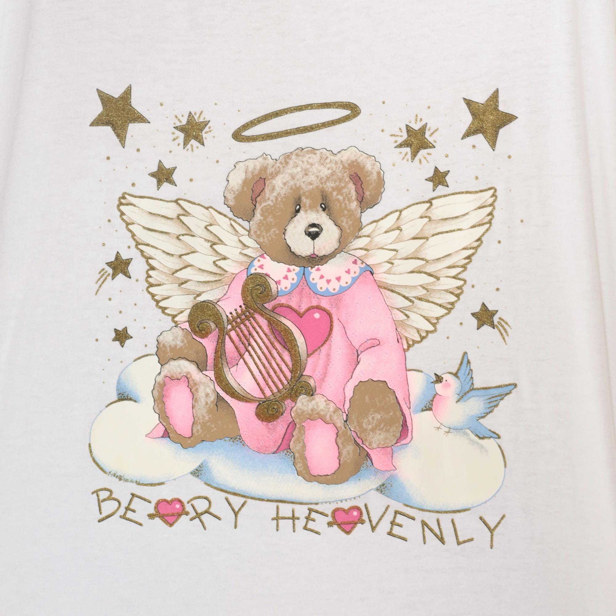 90s white t-shirt from oneita with "Beary Heavenly" graphic featuring an angel teddy bear with wings and halo, holding a golden harp and surrounded by stars. Pink outfit on bear with blue bird detail, gold glitter accents on stars and celestial elements.