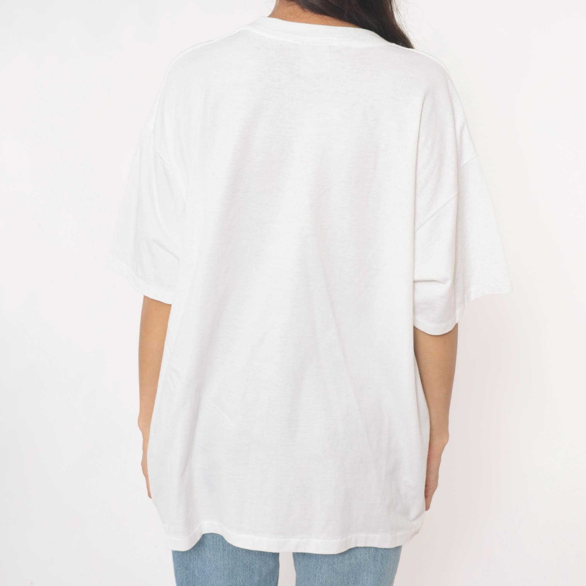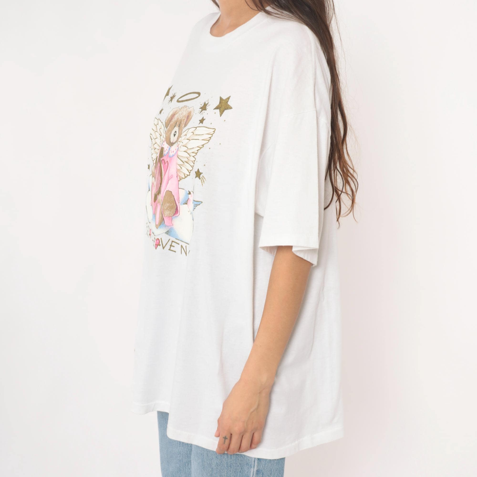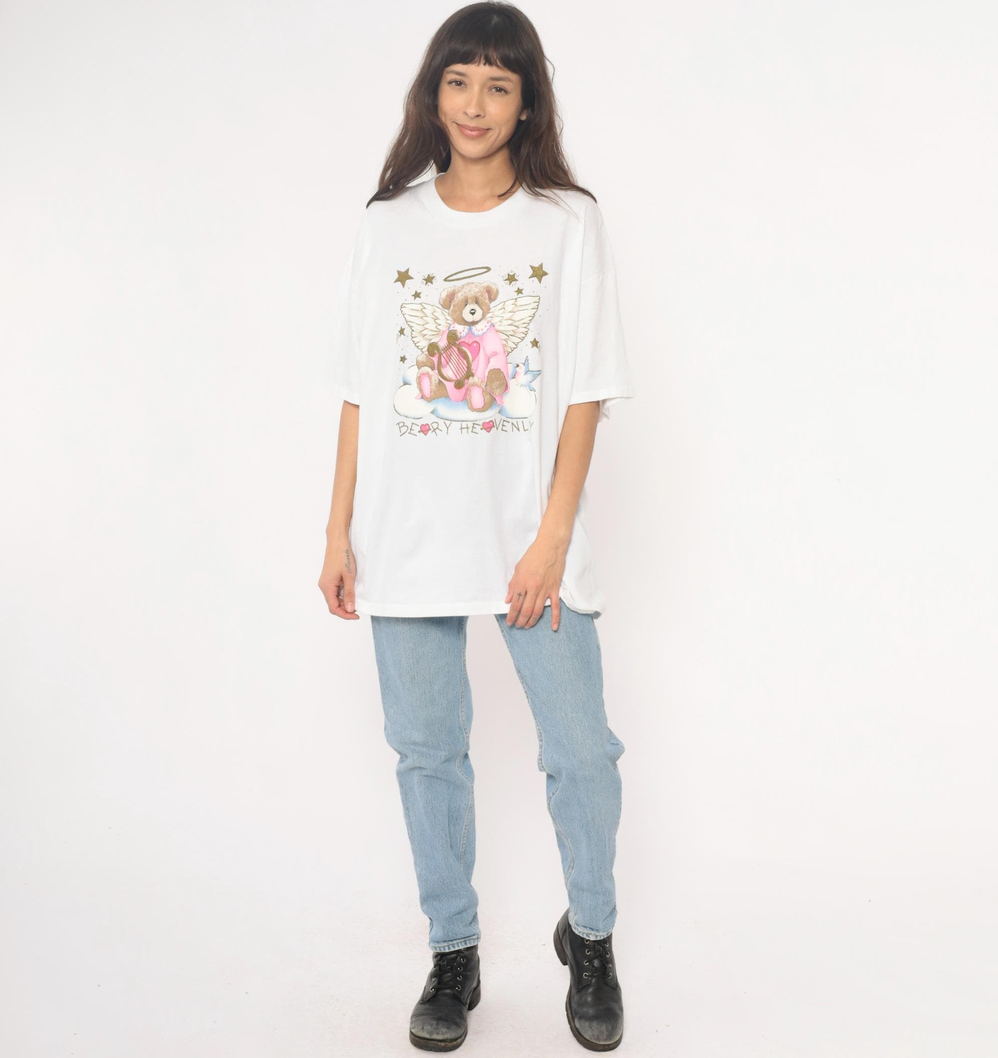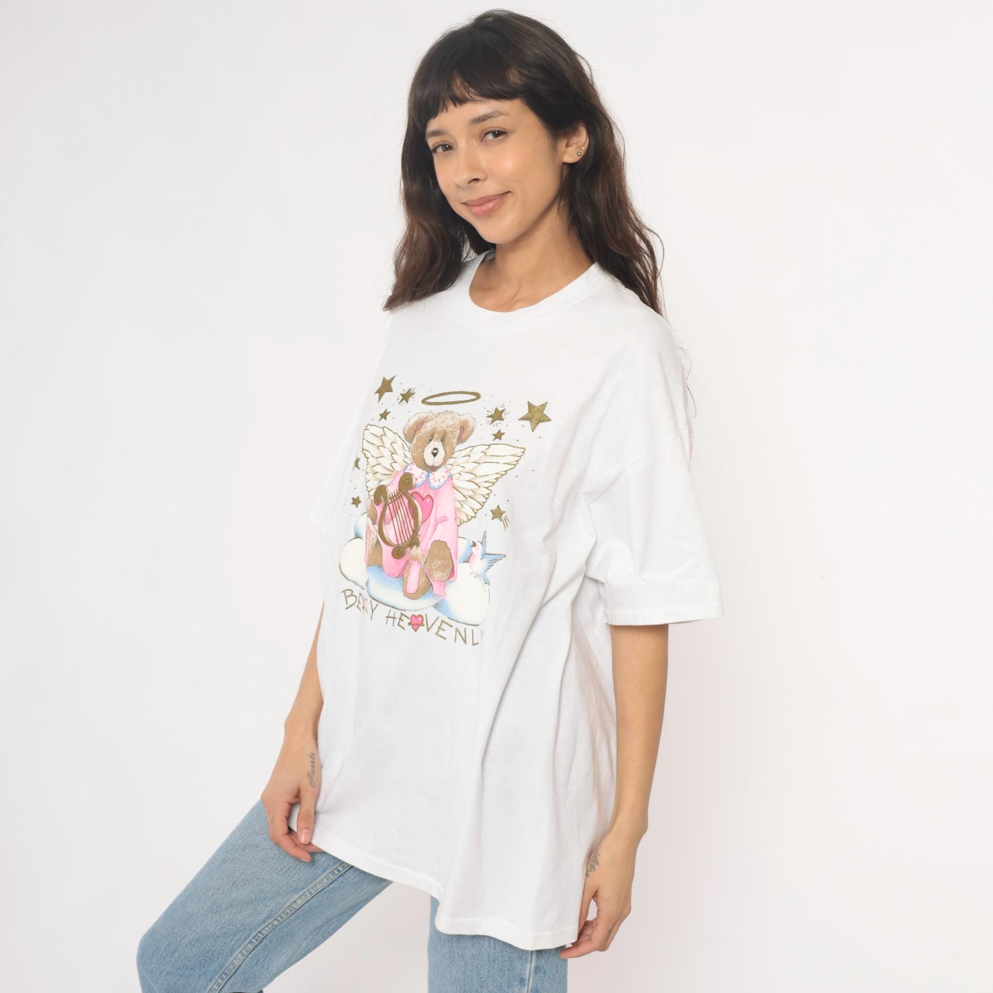 90s white t-shirt from oneita with "Beary Heavenly" graphic featuring an angel teddy bear with wings and halo, holding a golden harp and surrounded by stars. Pink outfit on bear with blue bird detail, gold glitter accents on stars and celestial elements.