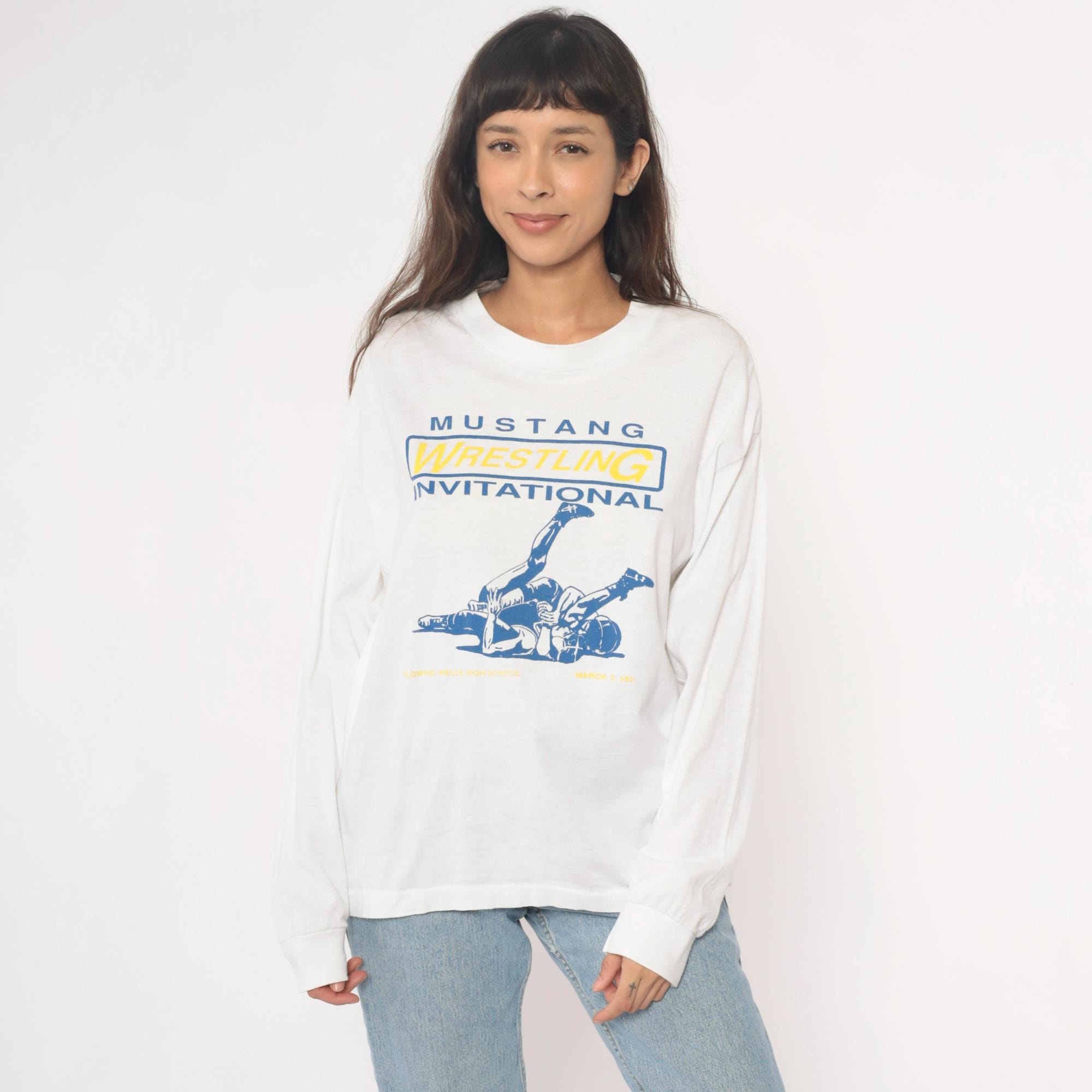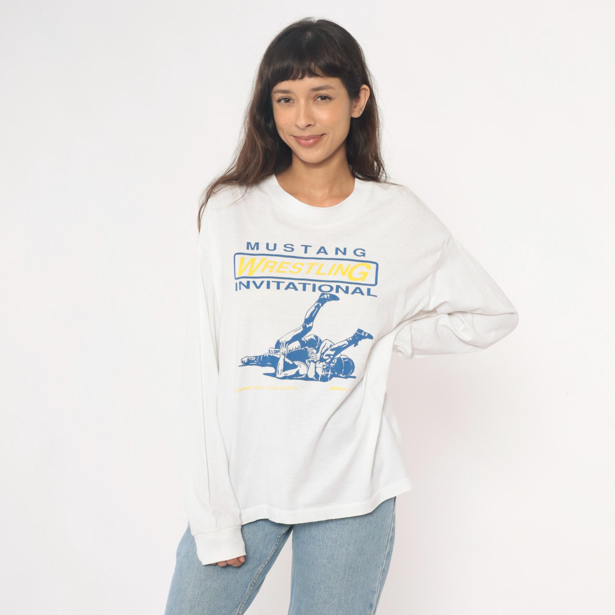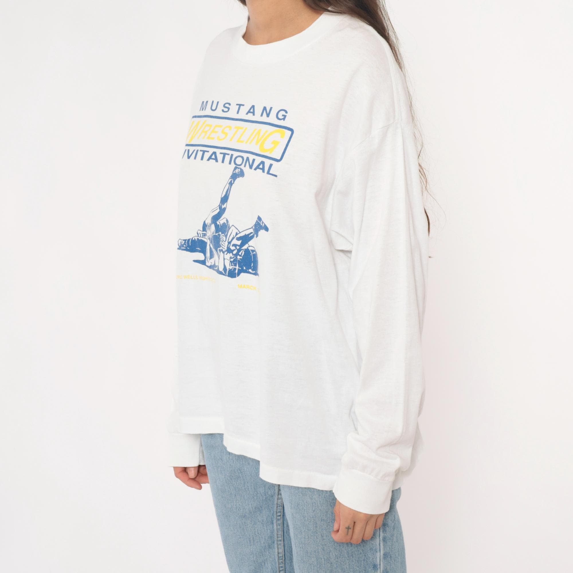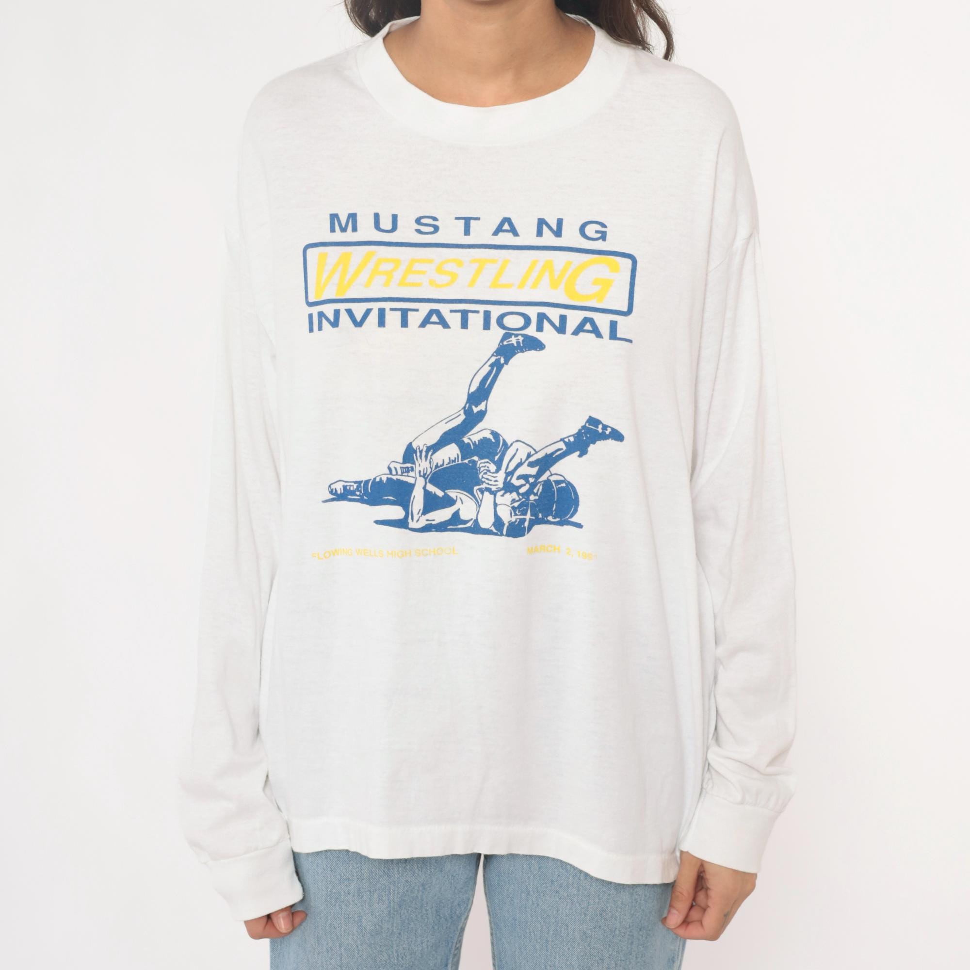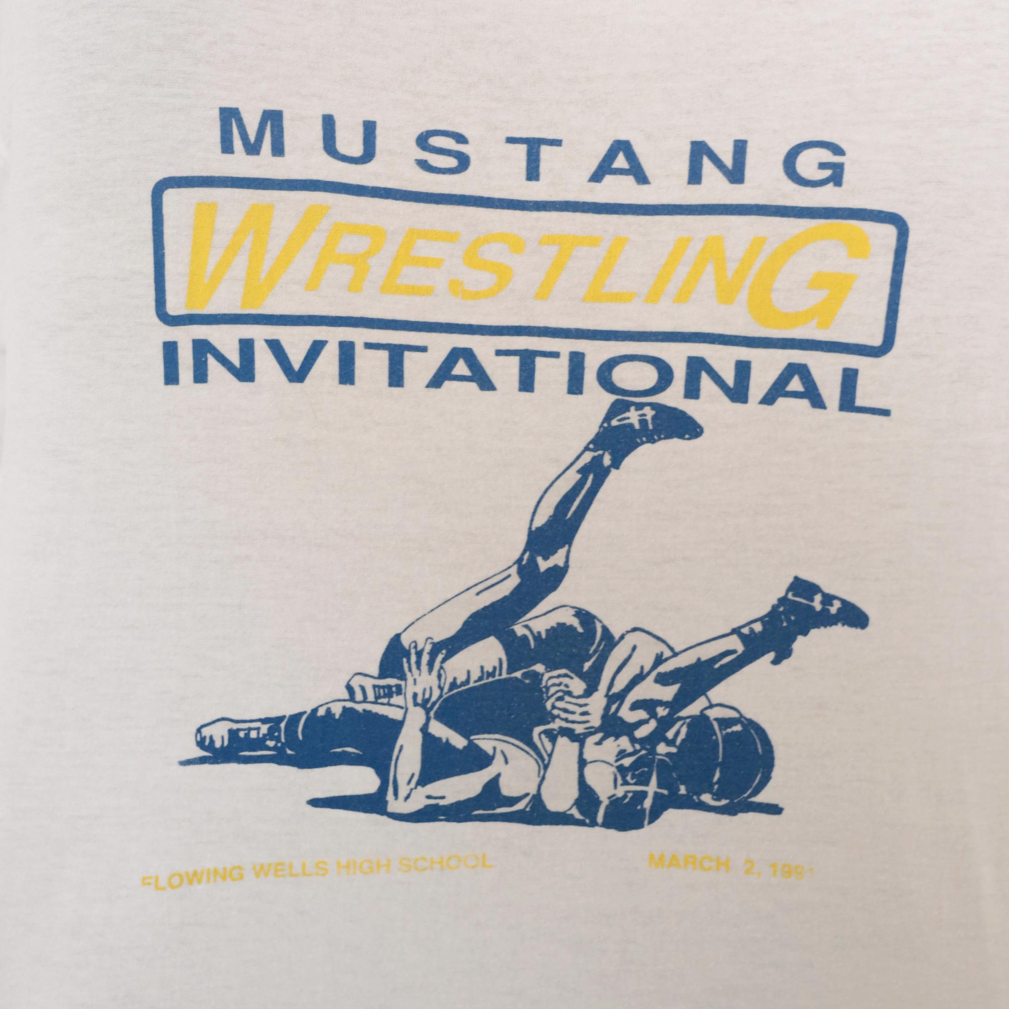 90s white long sleeve wrestling t-shirt with dual-sided graphics from a Mustang Wrestling Invitational event at Flowing Wells High School dated March 2, 199-. Front features "MUSTANG WRESTLING INVITATIONAL" text in blue with yellow "WRESTLING" centered, wrestling figures graphic, and event details in yellow text below. Back shows wrestling graphic with "Wrestling: Wimps need not apply--" text in blue.