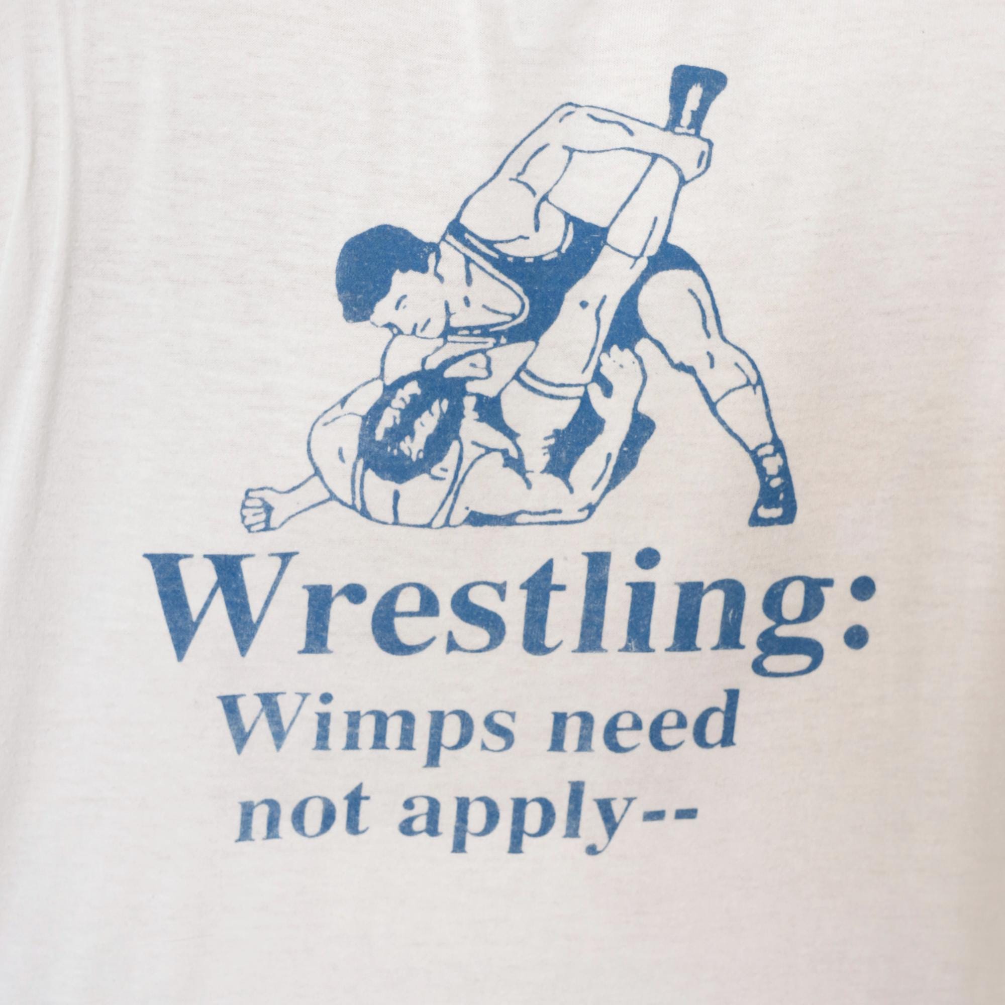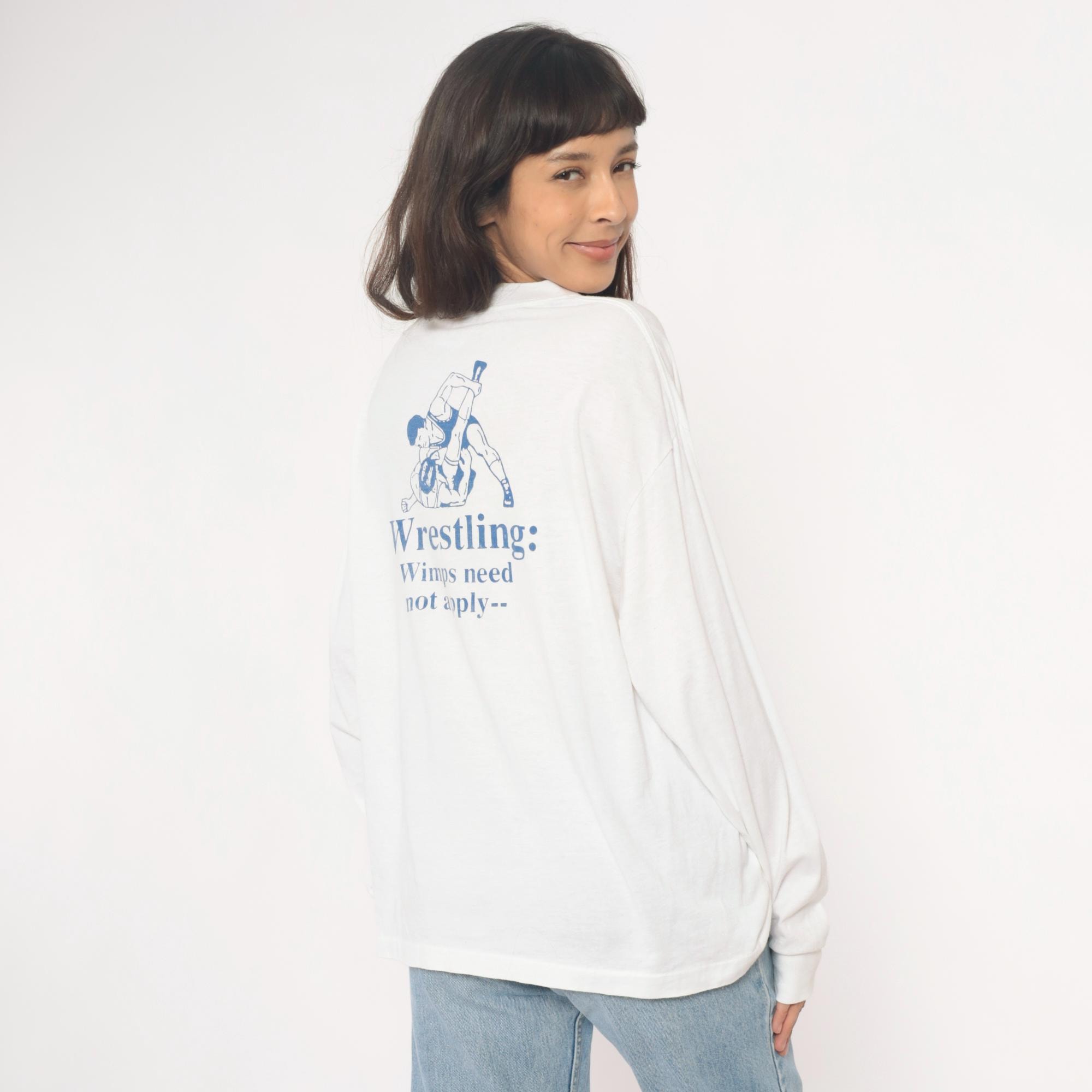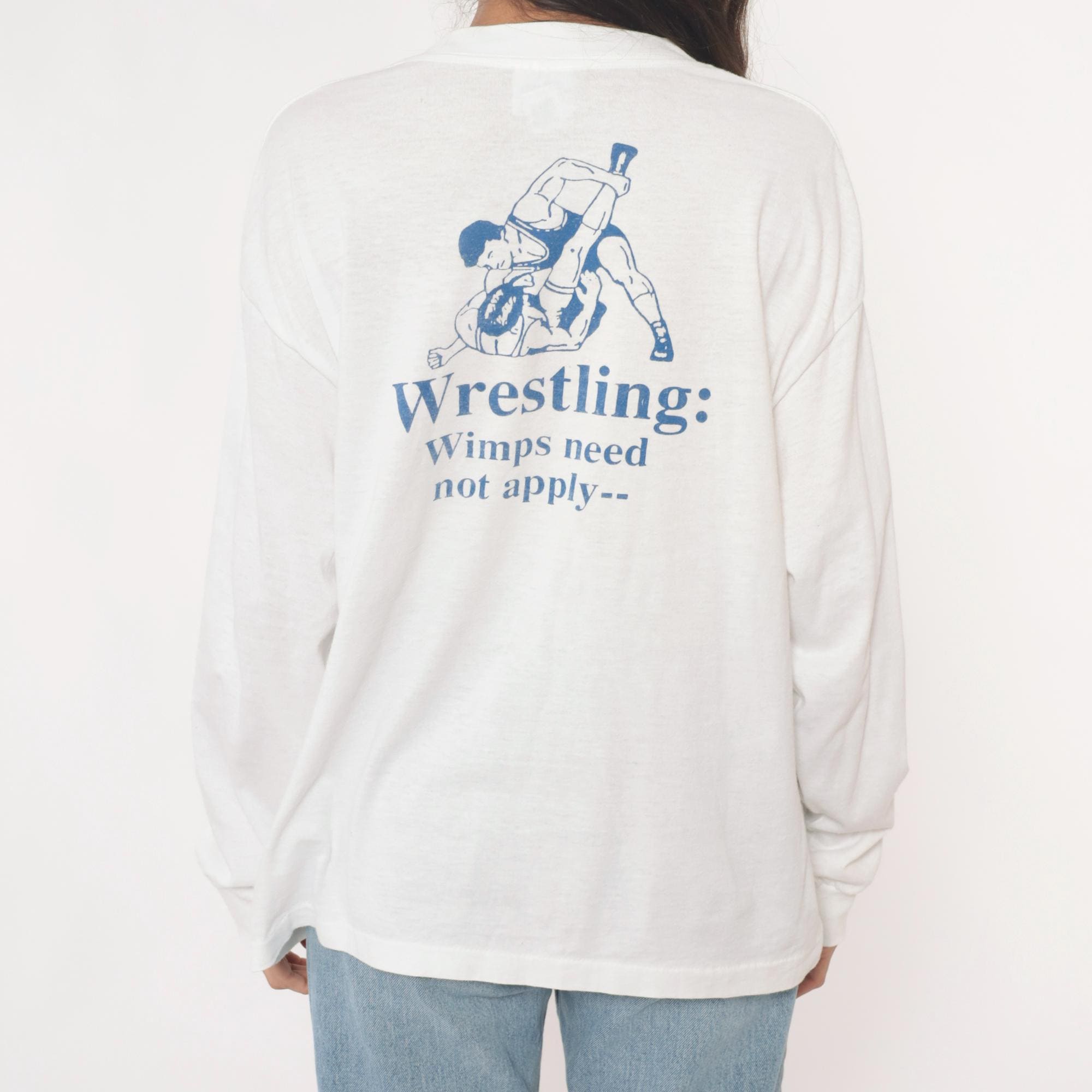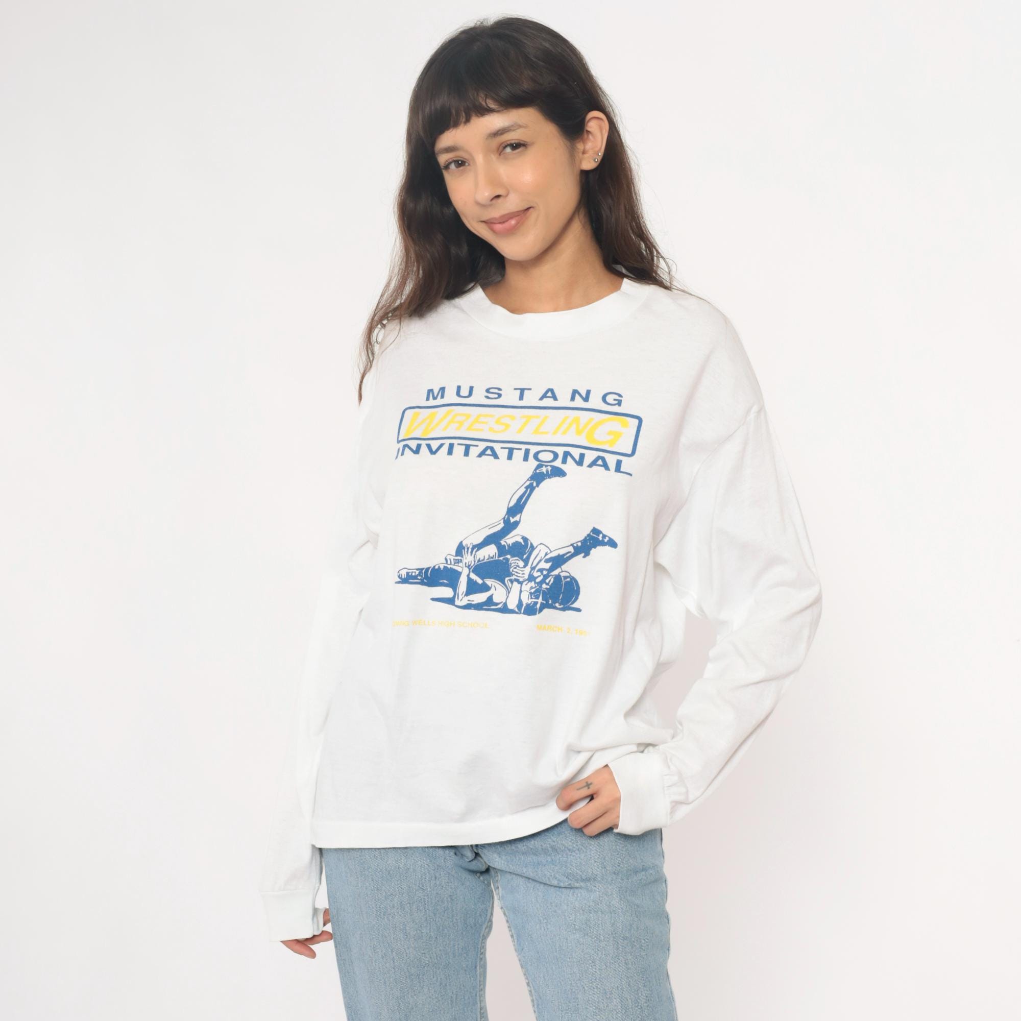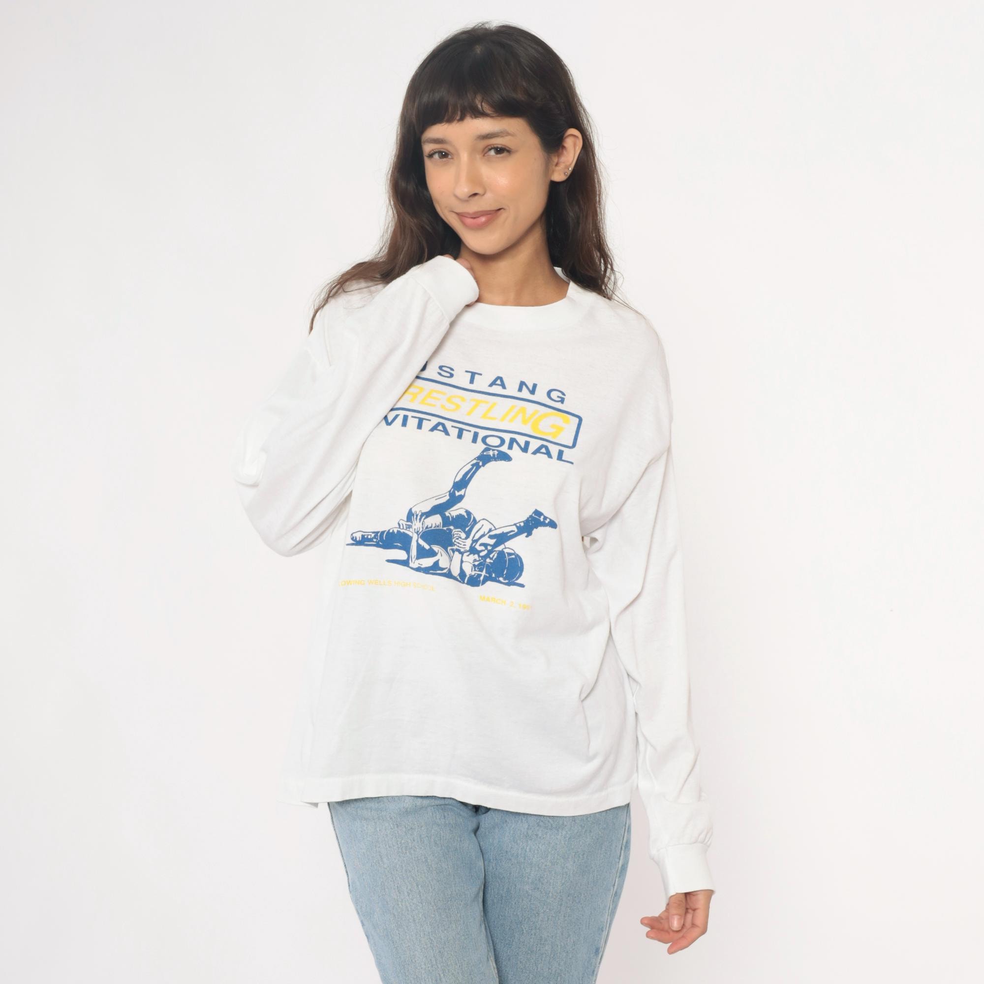 90s white long sleeve wrestling t-shirt with dual-sided graphics from a Mustang Wrestling Invitational event at Flowing Wells High School dated March 2, 199-. Front features "MUSTANG WRESTLING INVITATIONAL" text in blue with yellow "WRESTLING" centered, wrestling figures graphic, and event details in yellow text below. Back shows wrestling graphic with "Wrestling: Wimps need not apply--" text in blue.