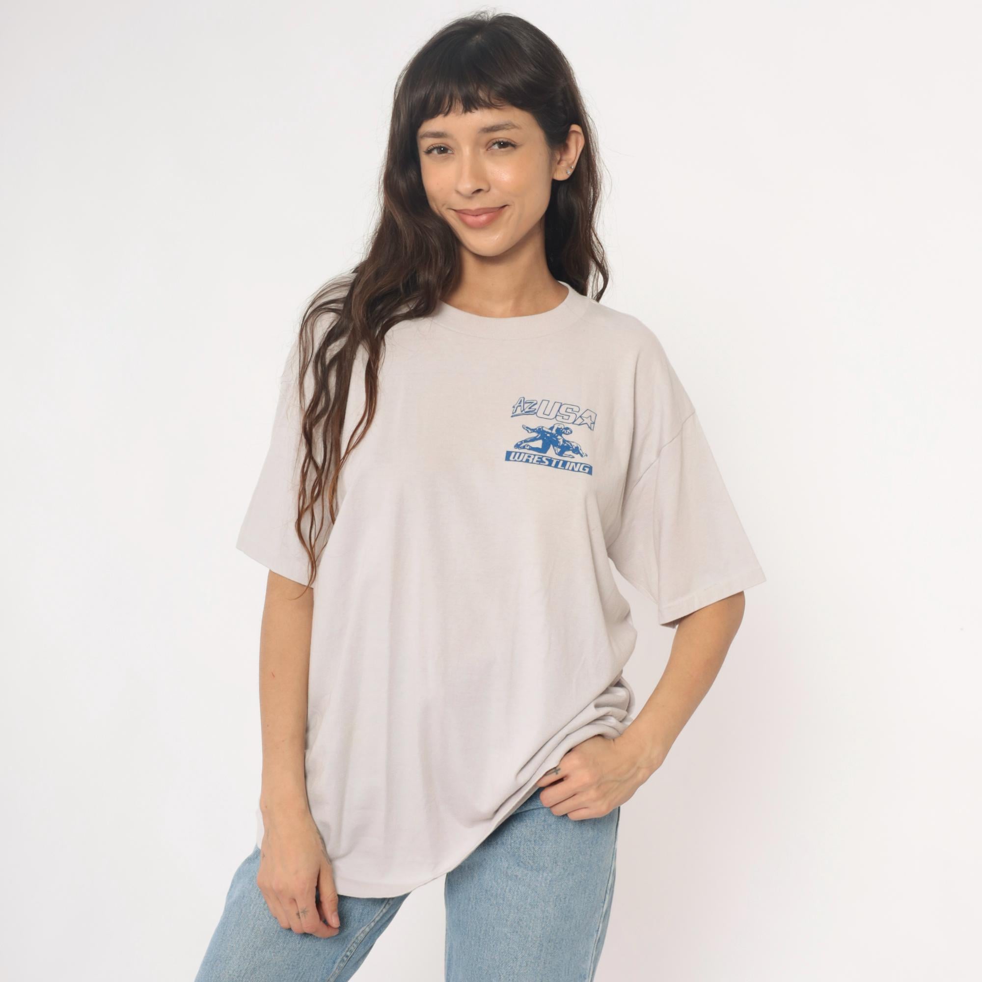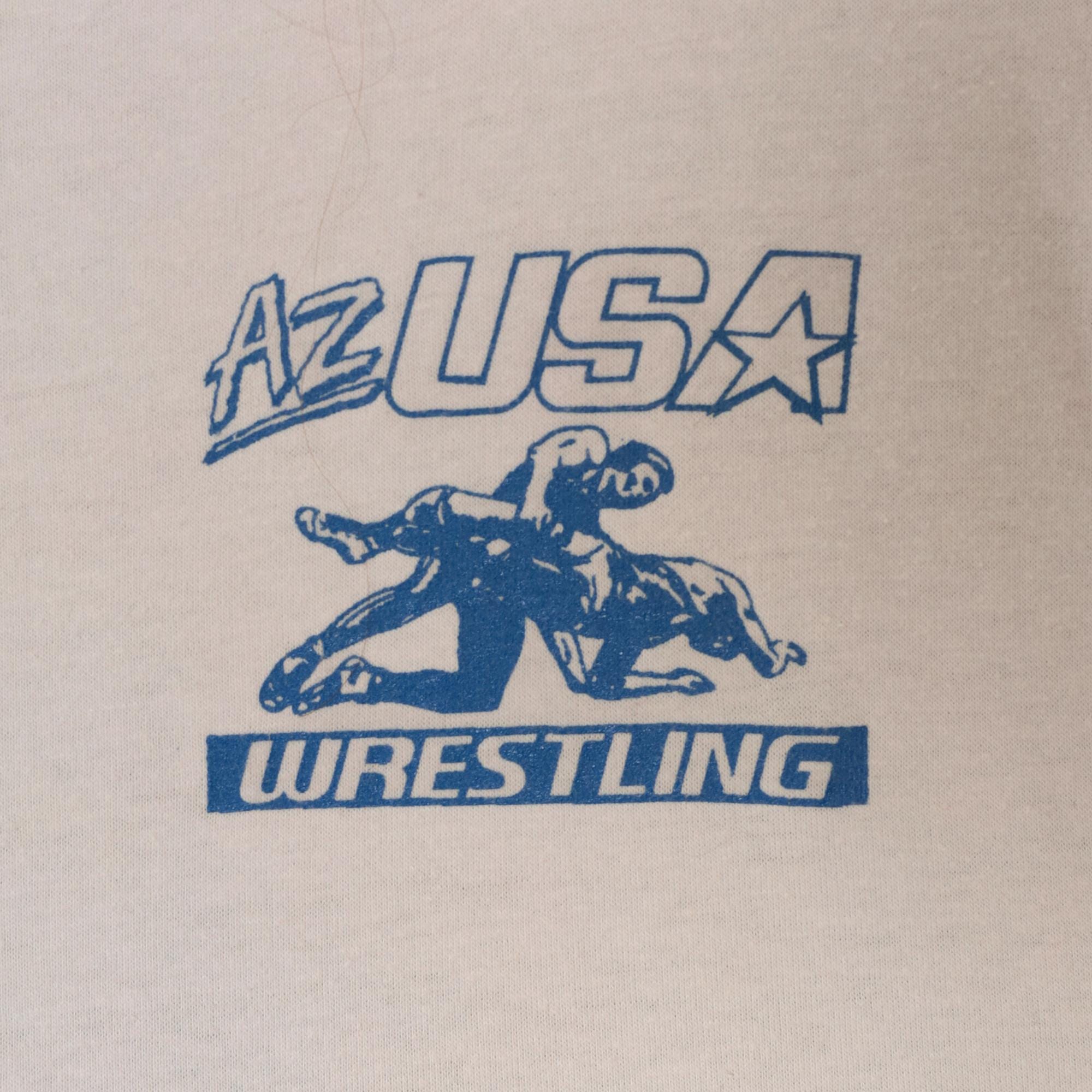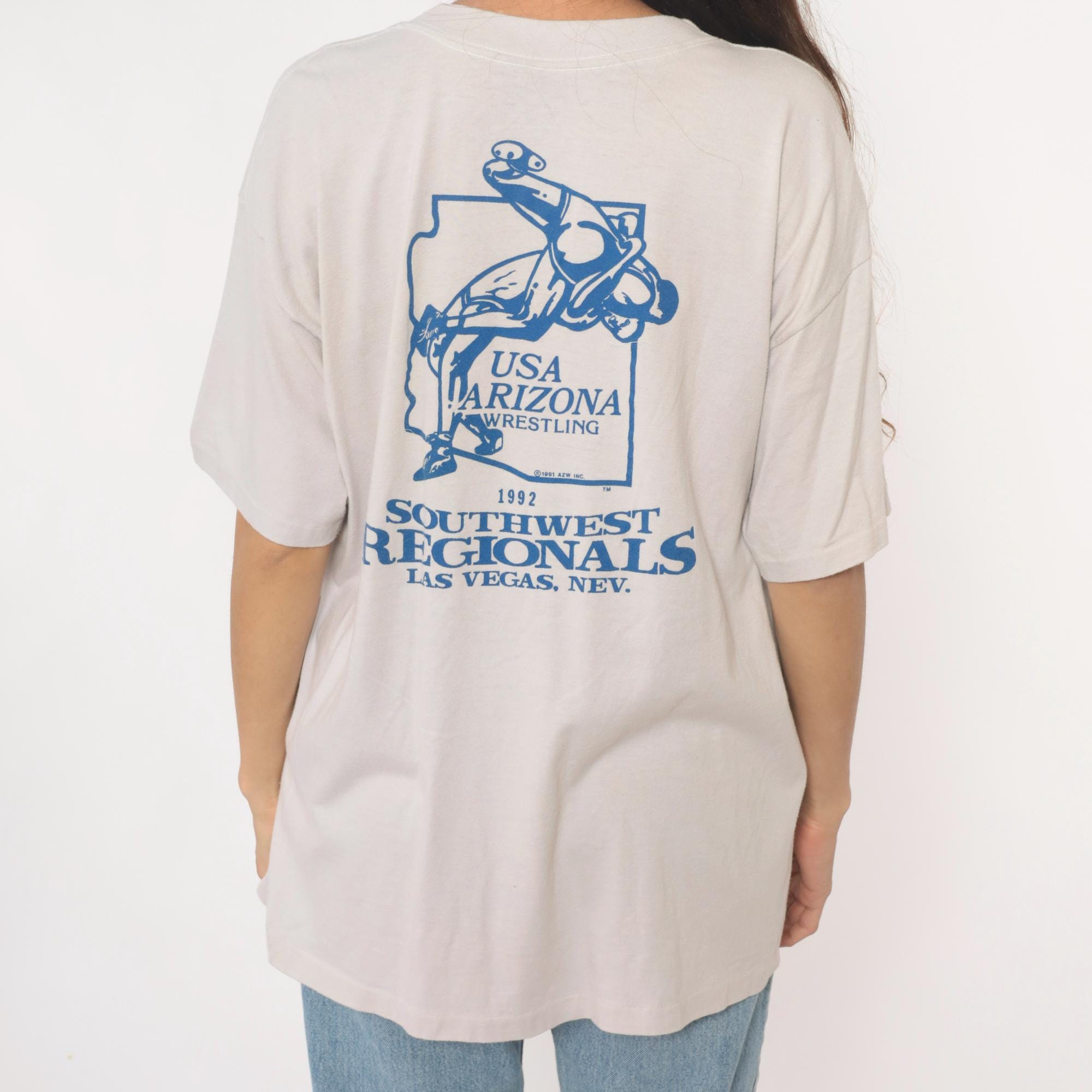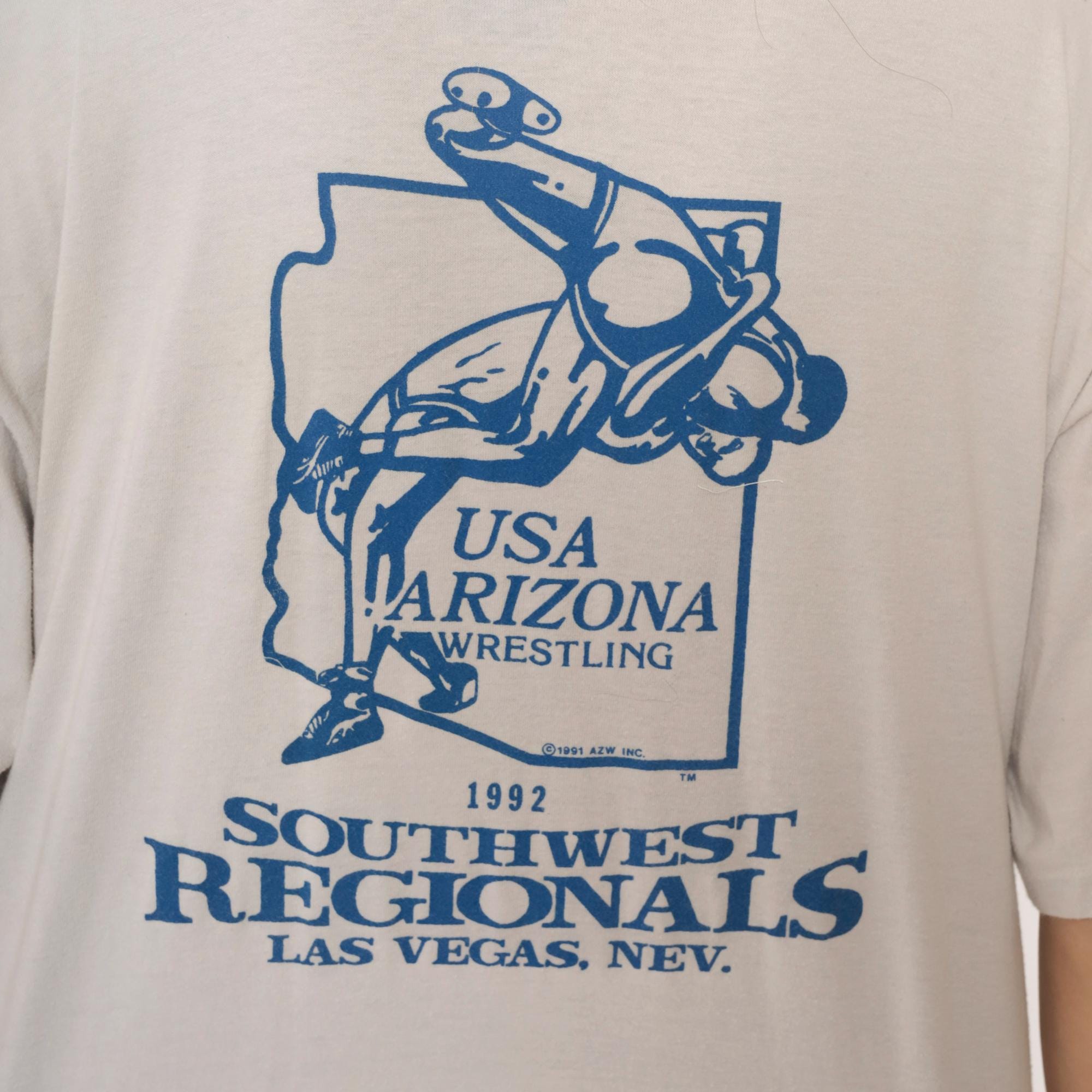90s white wrestling tournament t-shirt with "AzUSA Wrestling" graphic on front chest and large back graphic showing Arizona state outline with wrestlers, "1992 Southwest Regionals Las Vegas, Nev." Blue ink screenprint graphics.