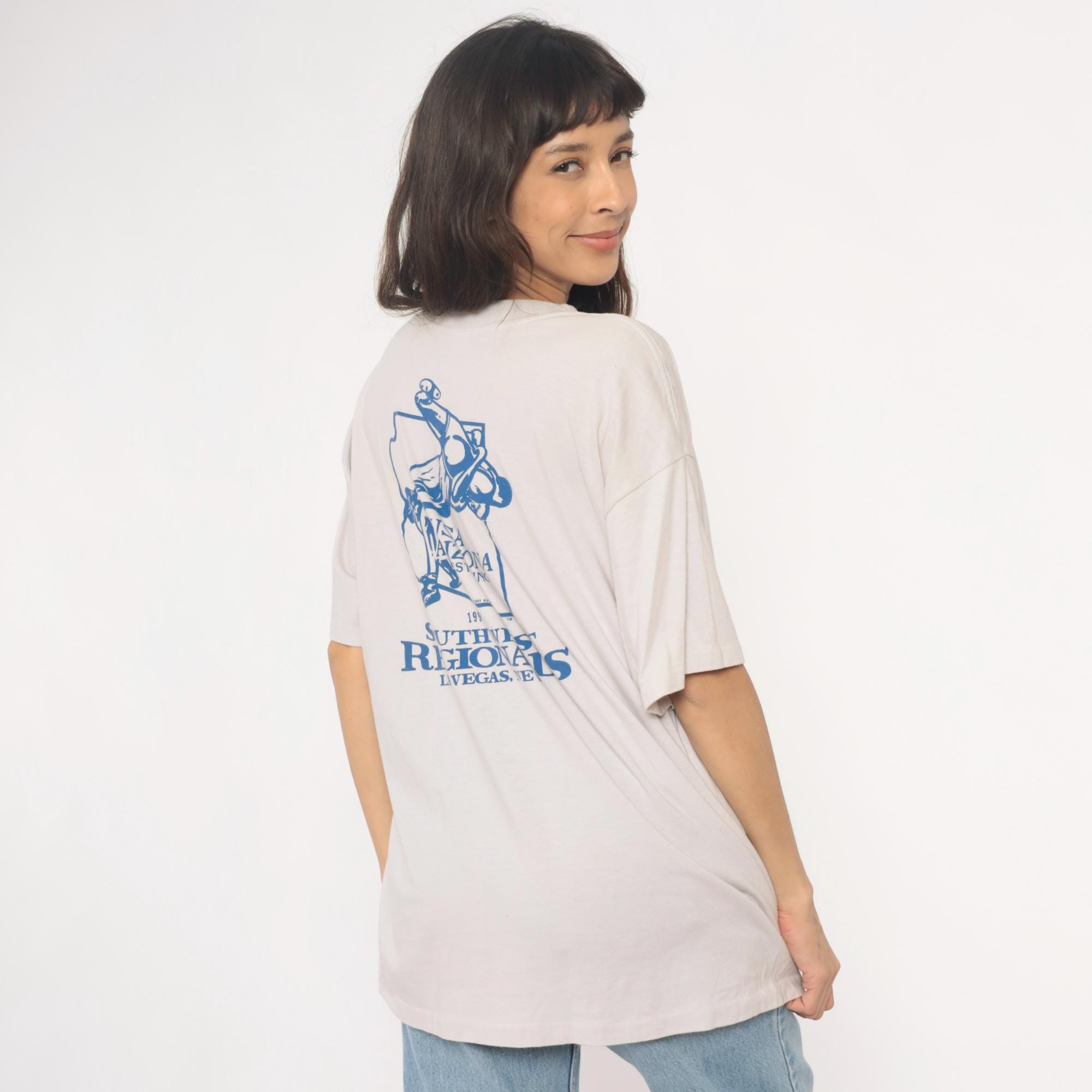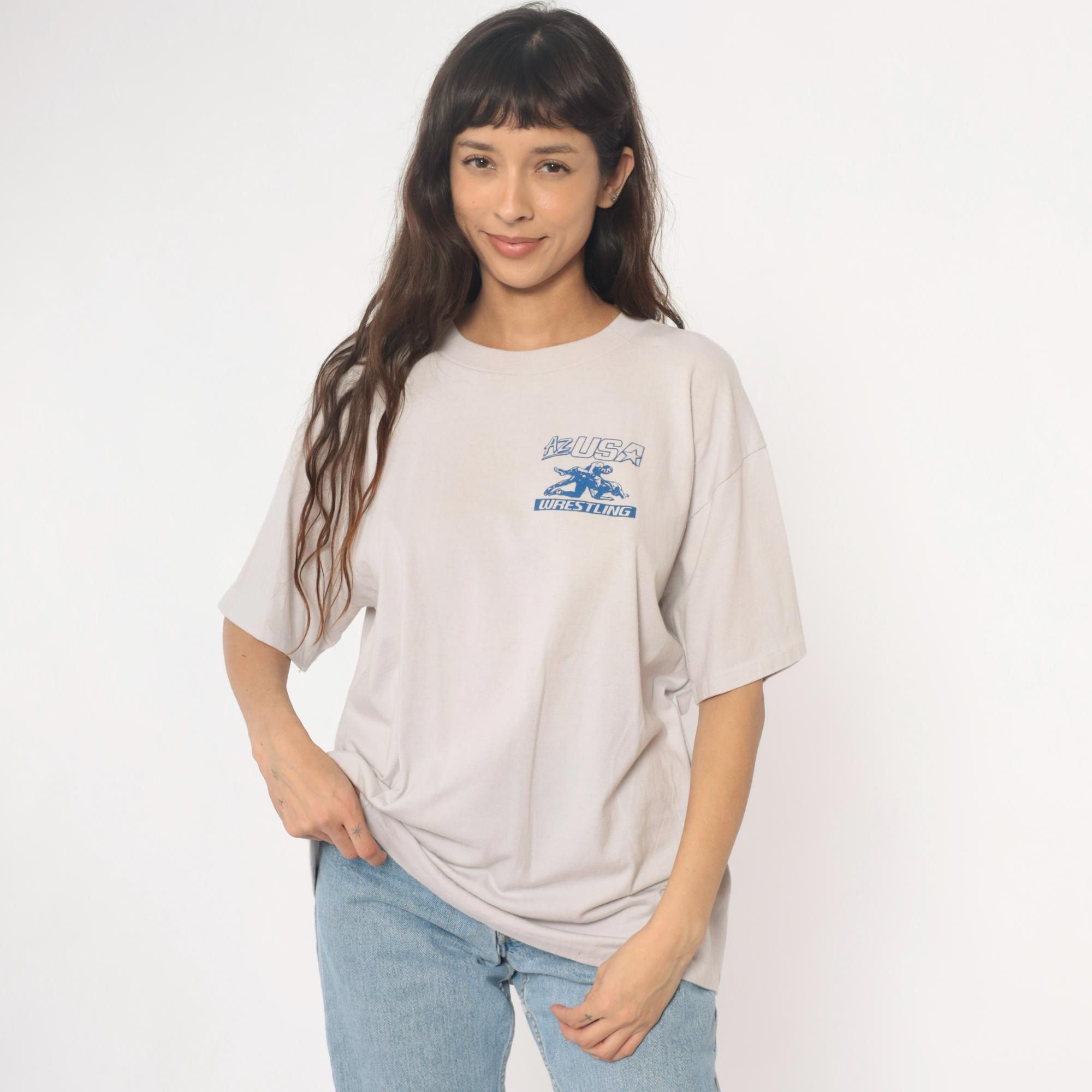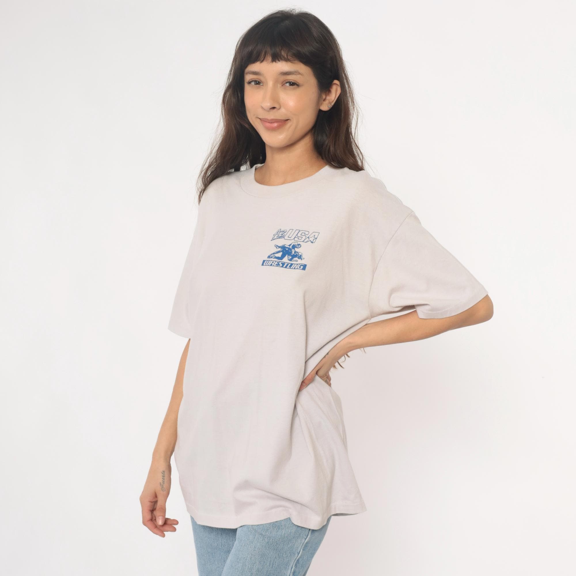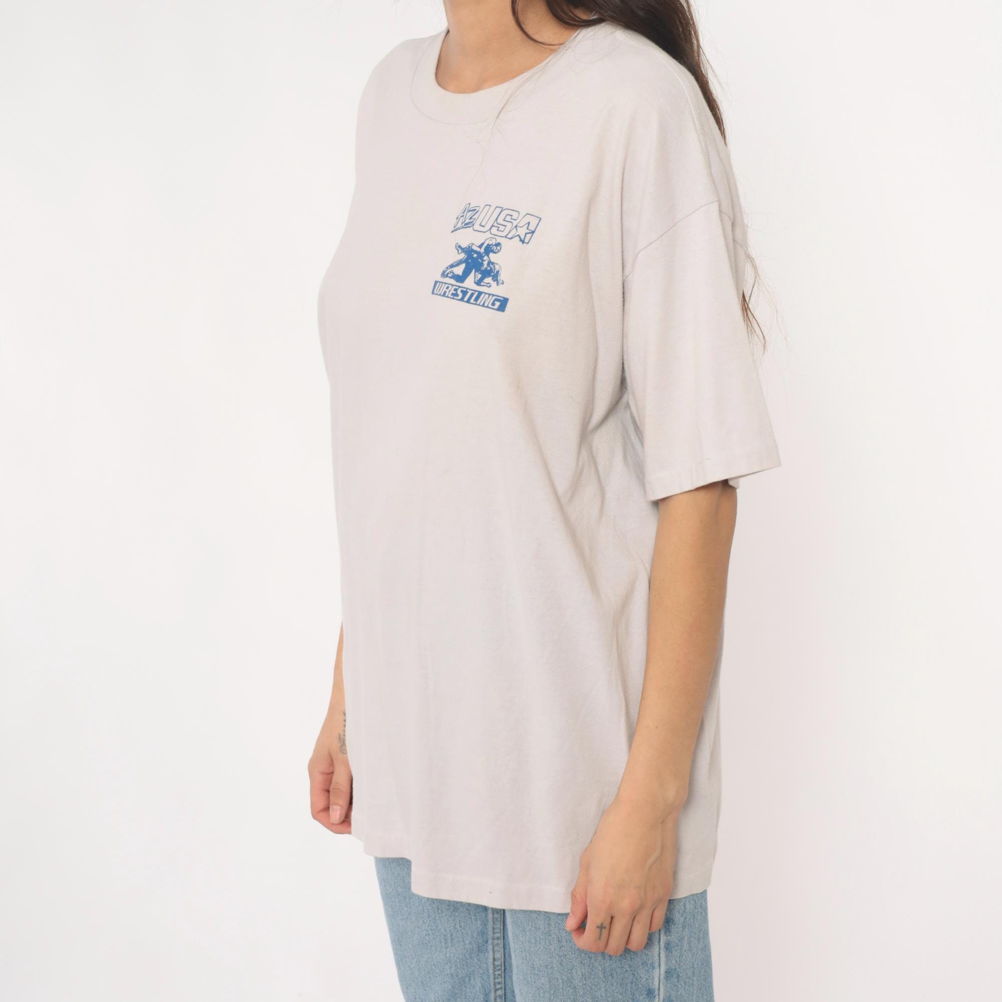 90s white wrestling tournament t-shirt with "AzUSA Wrestling" graphic on front chest and large back graphic showing Arizona state outline with wrestlers, "1992 Southwest Regionals Las Vegas, Nev." Blue ink screenprint graphics.