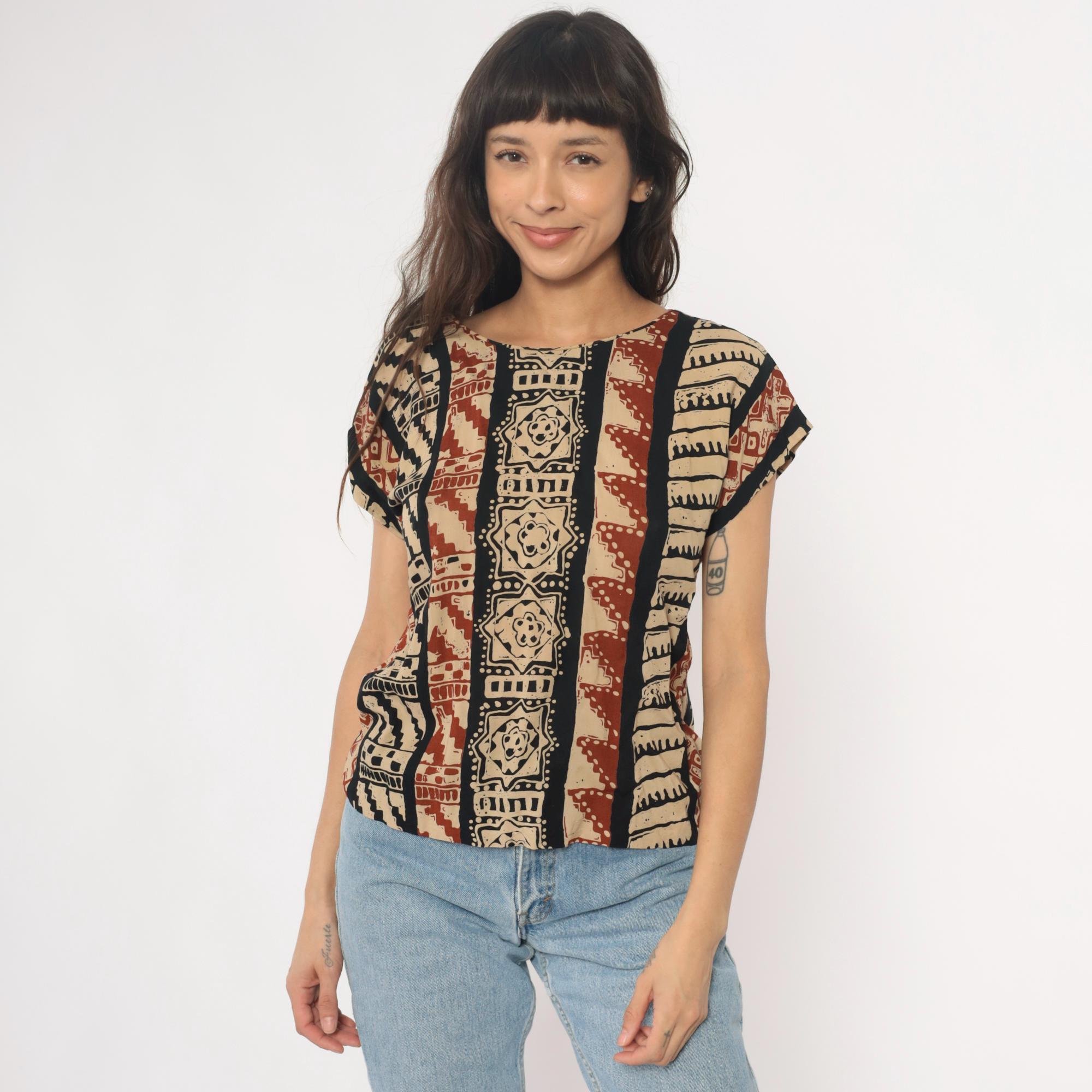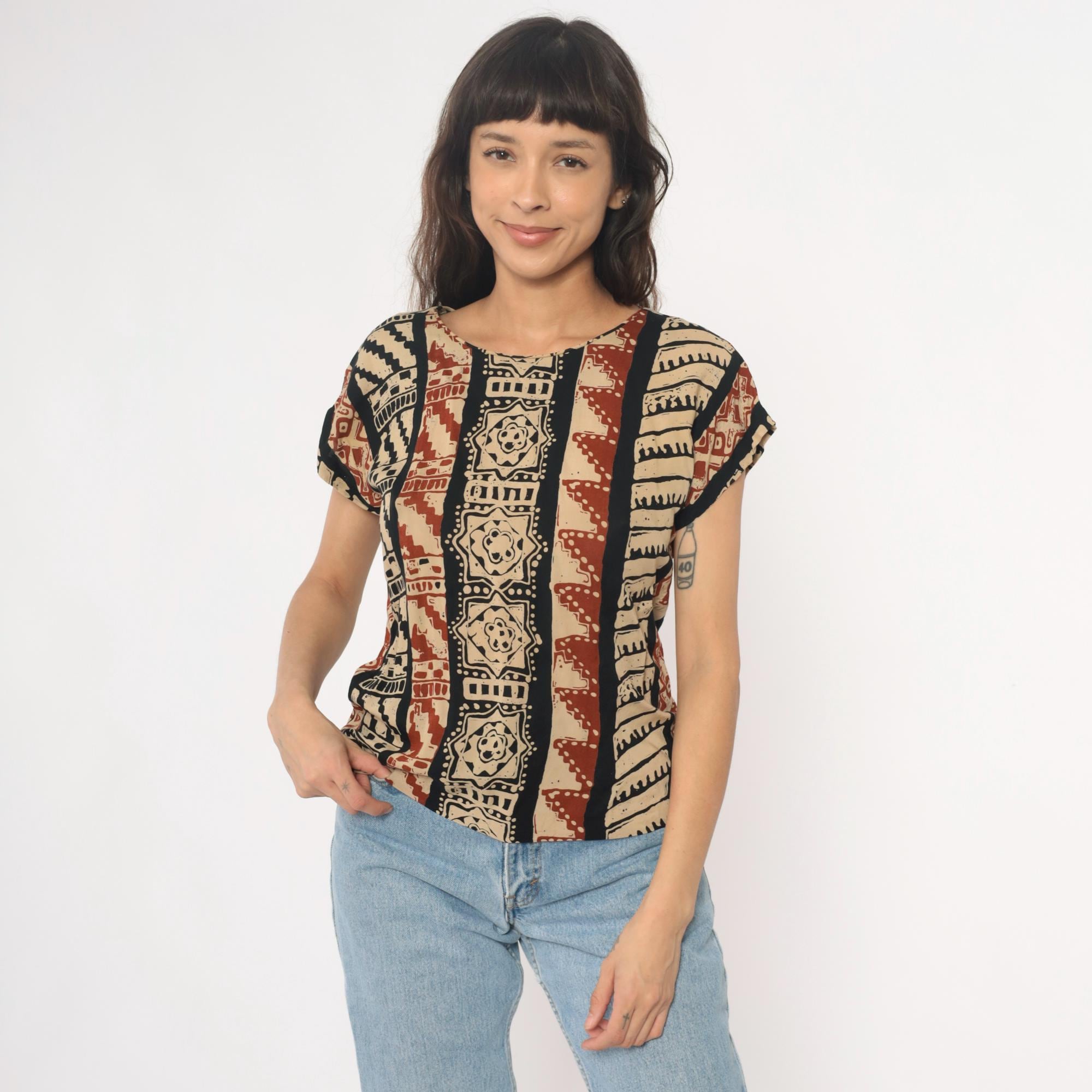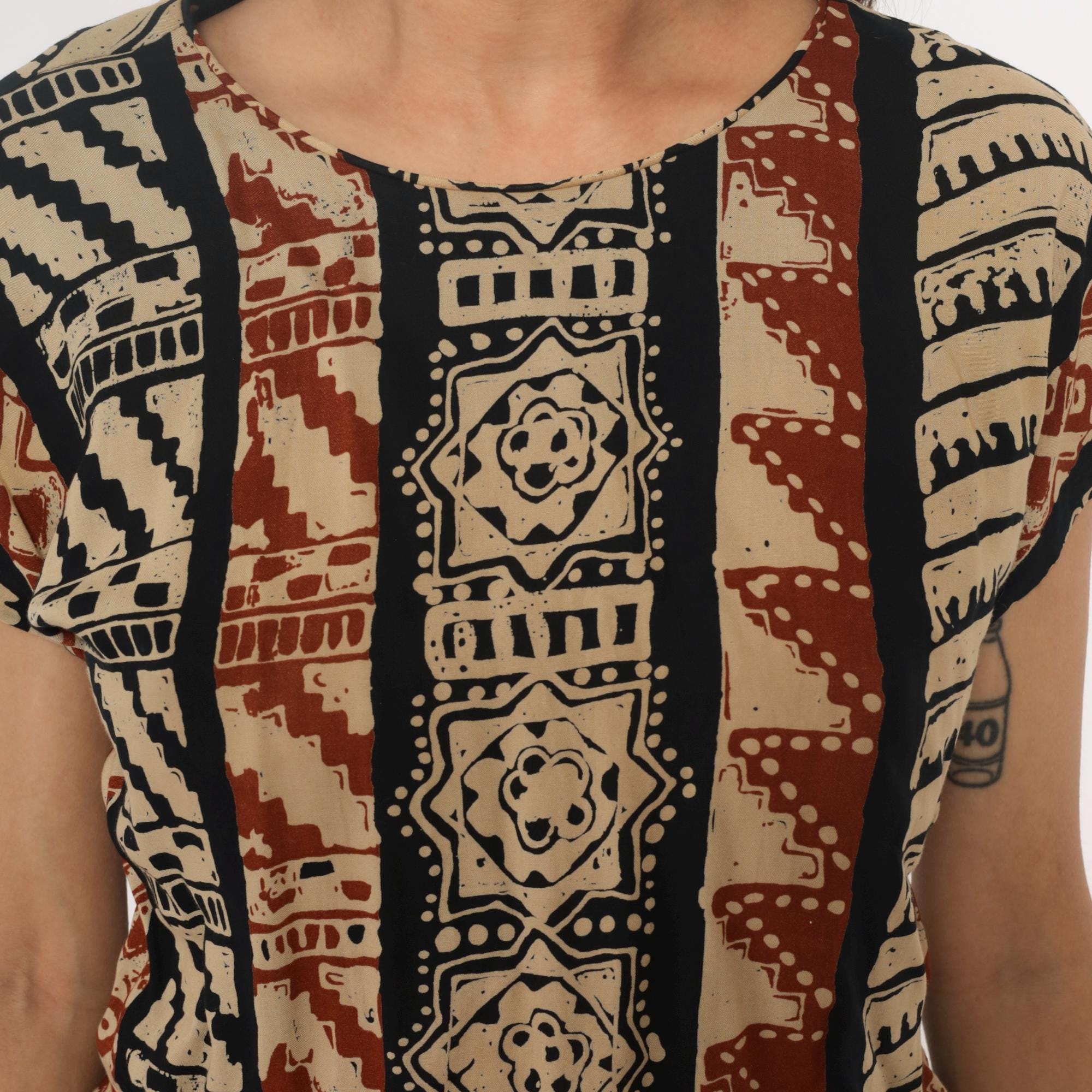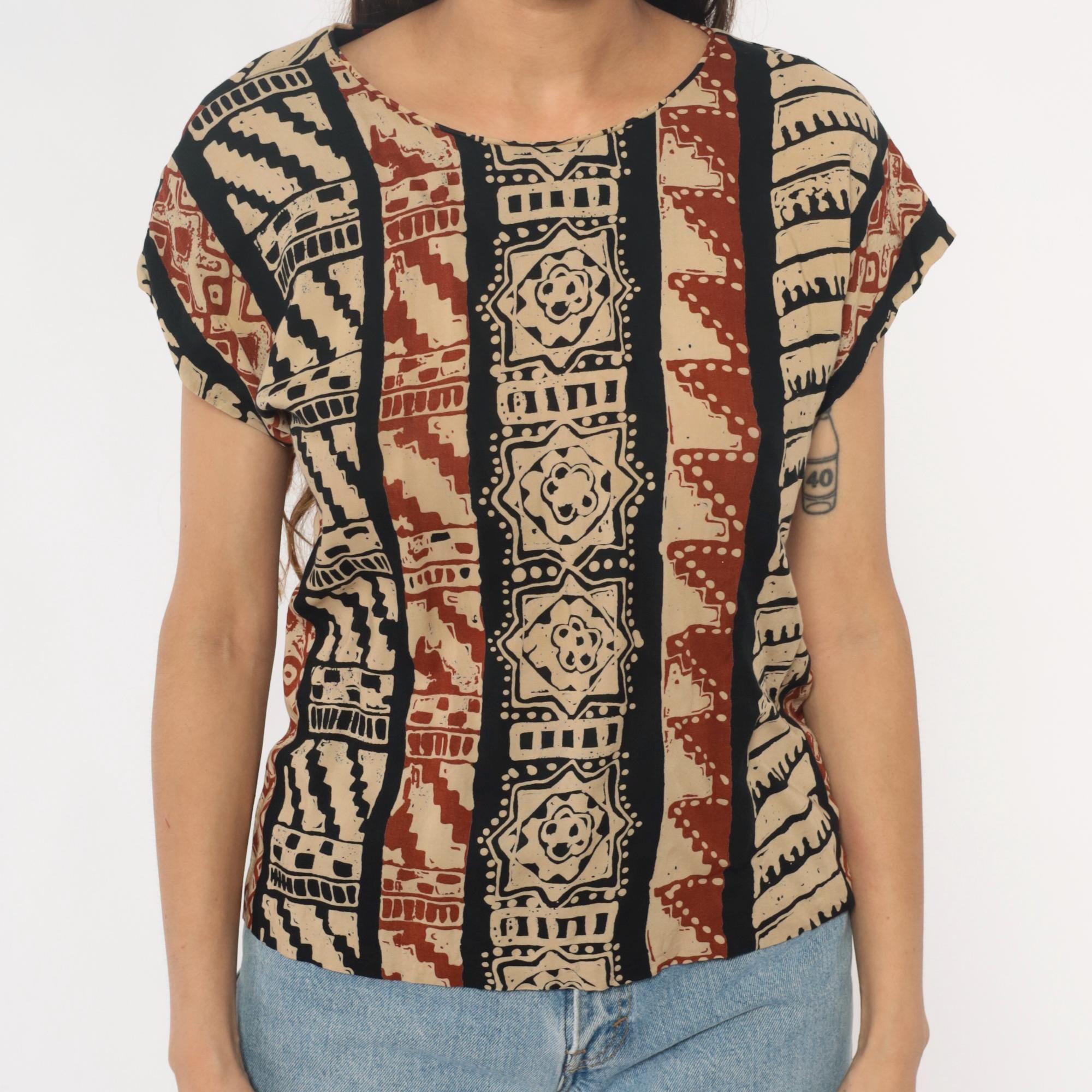 90s tribal print top from lia g petites with vertical striped pattern featuring geometric motifs, florals, and zigzag designs in beige, black, and rust red. Short sleeves with crew neckline and boxy silhouette.