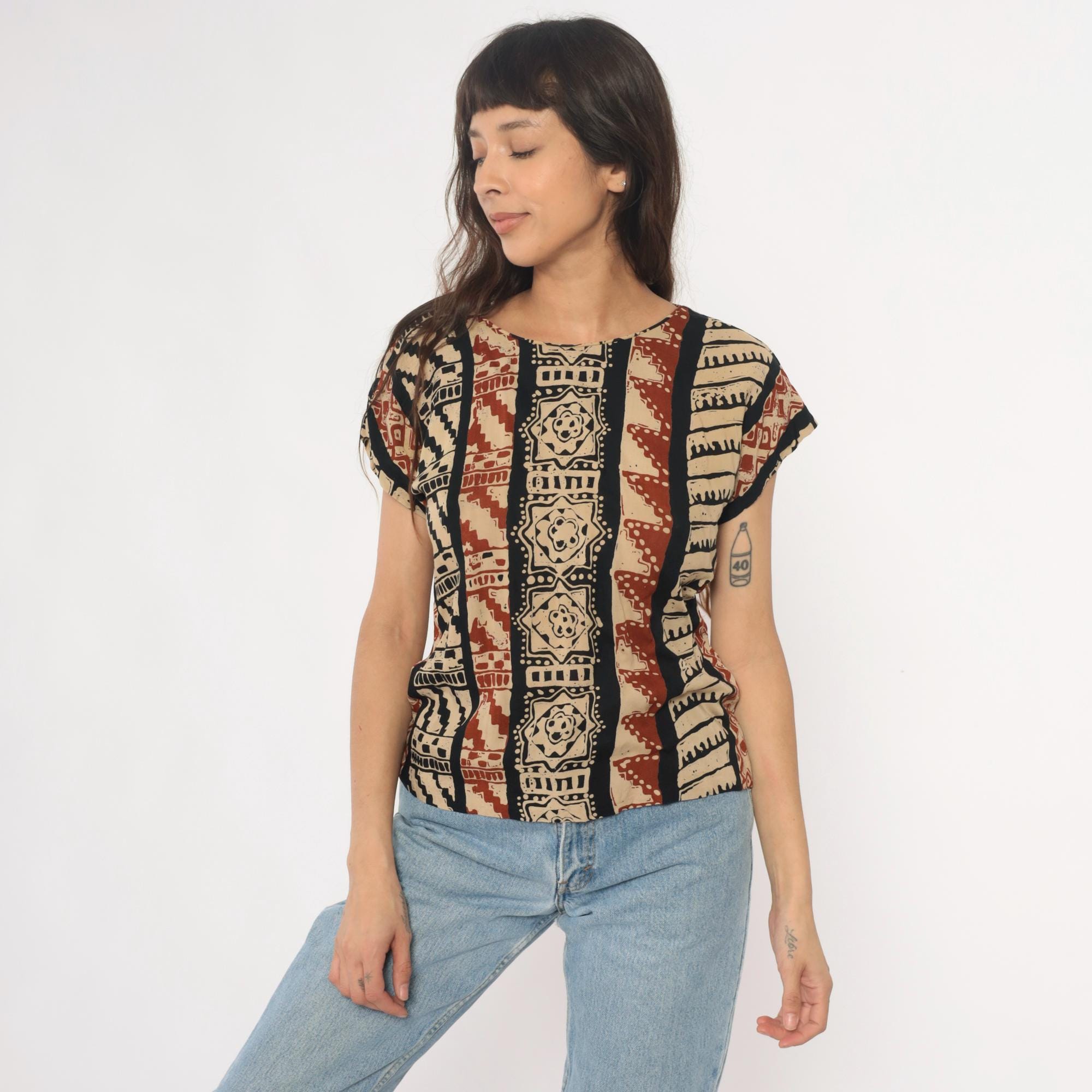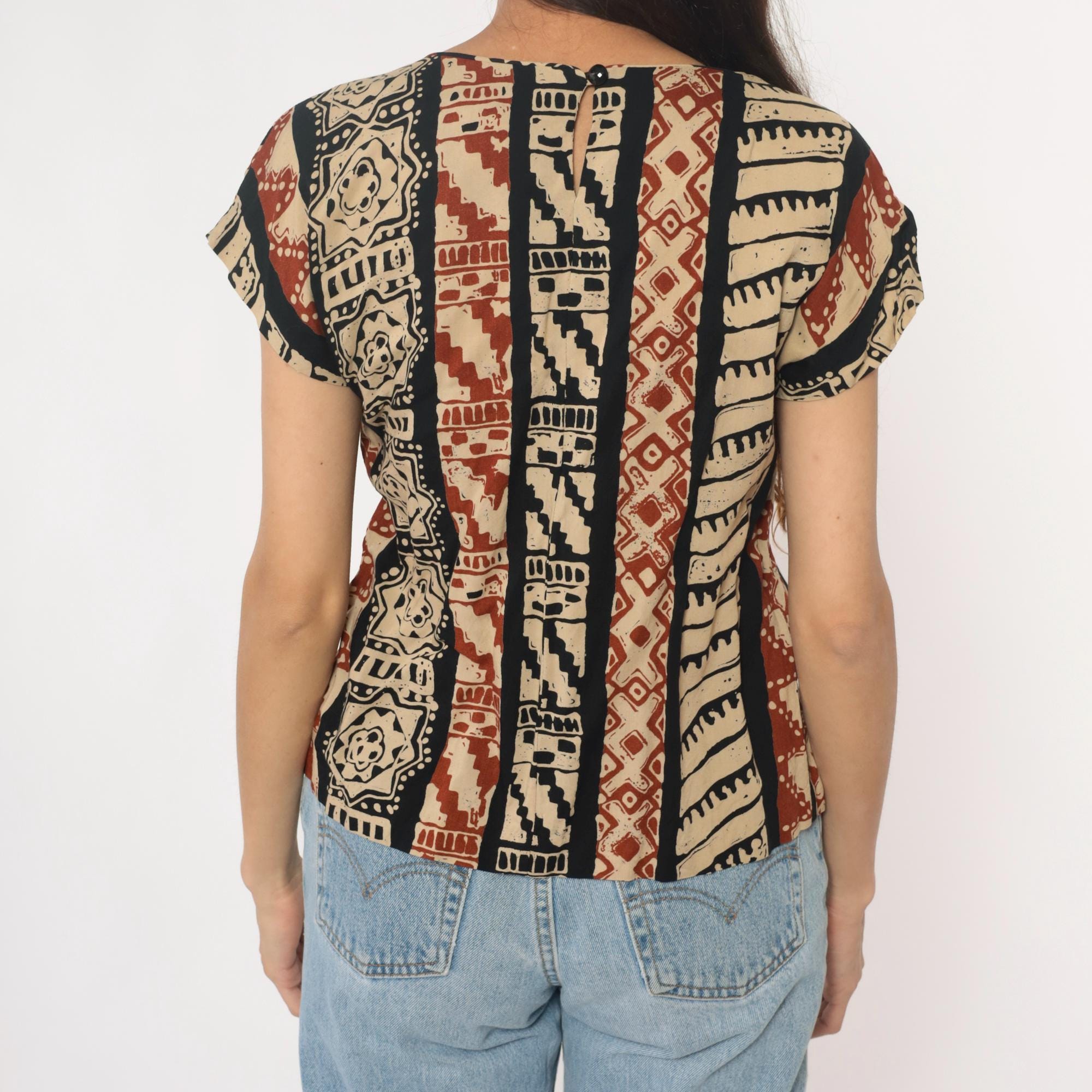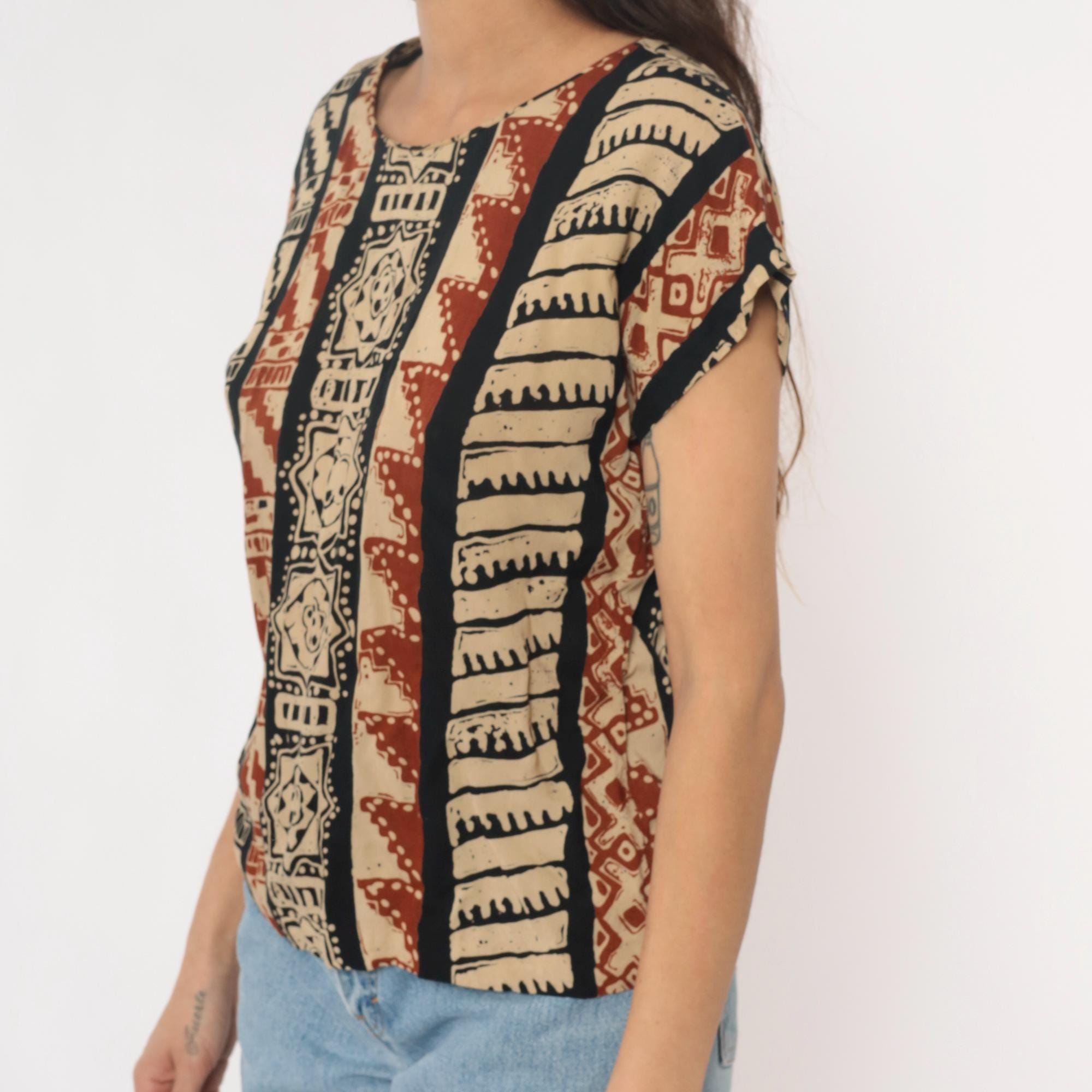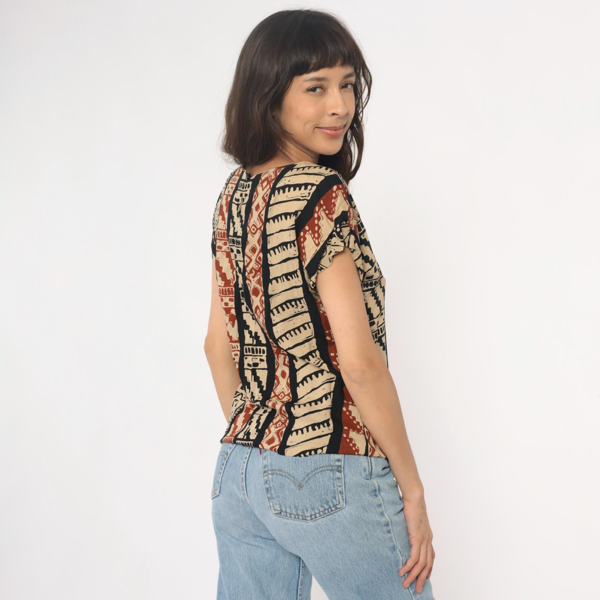 90s tribal print top from lia g petites with vertical striped pattern featuring geometric motifs, florals, and zigzag designs in beige, black, and rust red. Short sleeves with crew neckline and boxy silhouette.