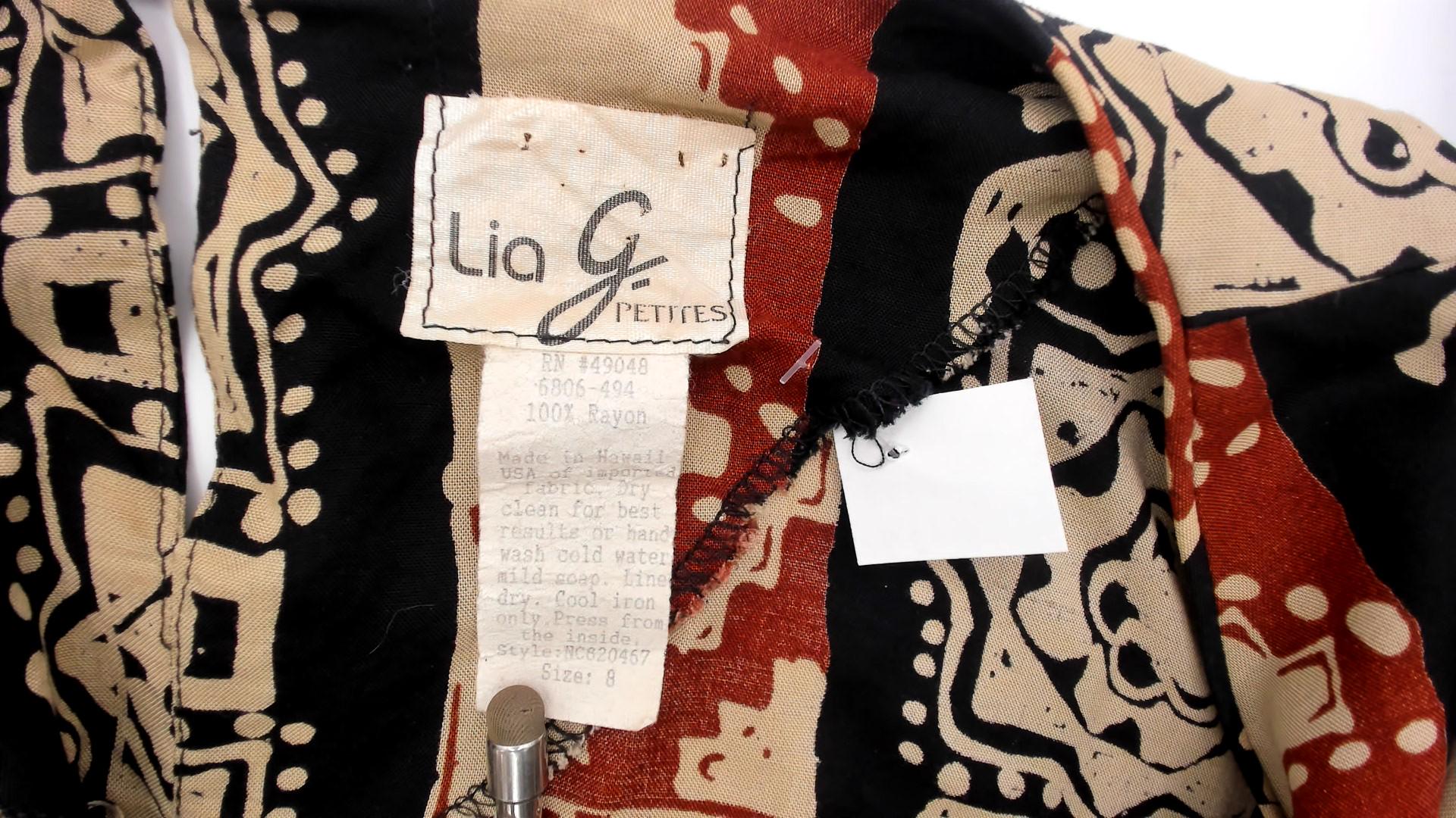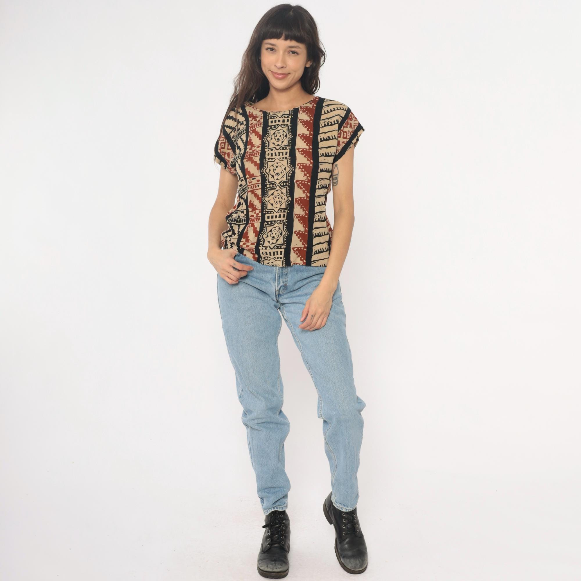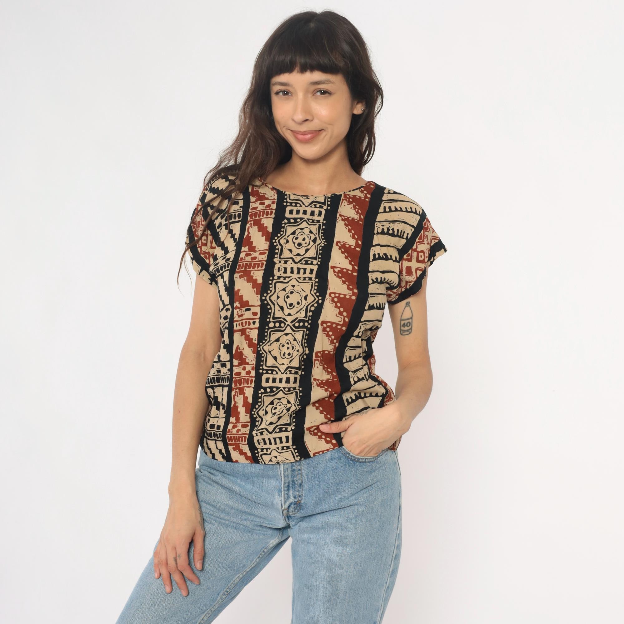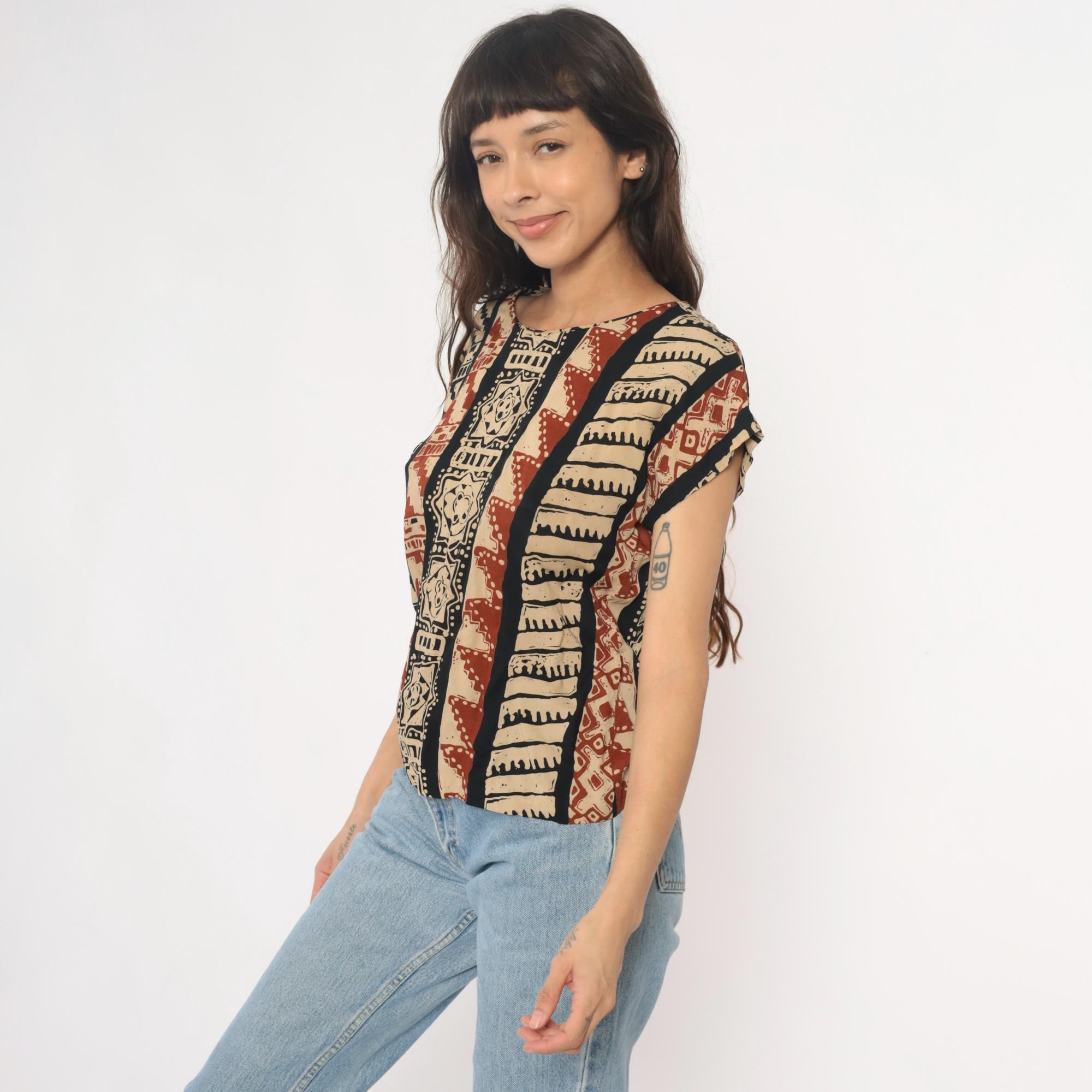 90s tribal print top from lia g petites with vertical striped pattern featuring geometric motifs, florals, and zigzag designs in beige, black, and rust red. Short sleeves with crew neckline and boxy silhouette.