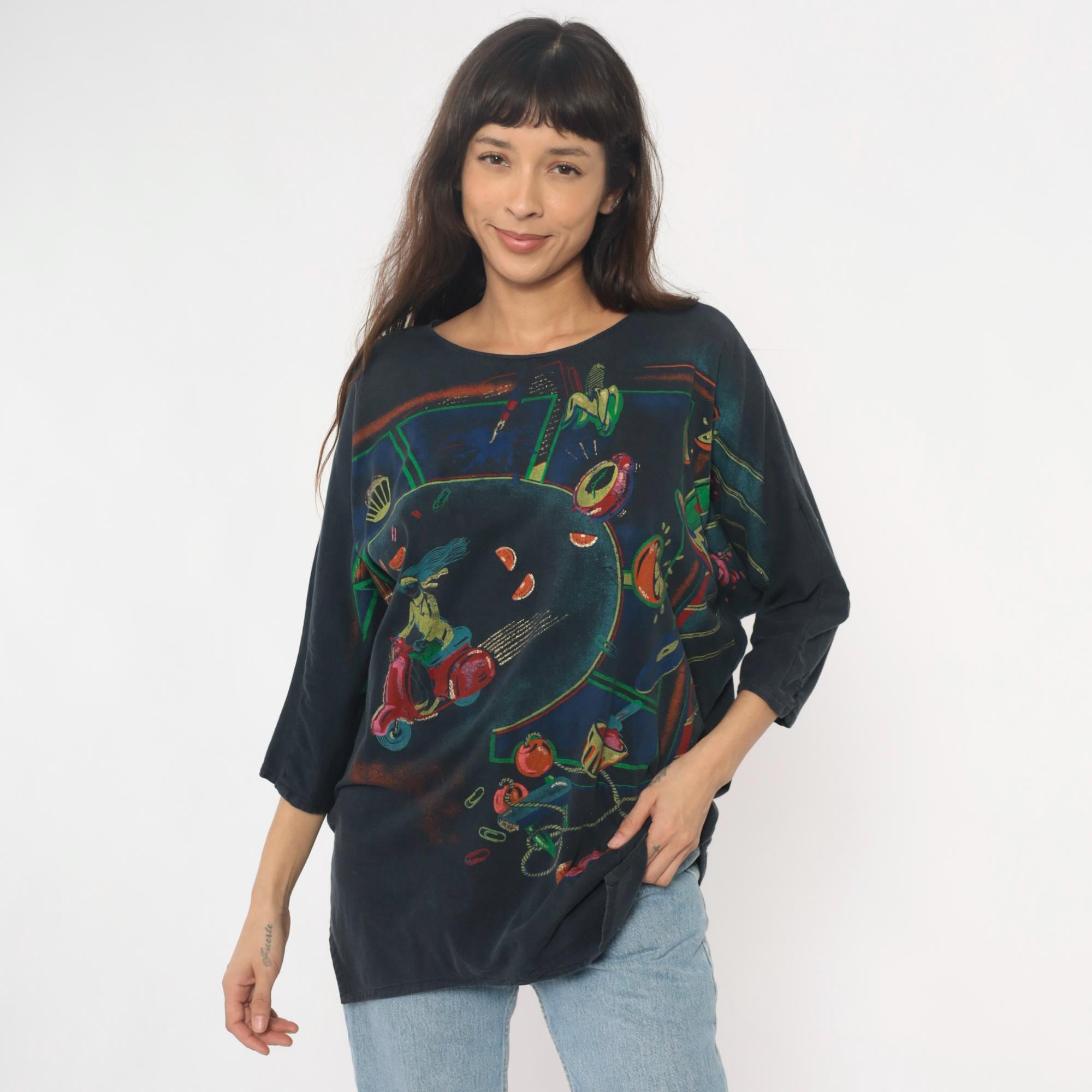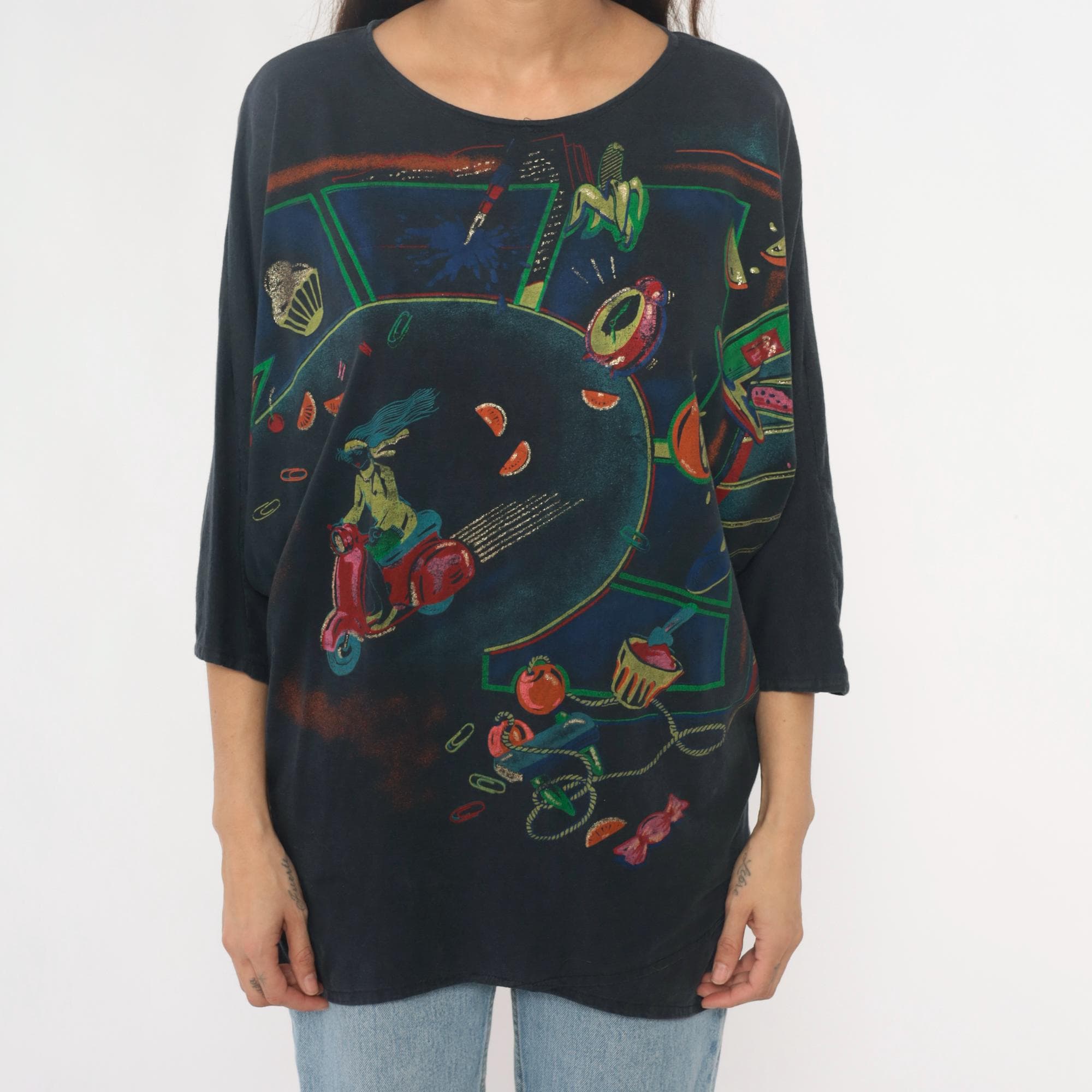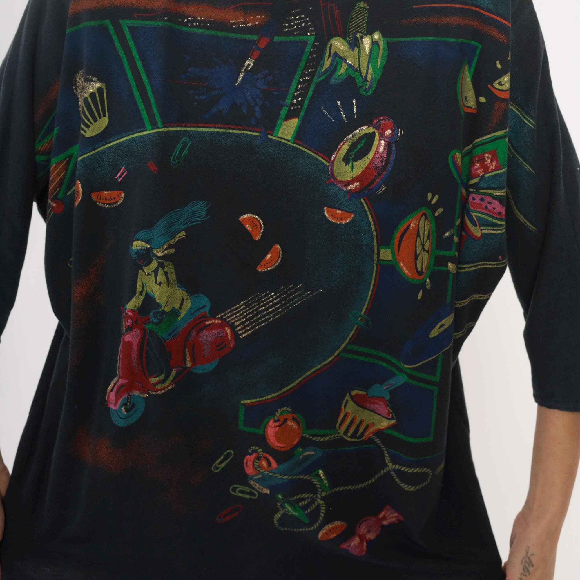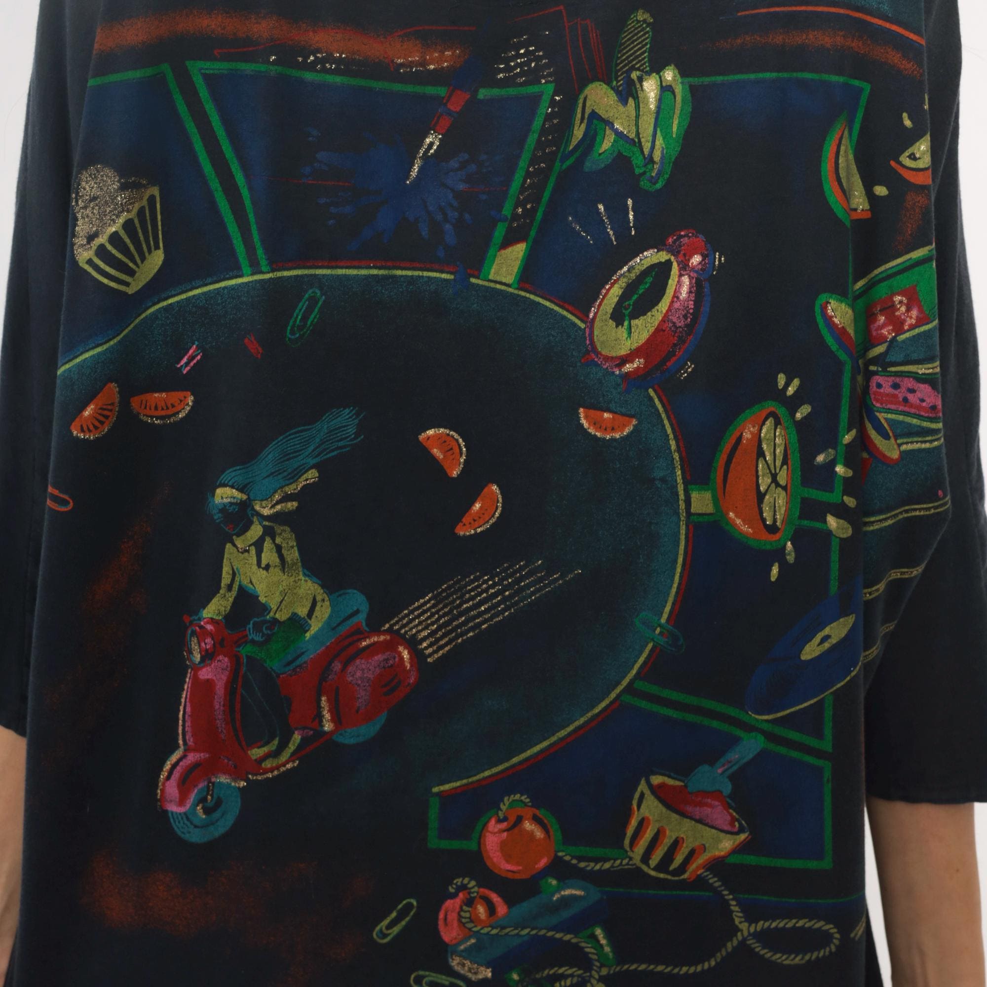 80s black top from dt company with colorful graphic print across the front featuring a woman on a scooter, geometric shapes, and abstract design elements in red, blue, green, yellow, pink, and orange. Three-quarter sleeves with rounded neckline and asymmetrical hem with center back point.