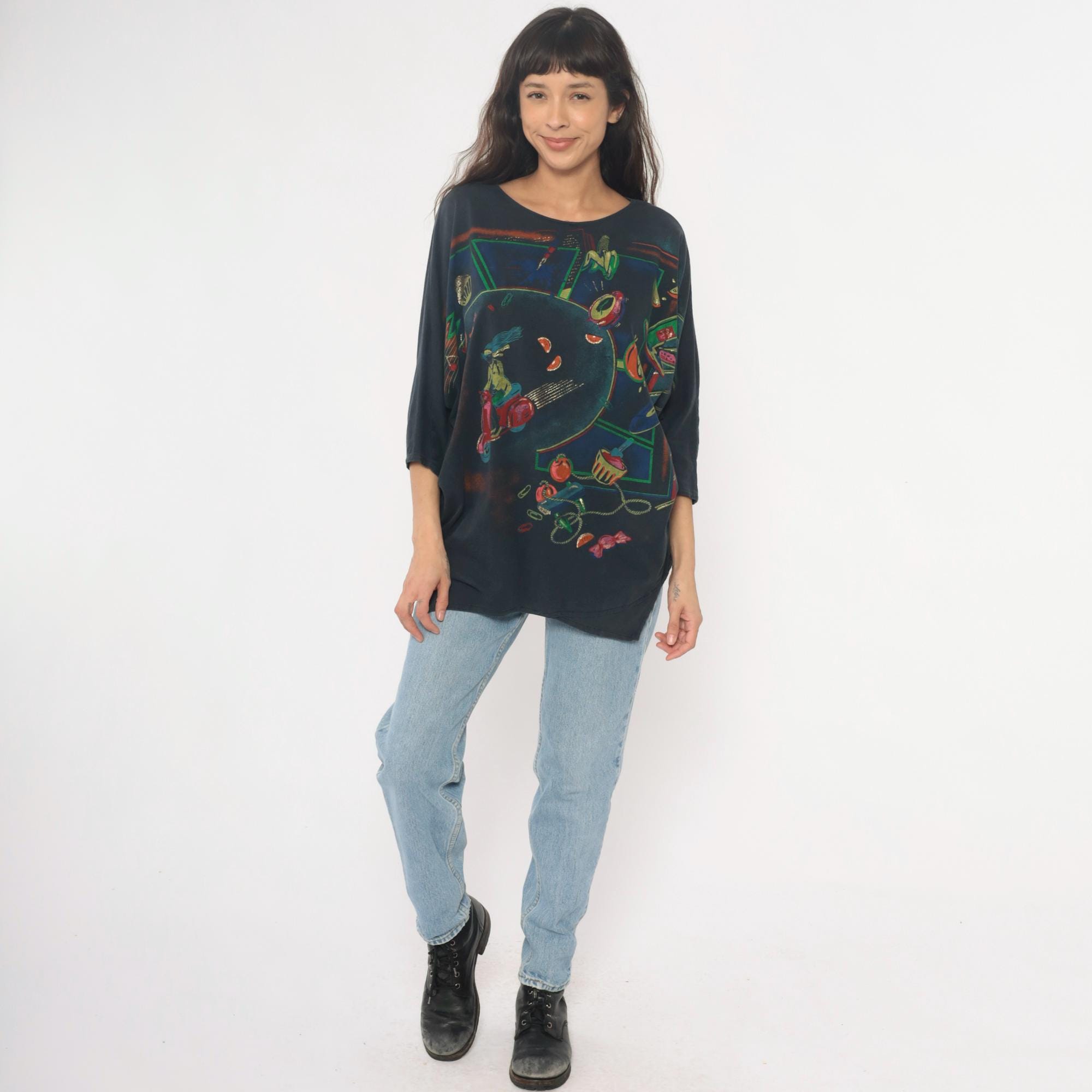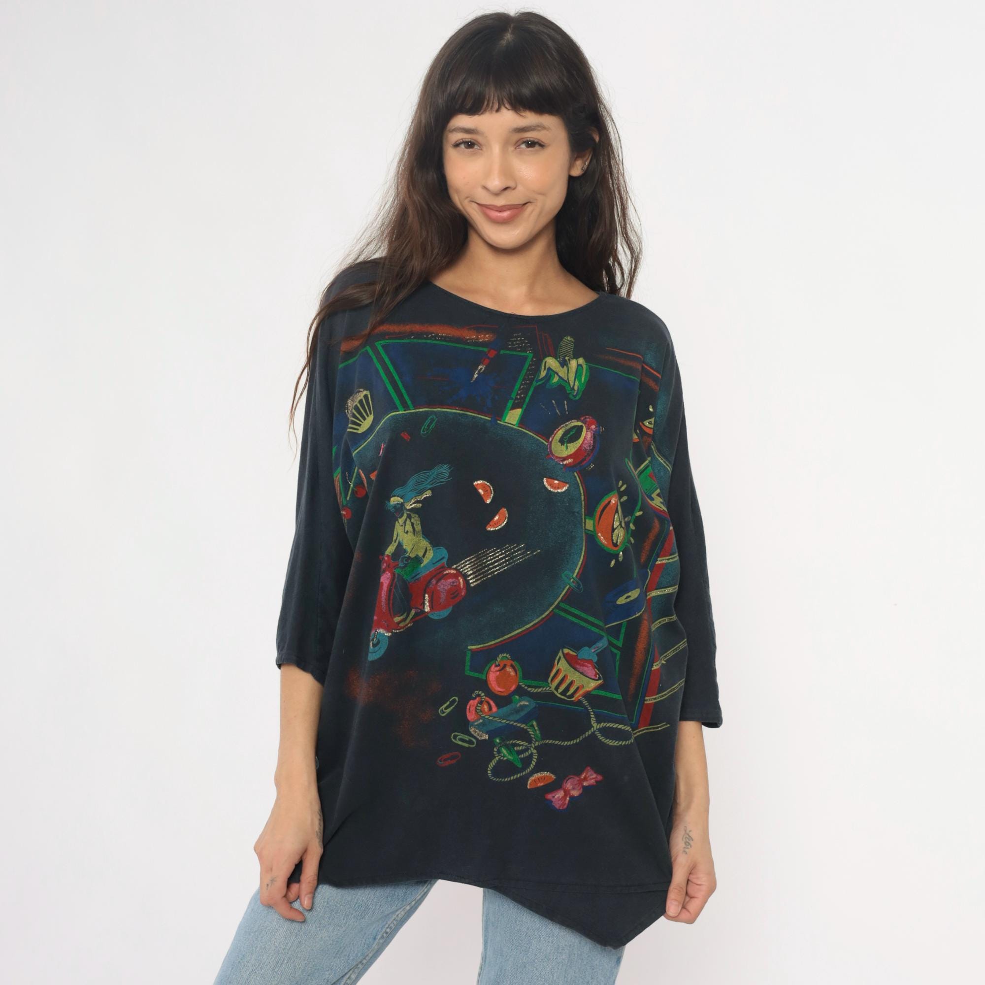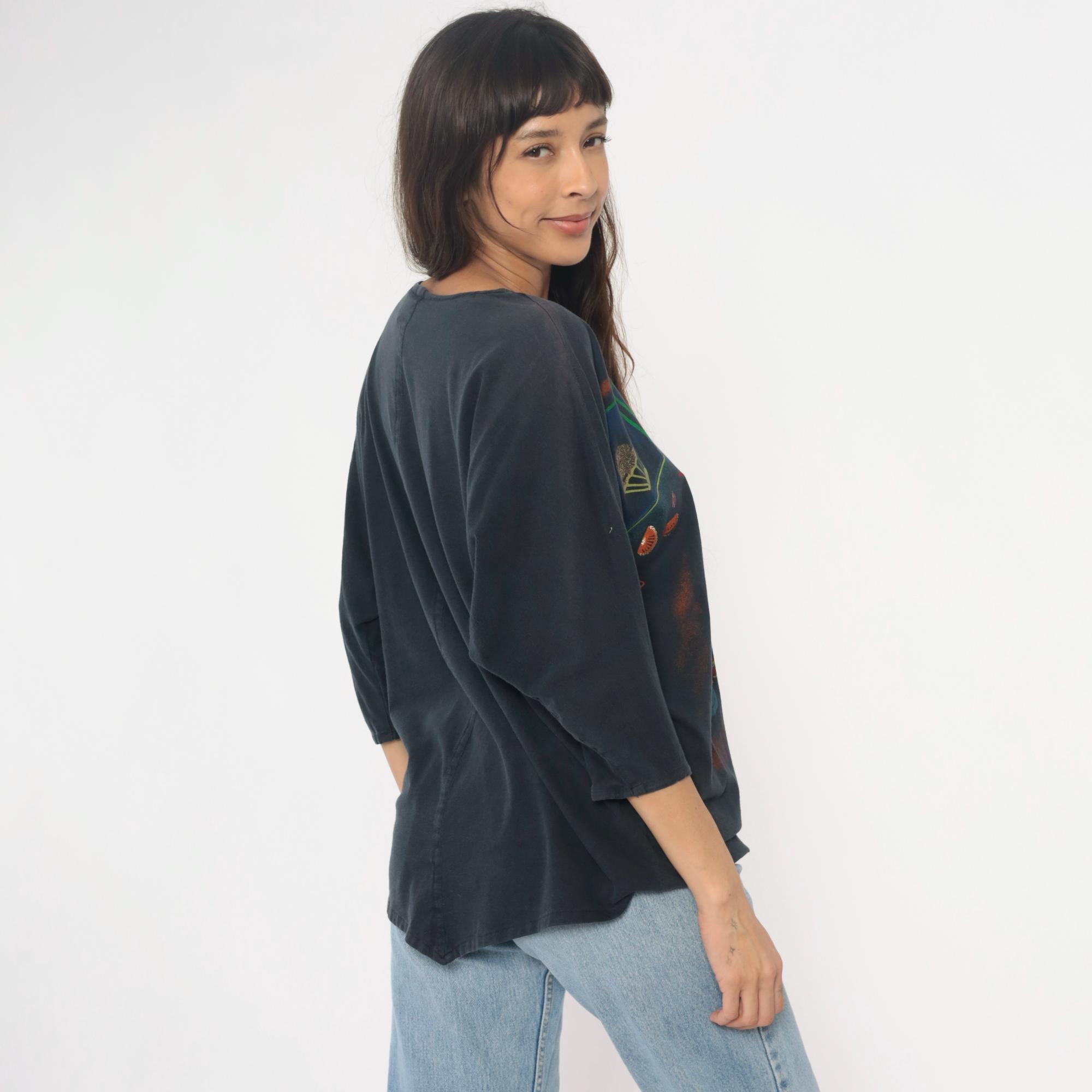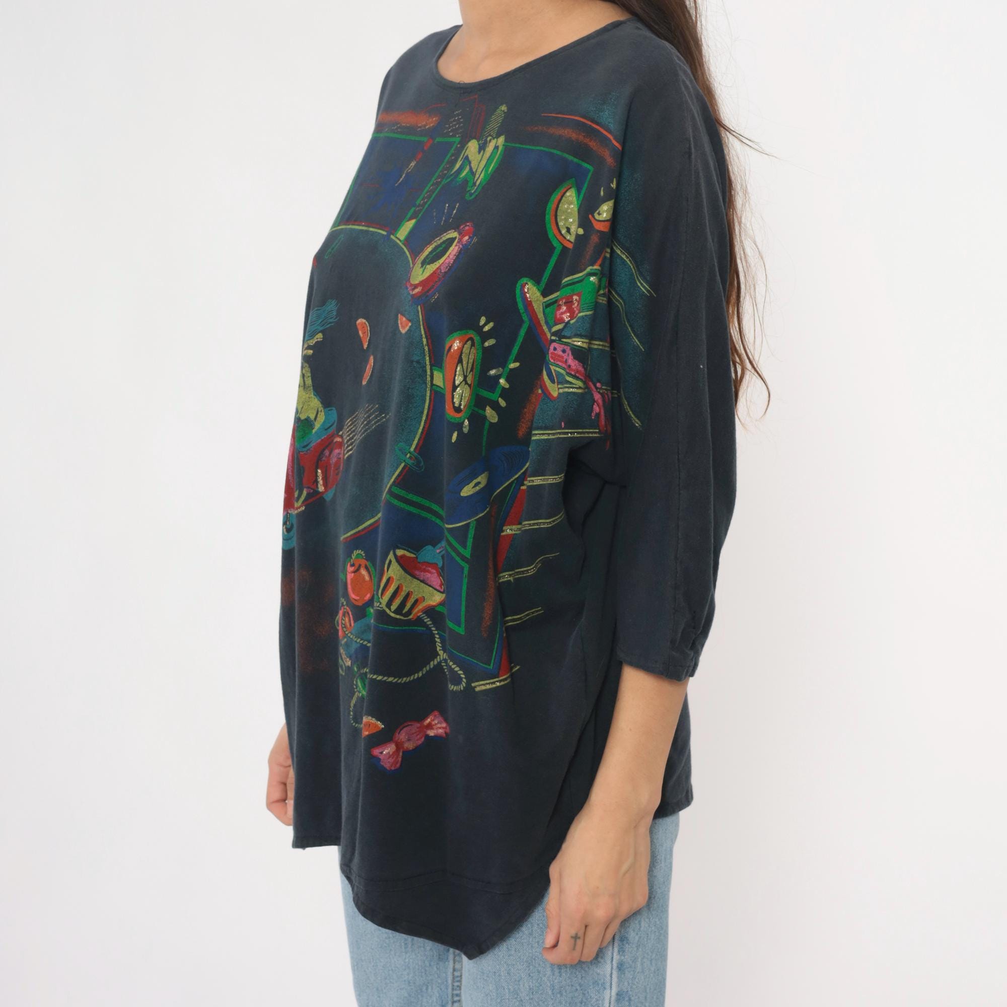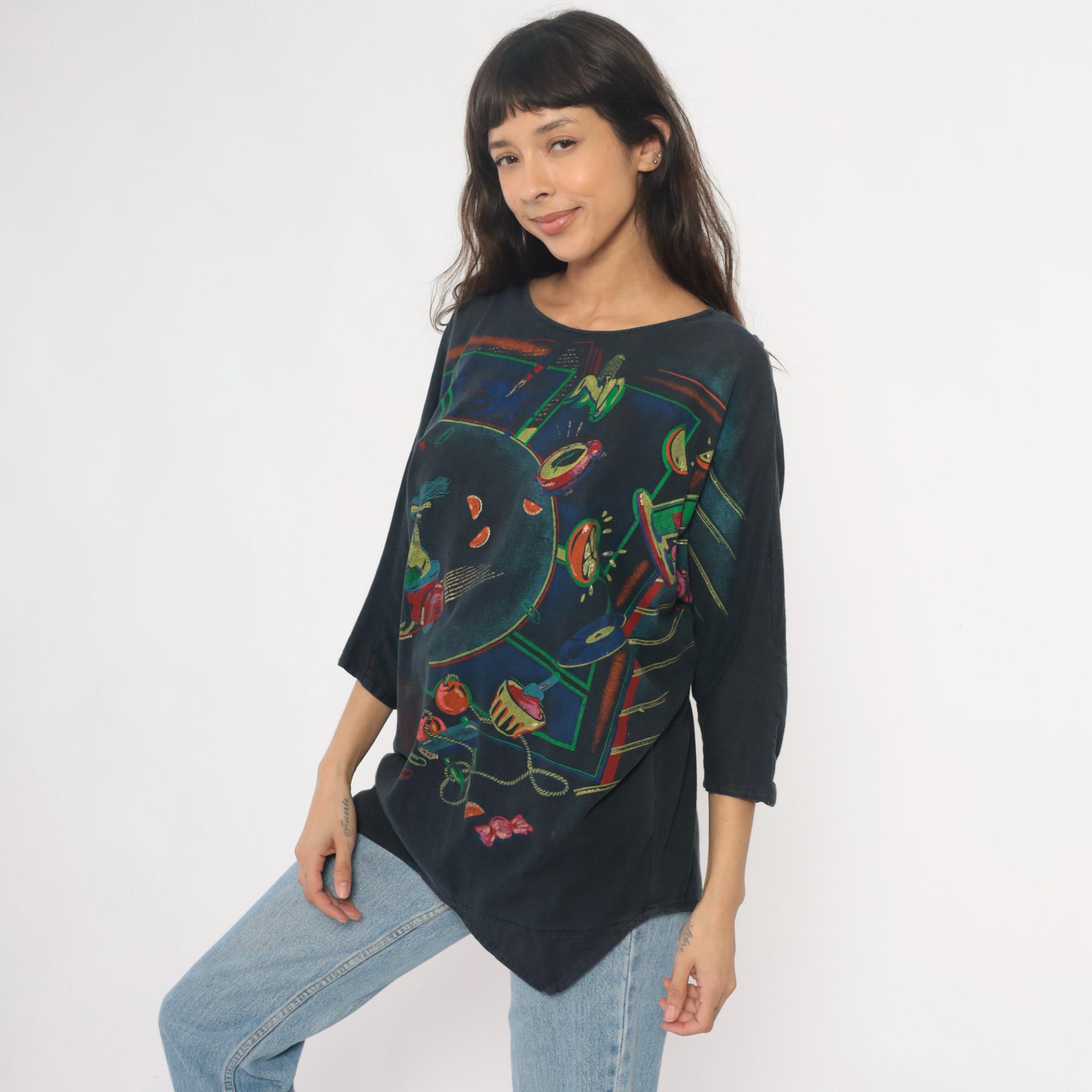 80s black top from dt company with colorful graphic print across the front featuring a woman on a scooter, geometric shapes, and abstract design elements in red, blue, green, yellow, pink, and orange. Three-quarter sleeves with rounded neckline and asymmetrical hem with center back point.