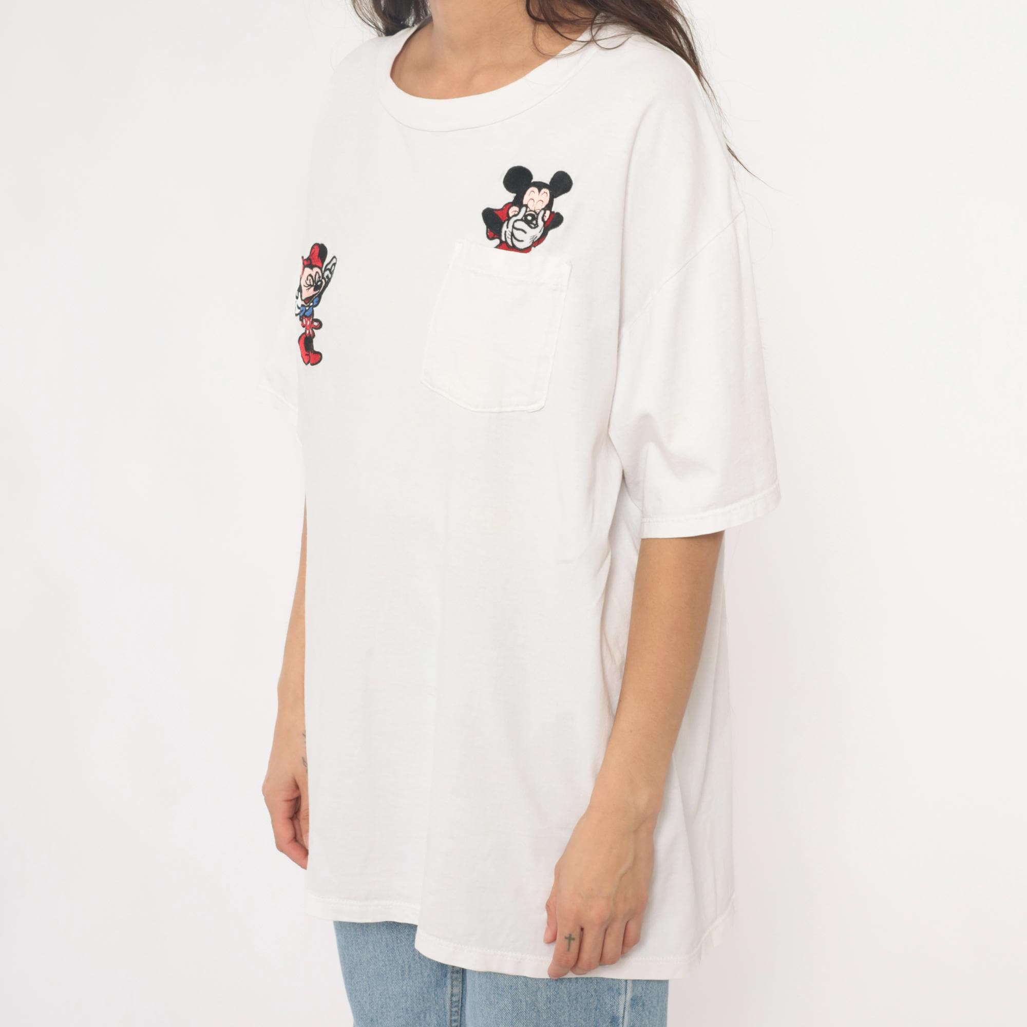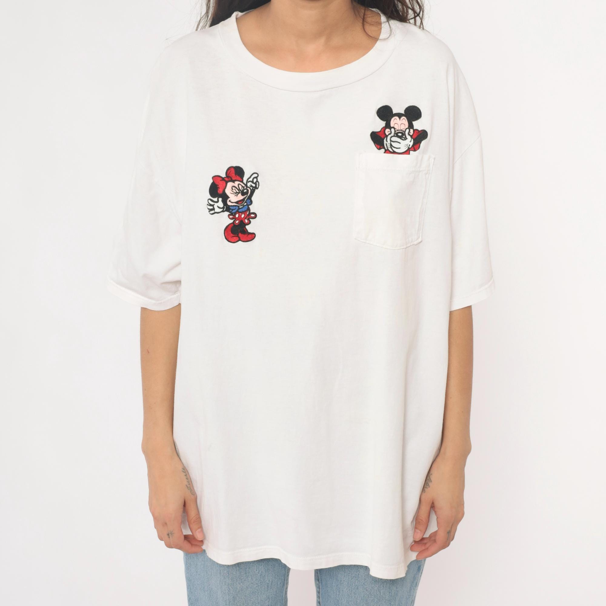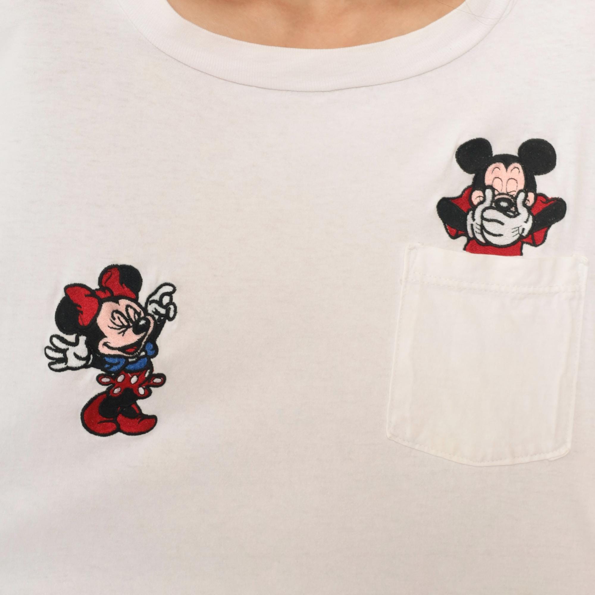 90s white cotton t-shirt from mickey inc with embroidered Mickey and Minnie Mouse appliques. Minnie Mouse patch on left chest, Mickey Mouse patch peeking from chest pocket on right. Crew neckline, short sleeves, relaxed fit.