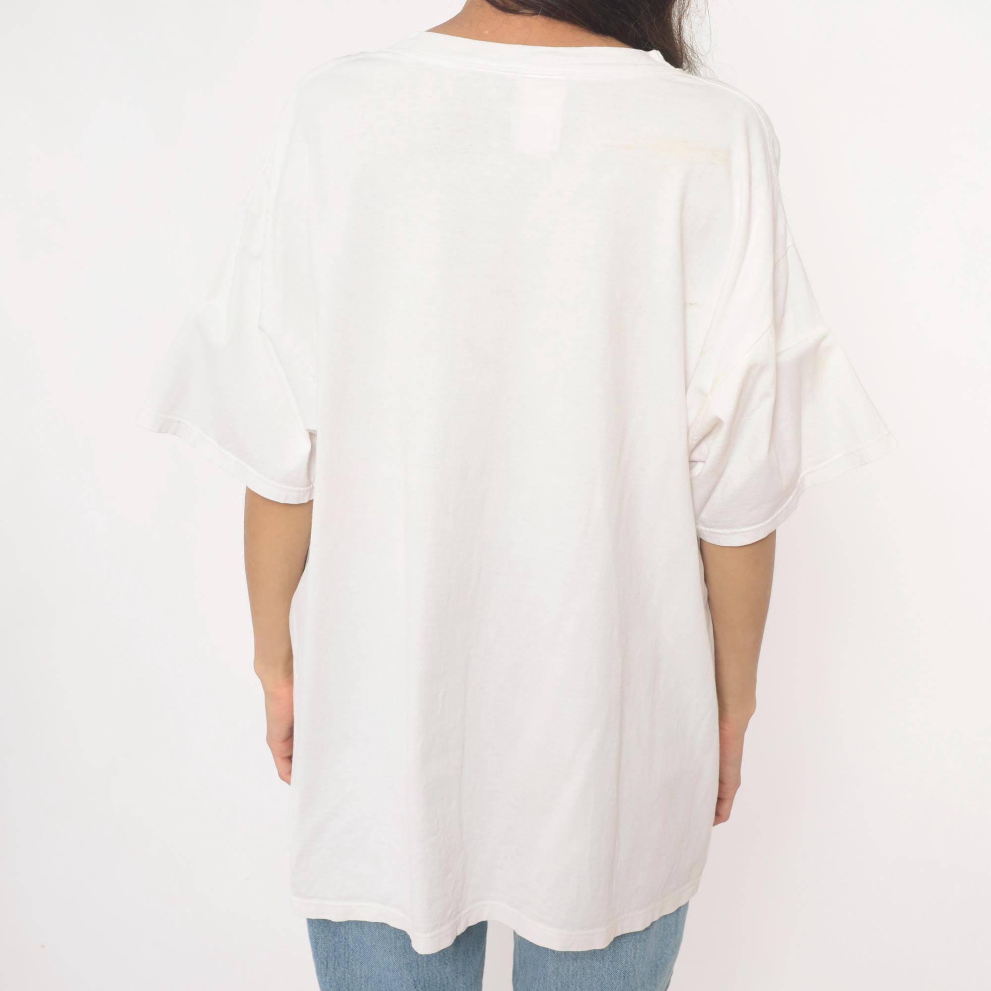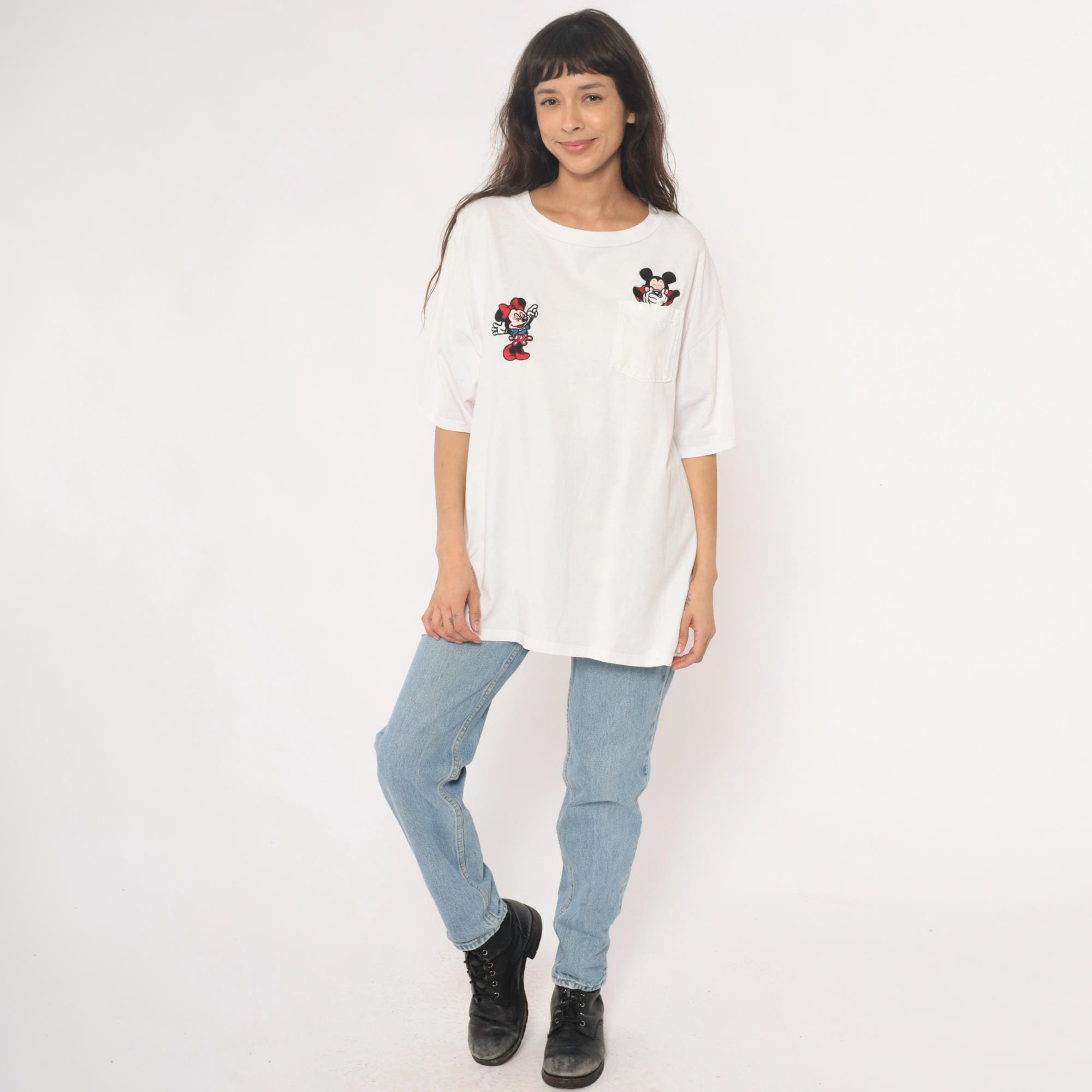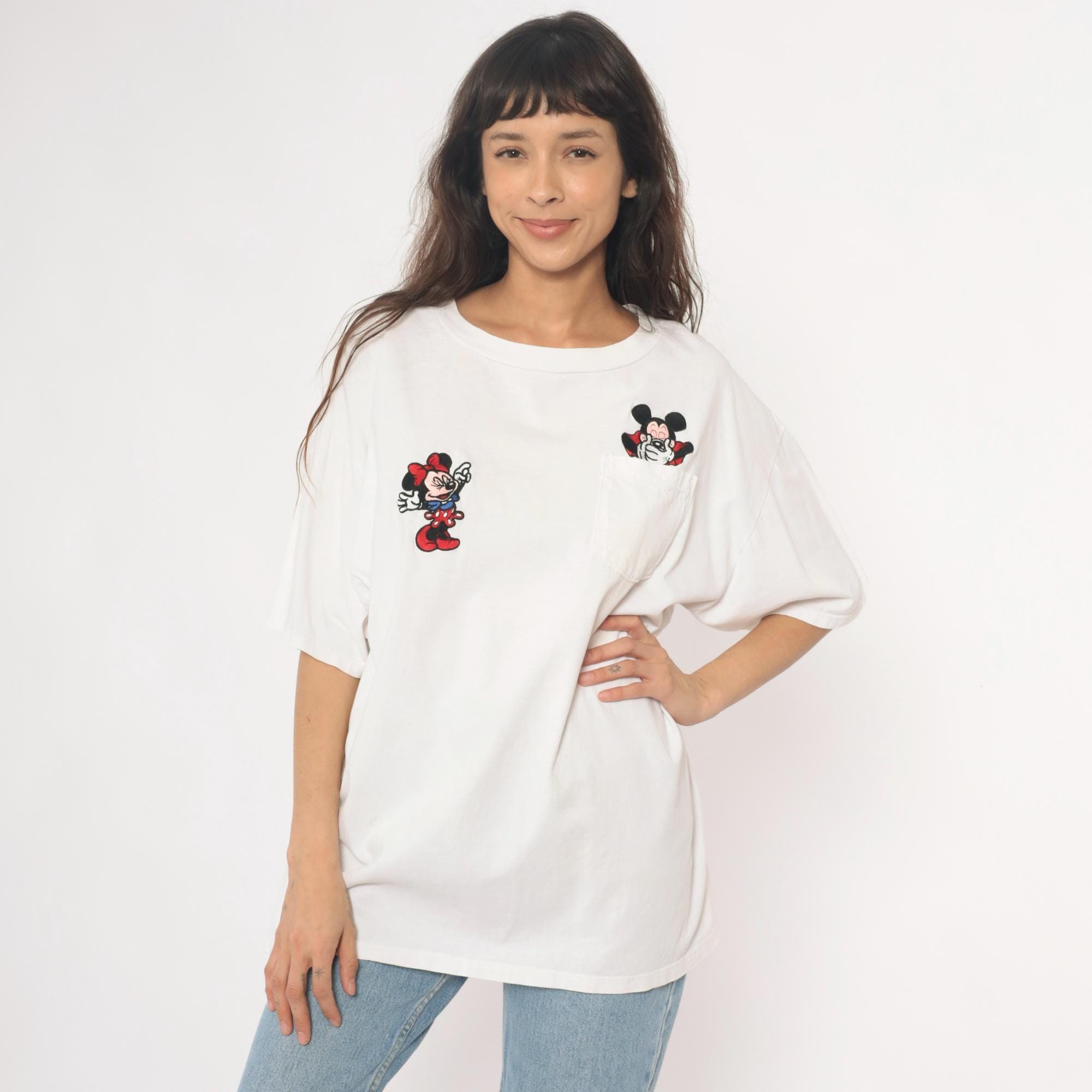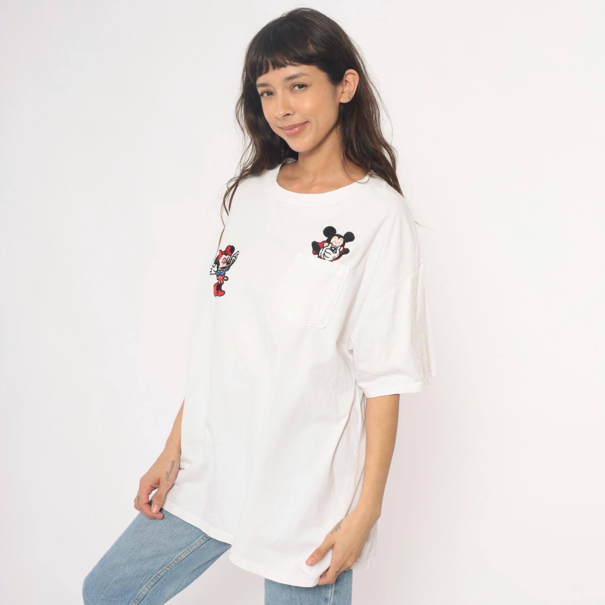 90s white cotton t-shirt from mickey inc with embroidered Mickey and Minnie Mouse appliques. Minnie Mouse patch on left chest, Mickey Mouse patch peeking from chest pocket on right. Crew neckline, short sleeves, relaxed fit.