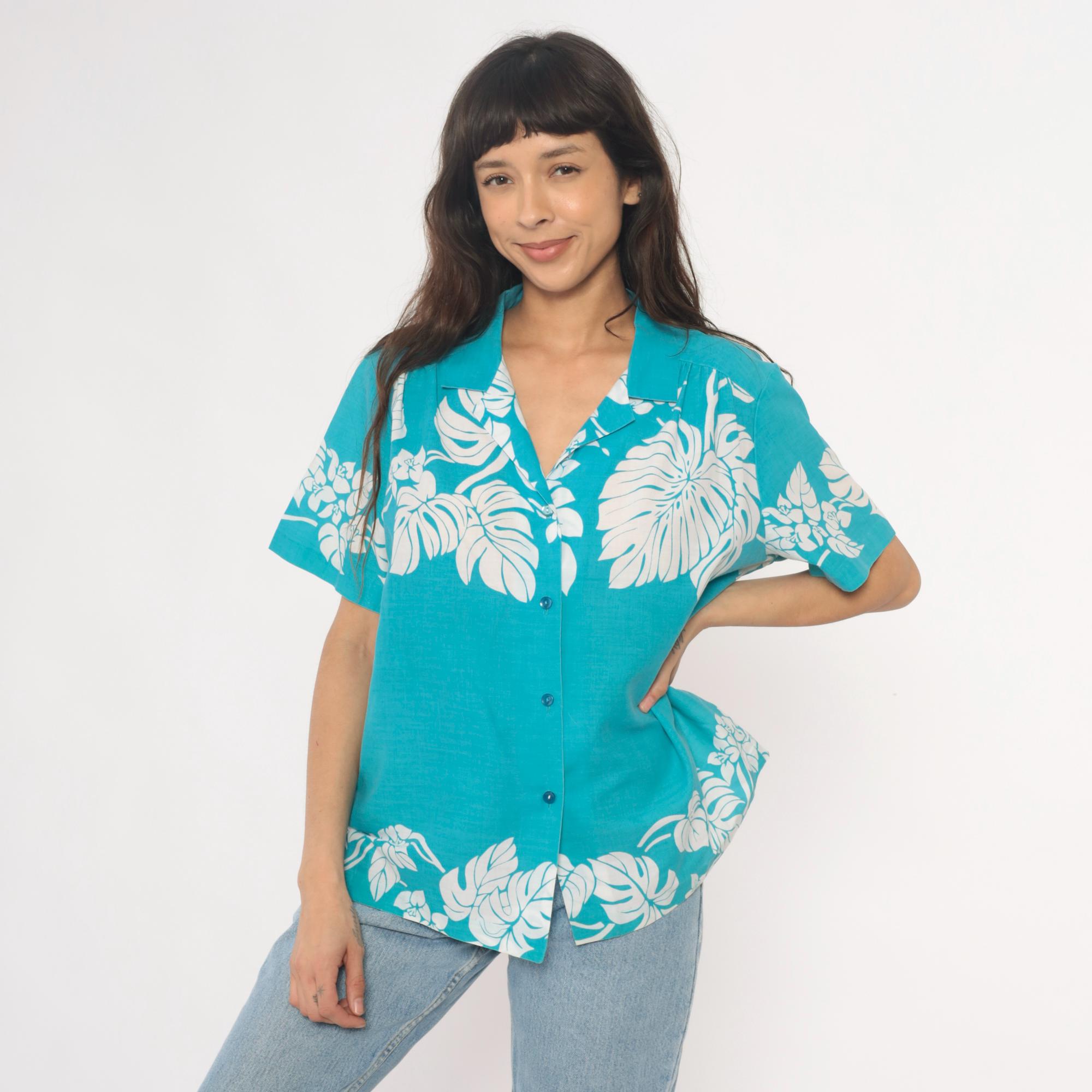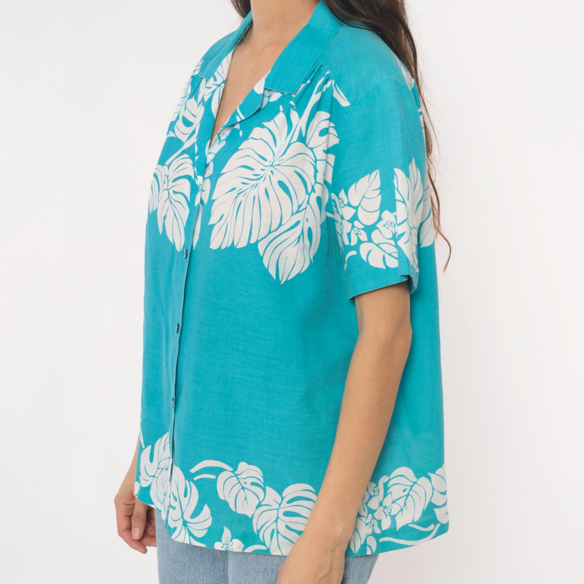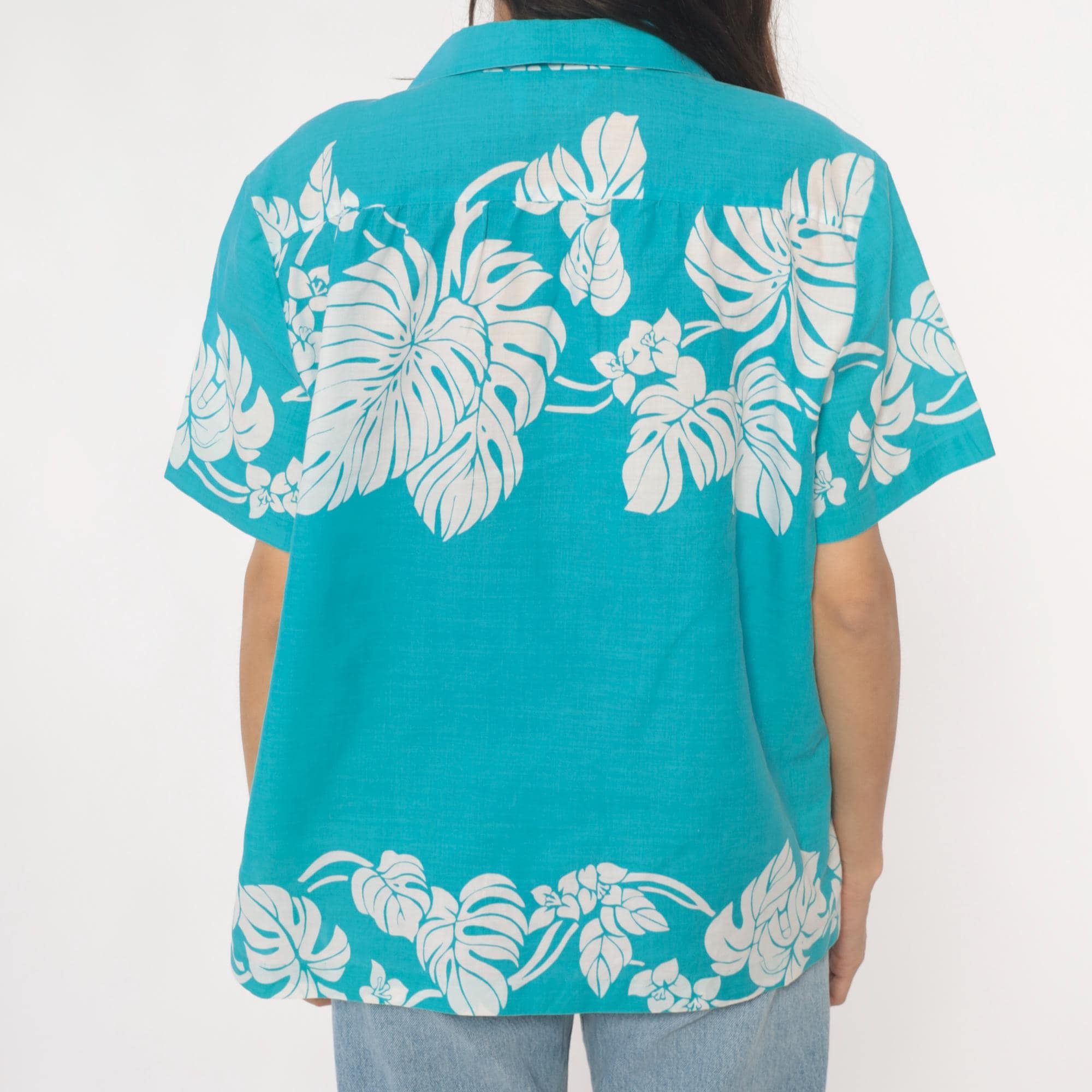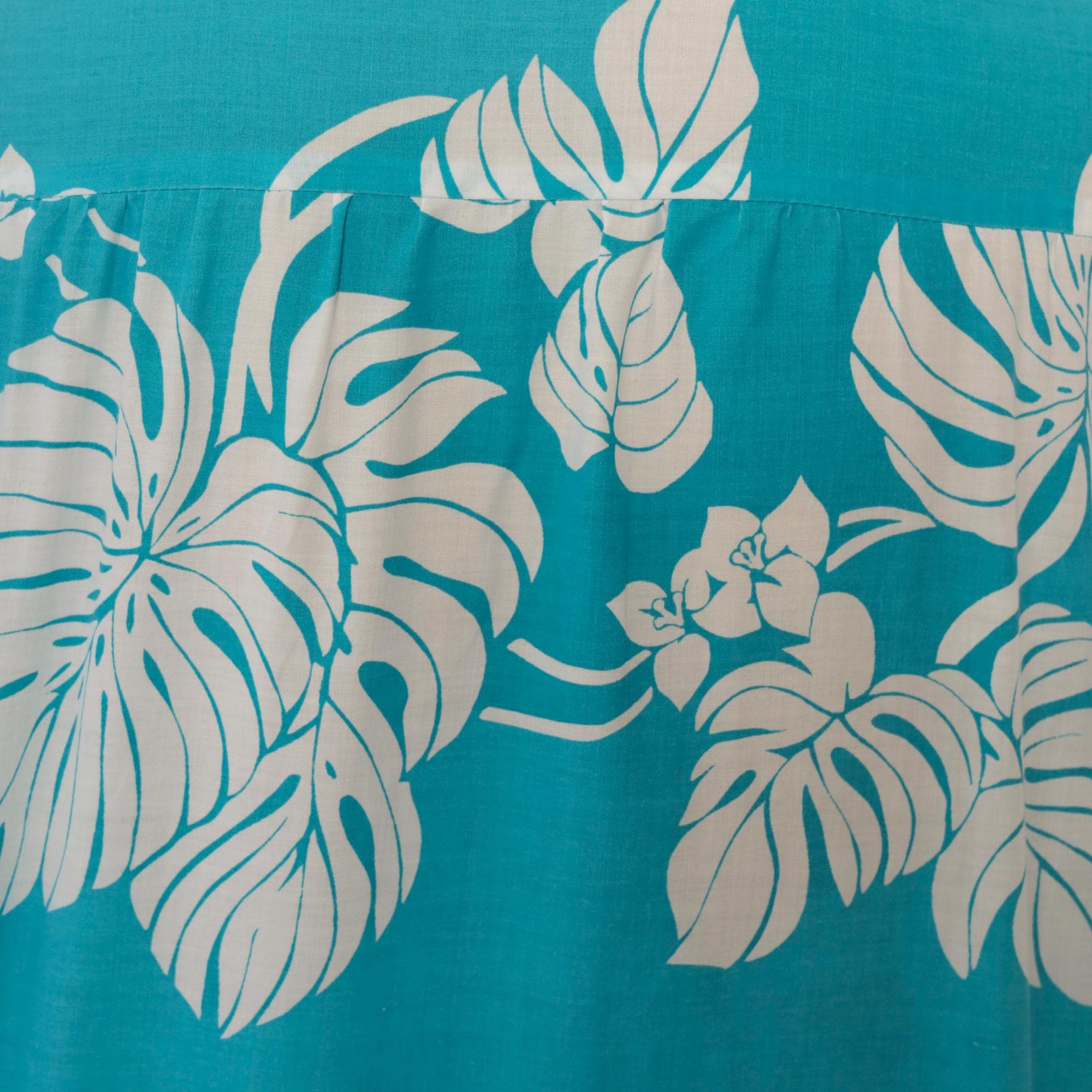80s turquoise Hawaiian shirt from hilo hattie with white monstera leaf and plumeria flower print in border design across shoulders, chest, and hem. Notched collar, button front closure, short sleeves.