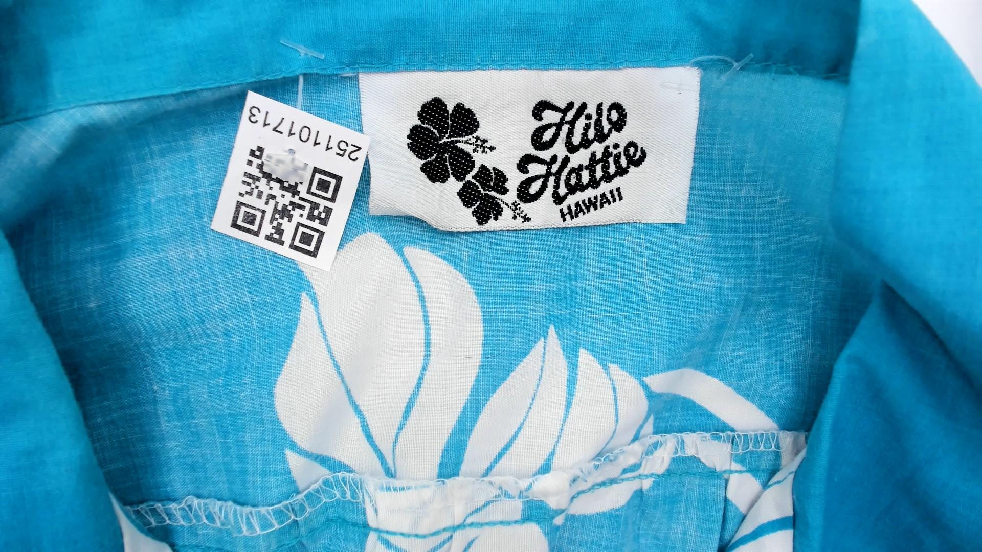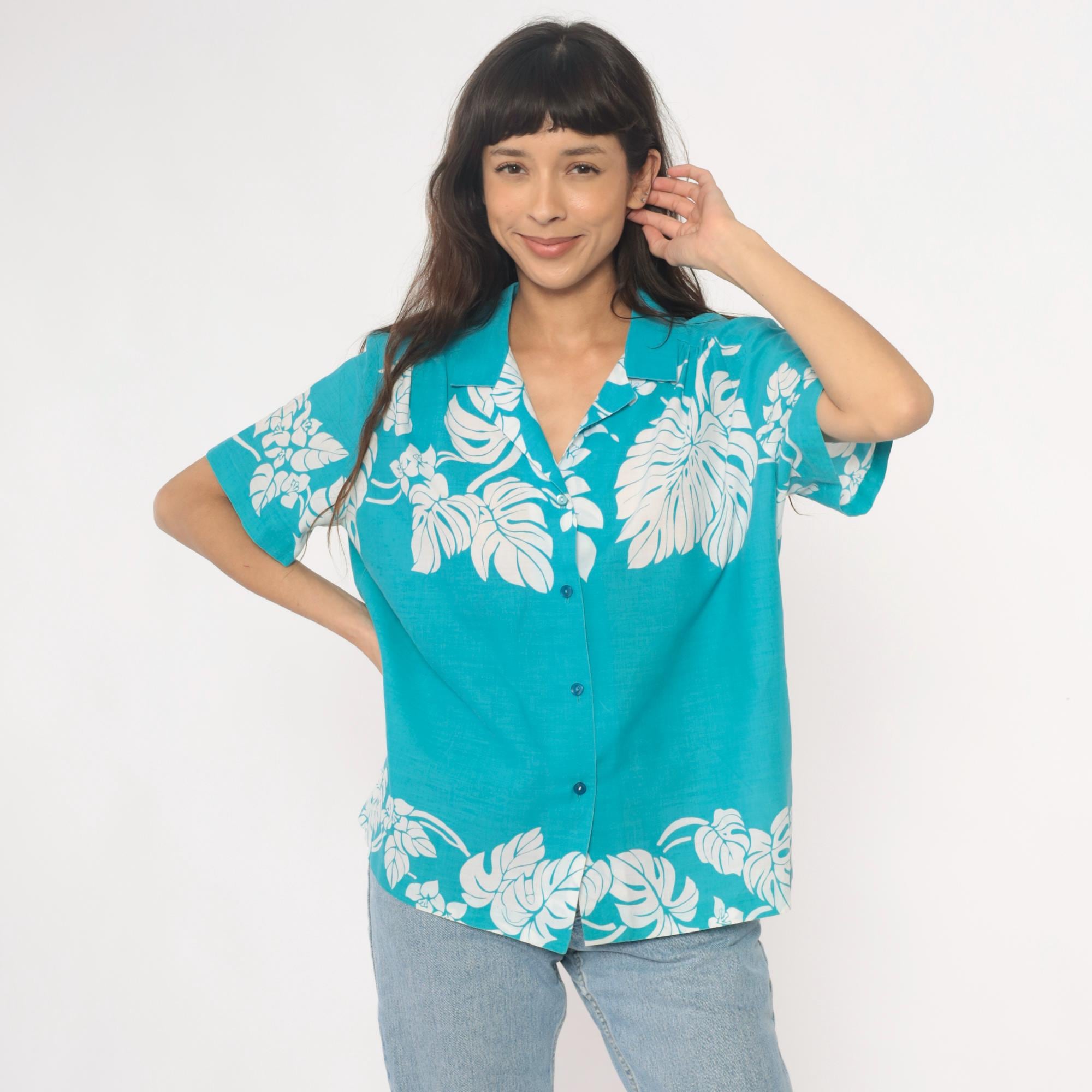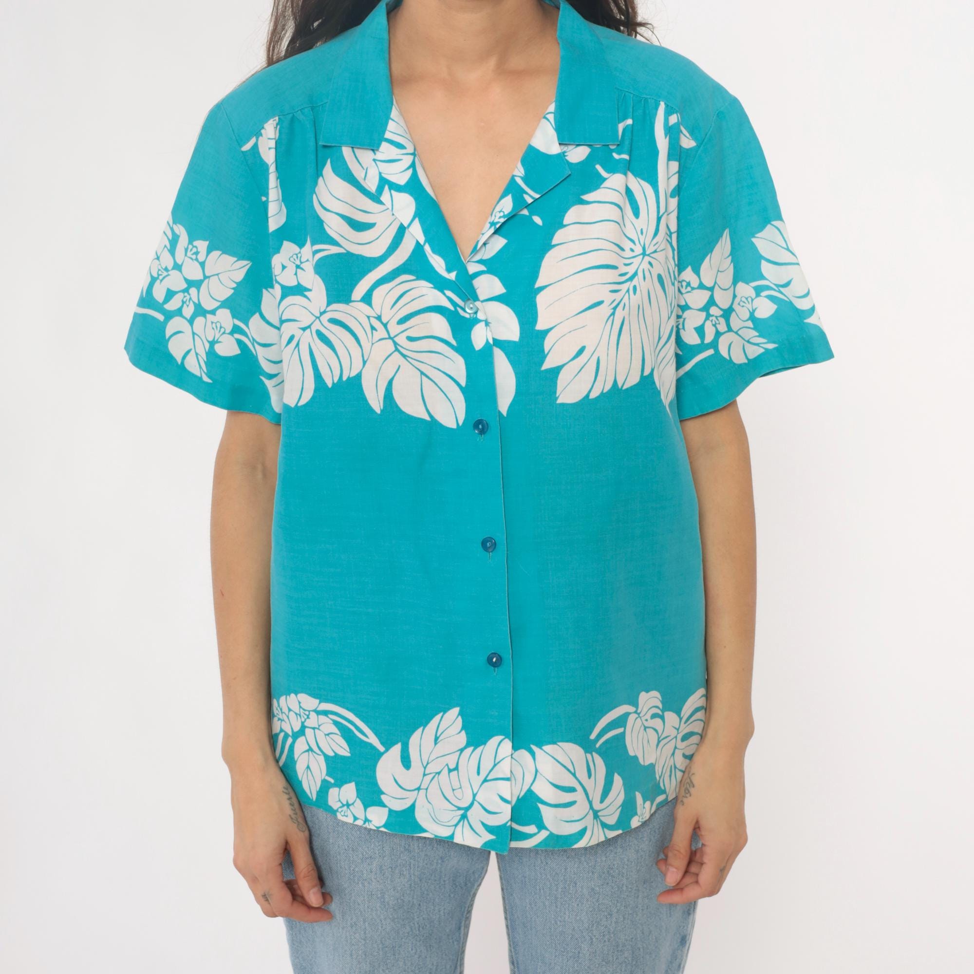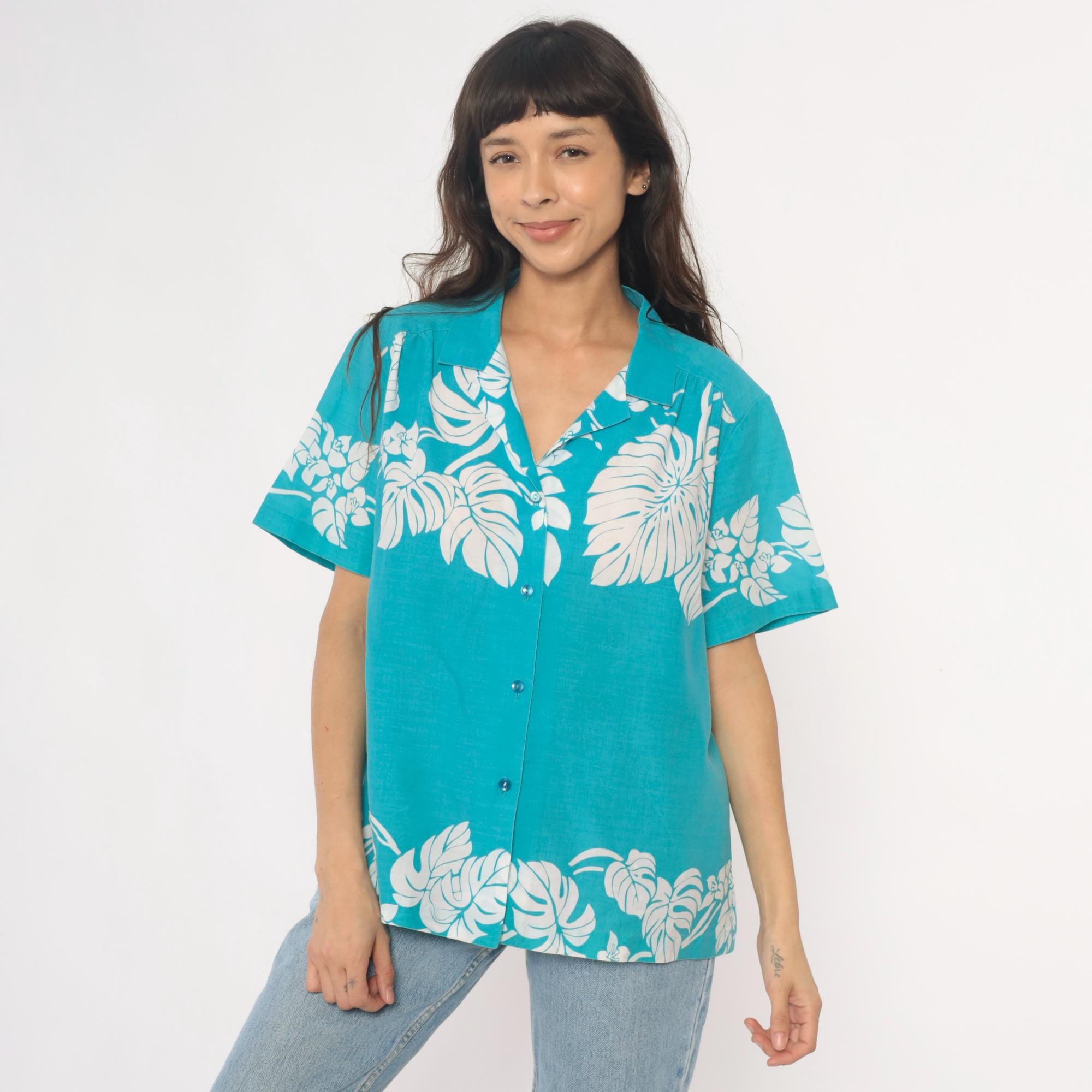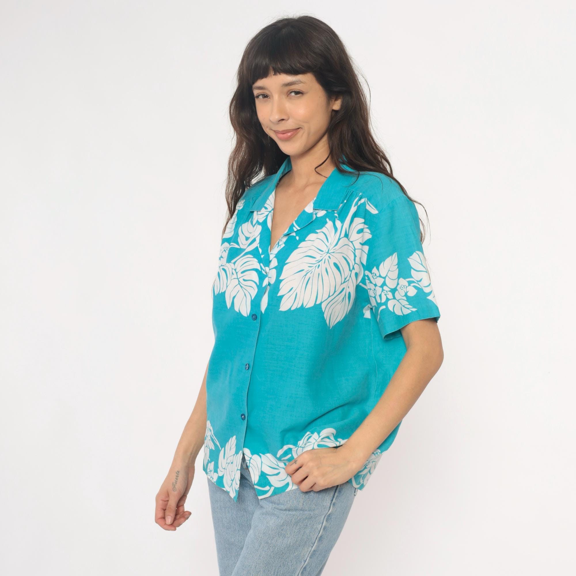 80s turquoise Hawaiian shirt from hilo hattie with white monstera leaf and plumeria flower print in border design across shoulders, chest, and hem. Notched collar, button front closure, short sleeves.
