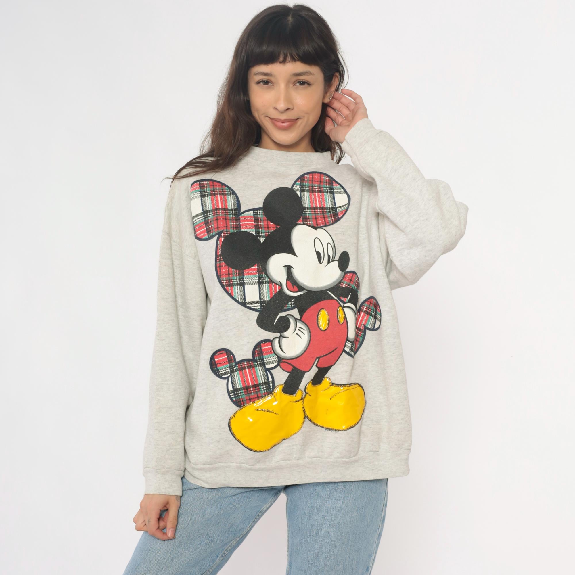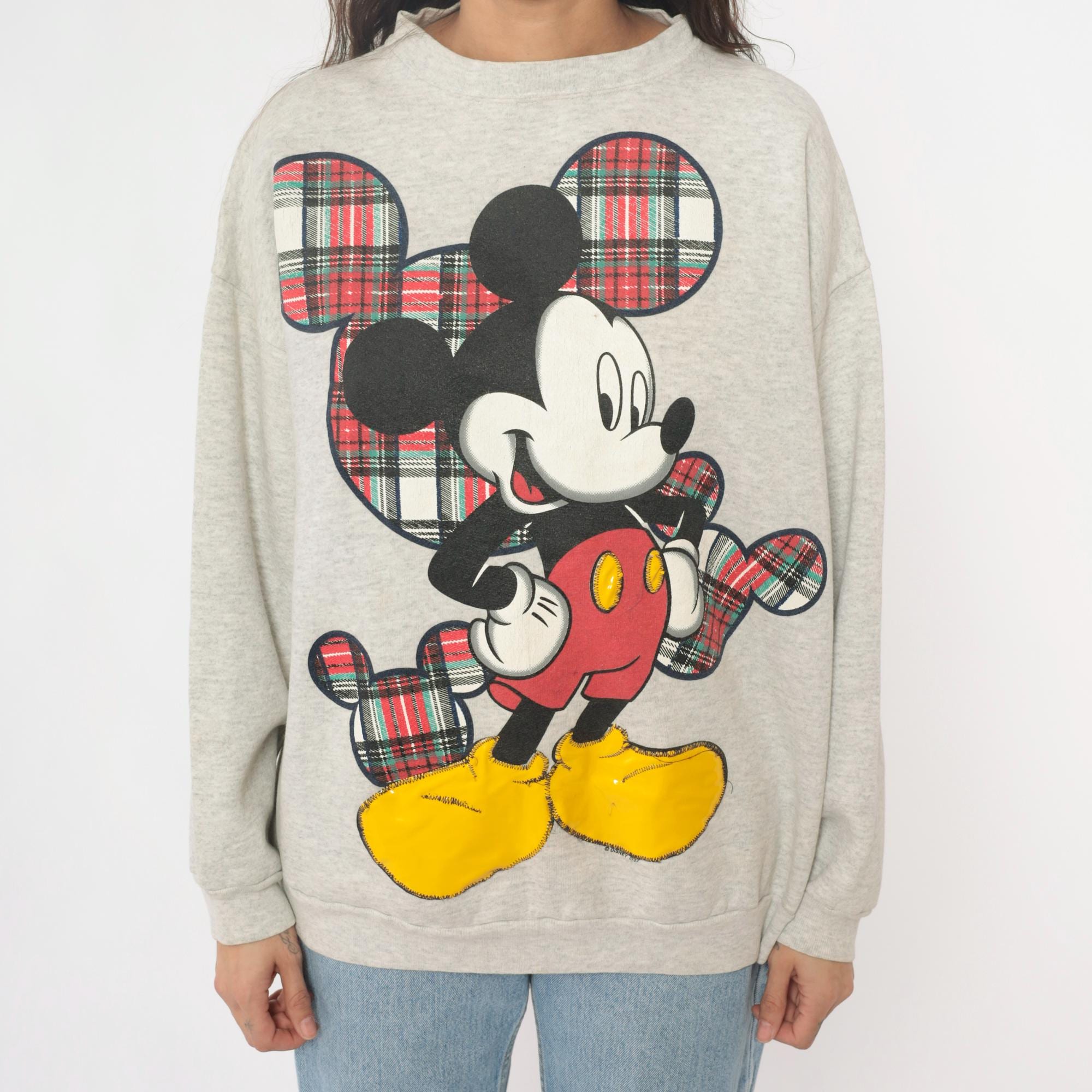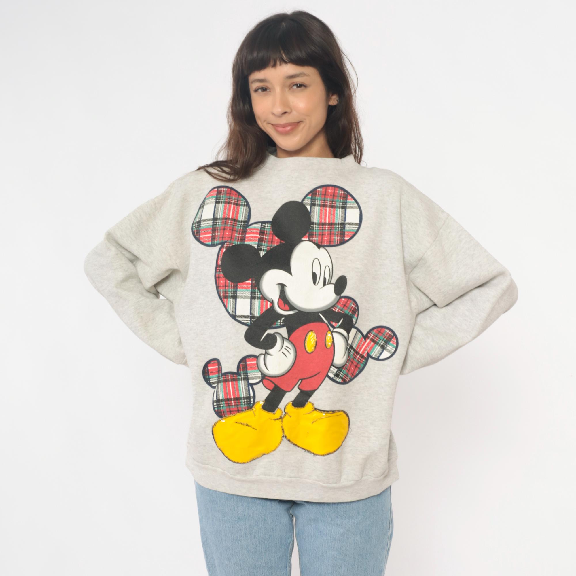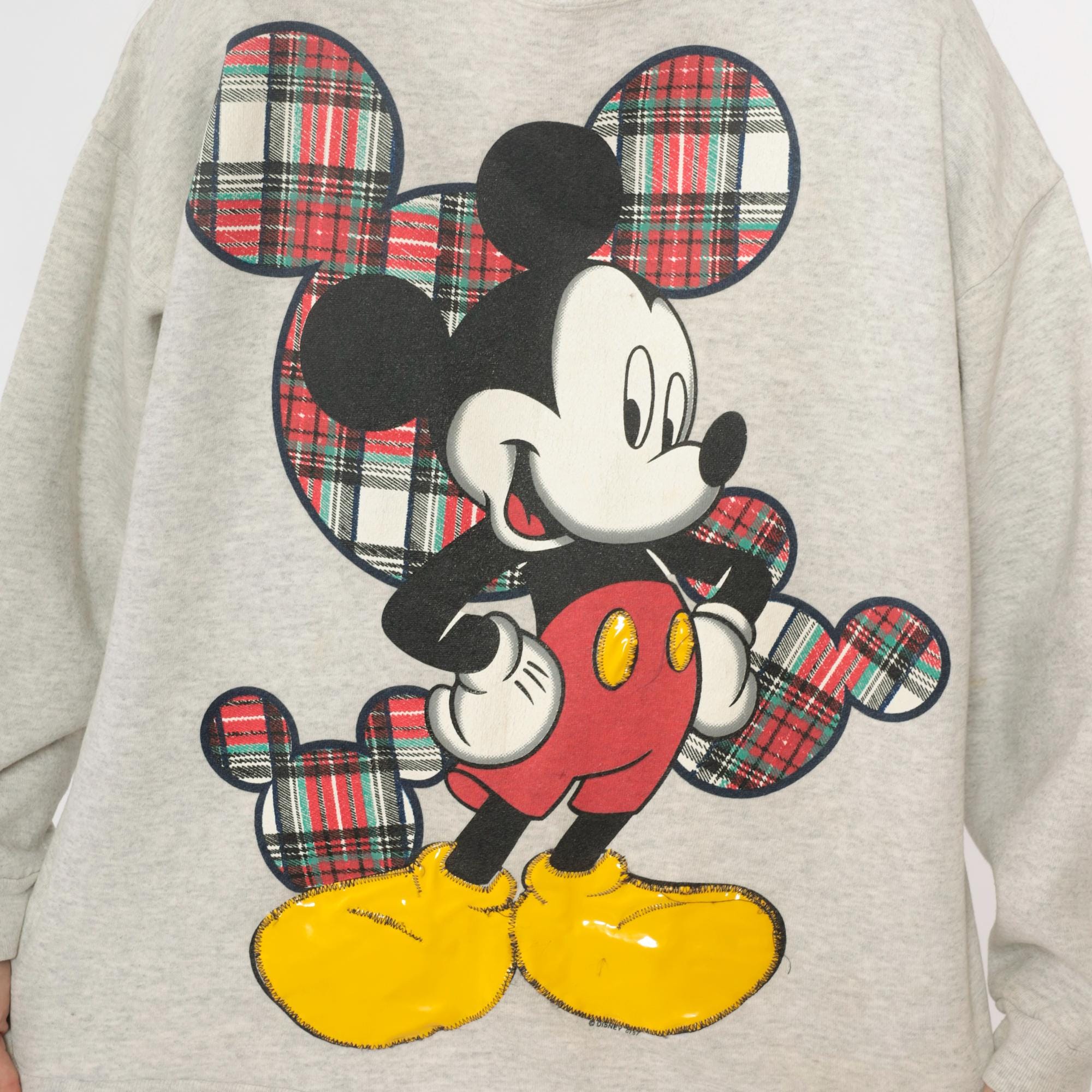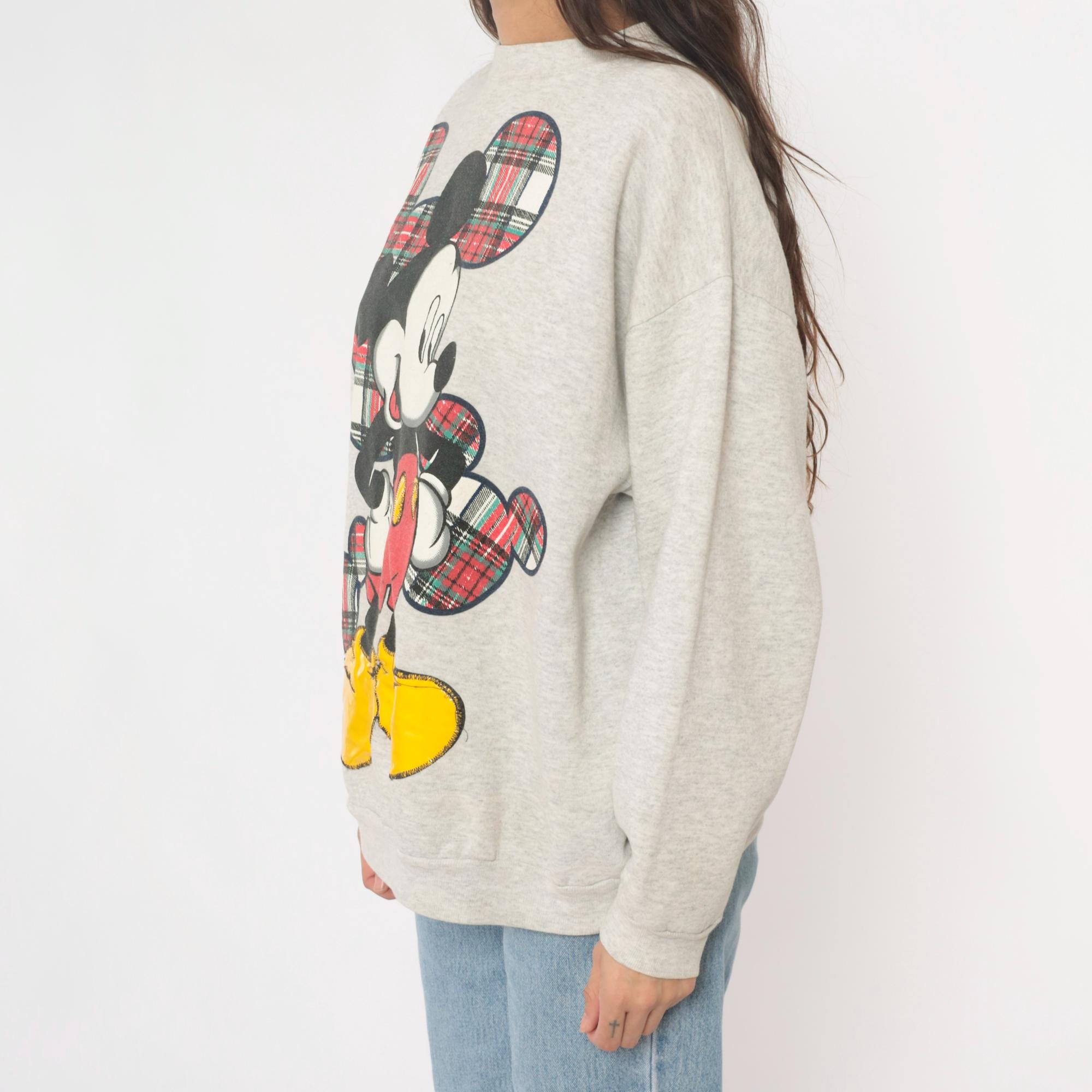 90s heather grey sweatshirt from Mickey Unlimited with large Mickey Mouse graphic on front. Mickey and multiple Mickey head silhouettes filled with red, green, white, and black plaid pattern. Crew neck, long sleeves with ribbed cuffs, ribbed hem.