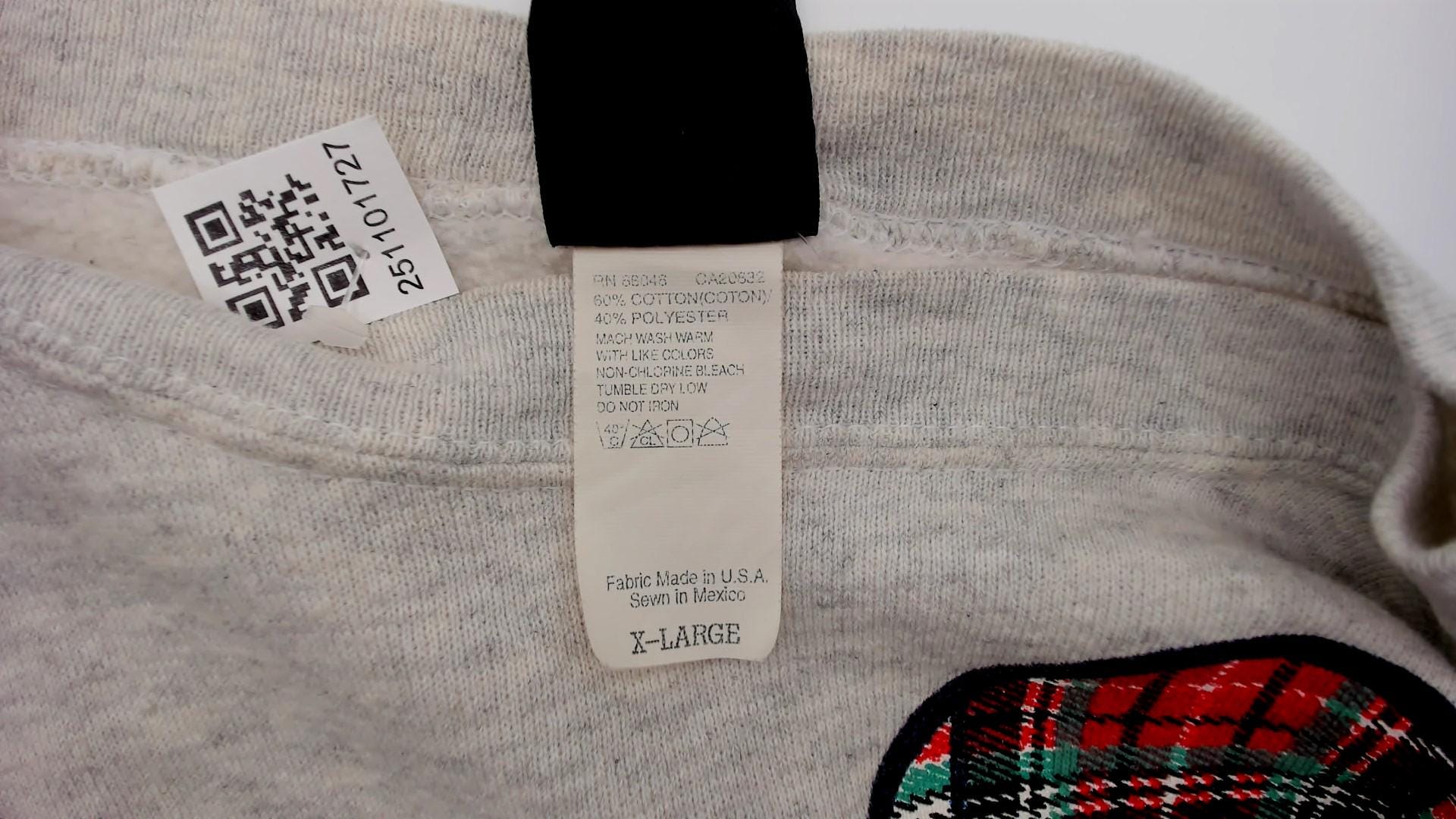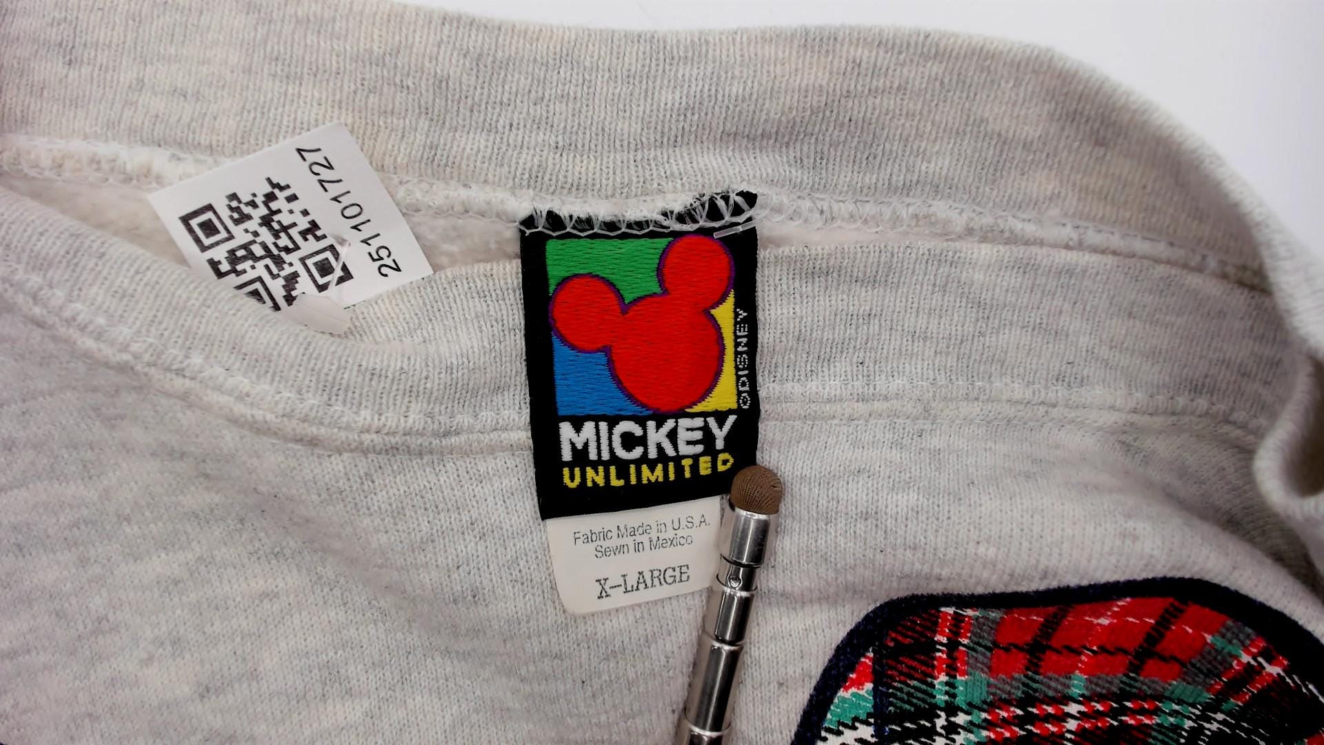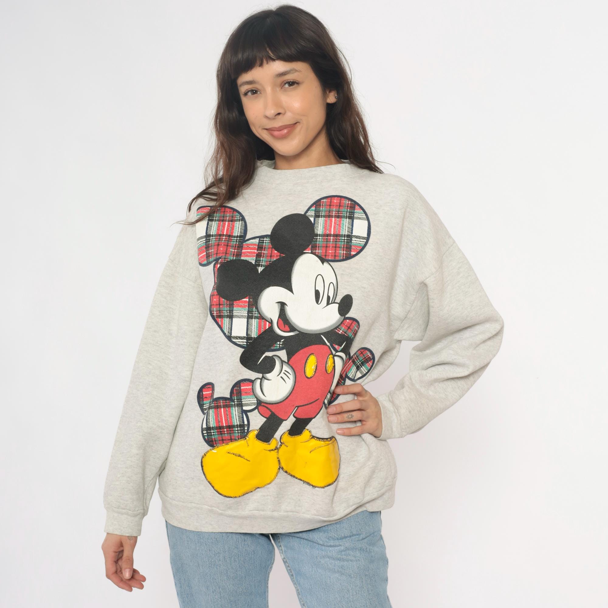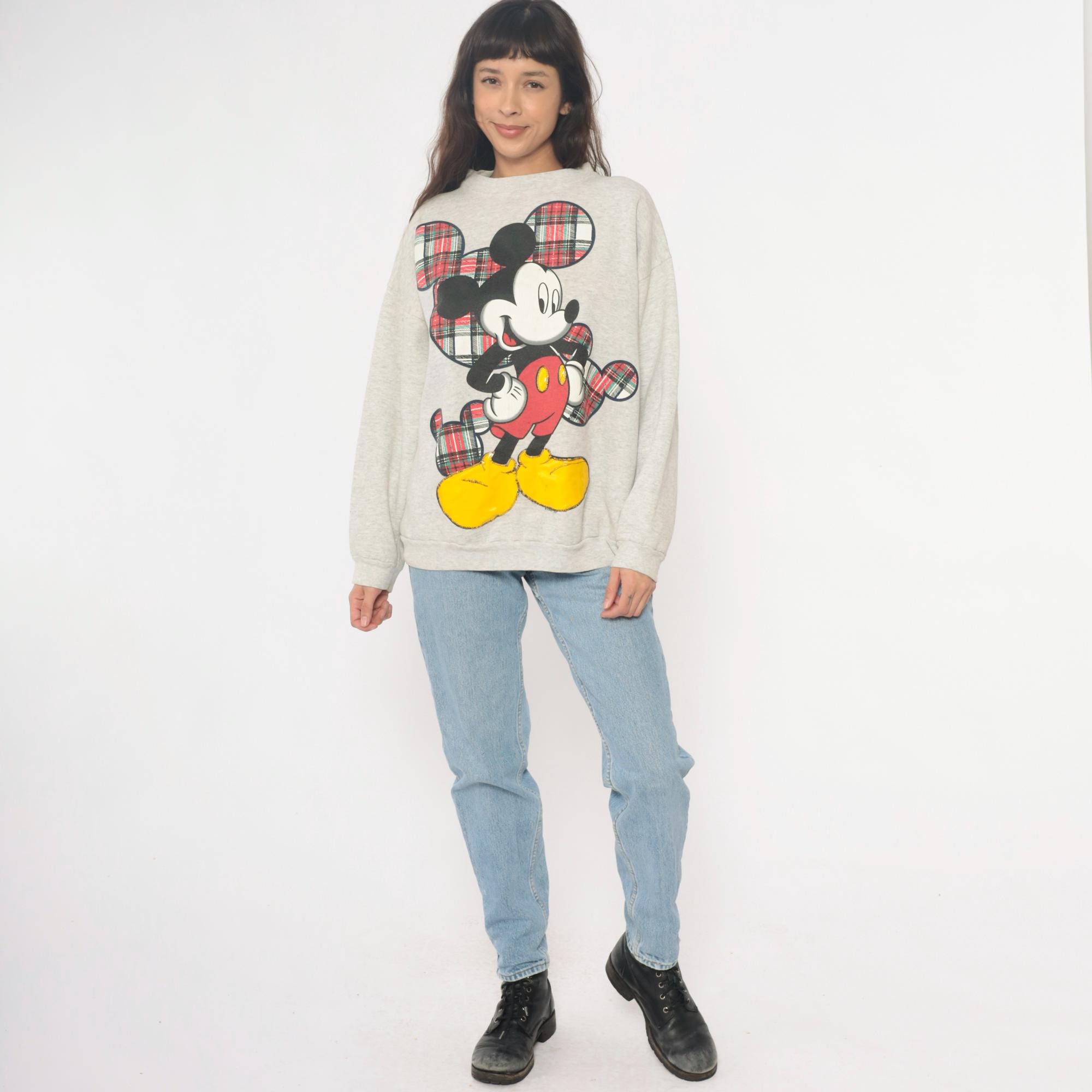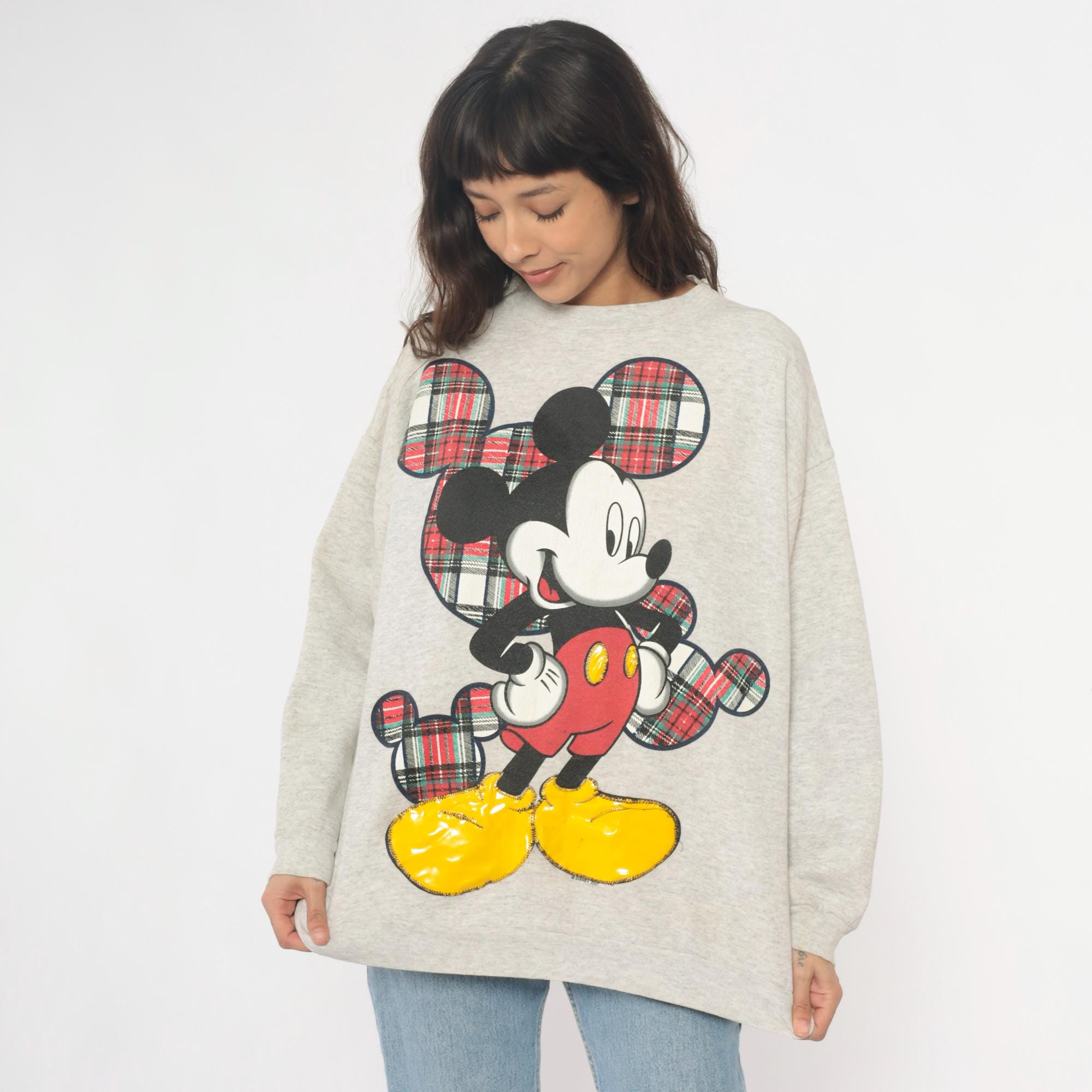 90s heather grey sweatshirt from Mickey Unlimited with large Mickey Mouse graphic on front. Mickey and multiple Mickey head silhouettes filled with red, green, white, and black plaid pattern. Crew neck, long sleeves with ribbed cuffs, ribbed hem.