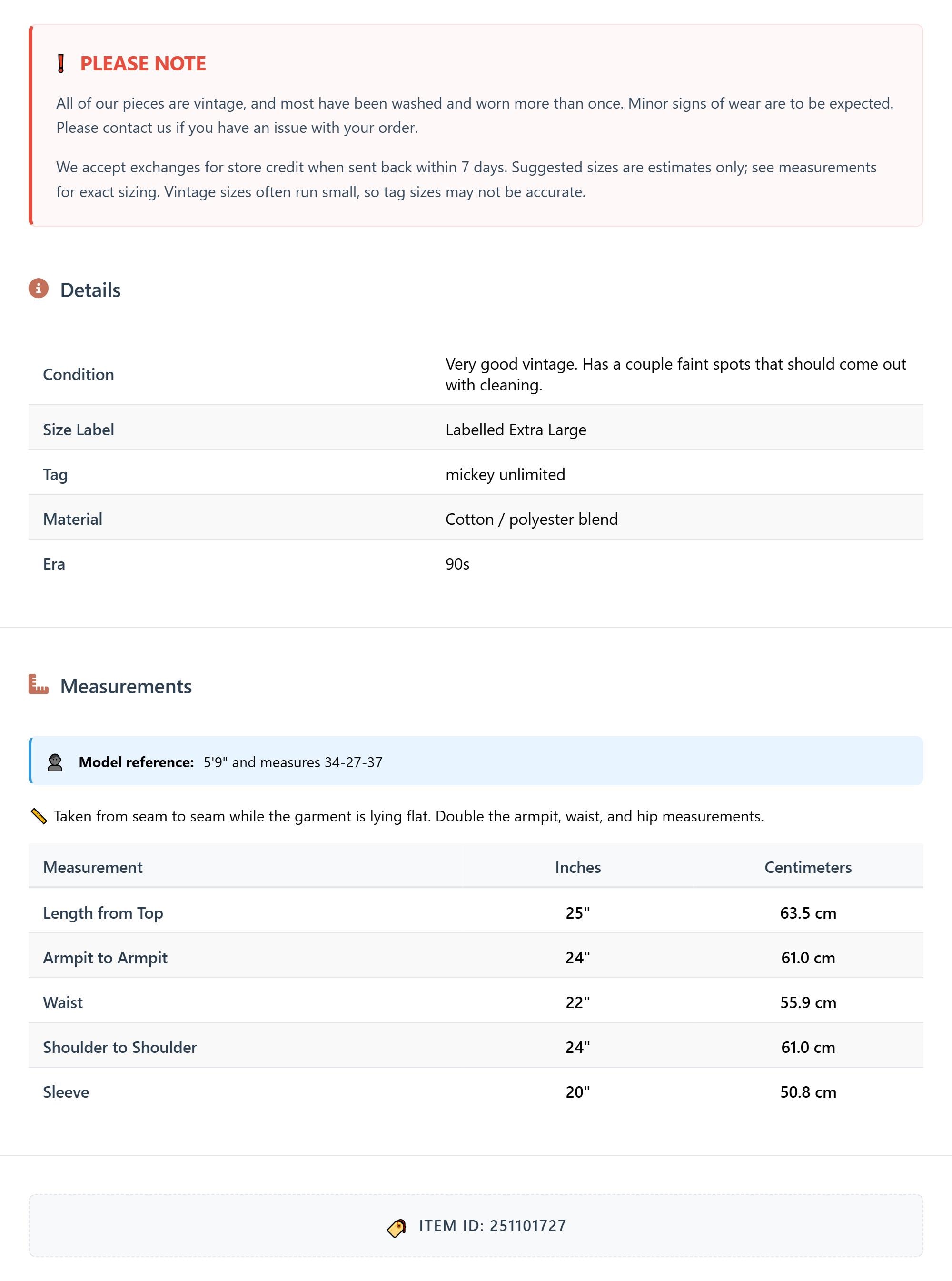 All of our pieces are vintage, and most have been washed and worn more than once. Minor signs of wear are to be expected. Please contact us if you have an issue with your order. We accept exchanges for store credit when sent back within 7 days.