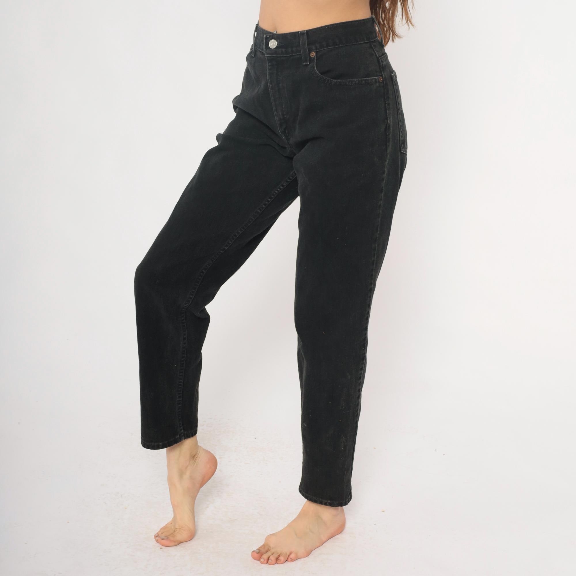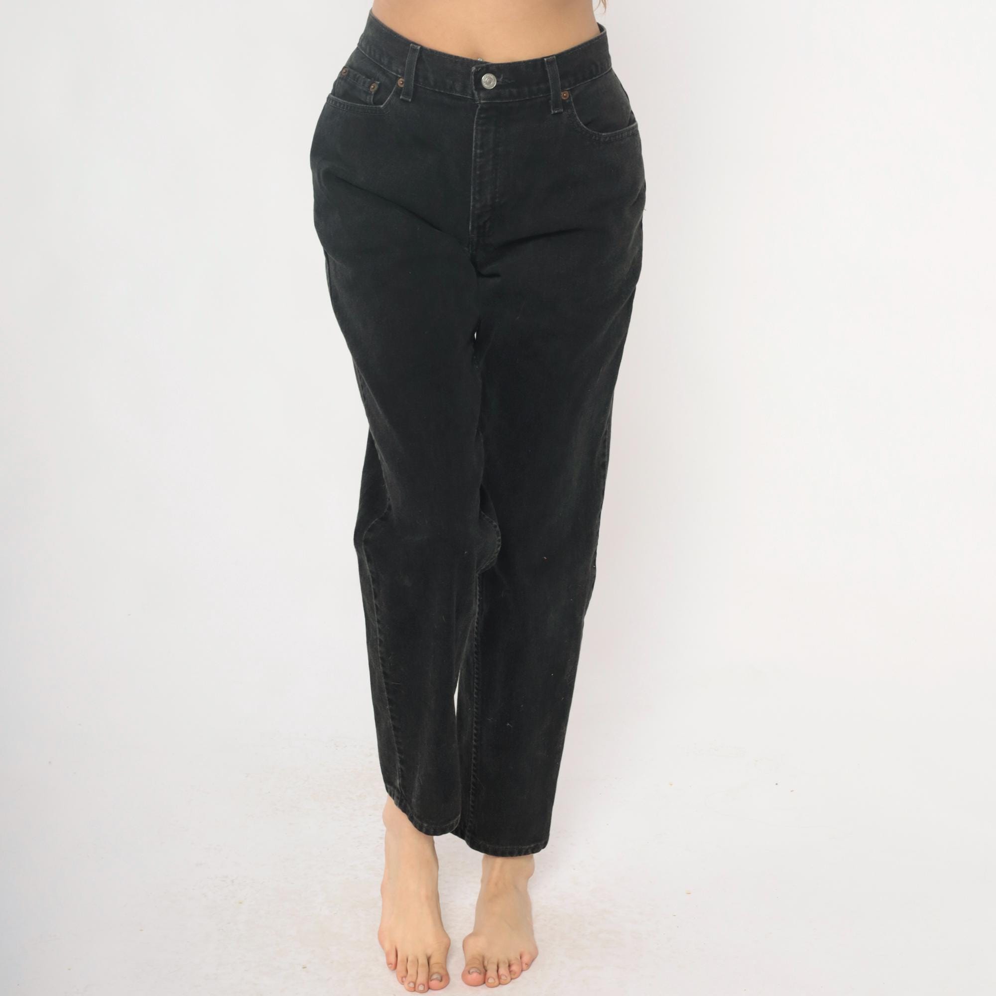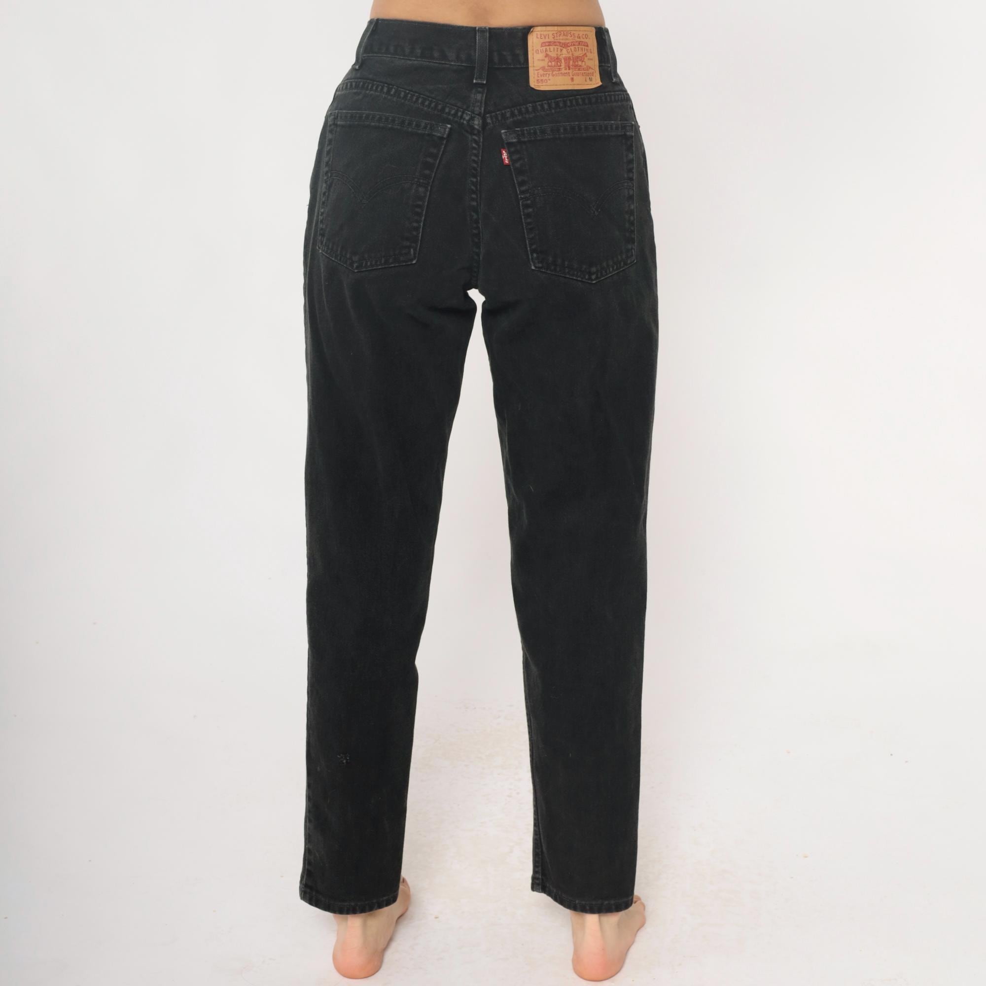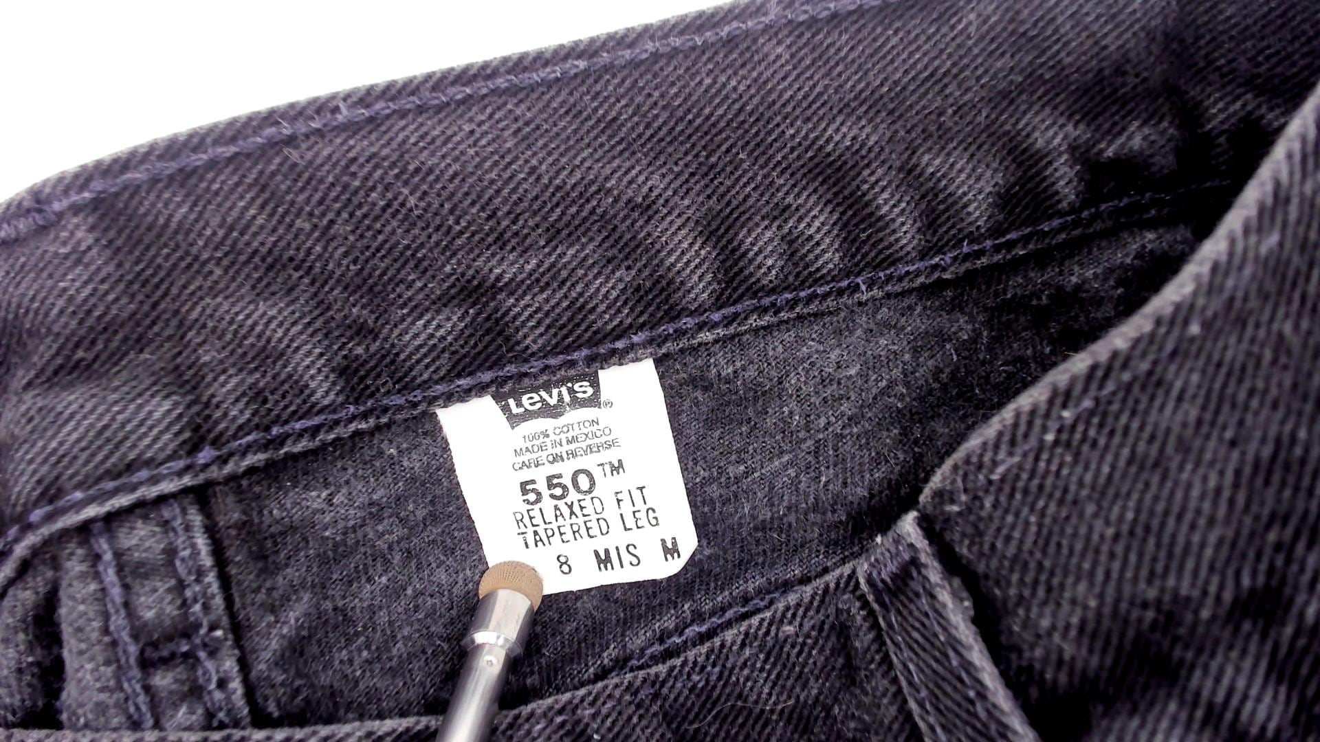Black relaxed fit jeans from Levi Strauss & Co in the 550 style from the late 1990s to early 2000s. Five-pocket construction with button fly closure, belt loops, and classic copper rivets. High rise with straight leg cut.