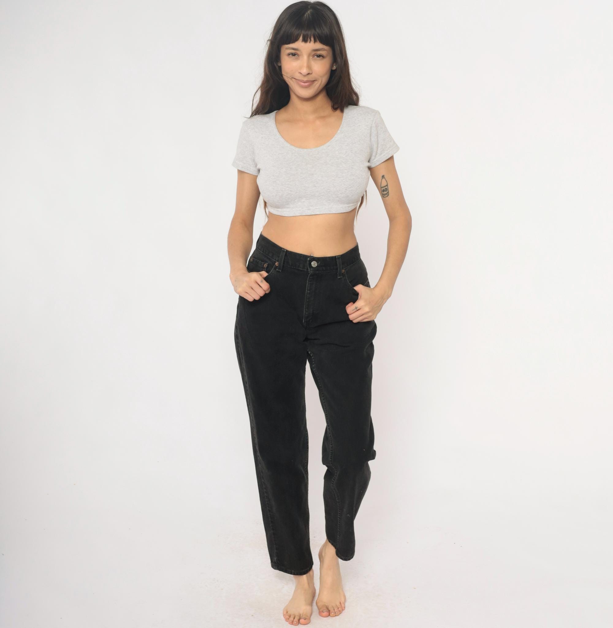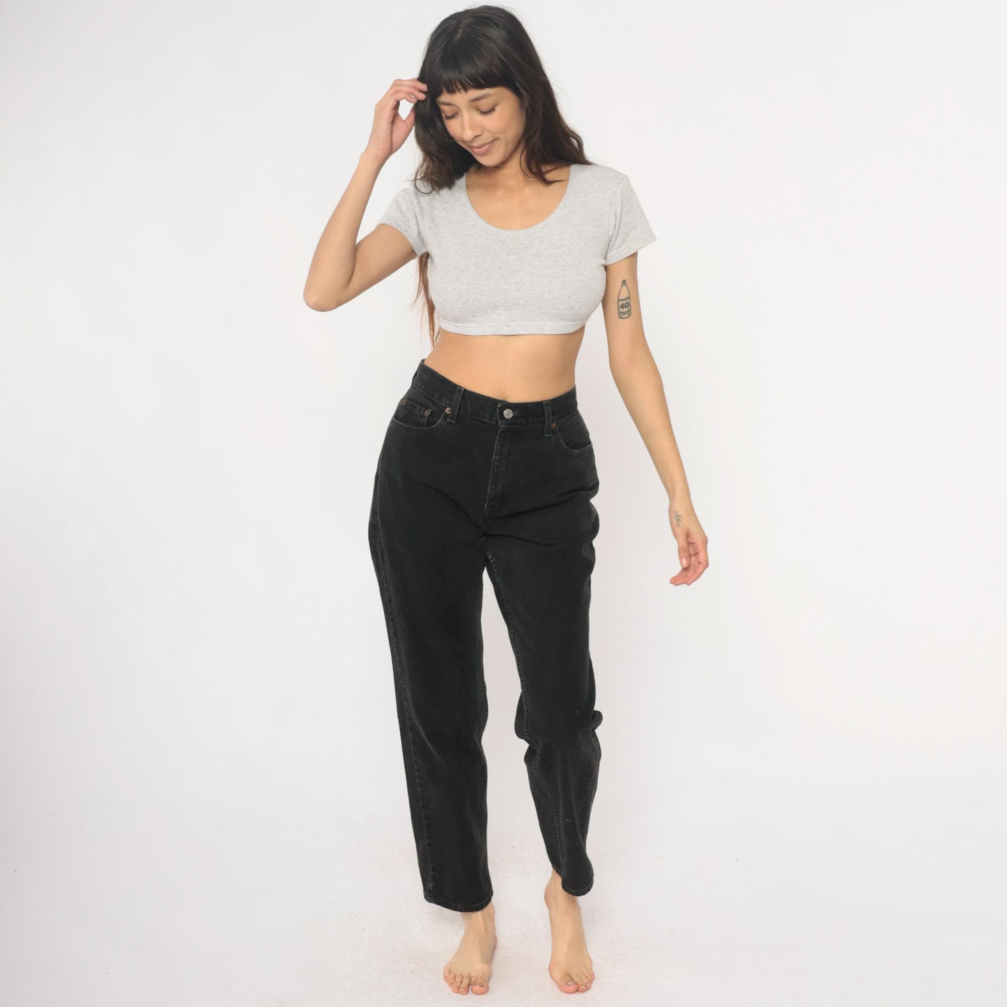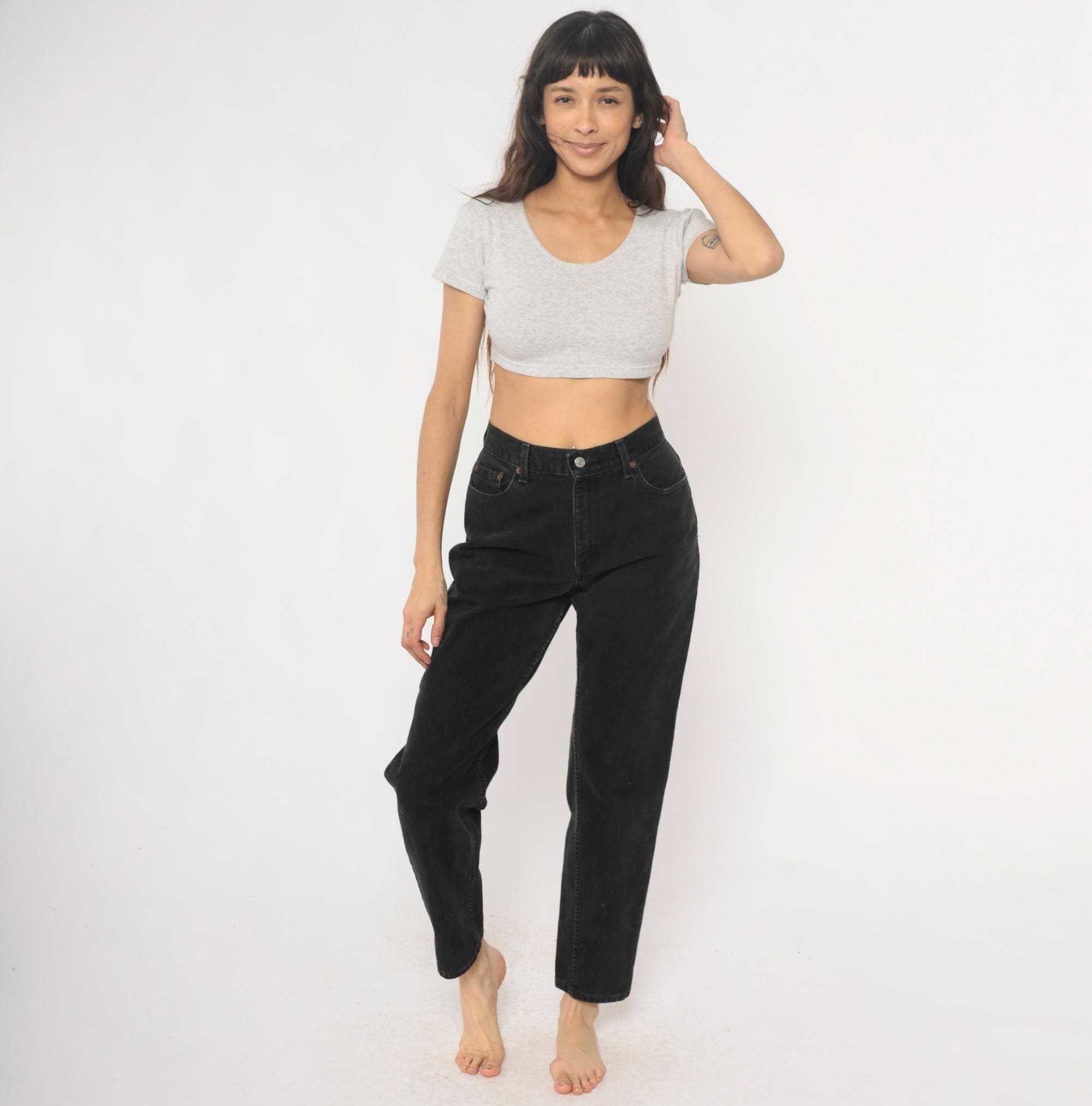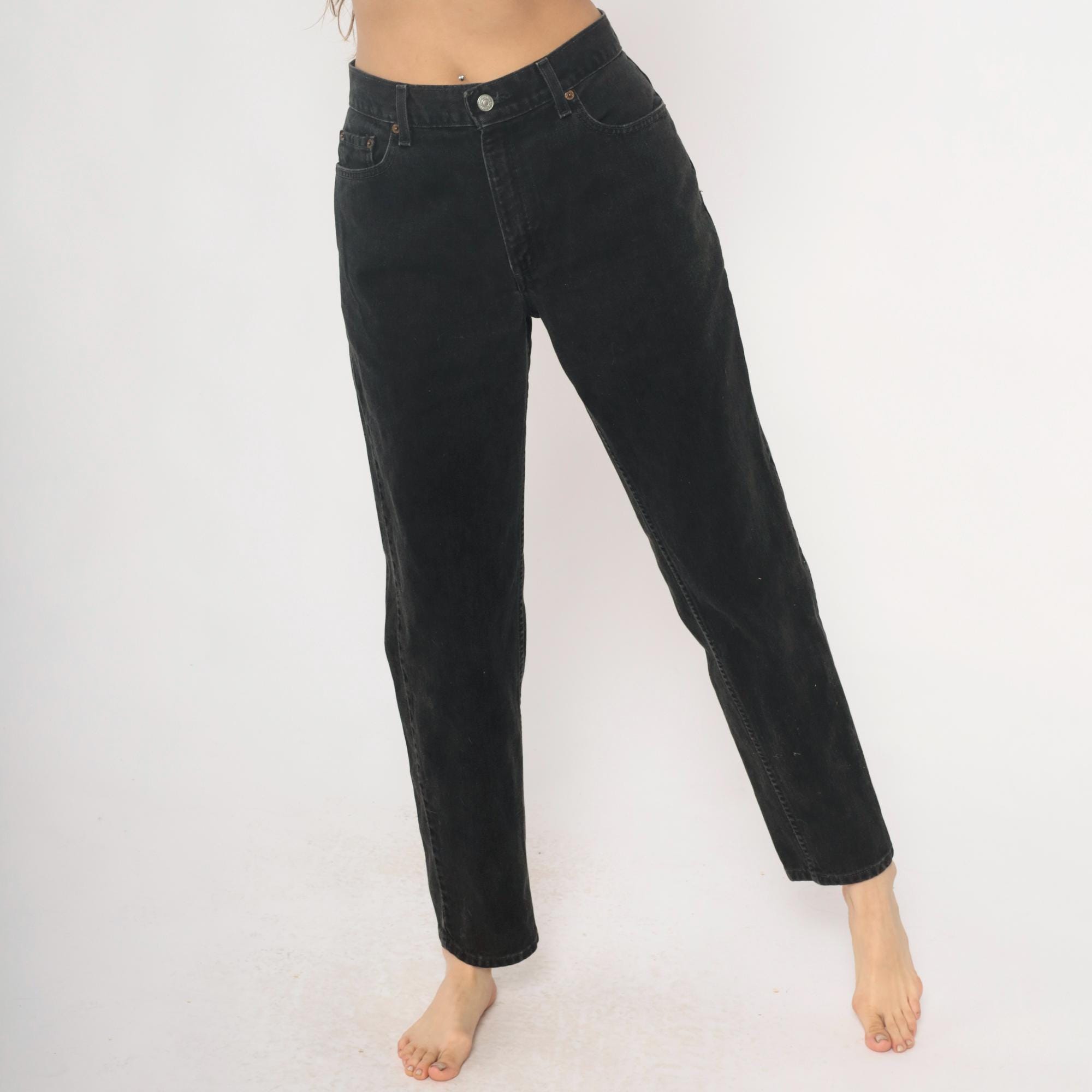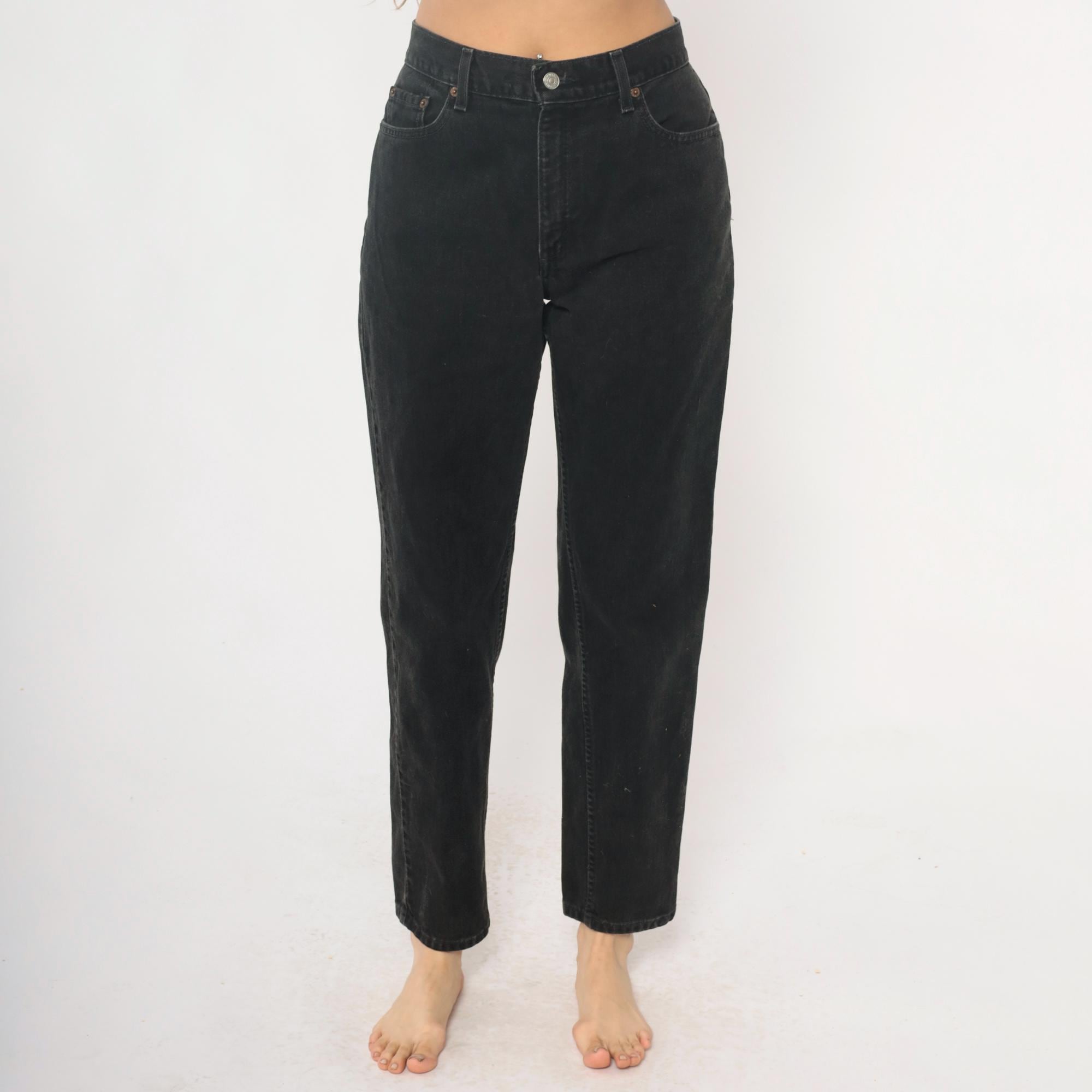 Black relaxed fit jeans from Levi Strauss & Co in the 550 style from the late 1990s to early 2000s. Five-pocket construction with button fly closure, belt loops, and classic copper rivets. High rise with straight leg cut.