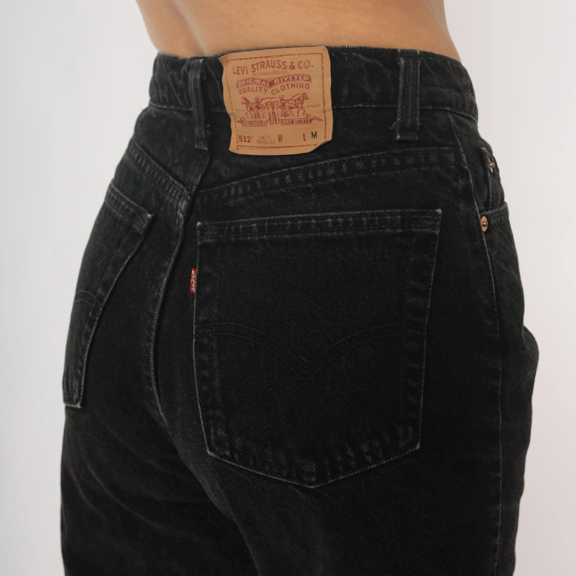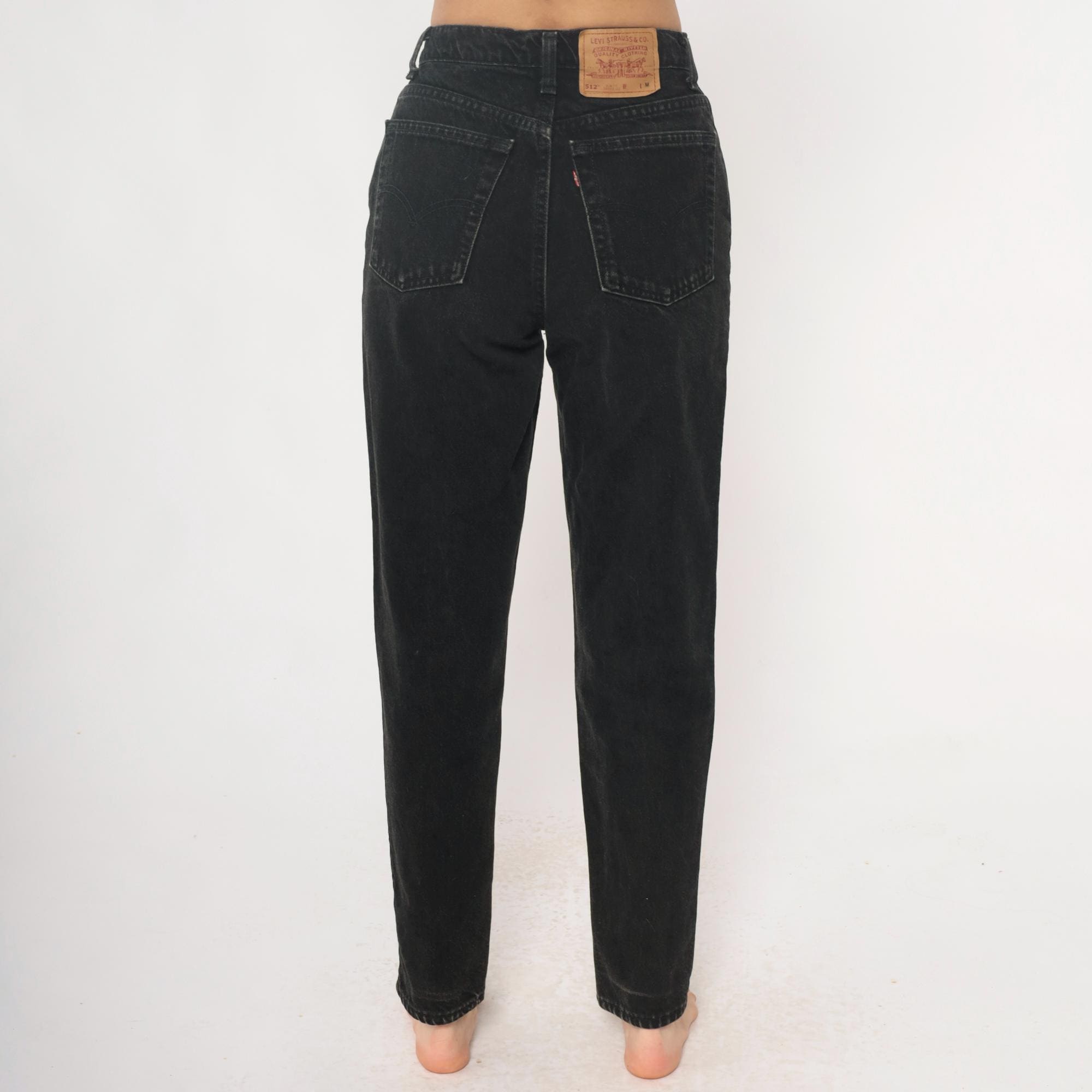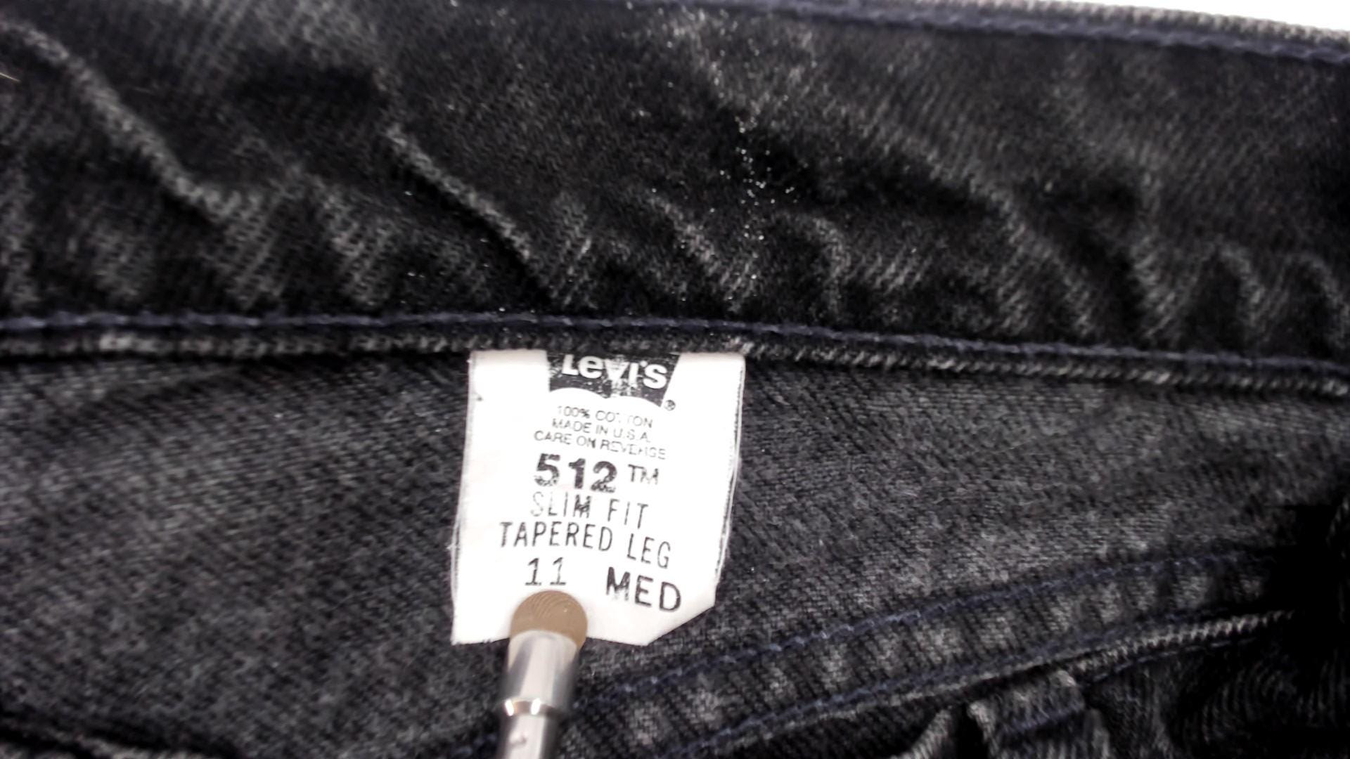 90s black Levi's 512 slim fit jeans with tapered leg and faded vintage wash. Five-pocket styling with button fly closure and leather Levi Strauss patch at back waist.