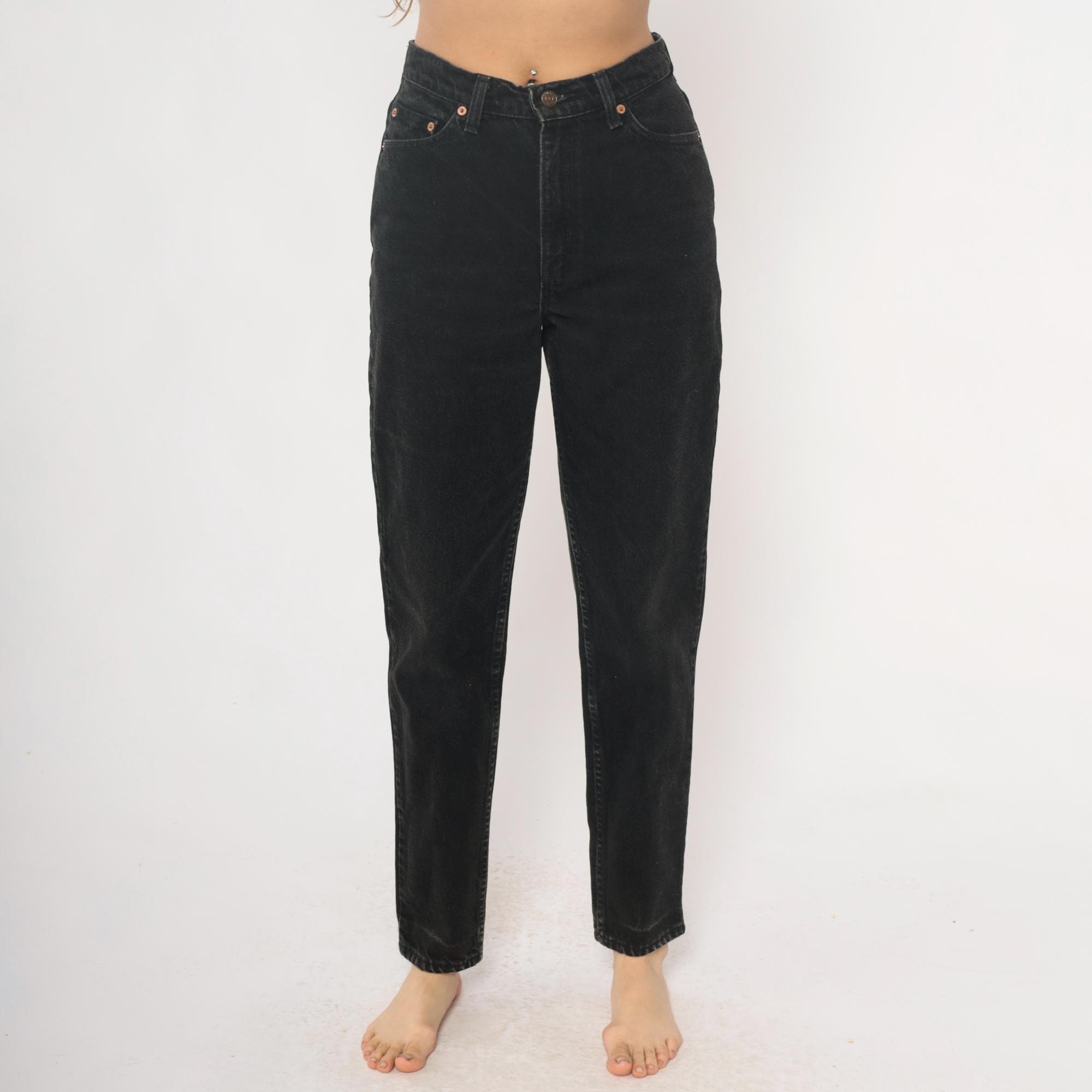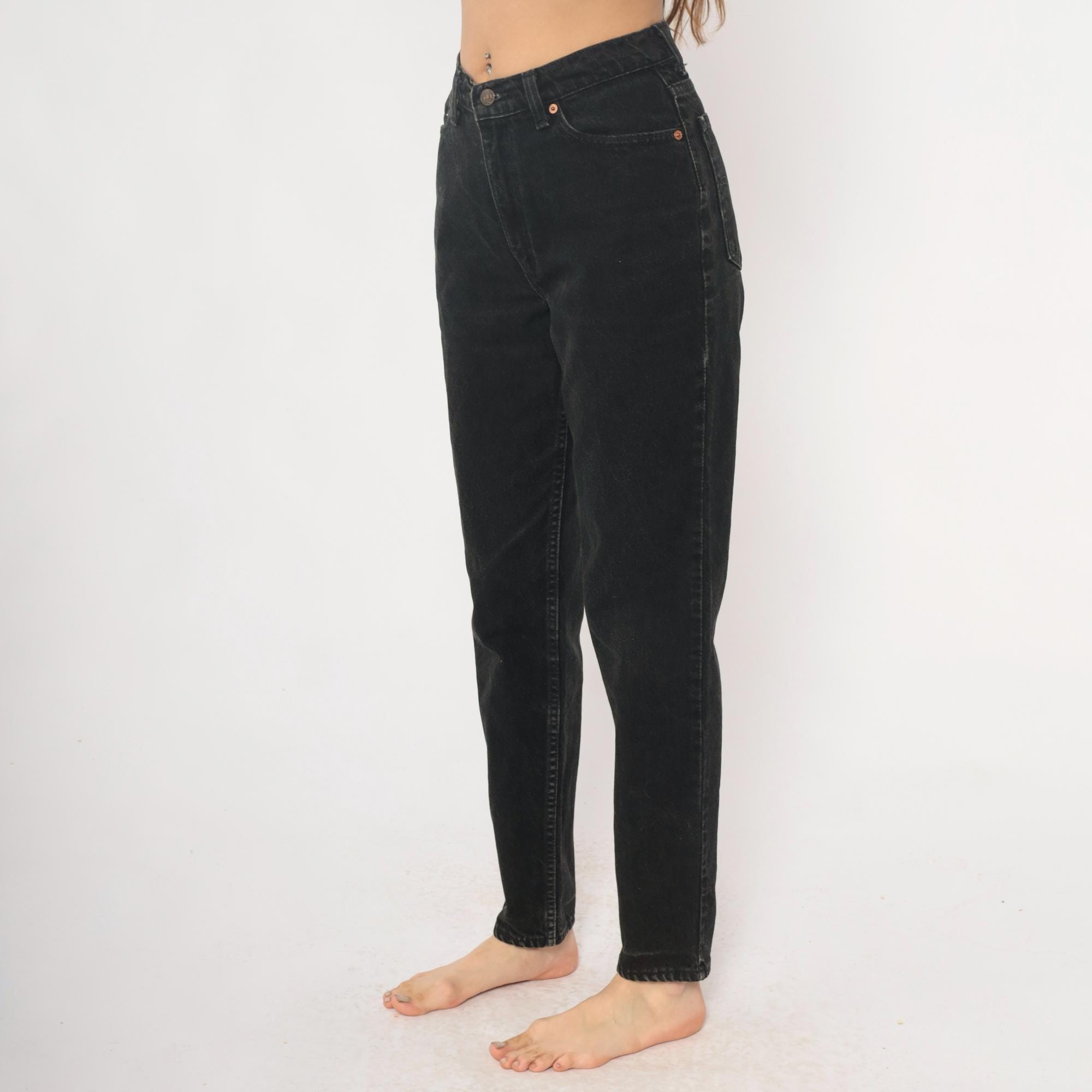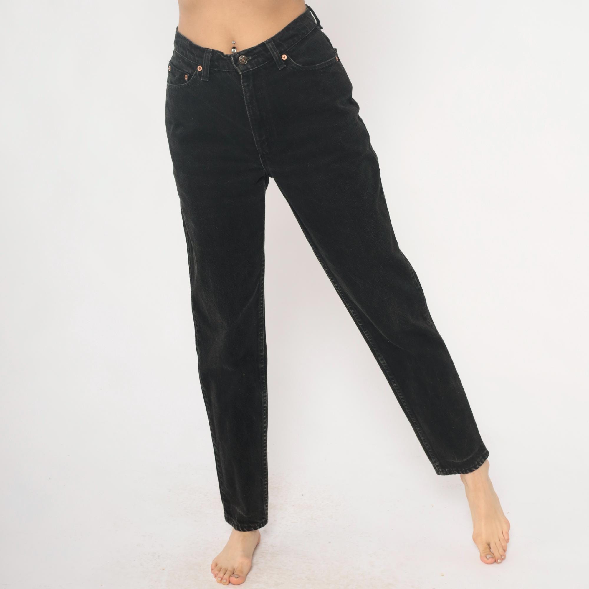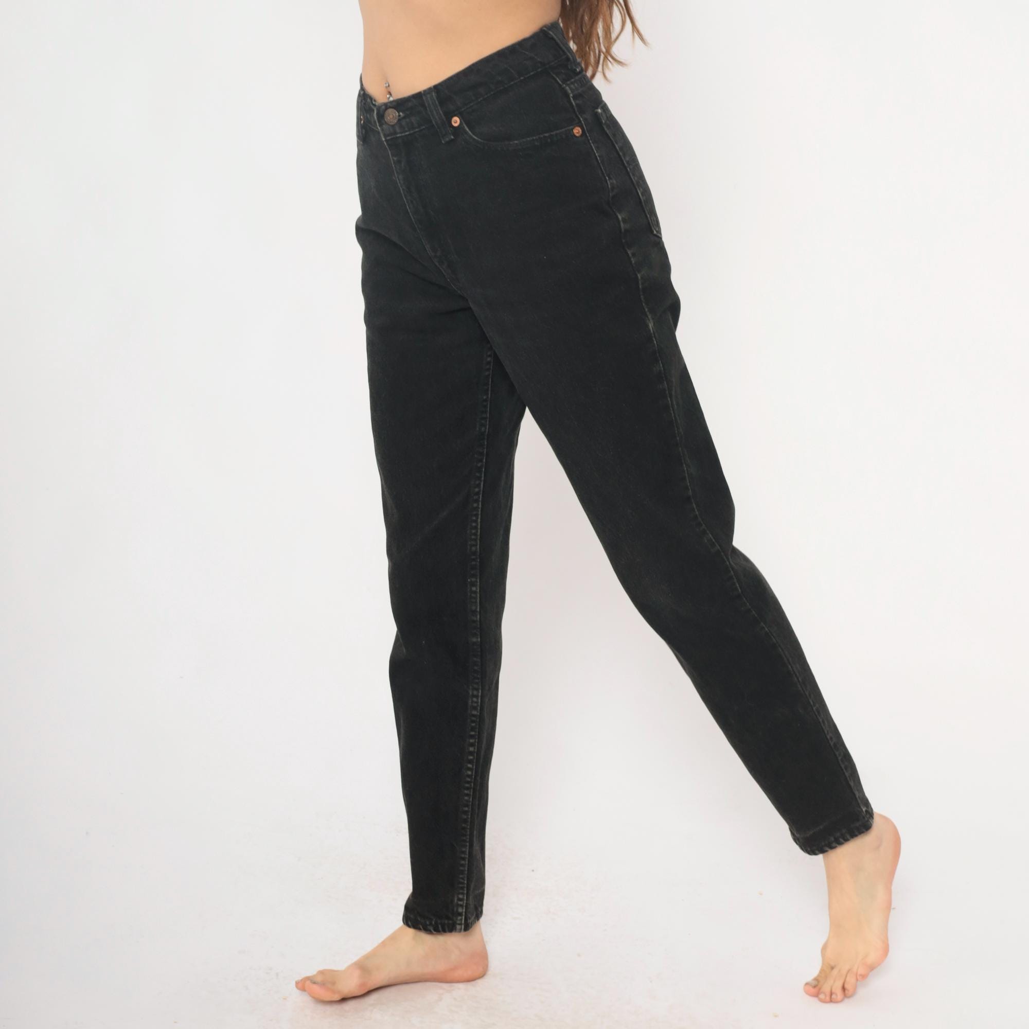 90s black Levi's 512 slim fit jeans with tapered leg and faded vintage wash. Five-pocket styling with button fly closure and leather Levi Strauss patch at back waist.