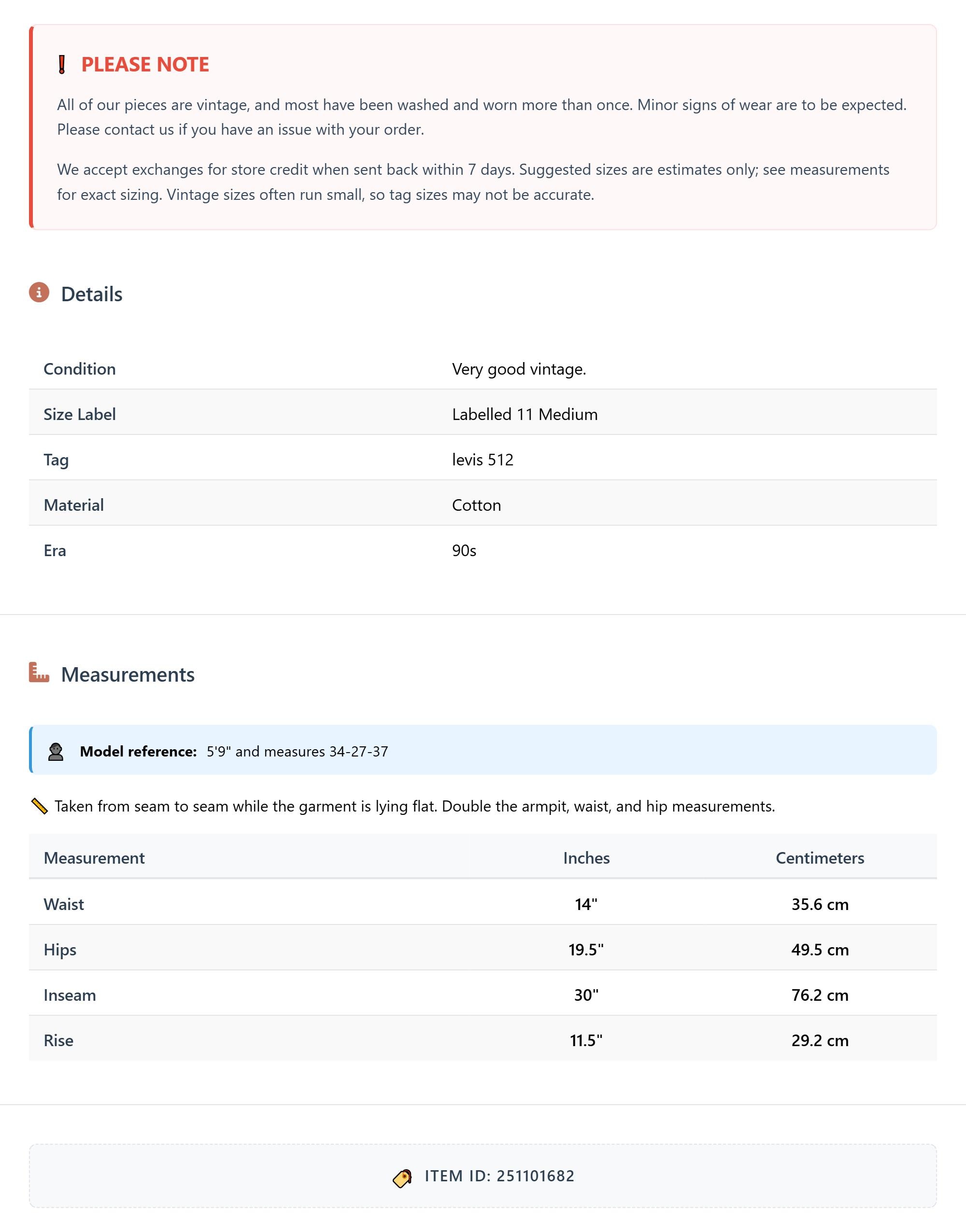 Vintage denim was usually made without any stretch, unlike modern jeans. Check the measurements to ensure proper fit, and remember to give yourself a little wiggle room in the waist and hips, depending on your preferred fit.