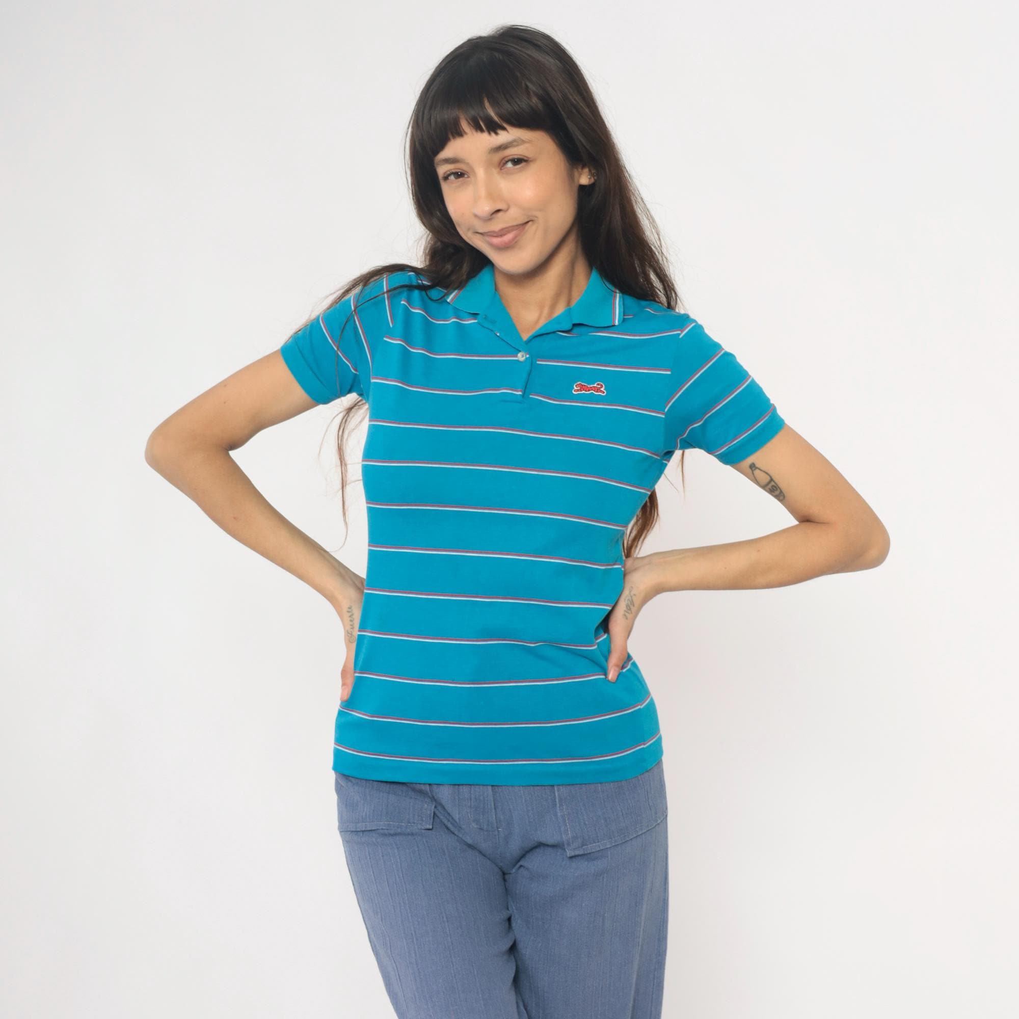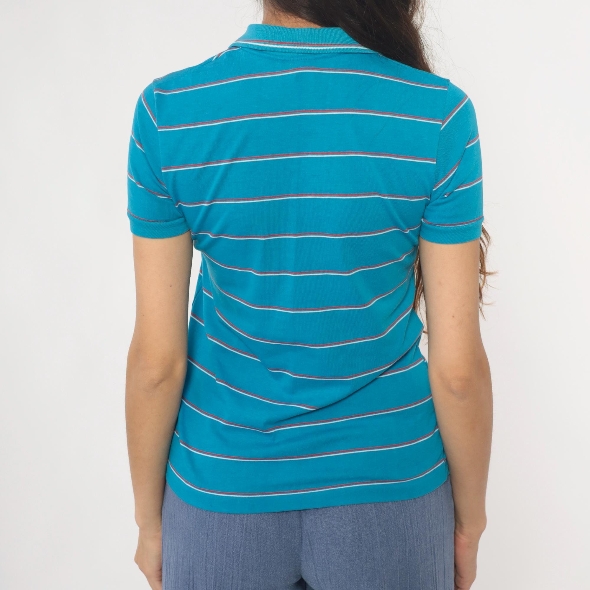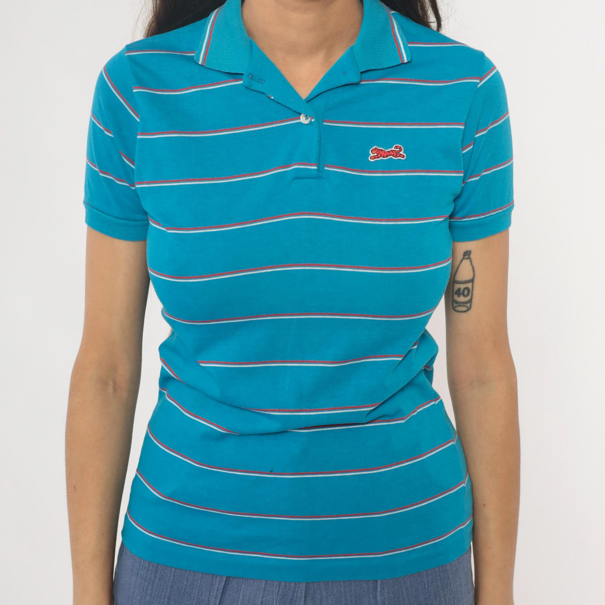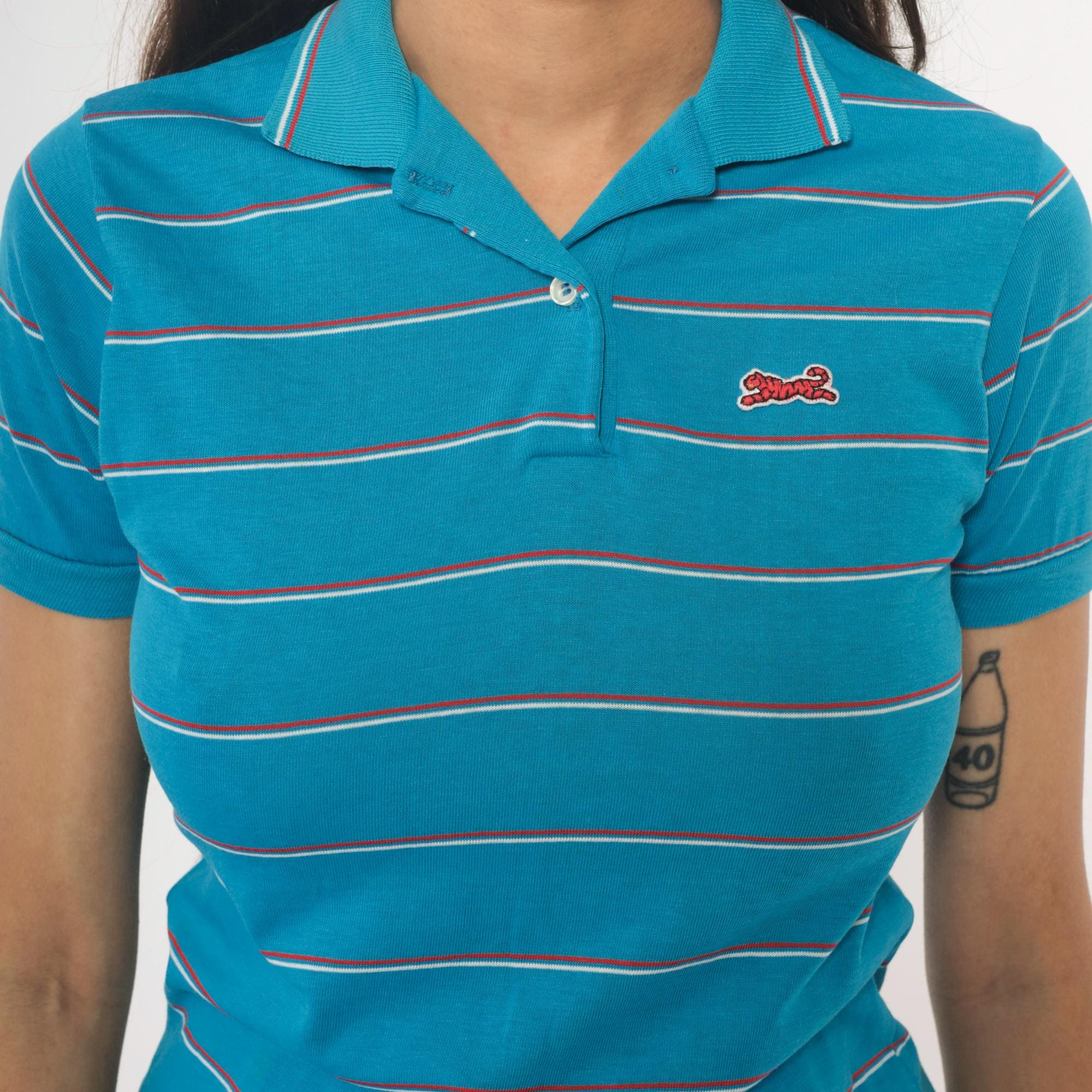 90s blue striped polo shirt from Le Tigre with red and white horizontal stripes across the fabric. Collared neckline with two-button placket, short sleeves with ribbed cuffs, small embroidered brand logo on left chest.